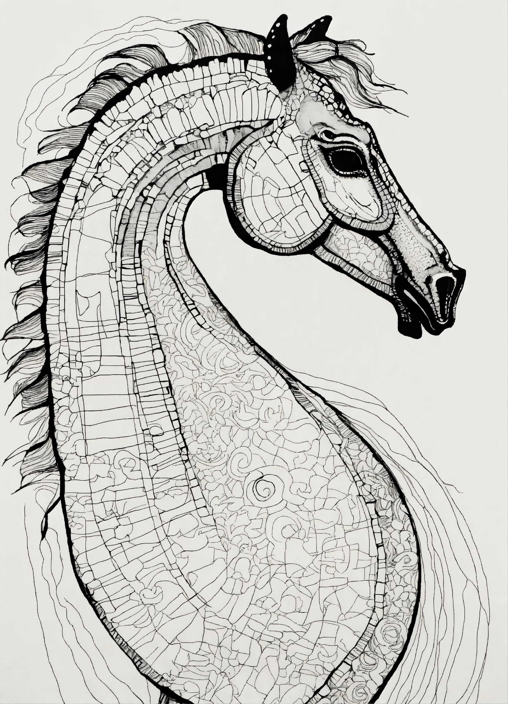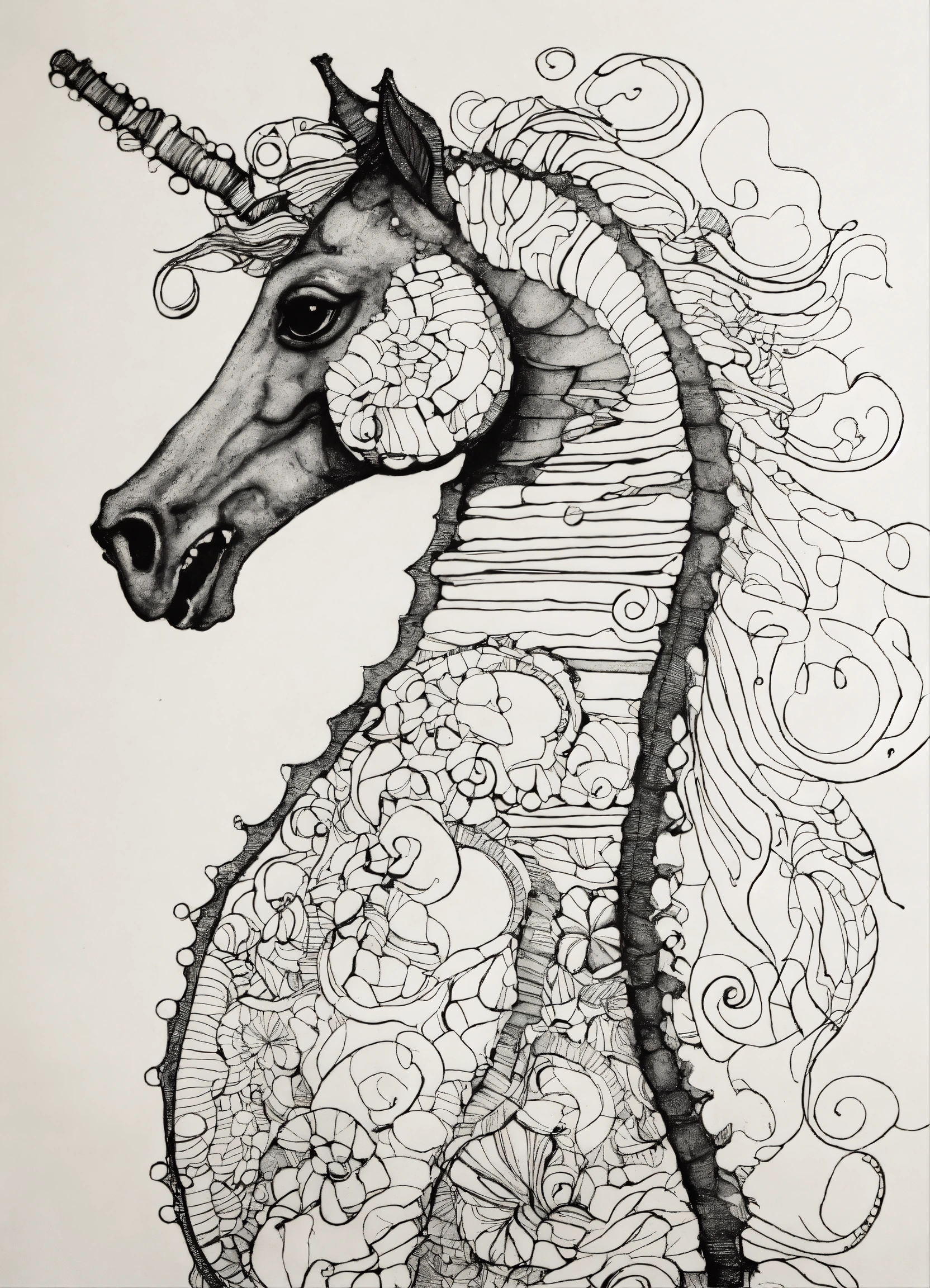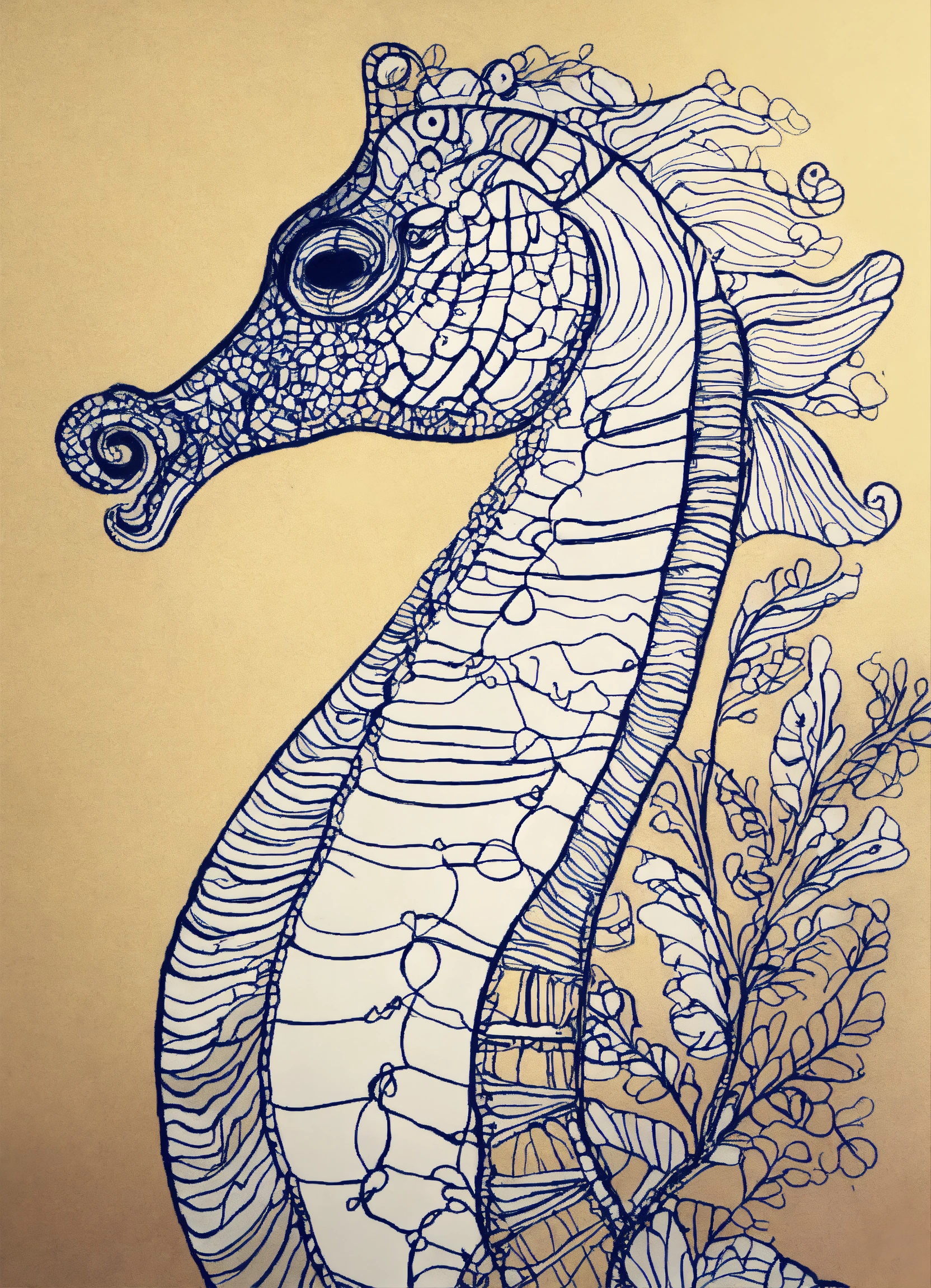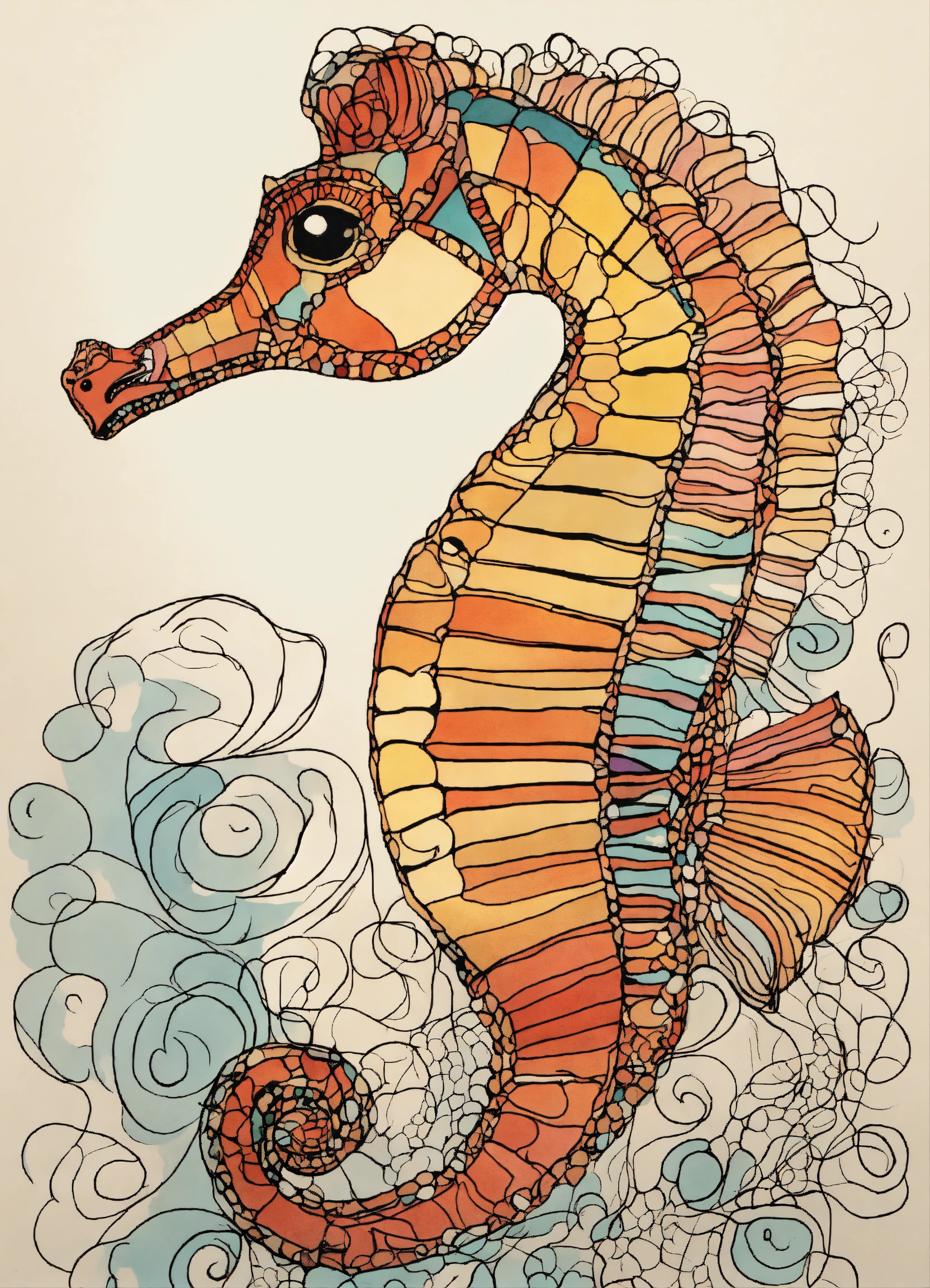 Beautiful detailed seahorse portrait, one line drawing, bold sketch inspired by bauhaus and henri matisse. si scott