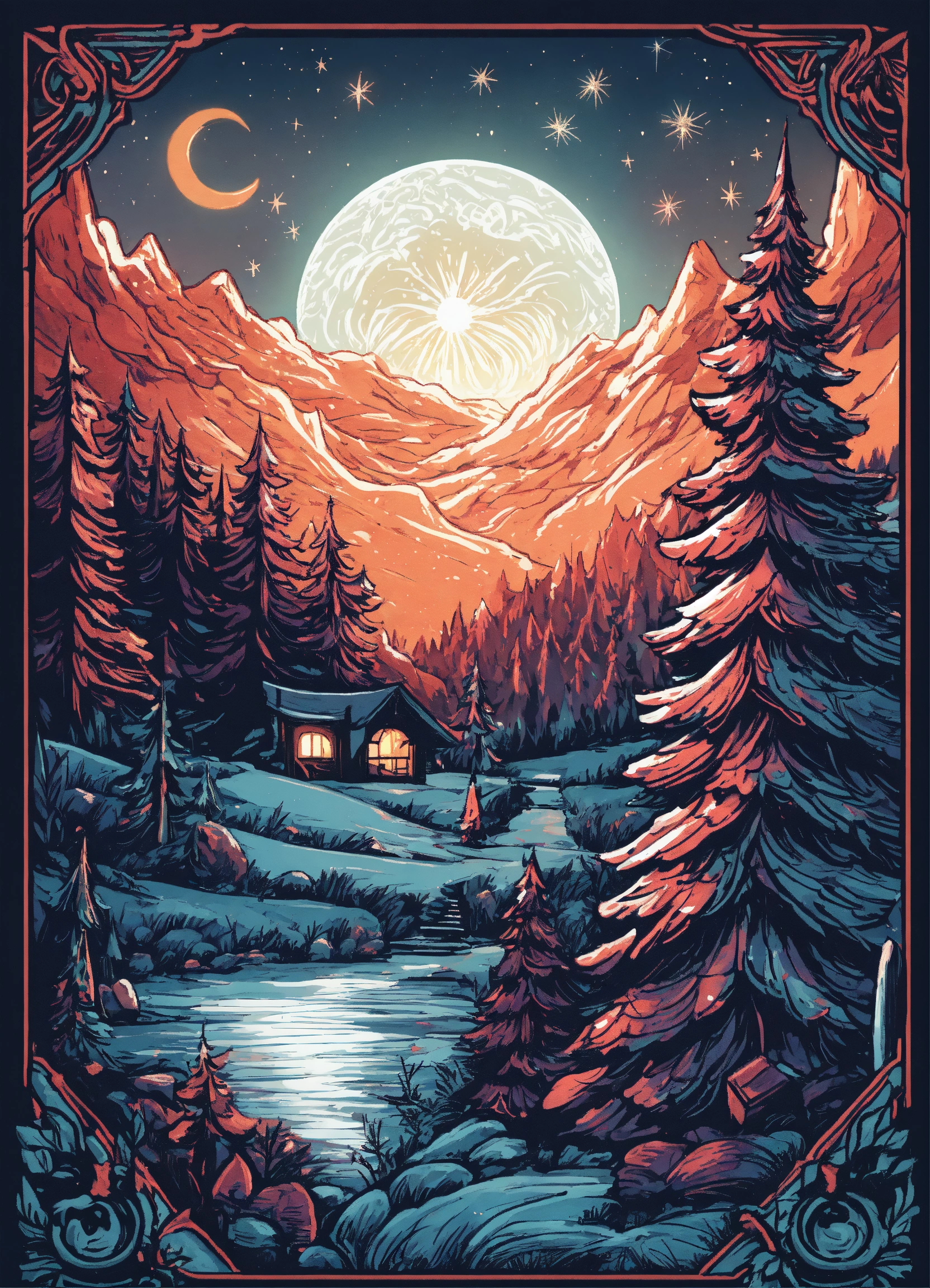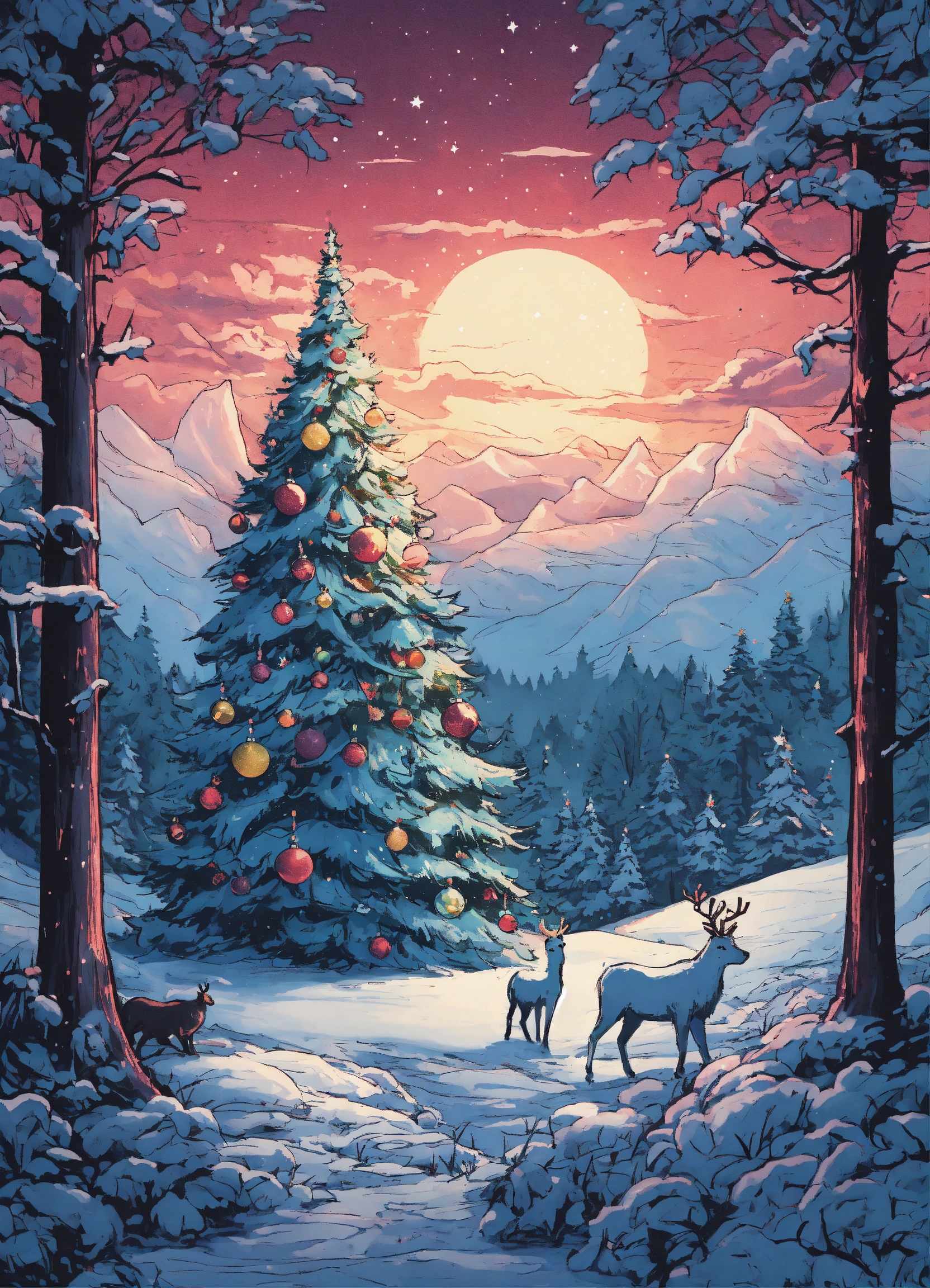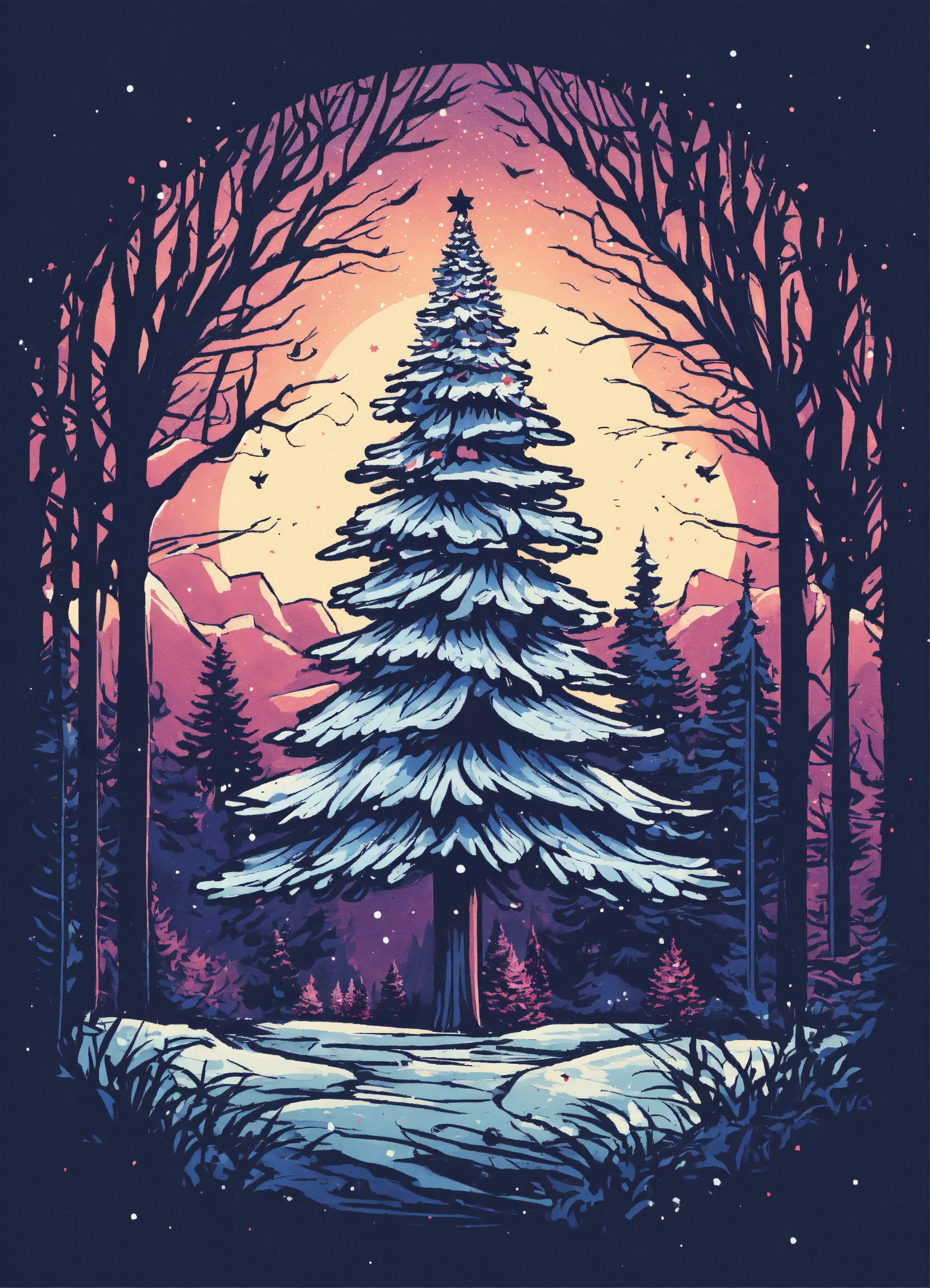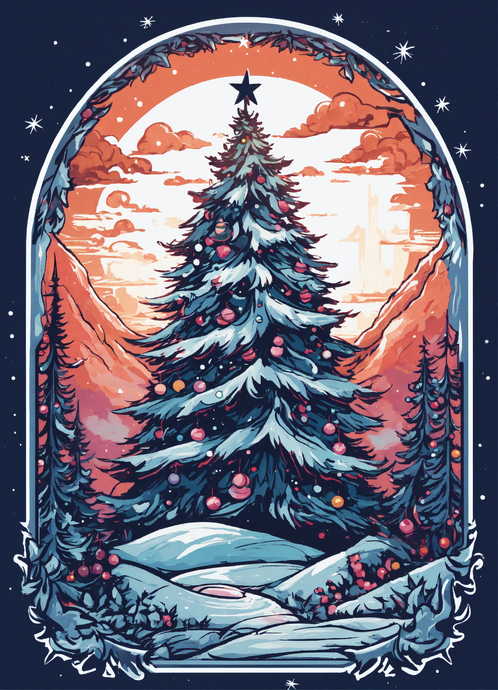 White sticker, magical christmas tree scene t-shirt design on a white background, art by dan mumford, no text