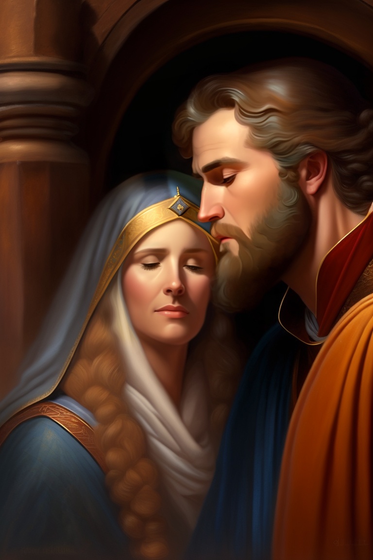 I'm looking for an illustration that depicts a scene from the biblical book of hosea. i would like an image where the prophet hosea is at the front, with a sad and worried expression on his face. he is looking at his wife who is a little behind him. beside her, there is another man, representing the context of infidelity and distance from god. the scene is meant to convey the sadness and complexity of hosea's emotions over the actions of his wife and the people as described in the bible. i hope the image captures the emotional depth of this passage and conveys the message of god's faithfulness and love despite difficult circumstances.