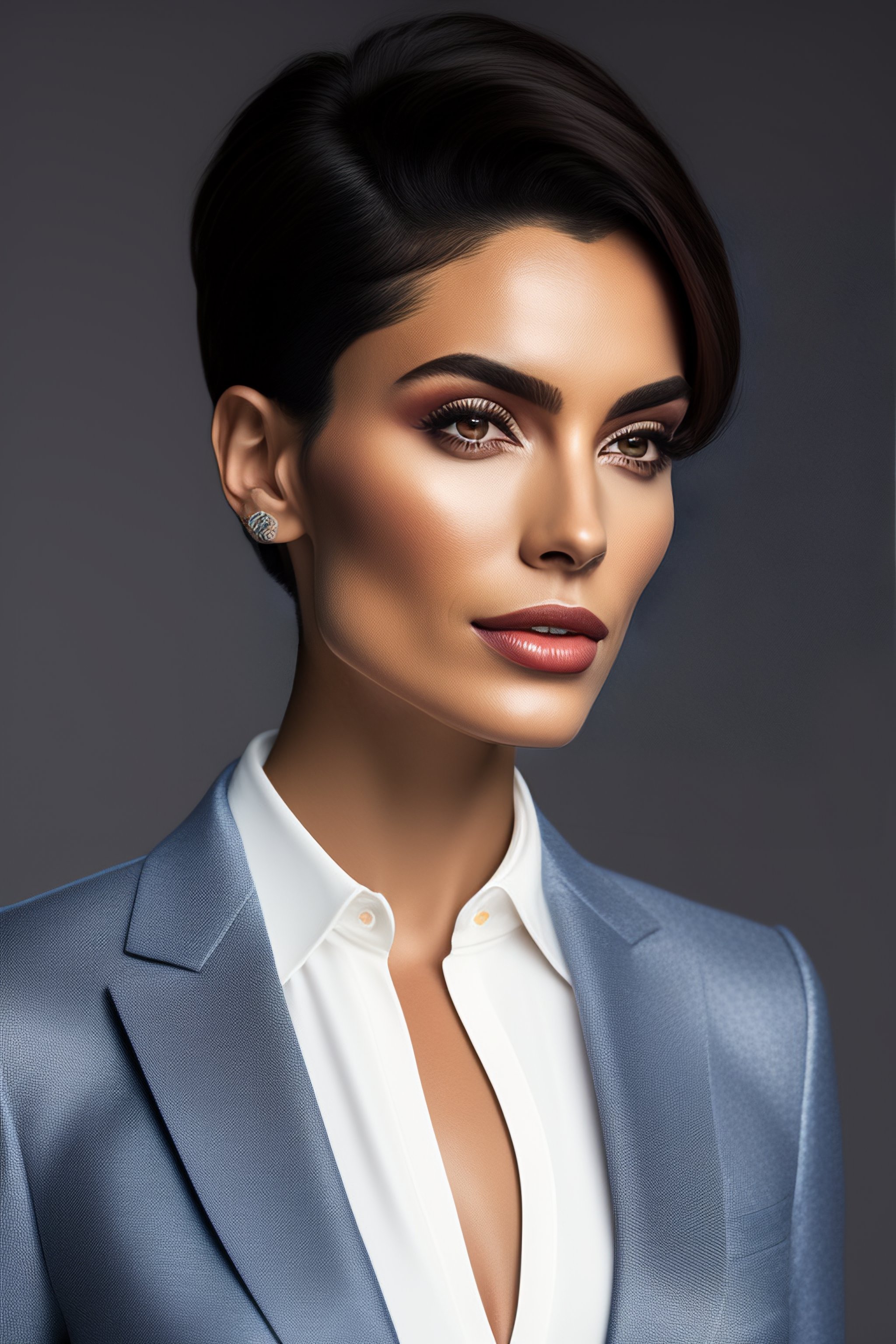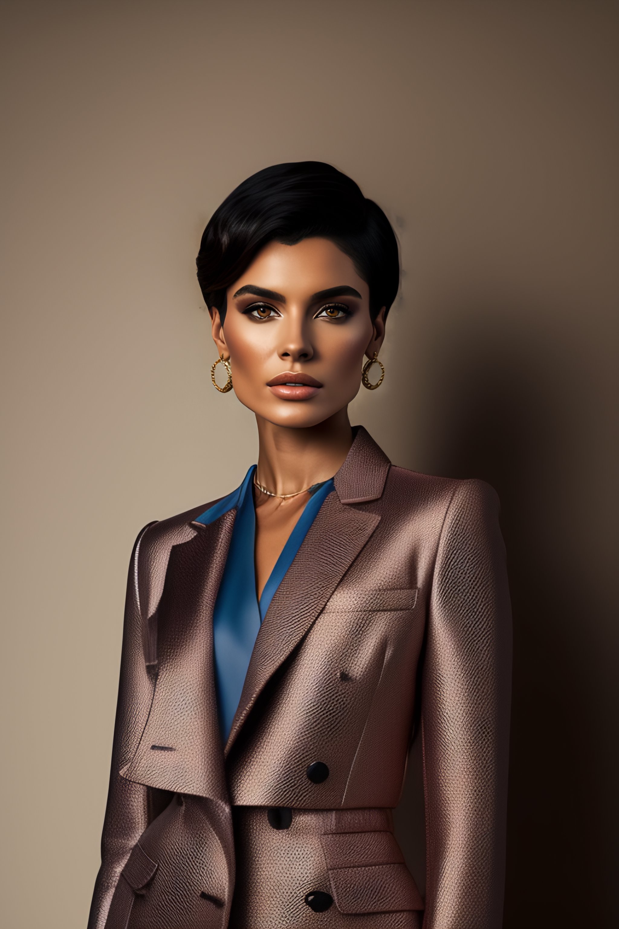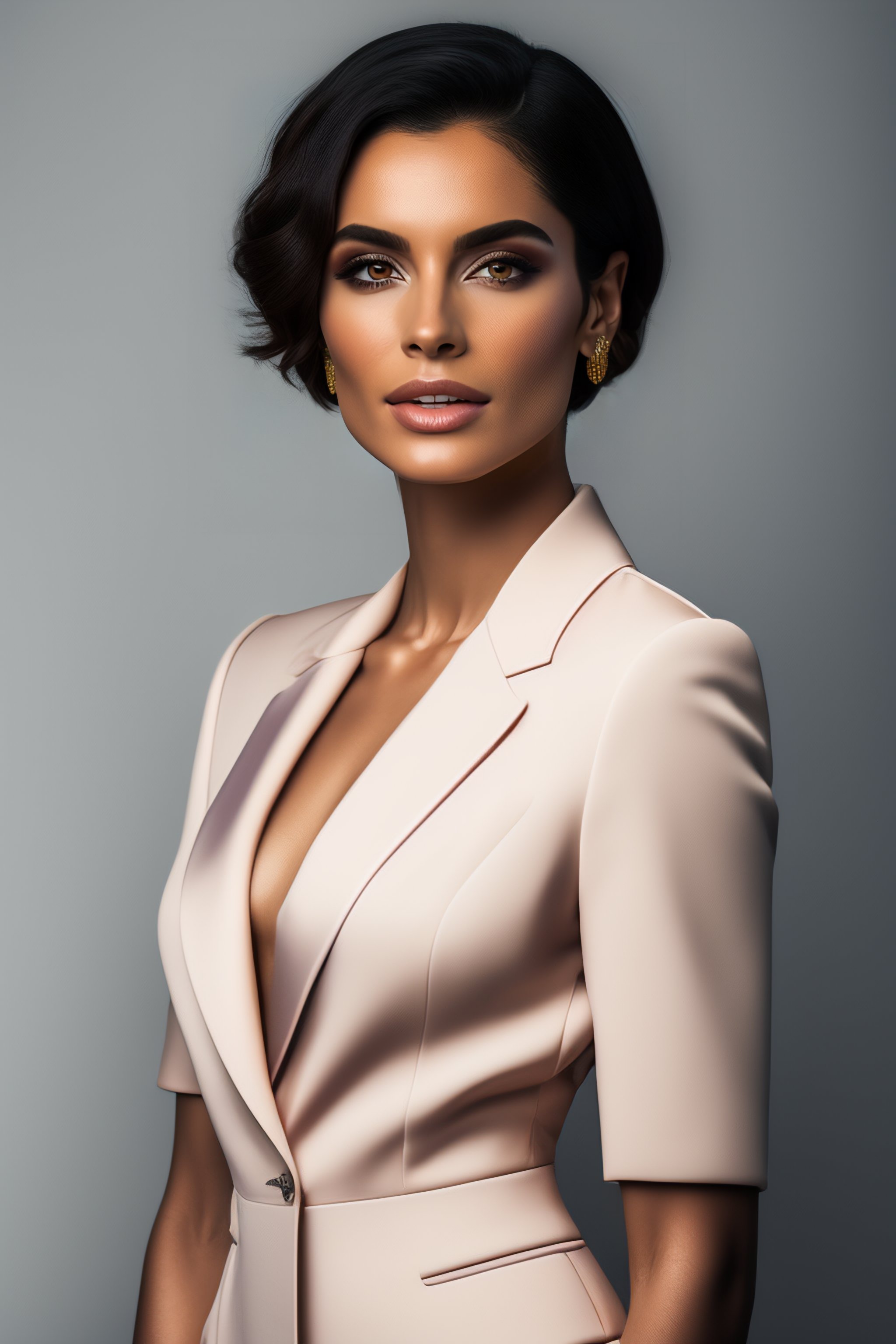 Studio portrait of natural short hair spanish model over 22 wearing pants suits outfit, full body, 100% real, natural light, studio background, fashion magazine, hyper realistic, ultra-detailed, no filter, depth of field, fashion, iso 400, photorealistic, 8k
