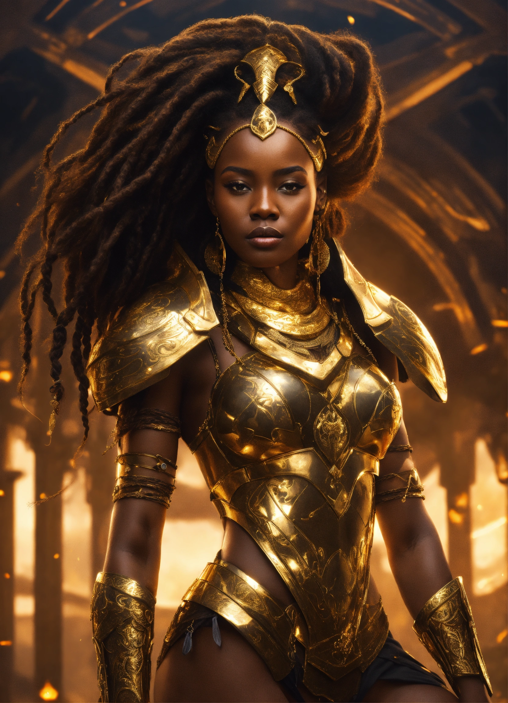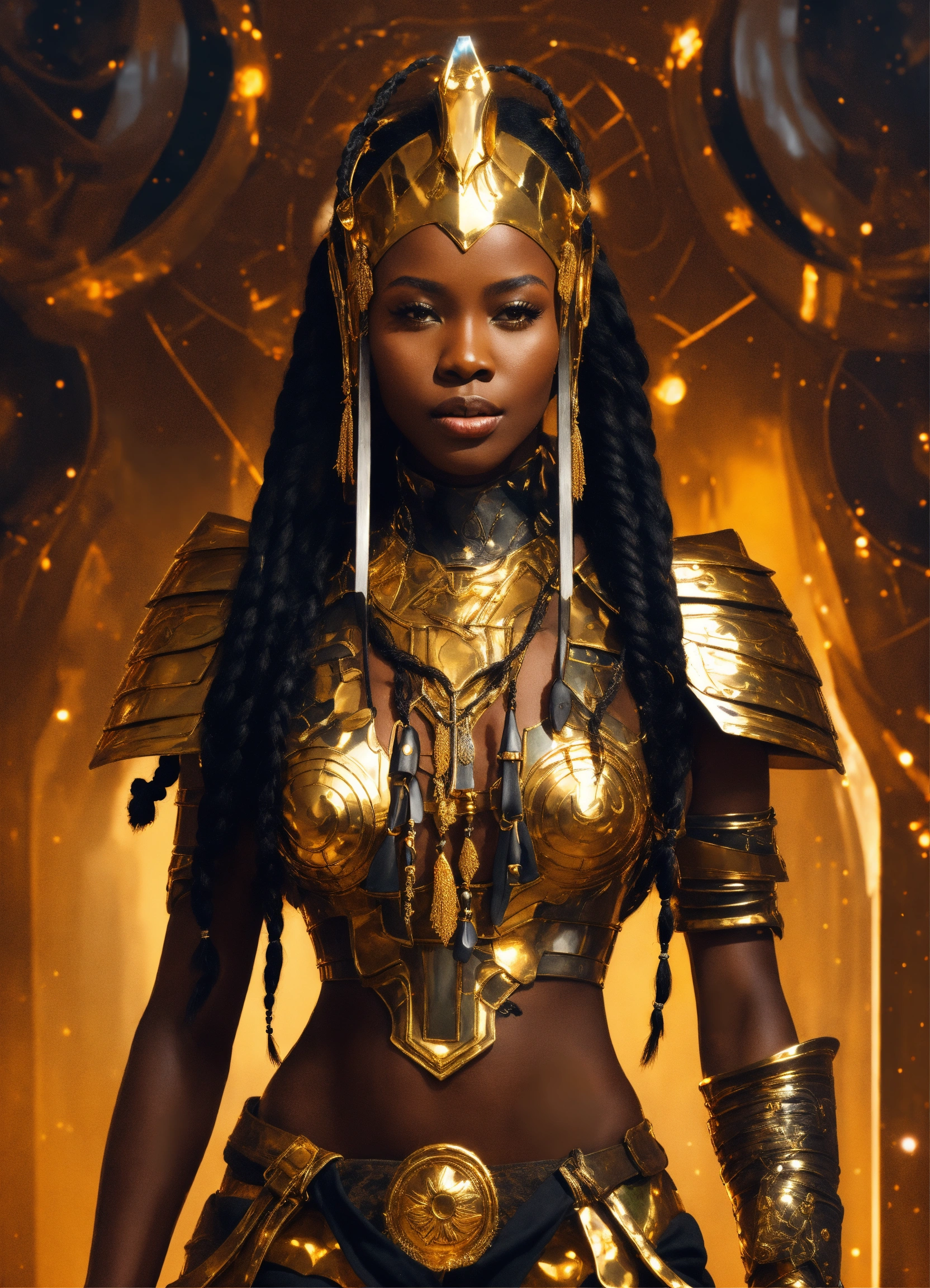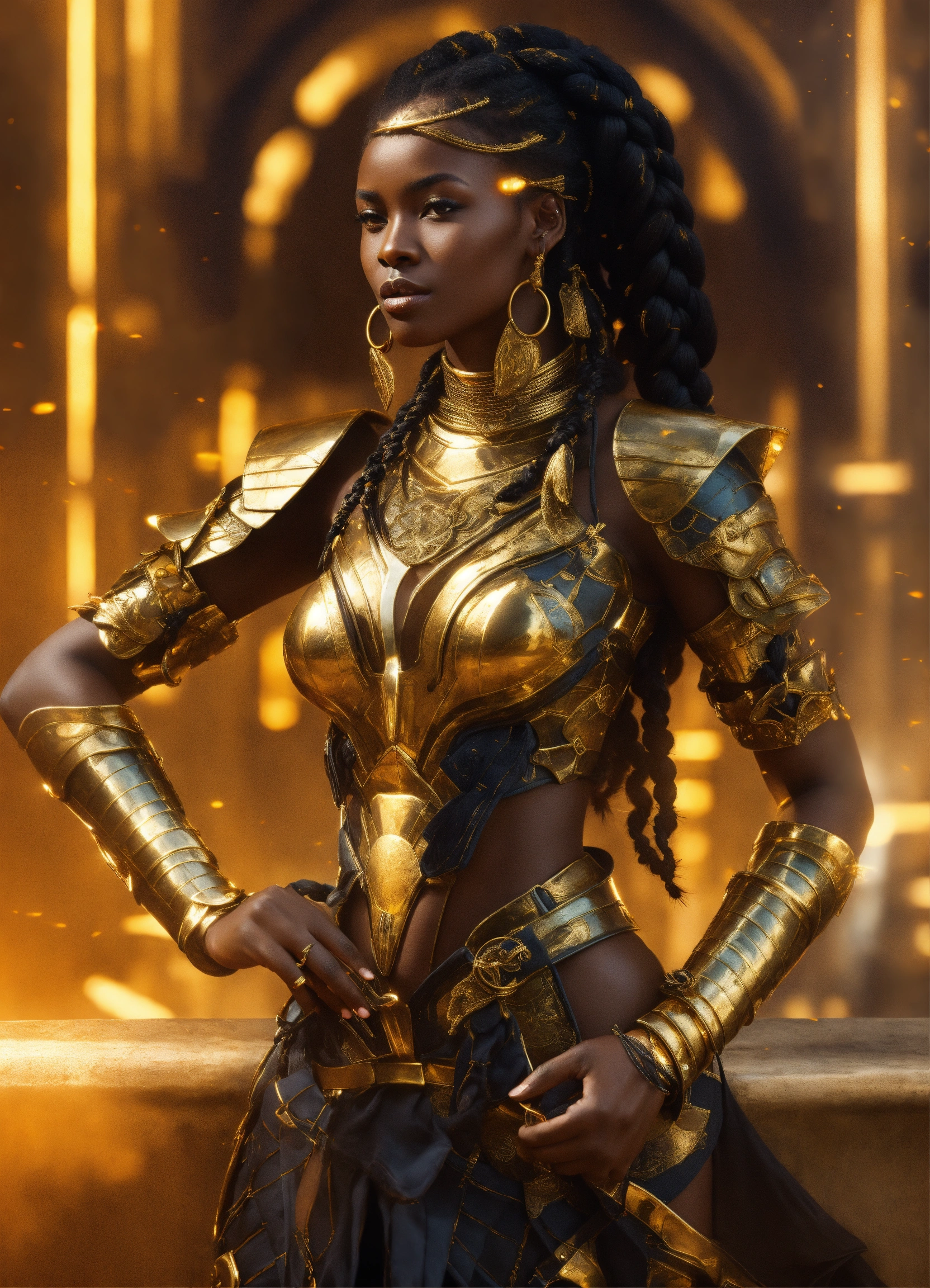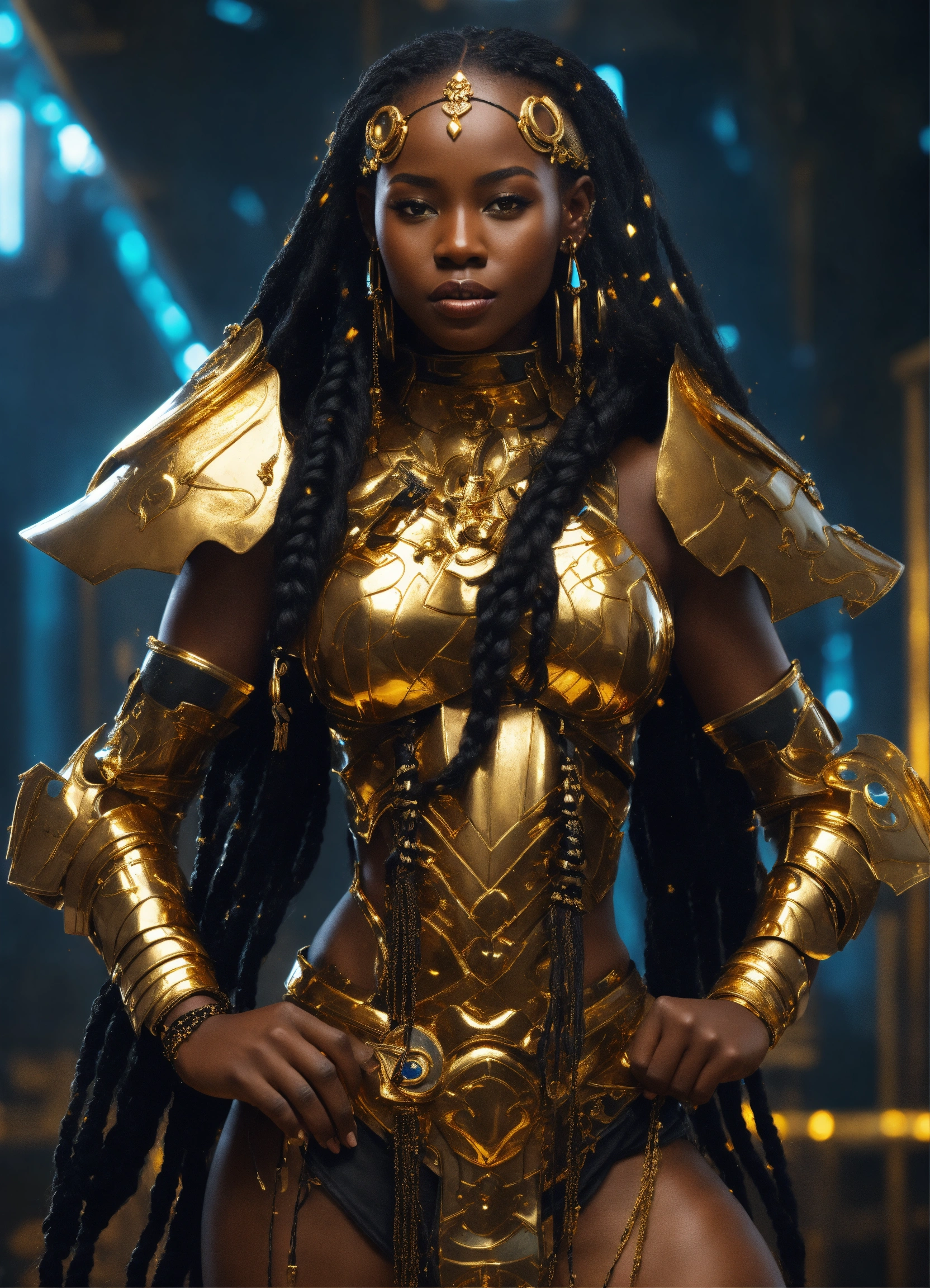 Beautiful african futuristic fantasy warrior woman with gold and black armor, hour glass figure and long braided hair, art station