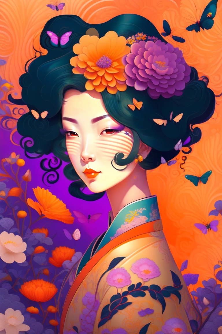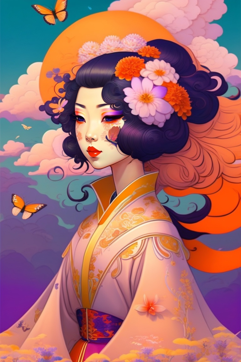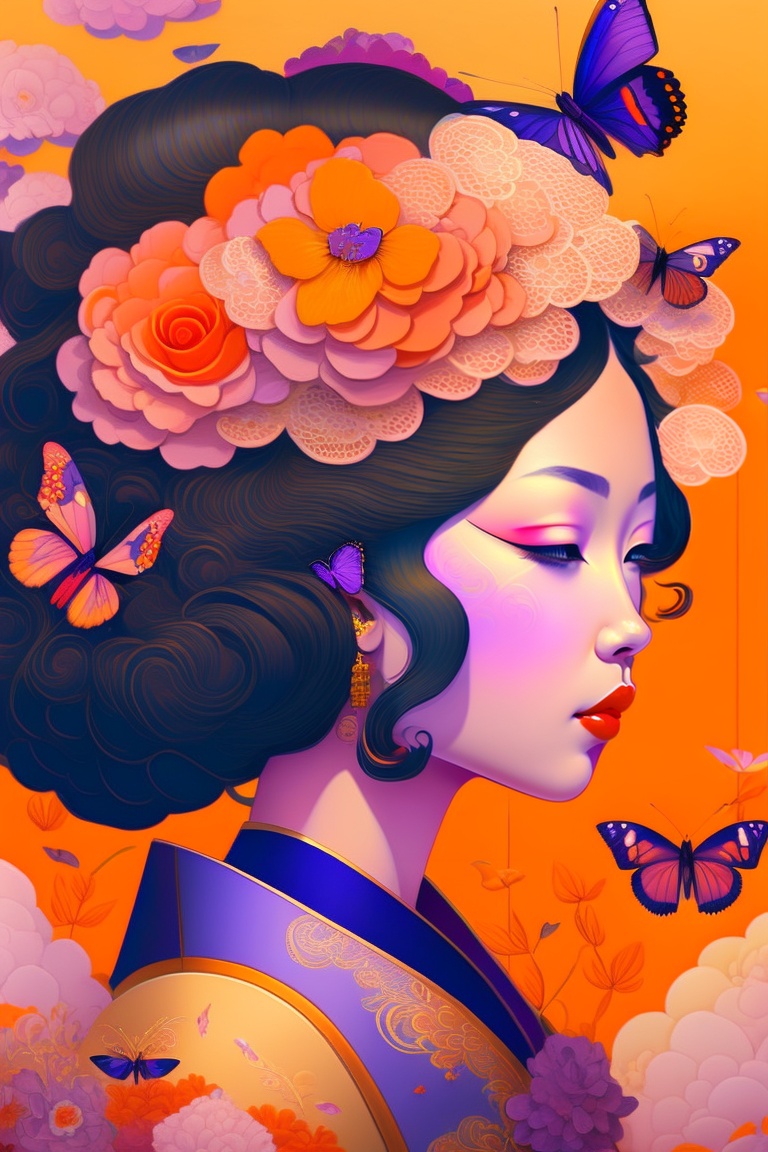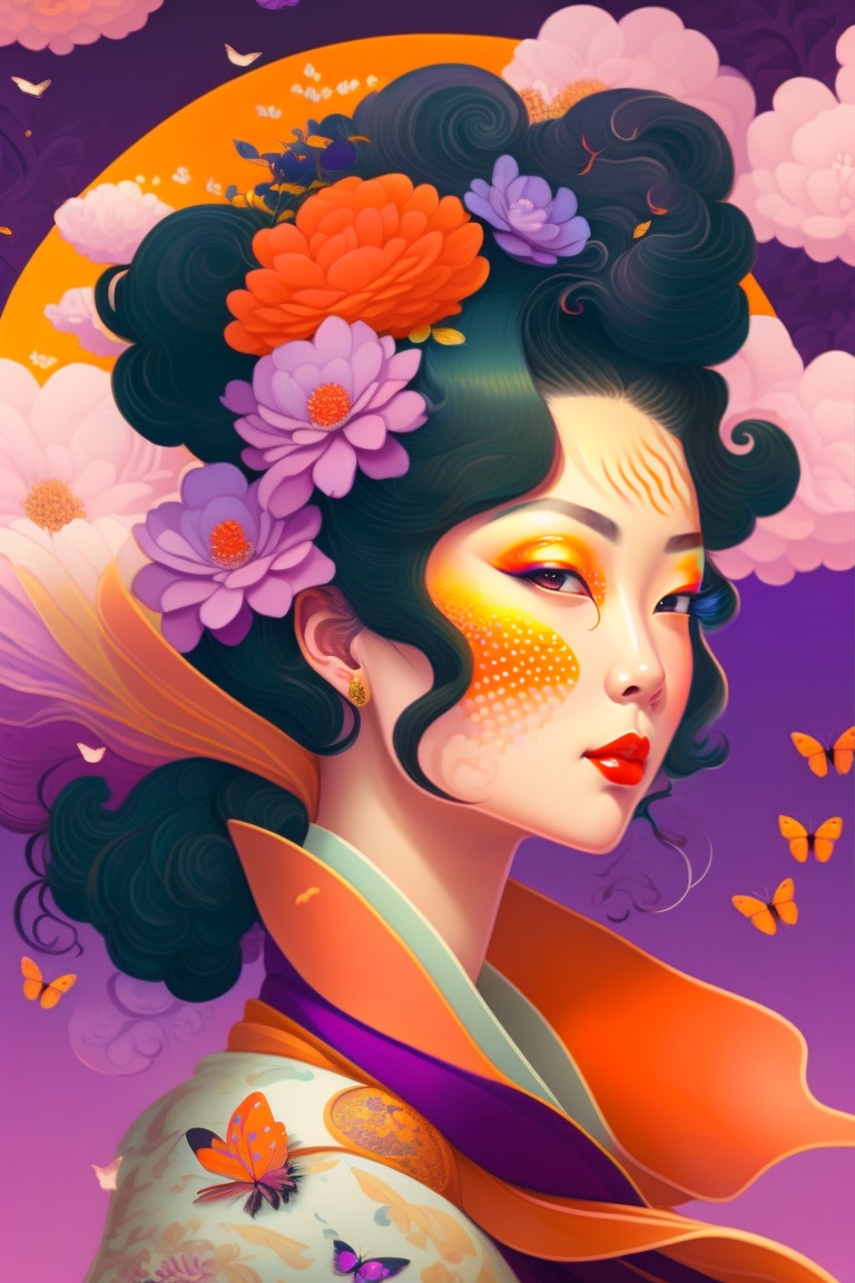 Beautiful portrait cute japanese geisha, big long curly hair, pastel colors, with a yellow clouds, purple butterfly wings flowers orange by victo ngai, kilian eng, dynamic lighting, digital art, art by james jean, takato yamamoto, inkpunk, audrey kawasaki, minimalism