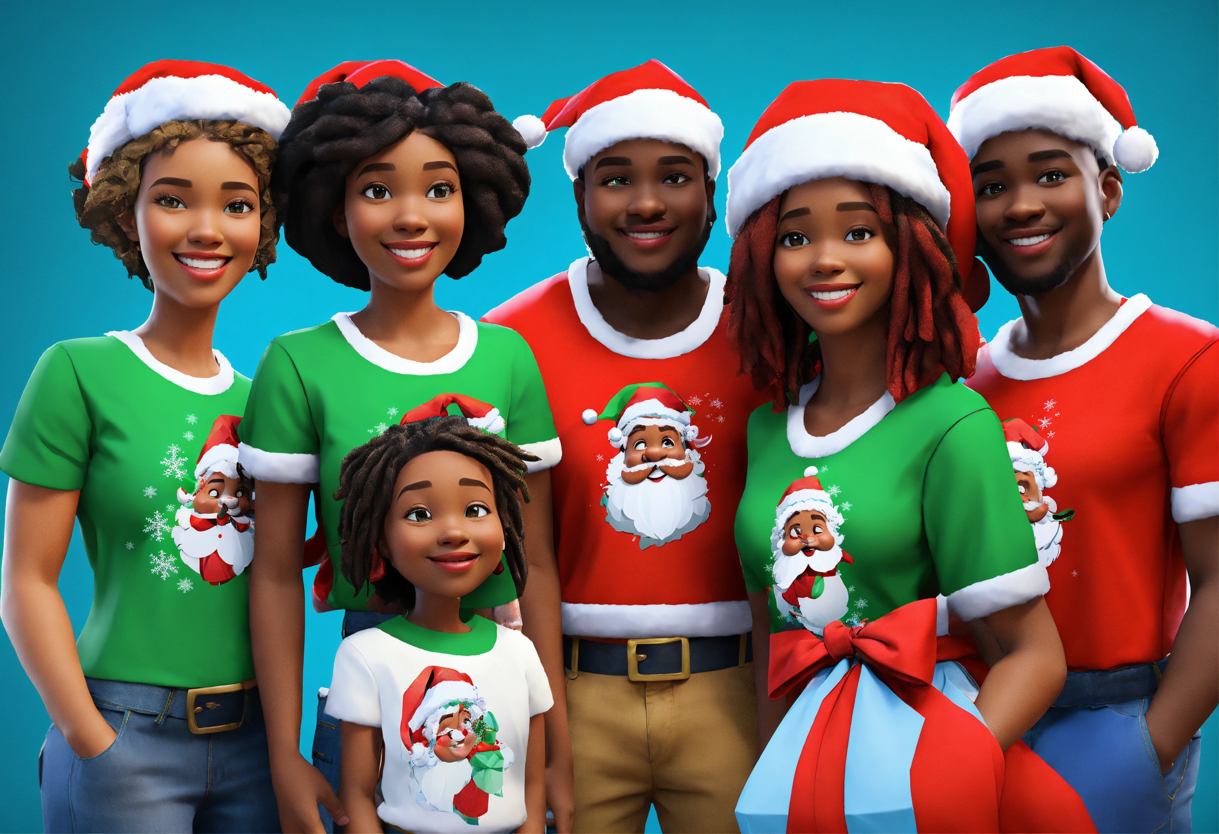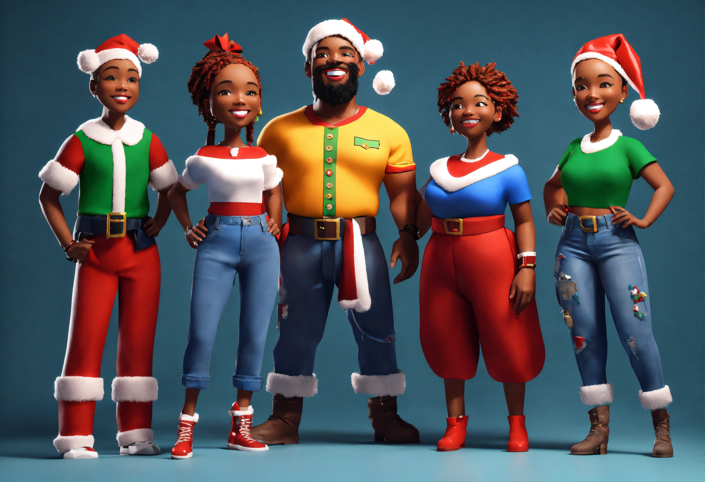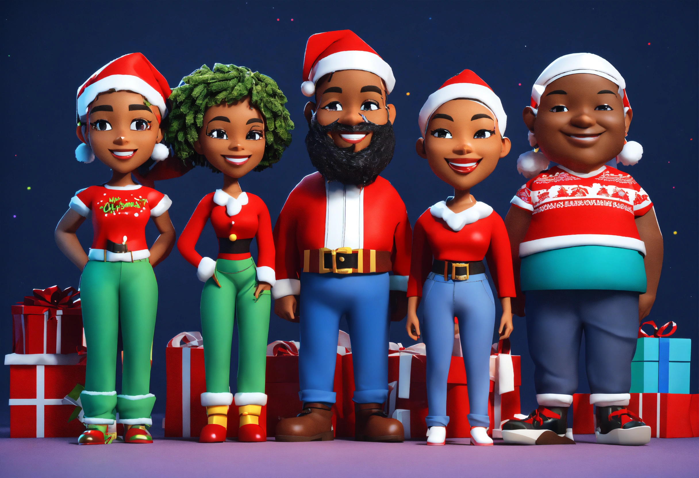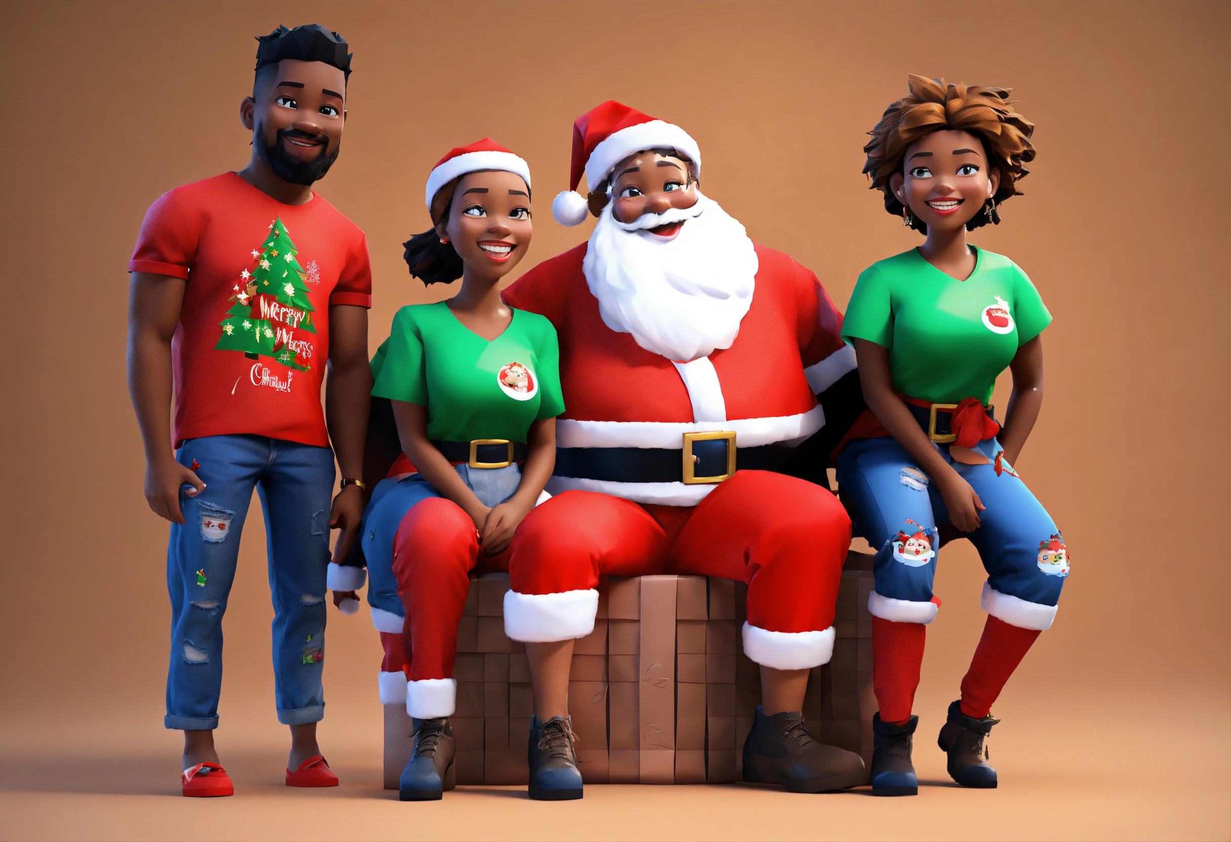 3d ultra detail smiling dark complexion african american santa helpers with santa and mrs claus, close cropped cut hair and flowing healthy locs. with various plain colorful tshirts, cargo pants and ripped distressed blue jeans, presents 🎁 rule of thirds. we wish you a merry christmas decor theme. pixar style. lowpoly splashes and drips. rule of thirds.