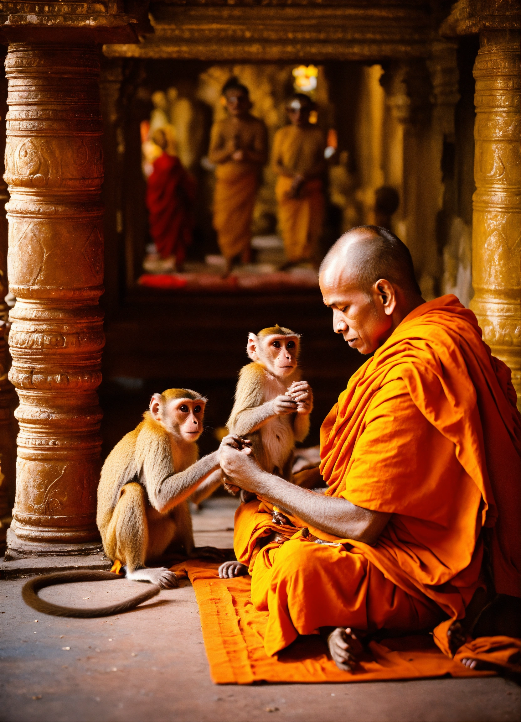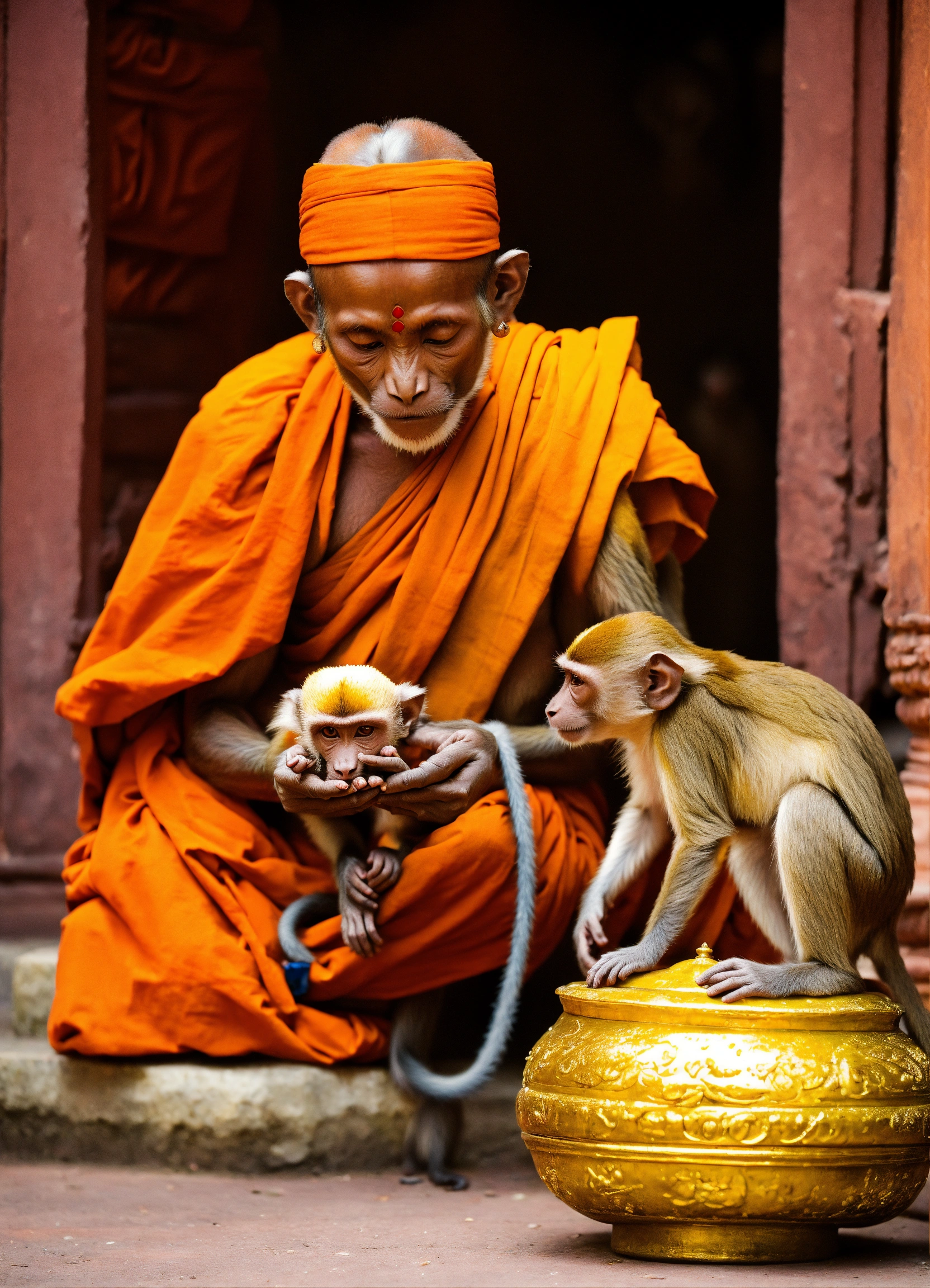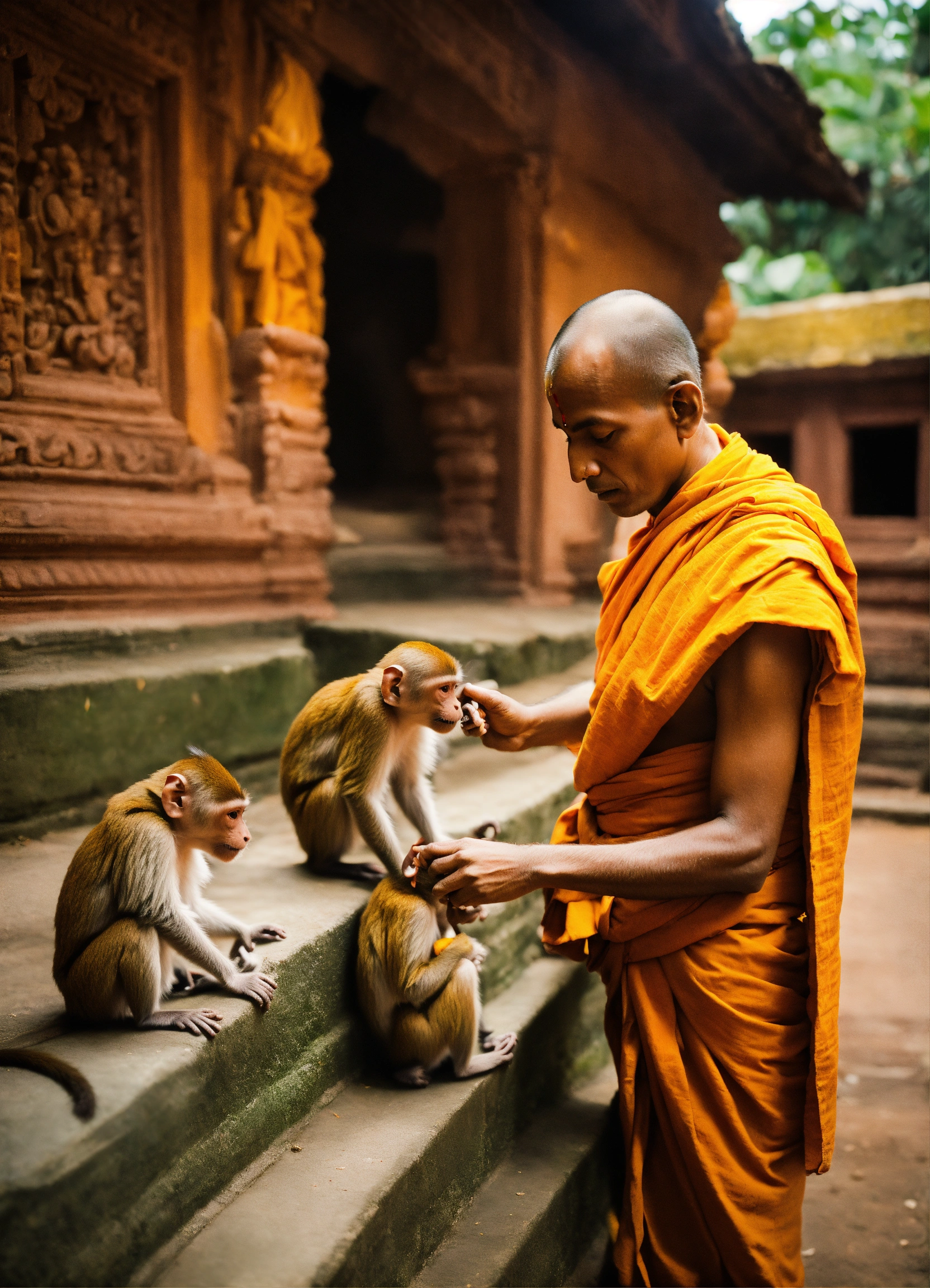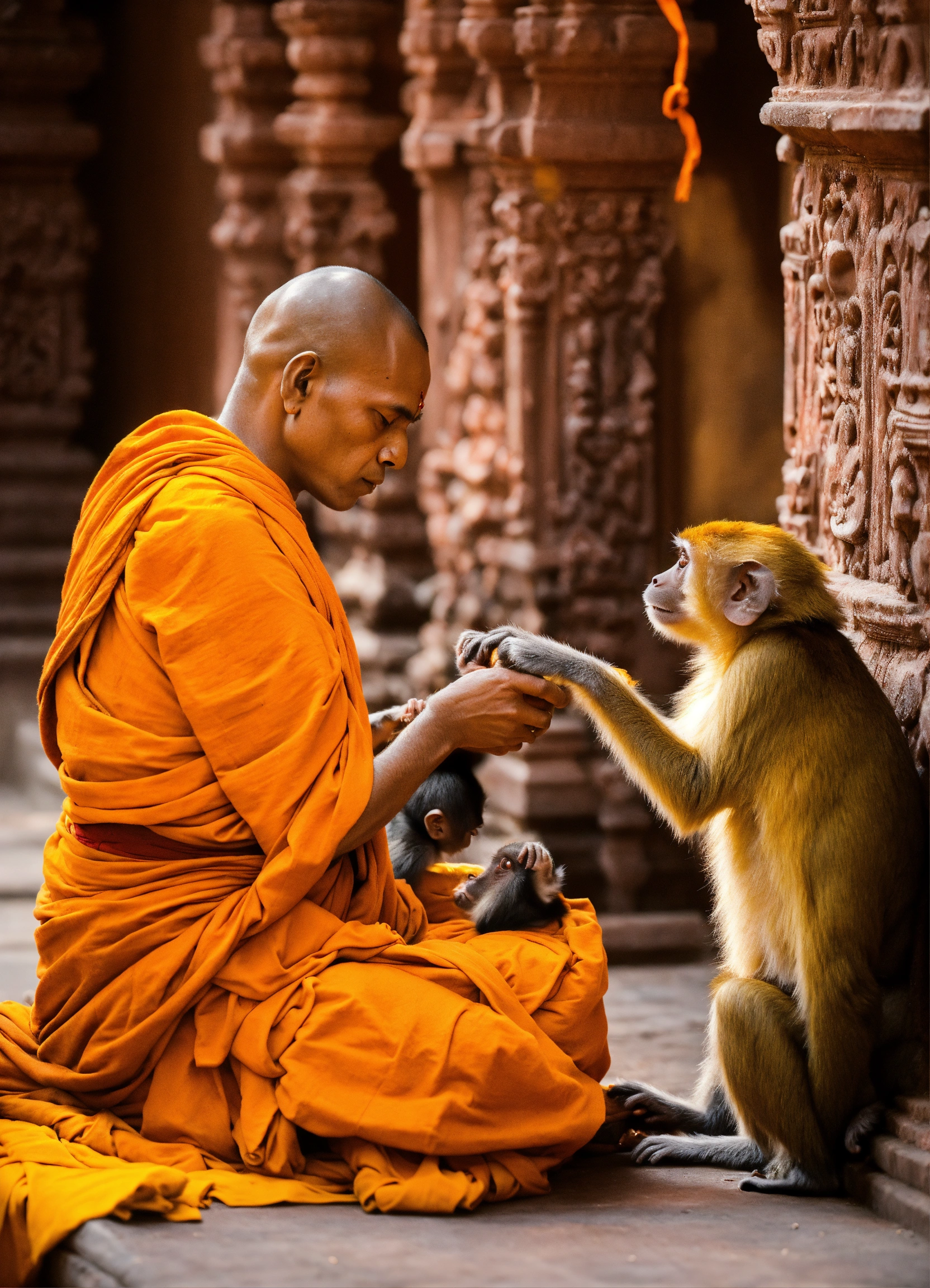 Hindu monks taking care of monkeys in a spiritual and divine old hindu monastery