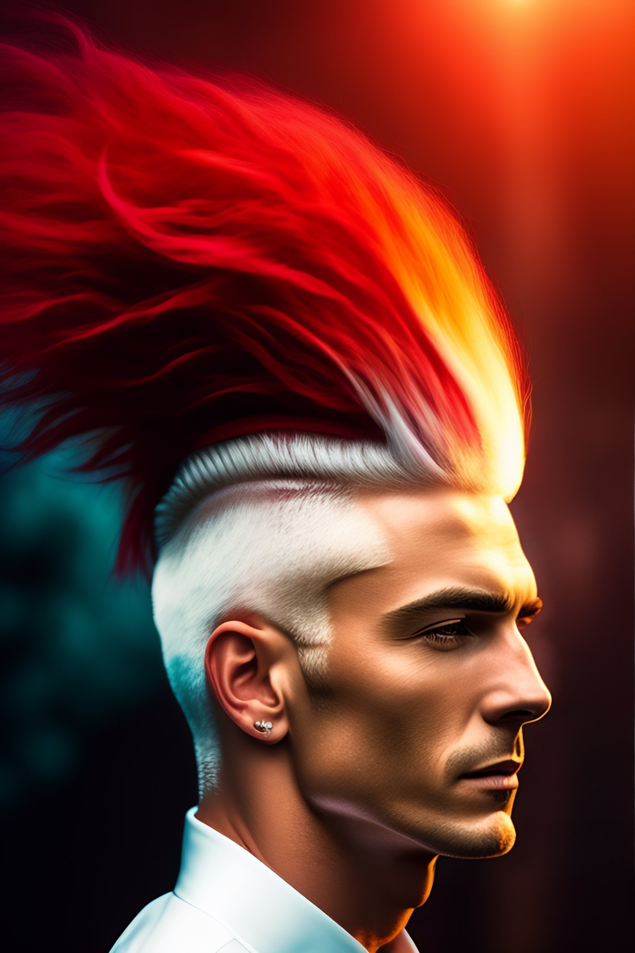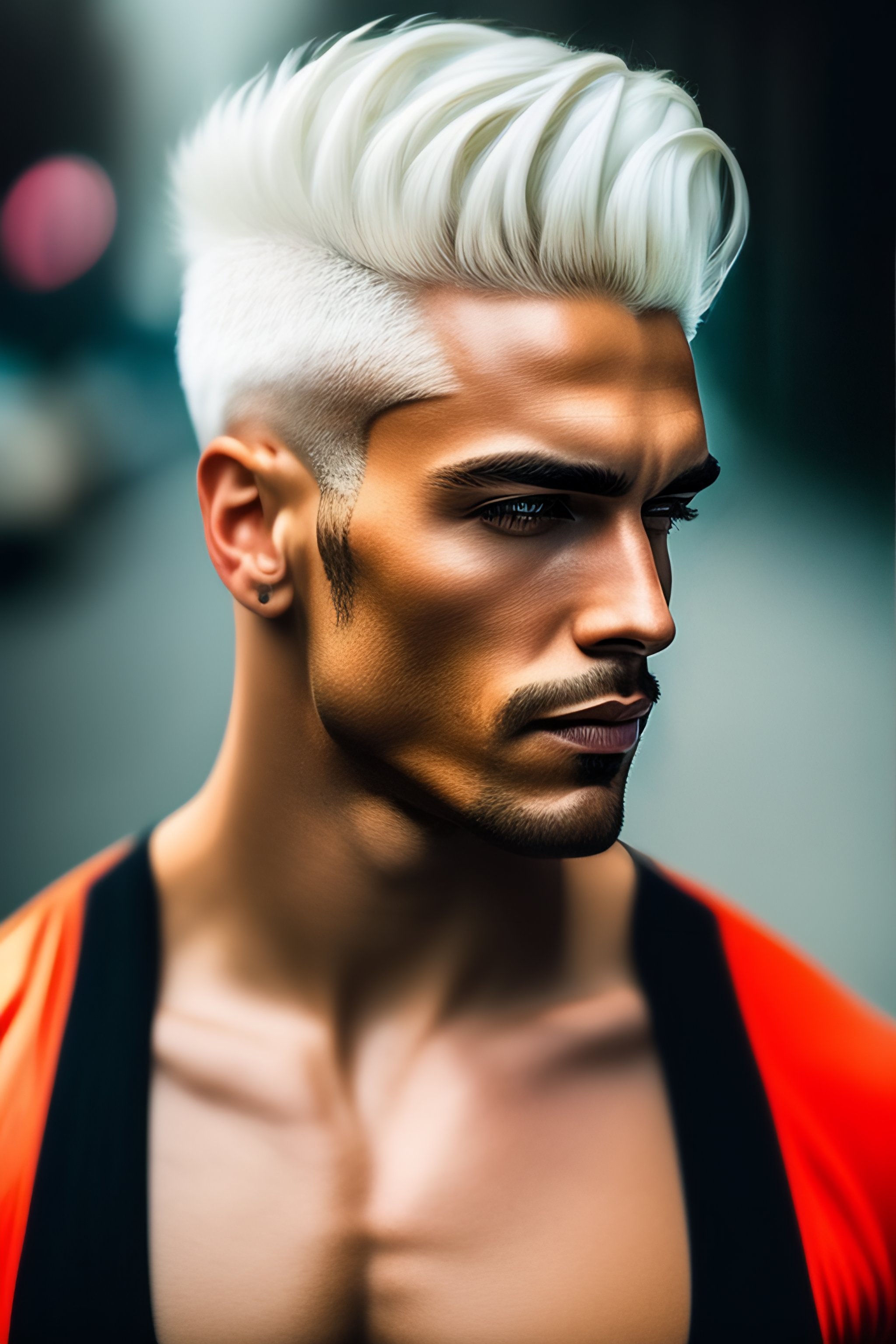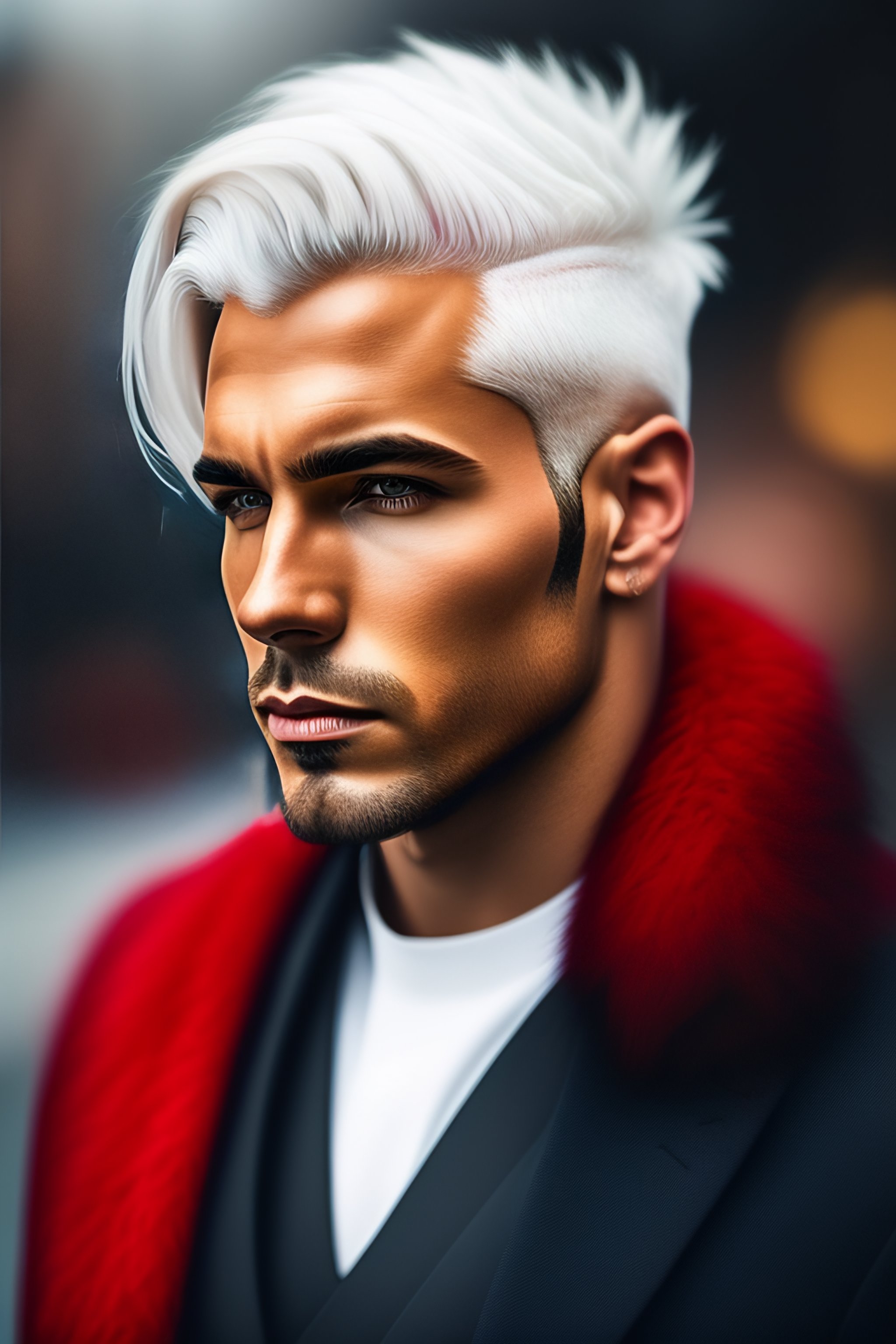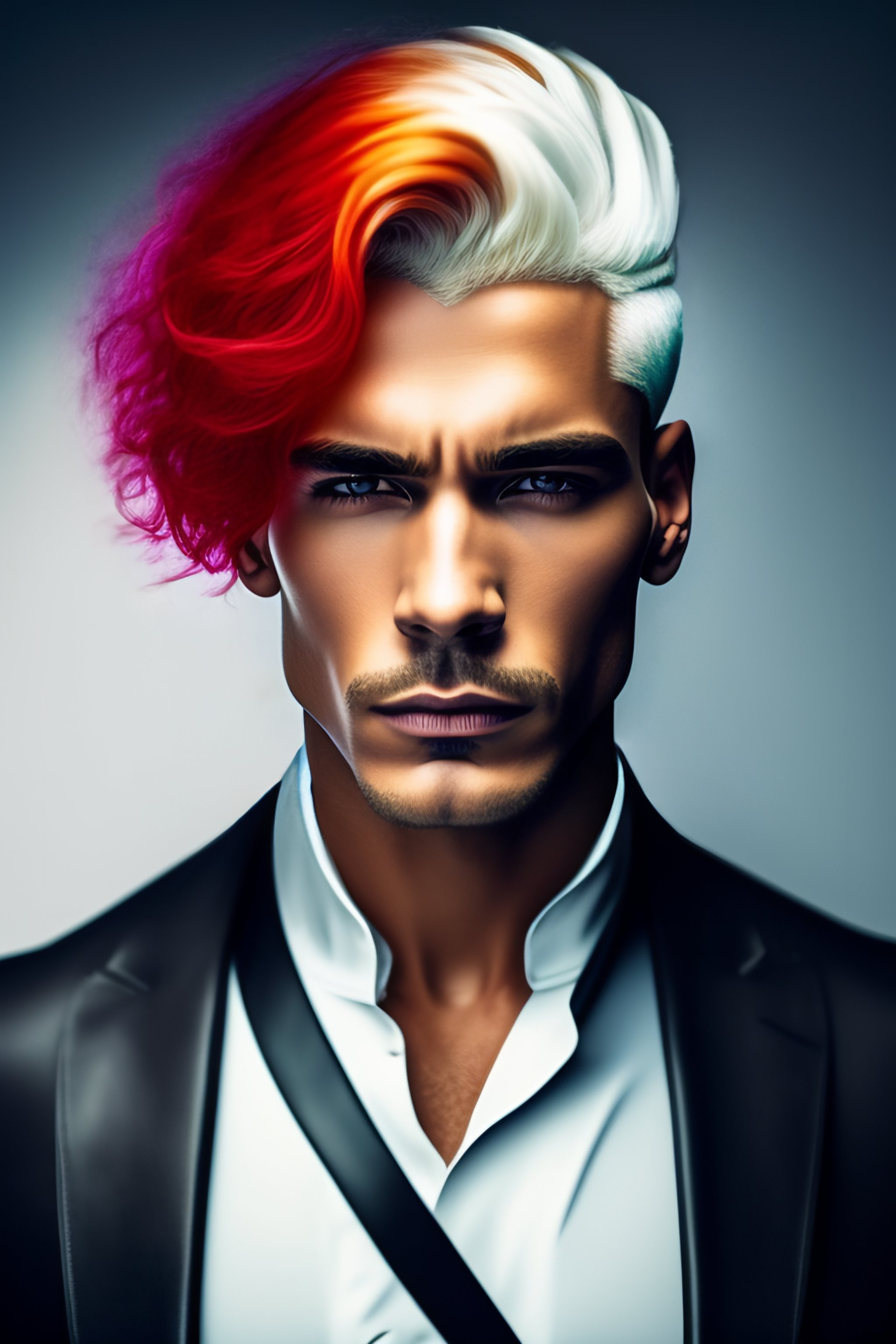 Man with white hair and one red hair streak