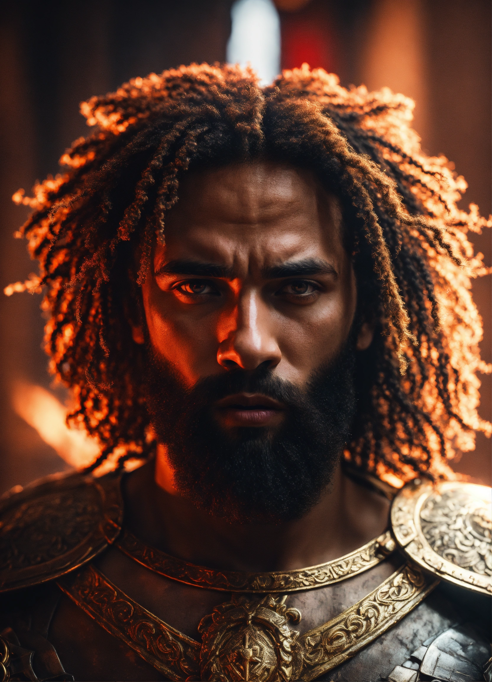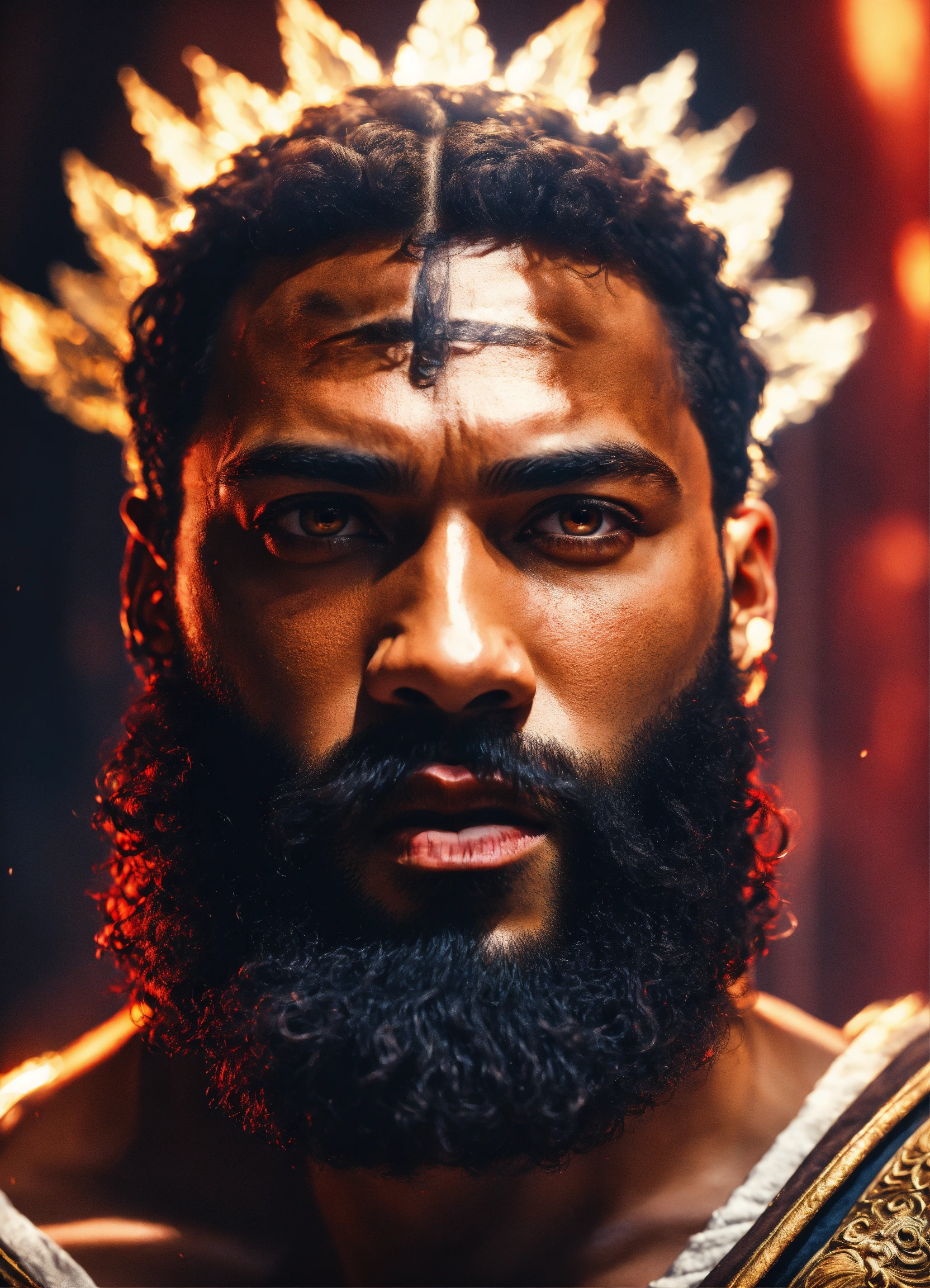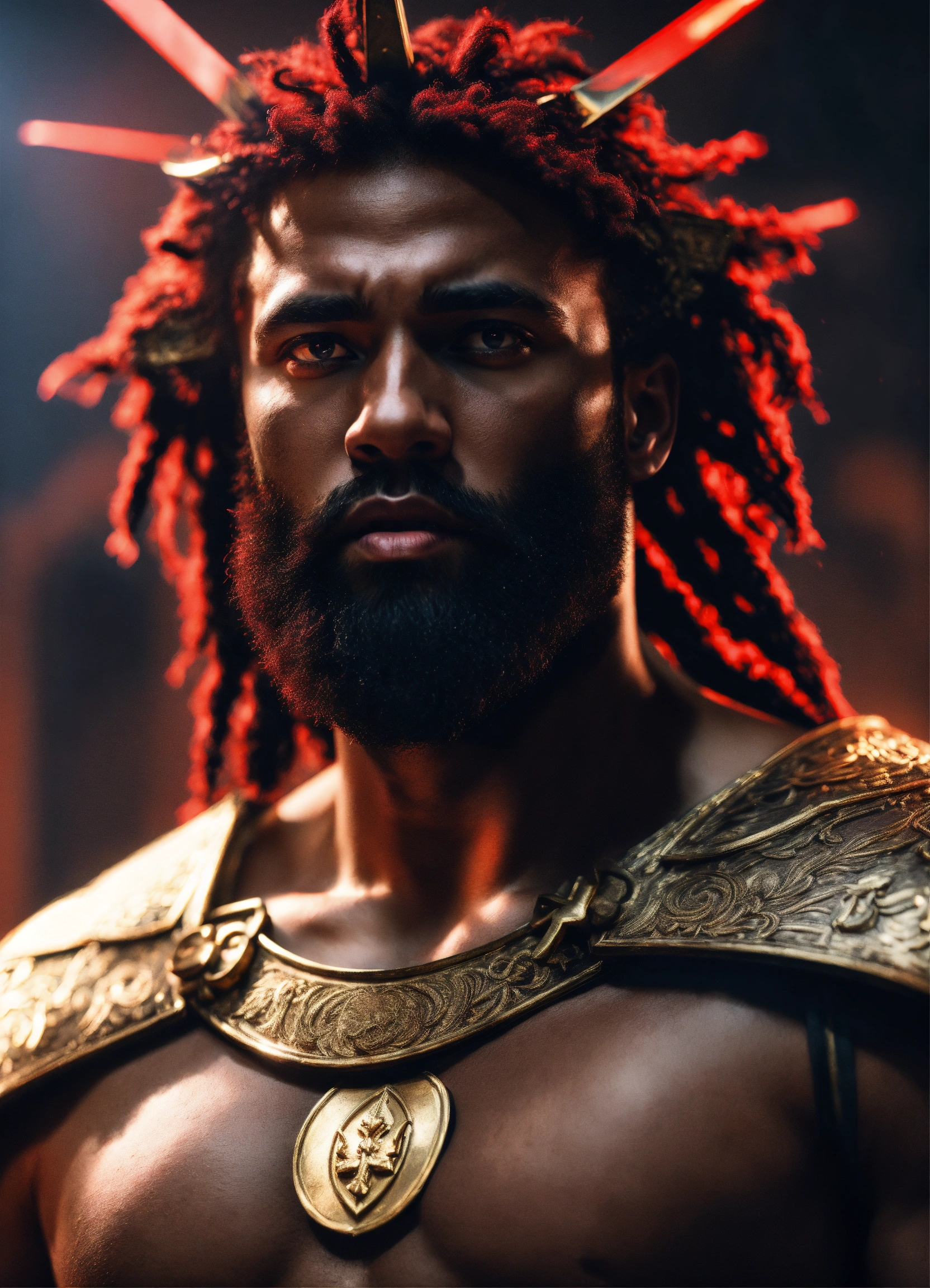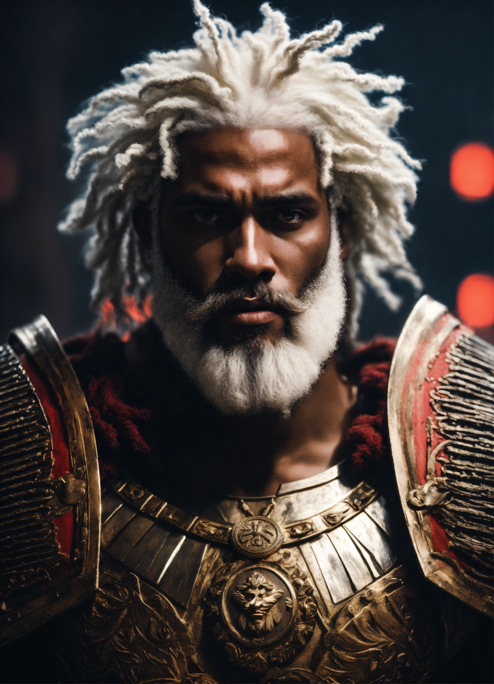 Black christ red eyes white afro hair and beard gladiator cinematic portrait of a god, only head and chest exotic god features, trending on art station, cinematic composition, dramatic pose, beautiful lighting, sharp, details, hyper-detailed, hd, 4k, 8k