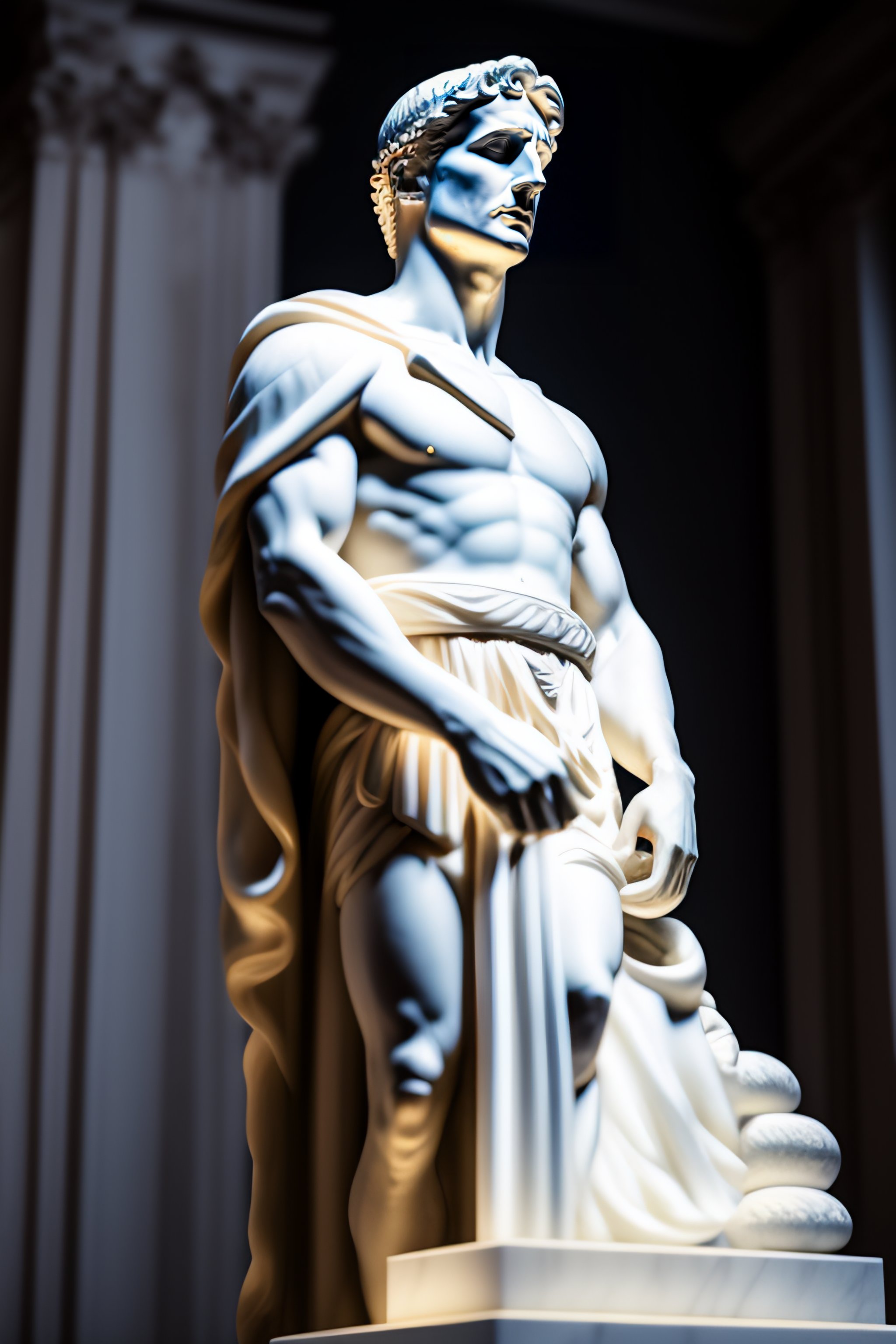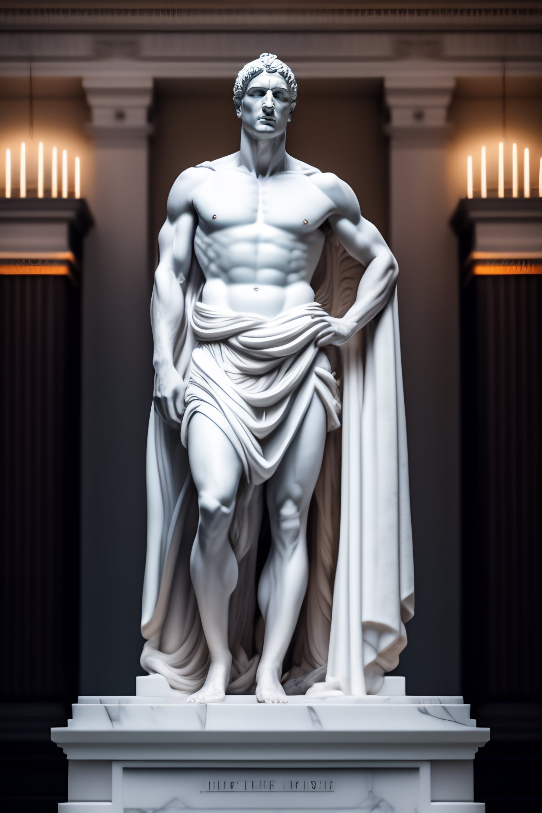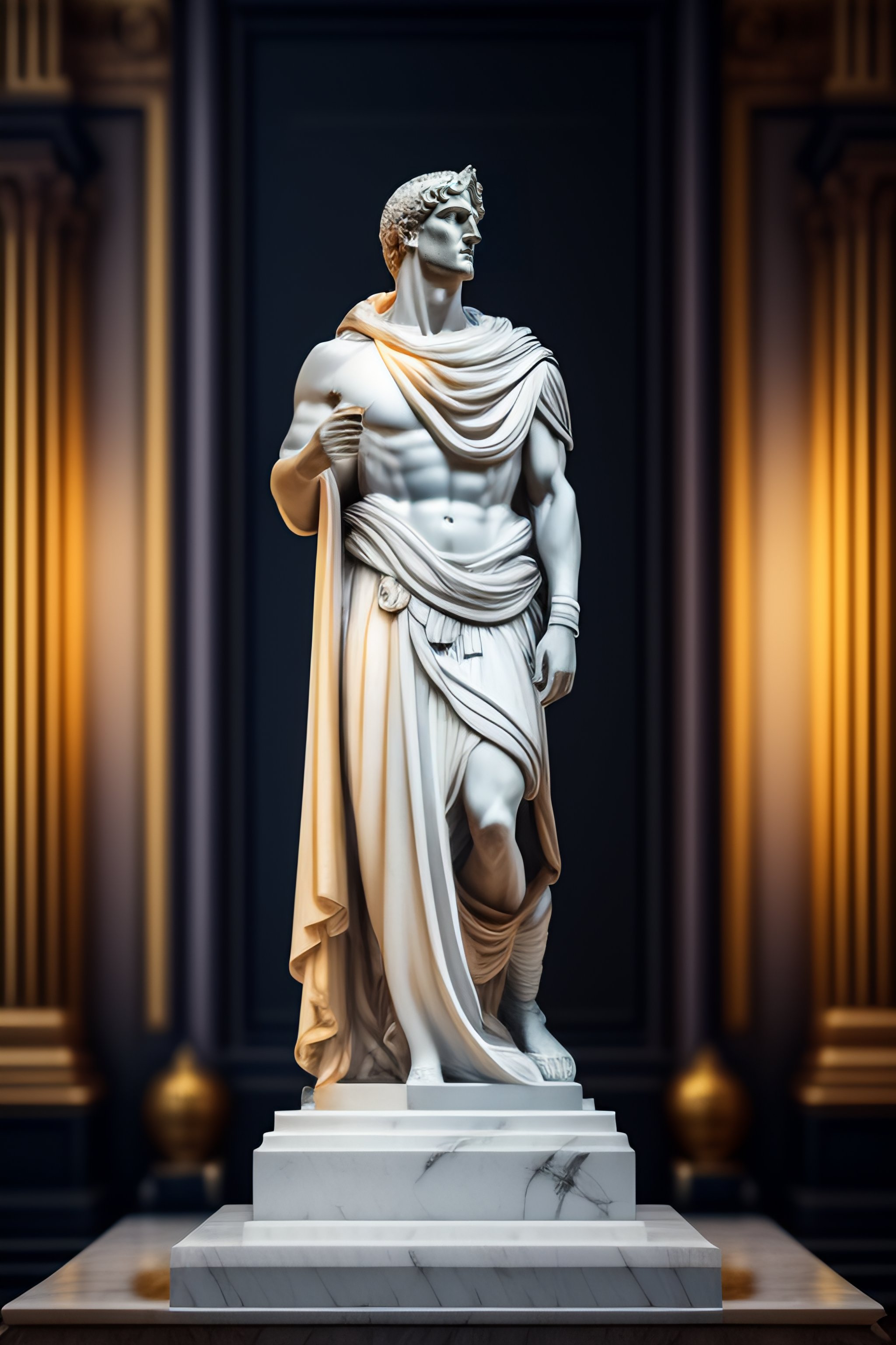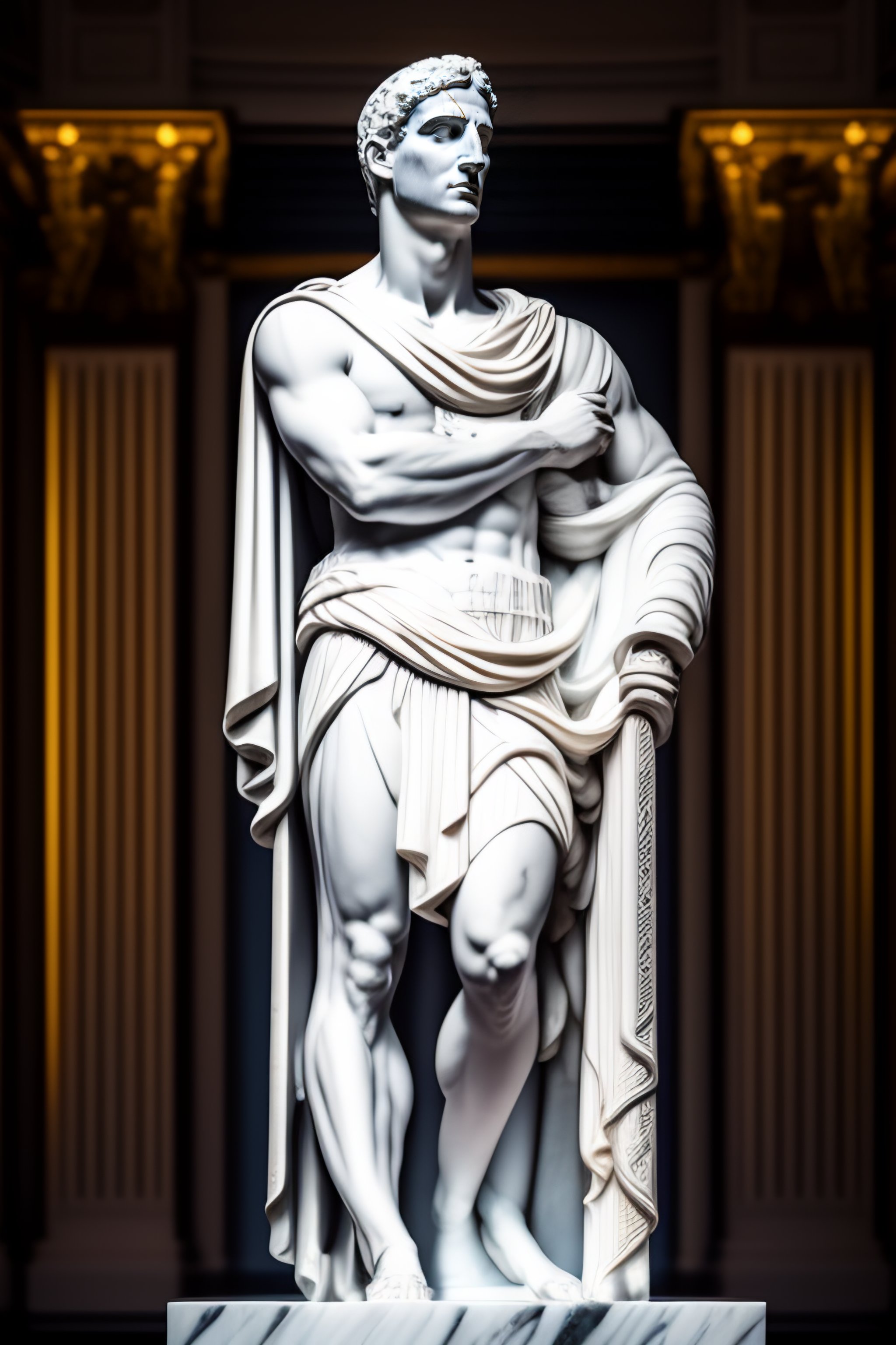 A realistic full body greek white marble statue of julius caesar wearing a ghostly toga, displayed in a museum art gallery, moody, dramatic lighting, dark, photorealistic, cinematic scene, super detailed, hyper realistic, bright lights, 8 k