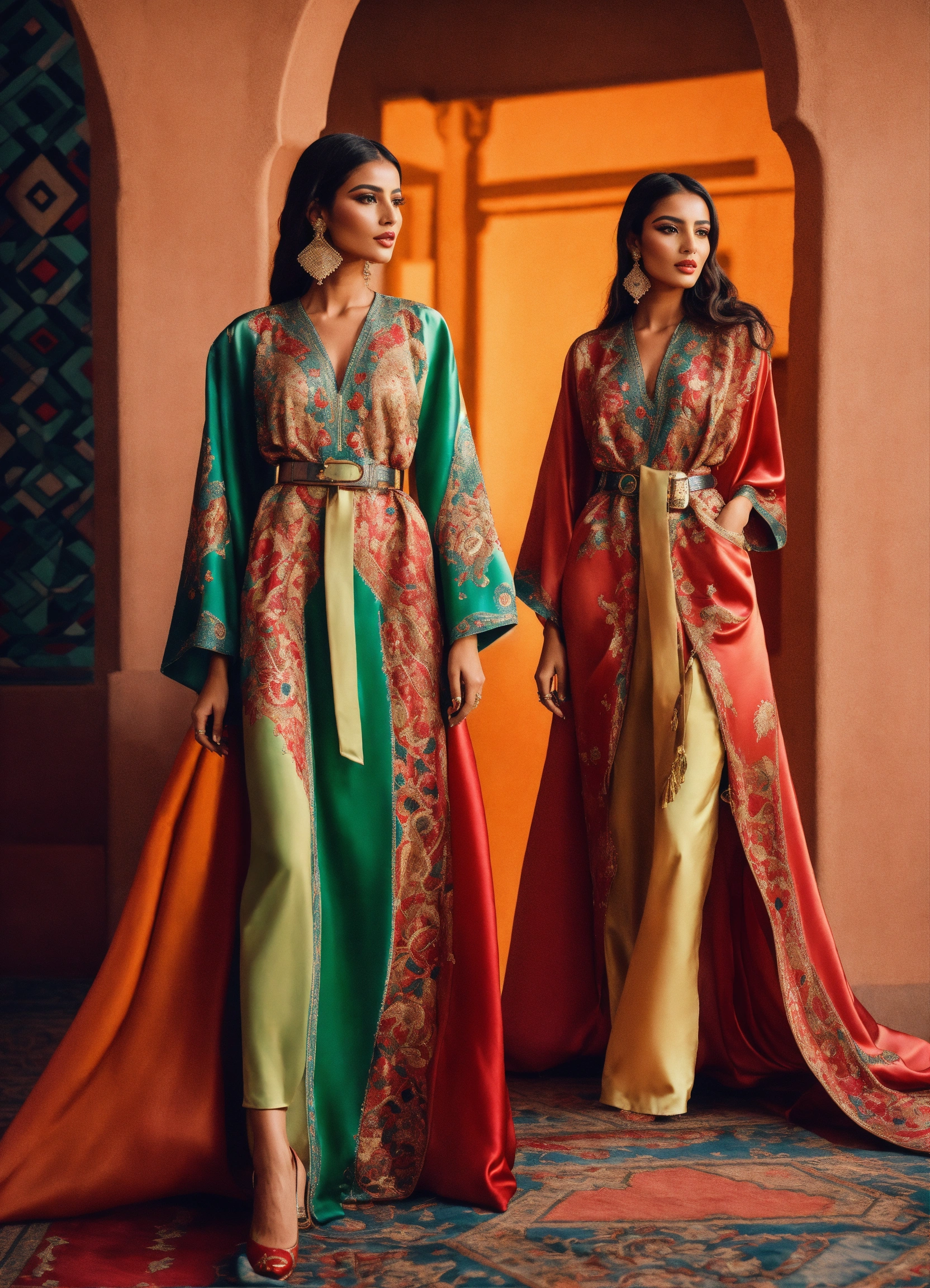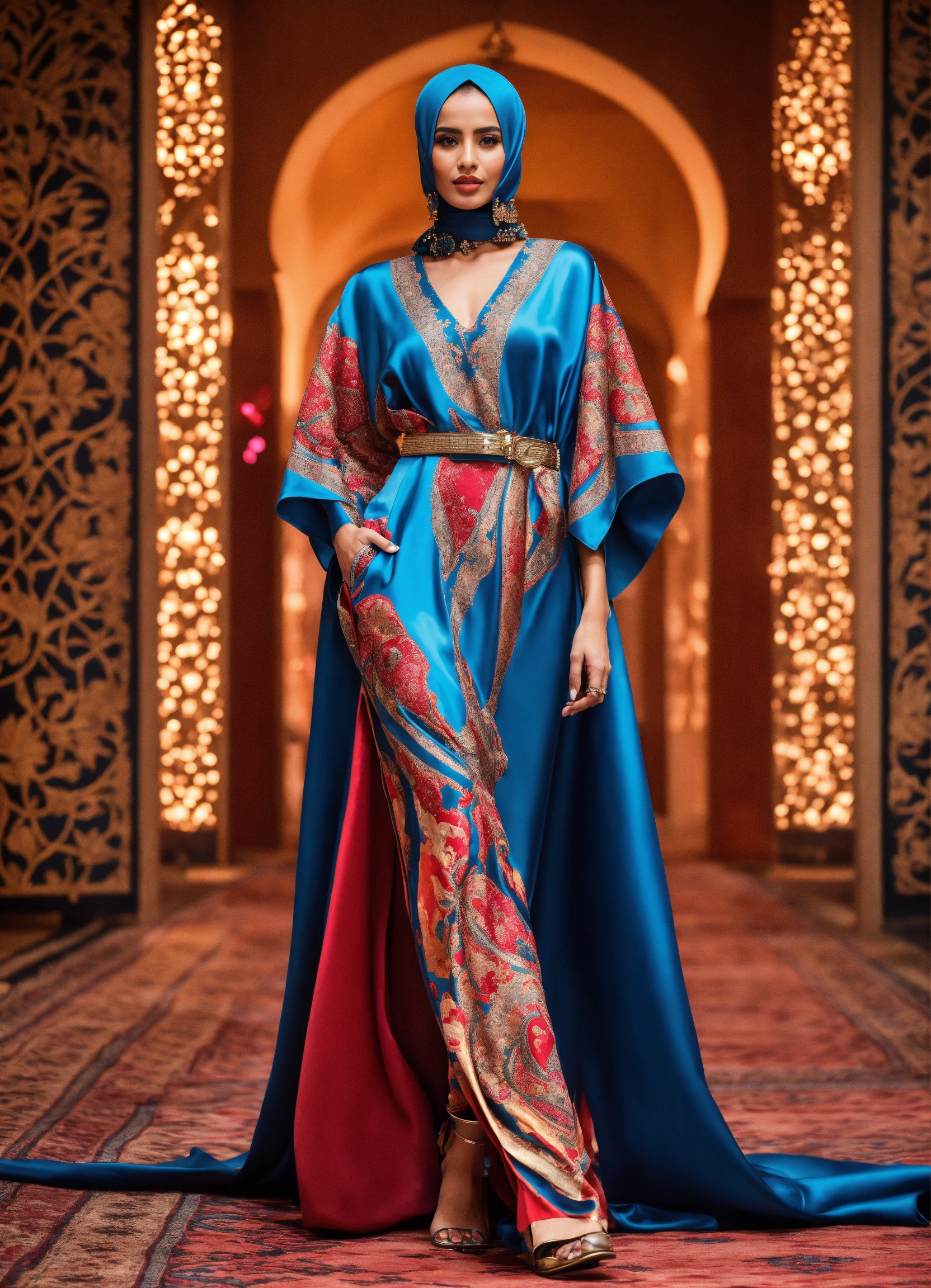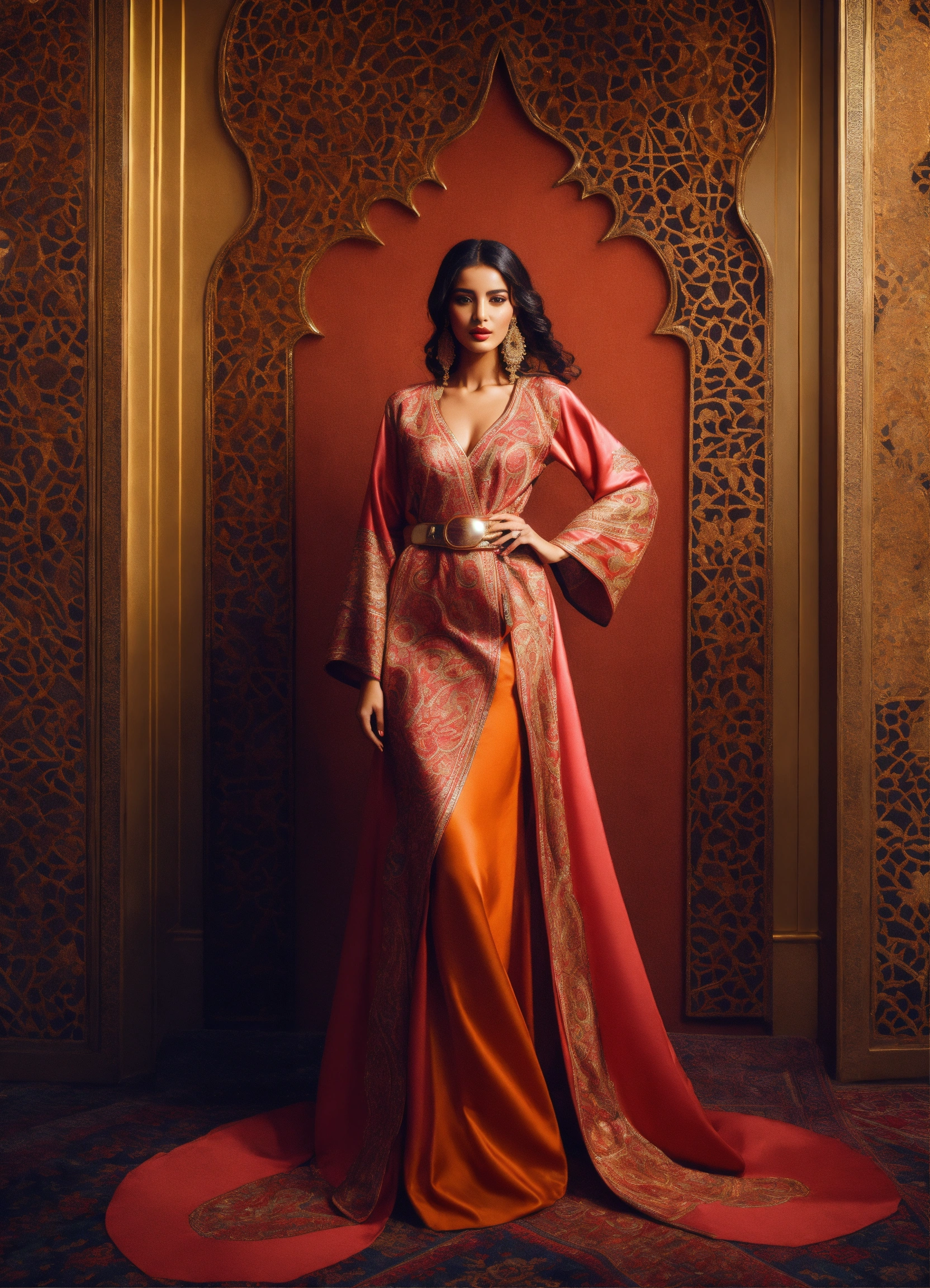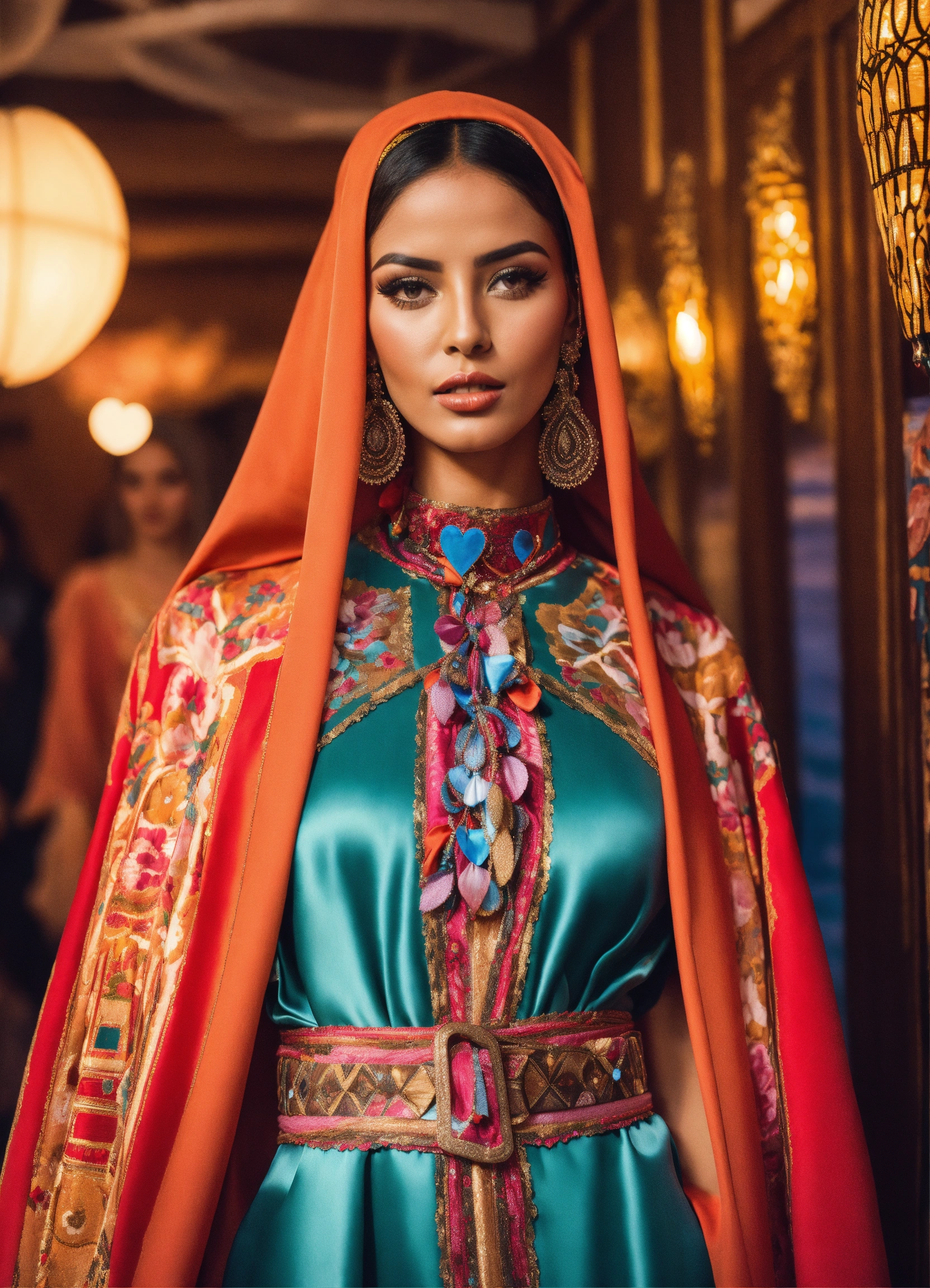Beautiful morrocan women wearing traditional morrocan with heart-shaped kaftan haute couture, luxury fabric silk, with belt morrocan hyperrealistic futurism in front decor runaway walk fashion show