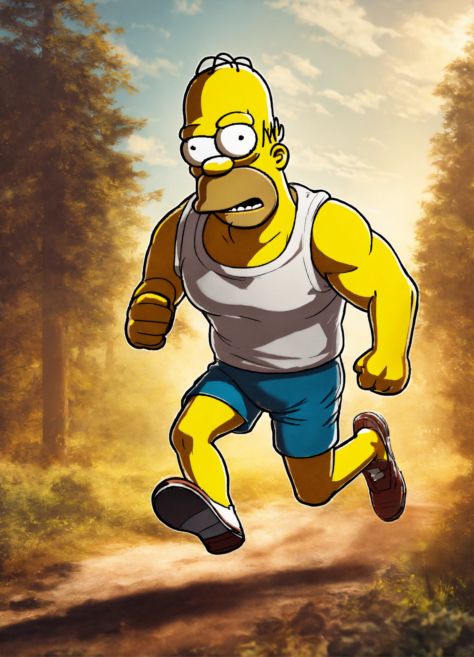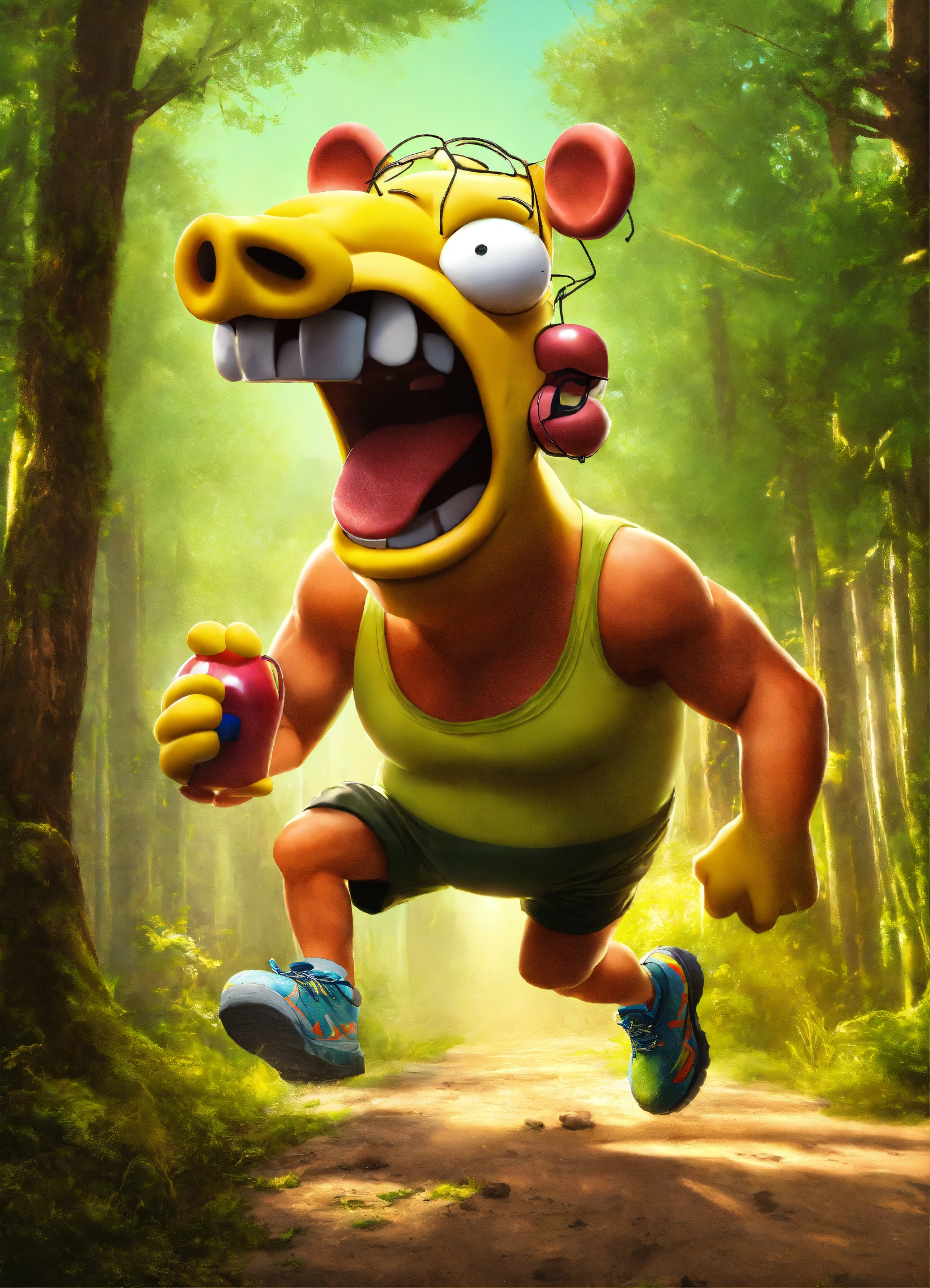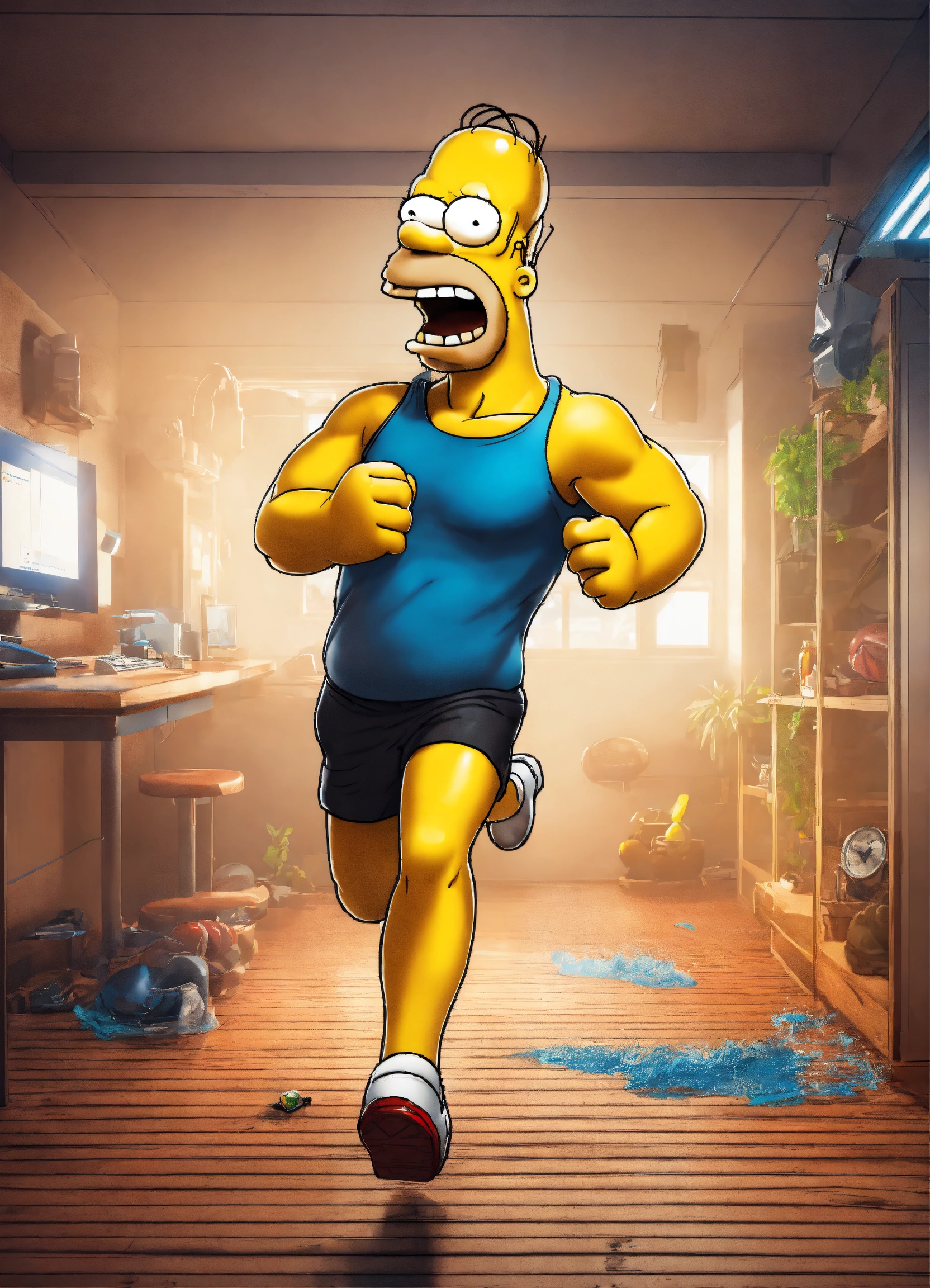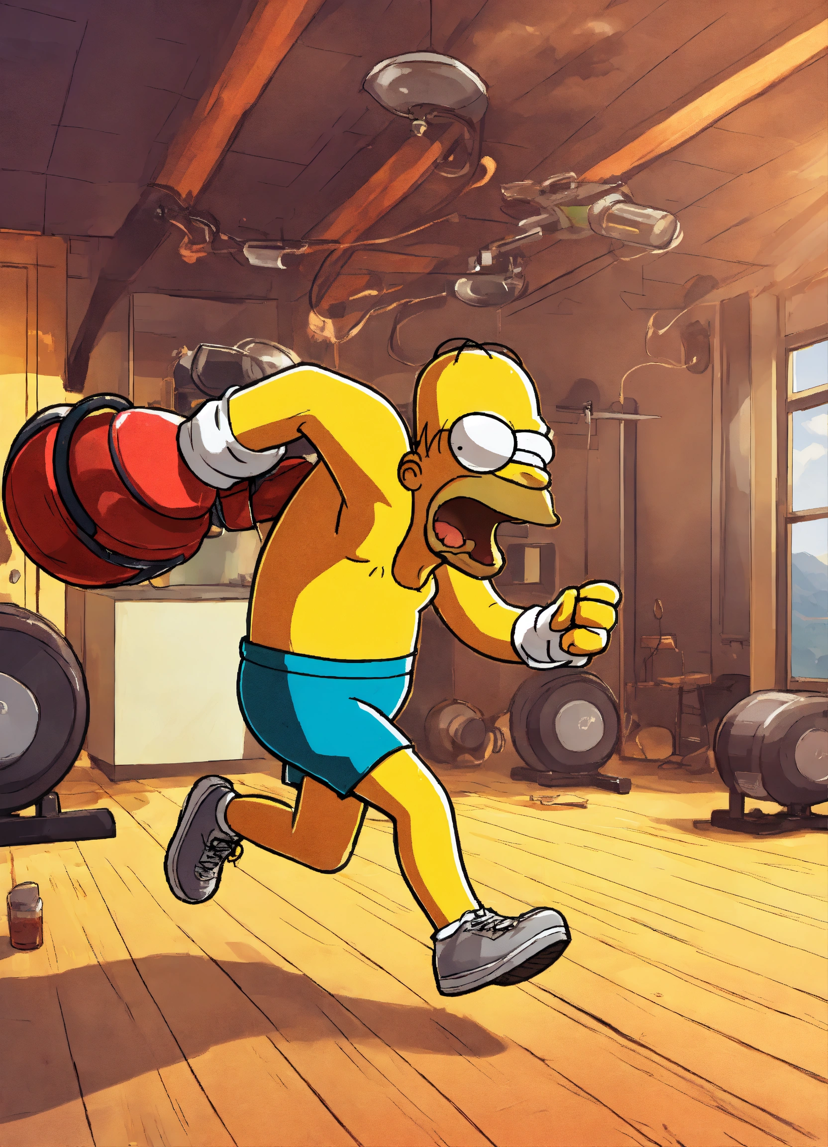 Humoristic homer simpson body mixed with wild boar head running, amazing high tech fitness room digital illustration