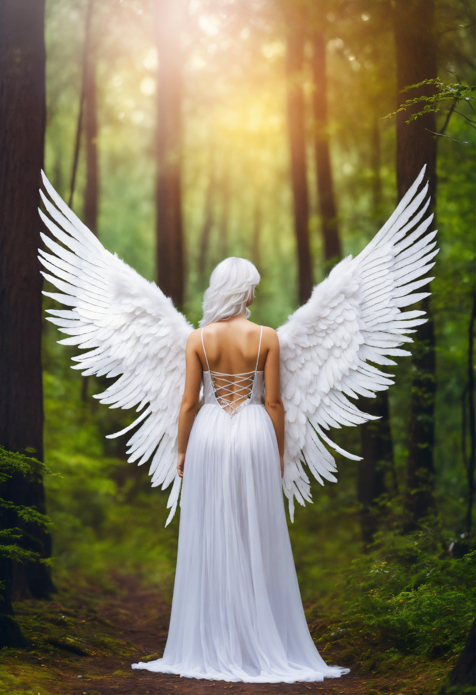 White hair angel with fairy wings forest background