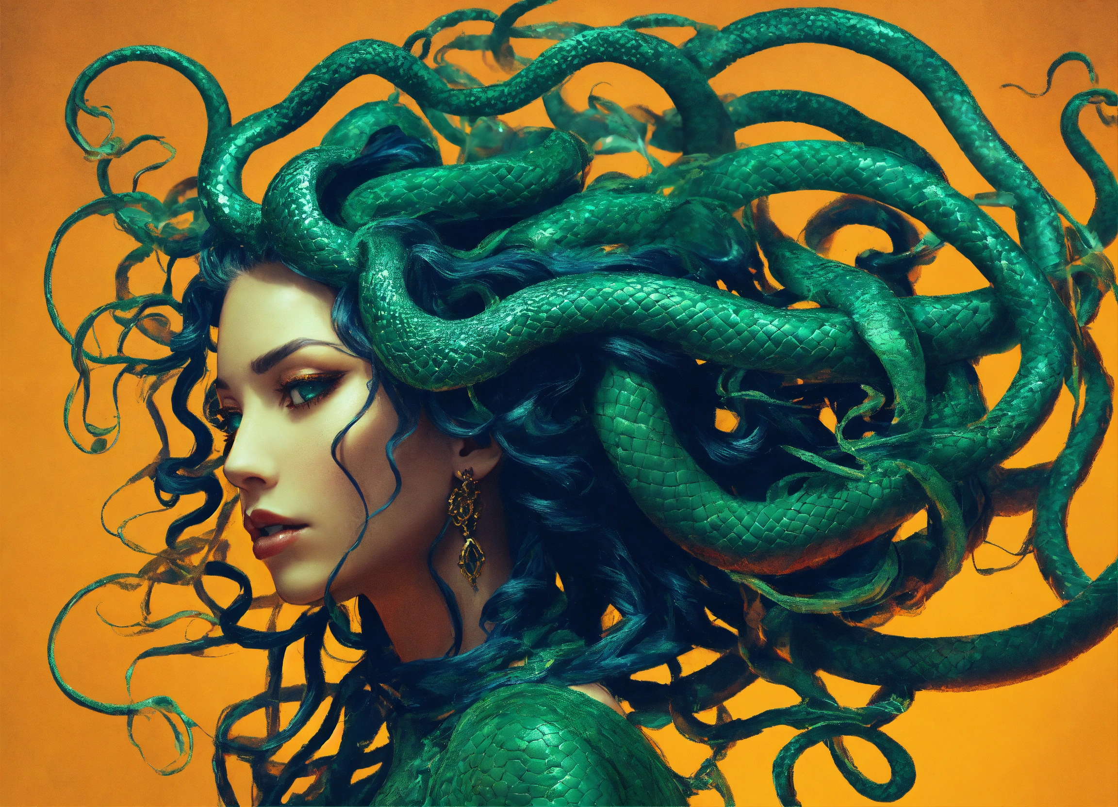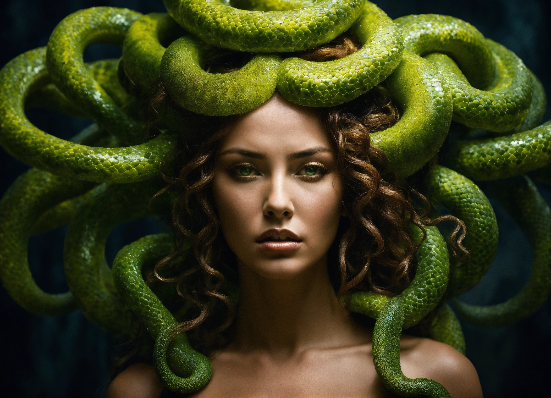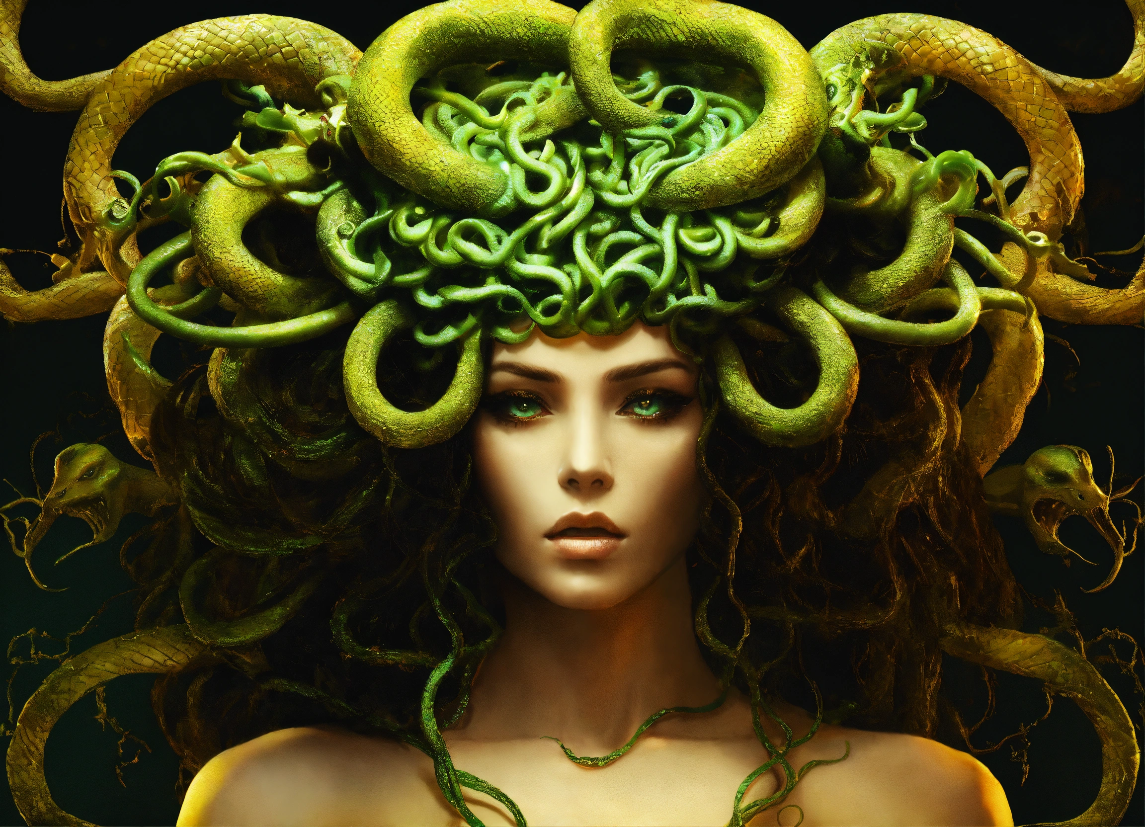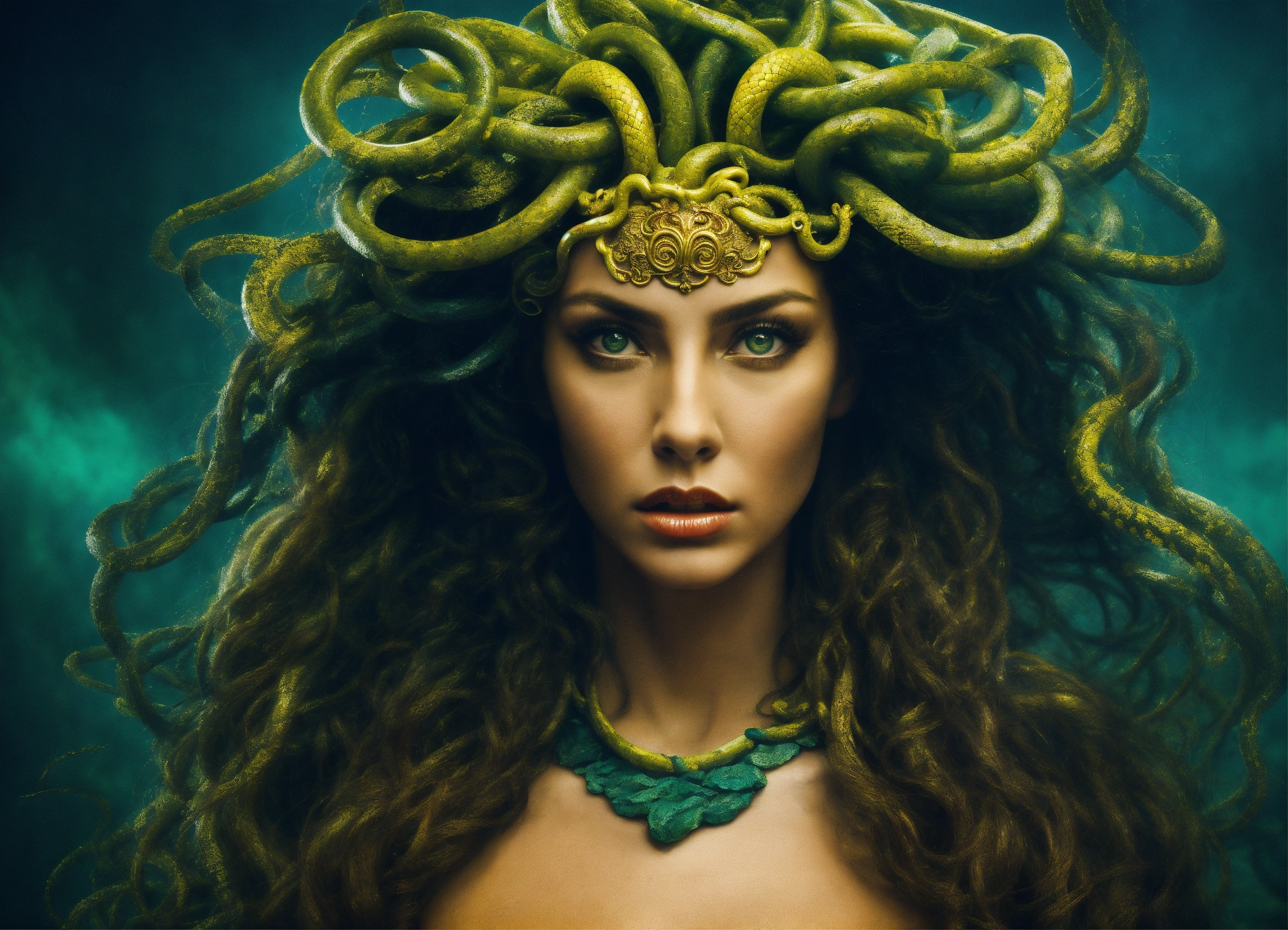Medusa transformation and redemption a bold and unique choice, medusa's image could symbolize a journey from victimhood to empowerment. rather than focusing on the terrifying aspects, portray her in a moment of transformation or redemption, with her serpentine hair and strong gaze symbolizing wisdom and inner strength.