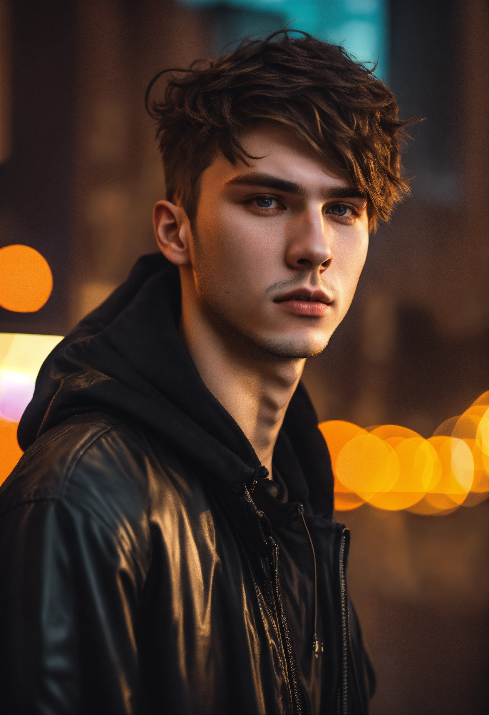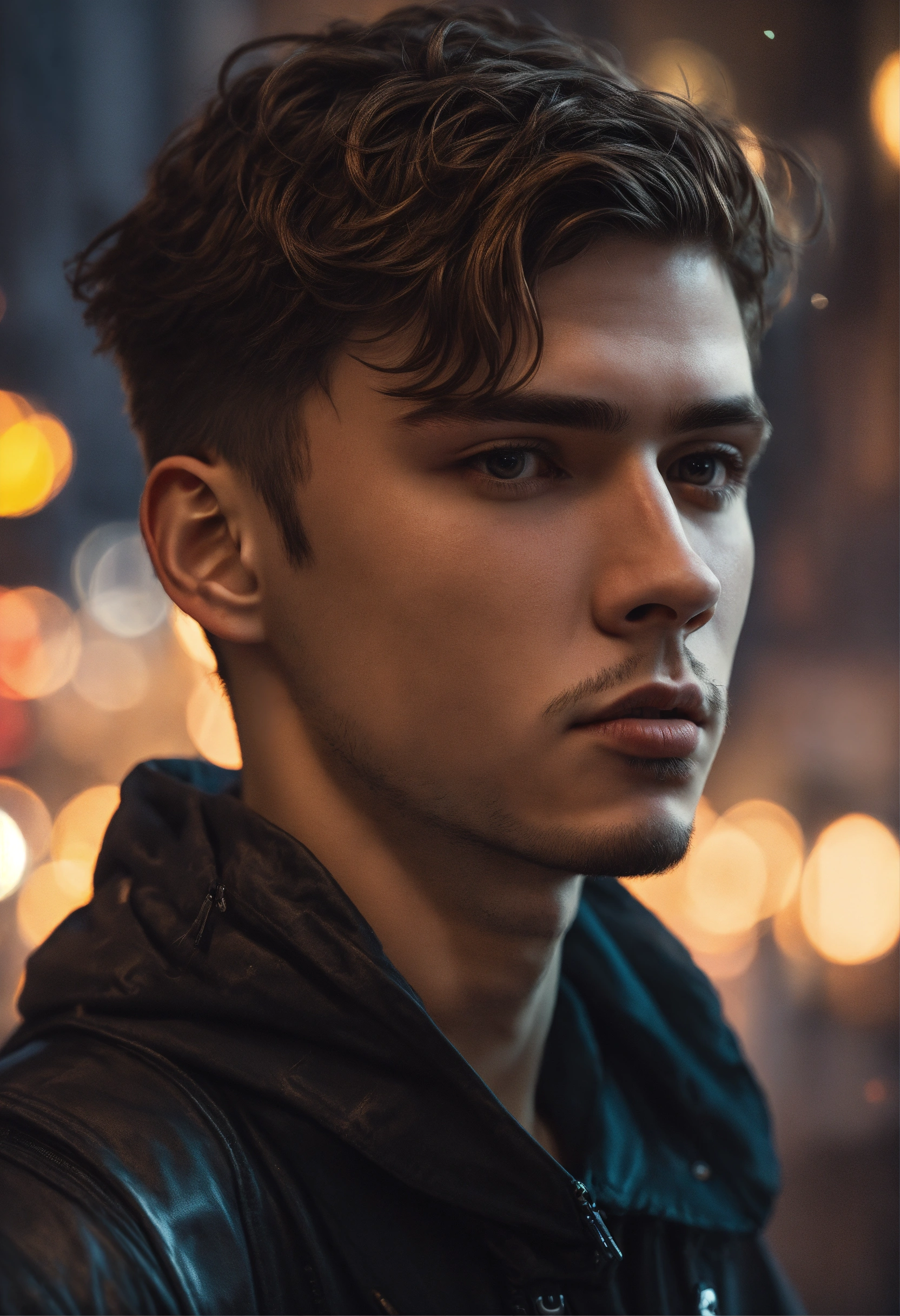 Highly detailed portrait of russian young man 25 years old, thin, brown short hair, brown eyes, kind eyes, clean, handsome, cyberpunk, wearing black corpo street wear, cartoon realism, black, grunge aesthetic!!! bokeh