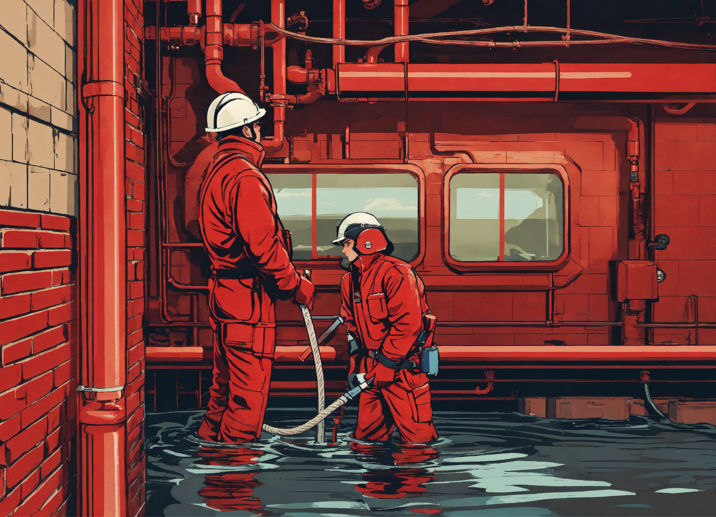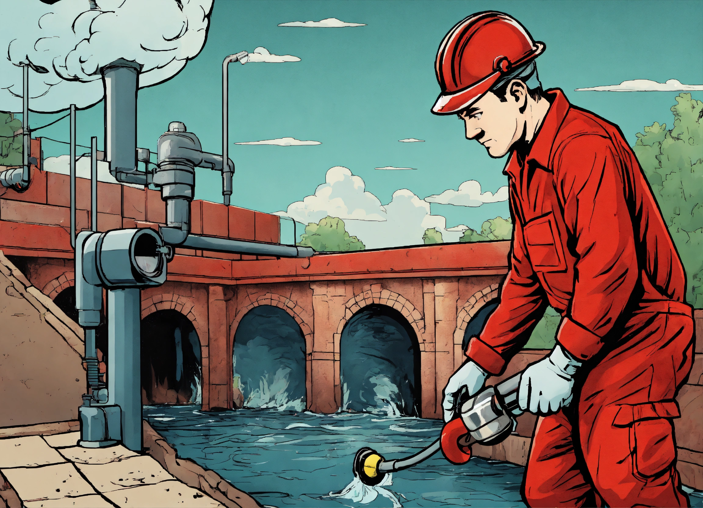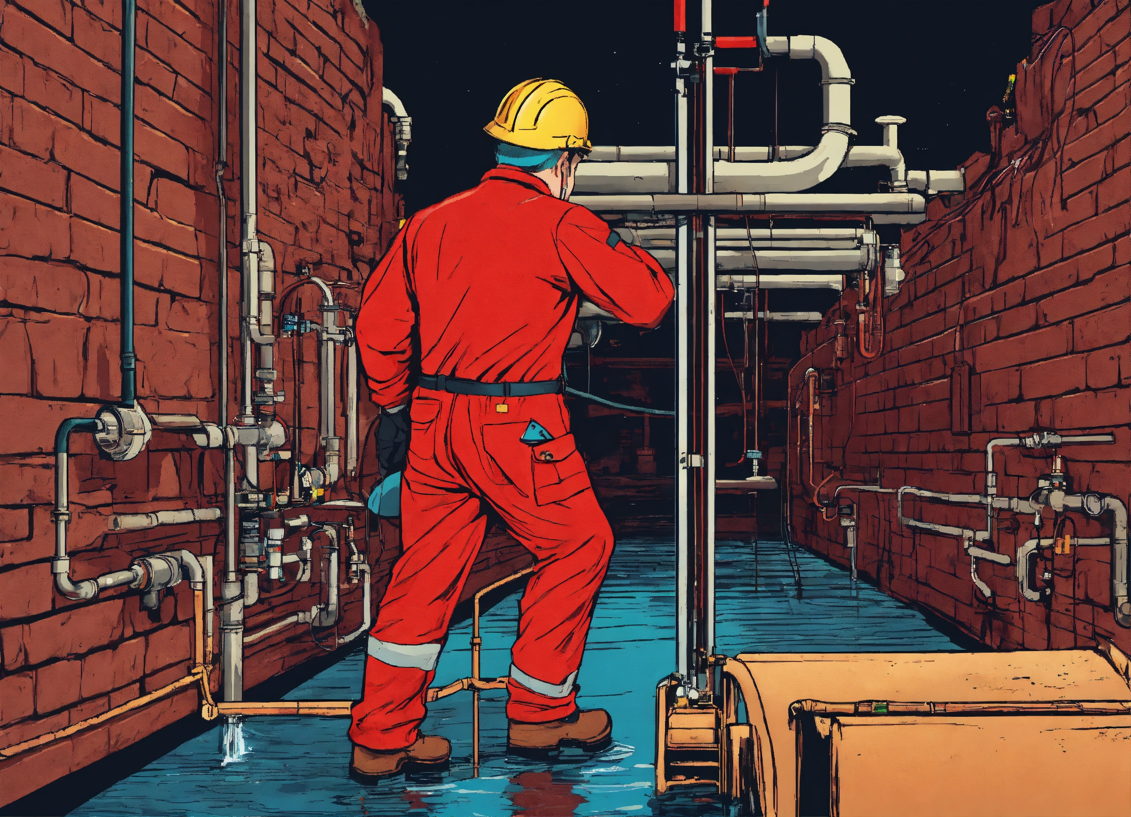 A plumber in a red overall with a red hard helm is standing in front of the access to the canalisation and launching a cable into the access, comic style