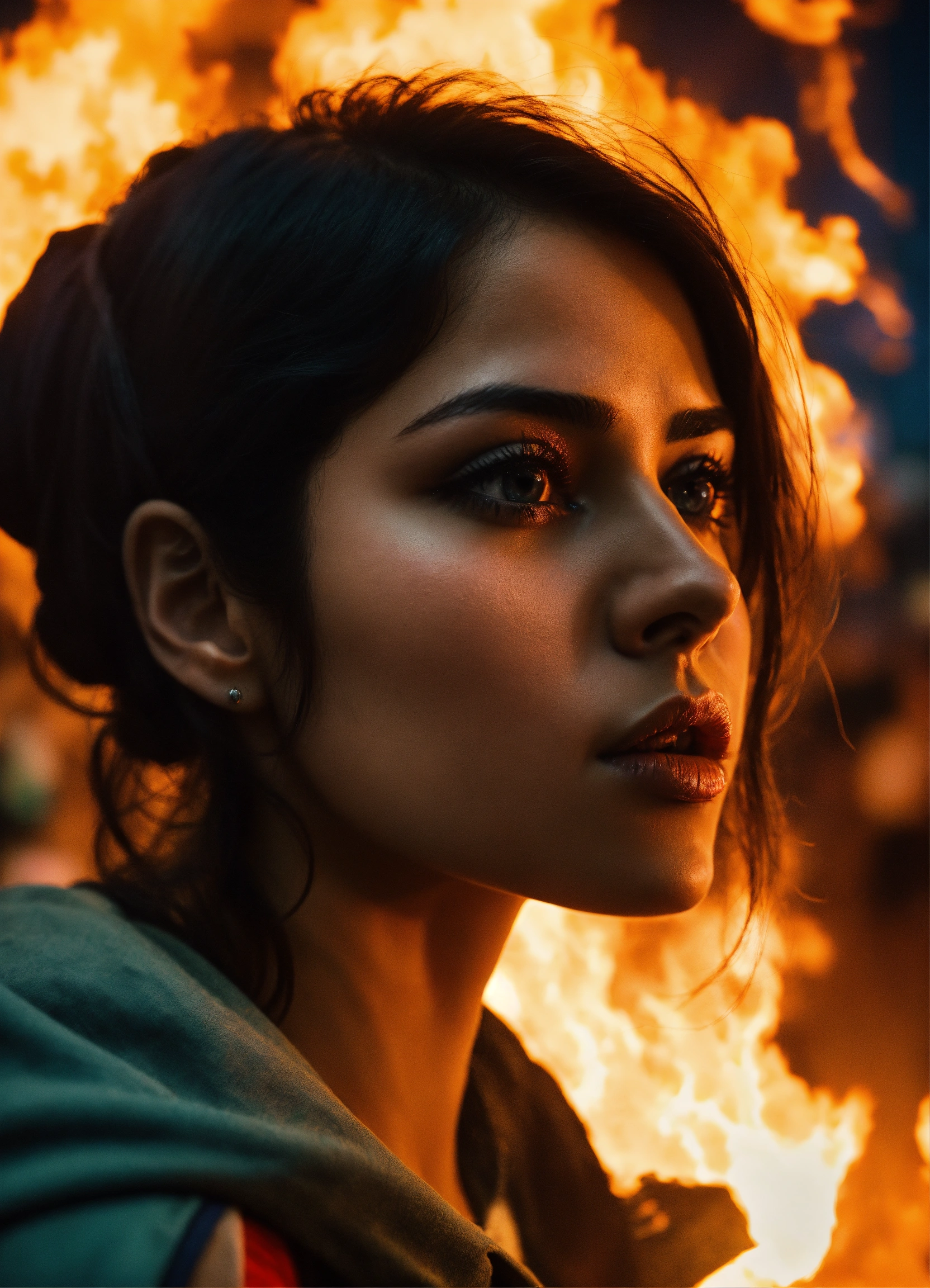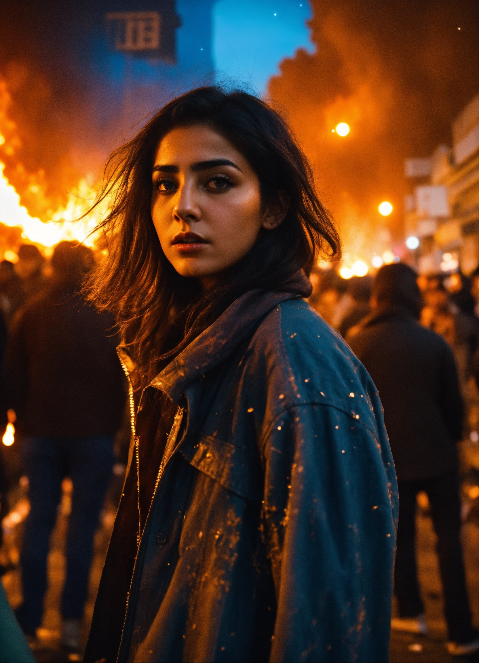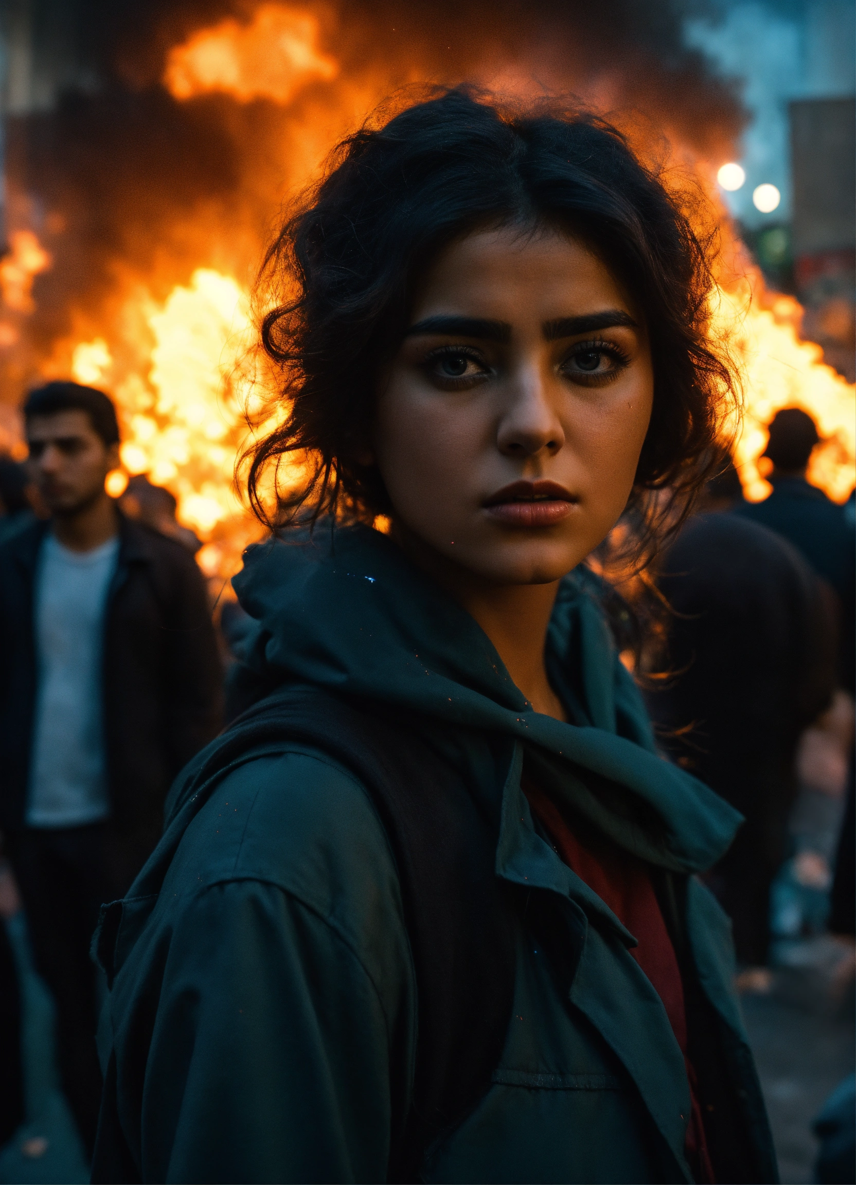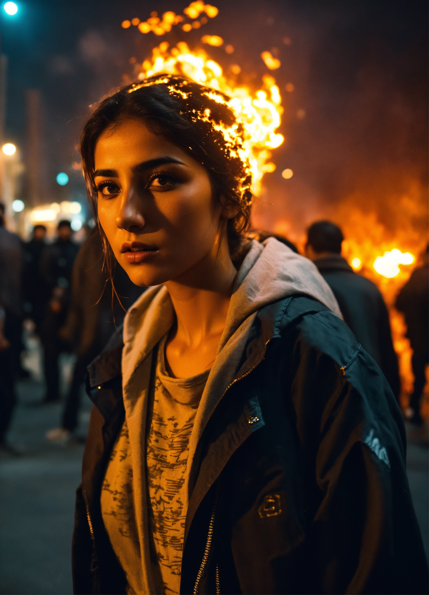 Medium close-up, dark aesthetic photo, an iranian girl amidst a chaotic street protest in tehran, the scene is filled with tension and unrest, as flames from an explosion illuminate the night sky, stunning surreal photo of an intense scene. she is looking at the camera, extremely detailed, realistic photo, 4k realistic photo