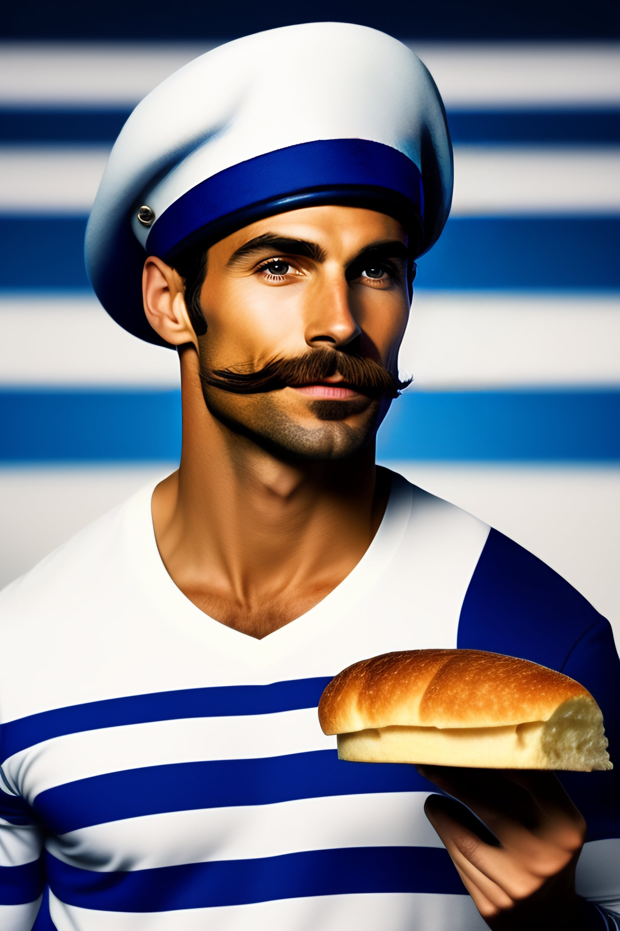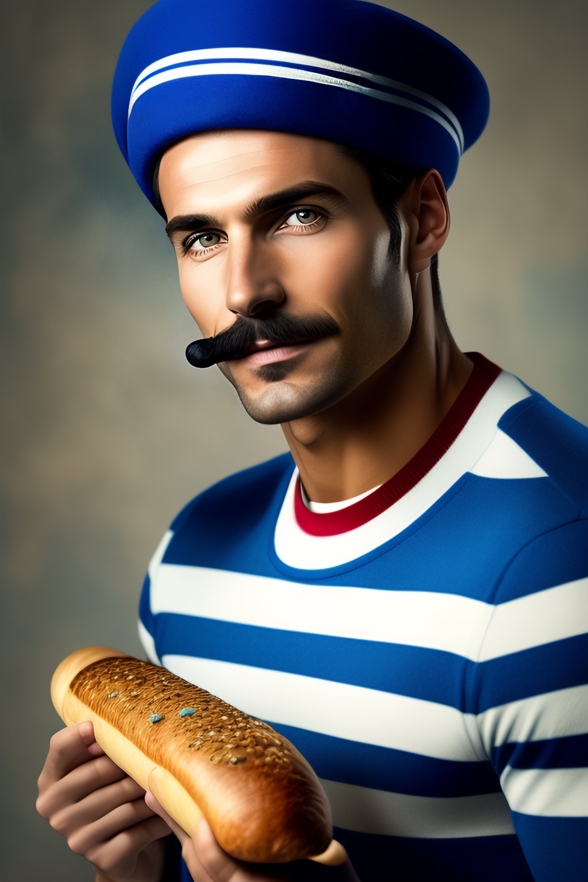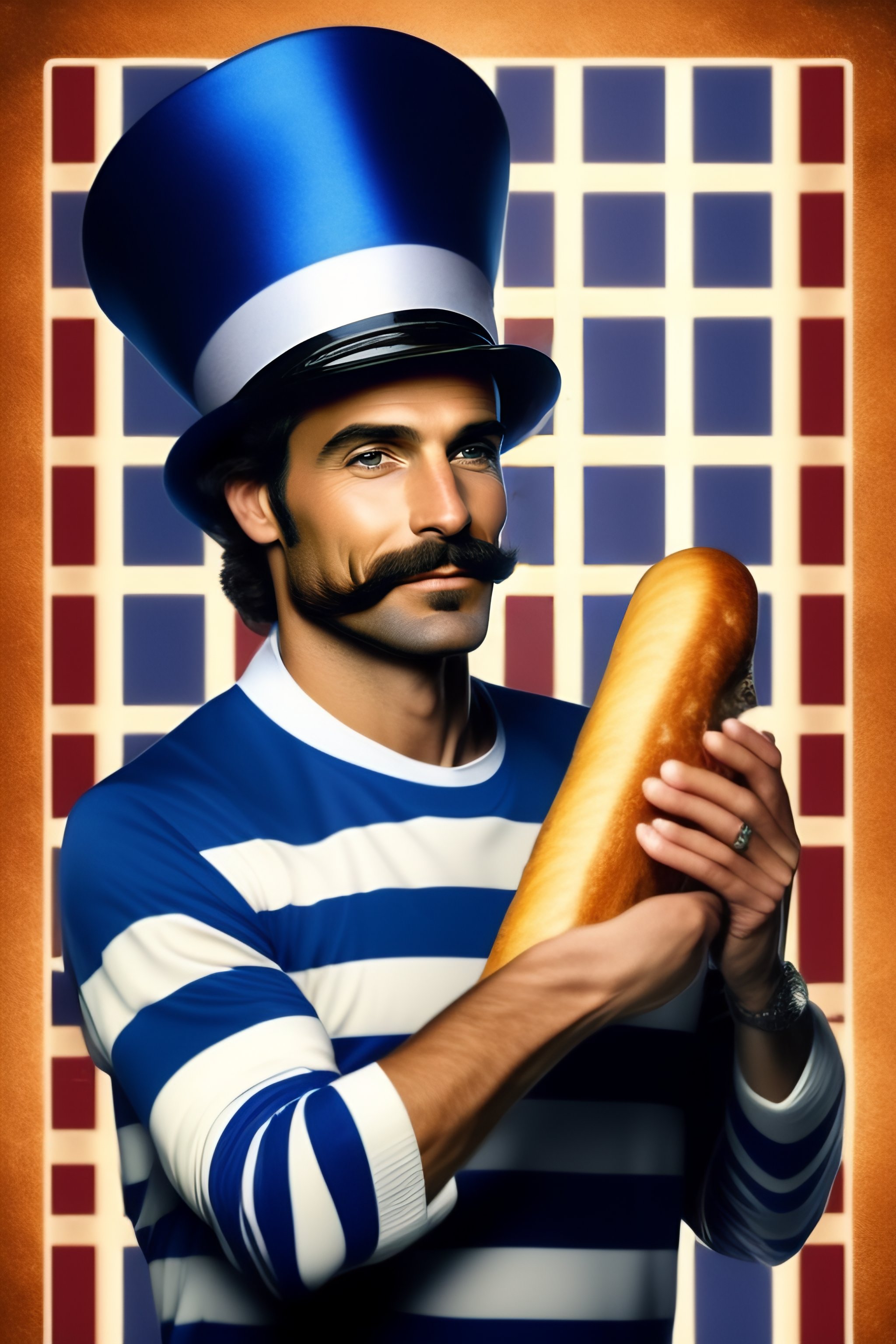 Frenchman with beret and blue and white striped long-sleeved t-shirt, narrow mustache, holding a baguette in one hand and holding a baguette in the other hand. he makes a gesture that it tastes good. blurred background french flag. lettering in french at the bottom of the picture: "it's good!" writing like handwriting