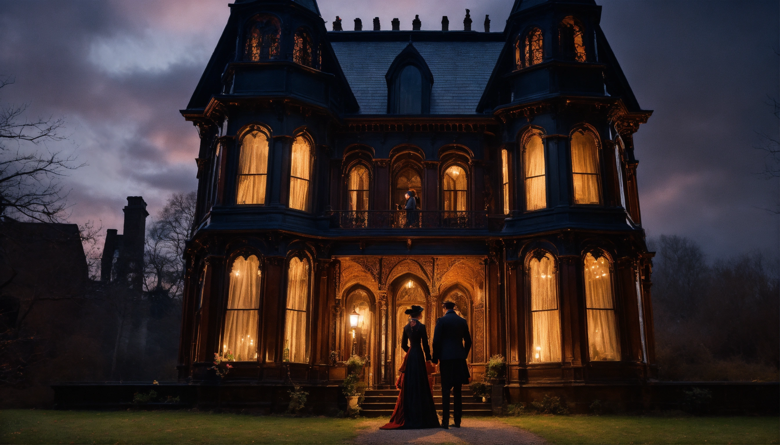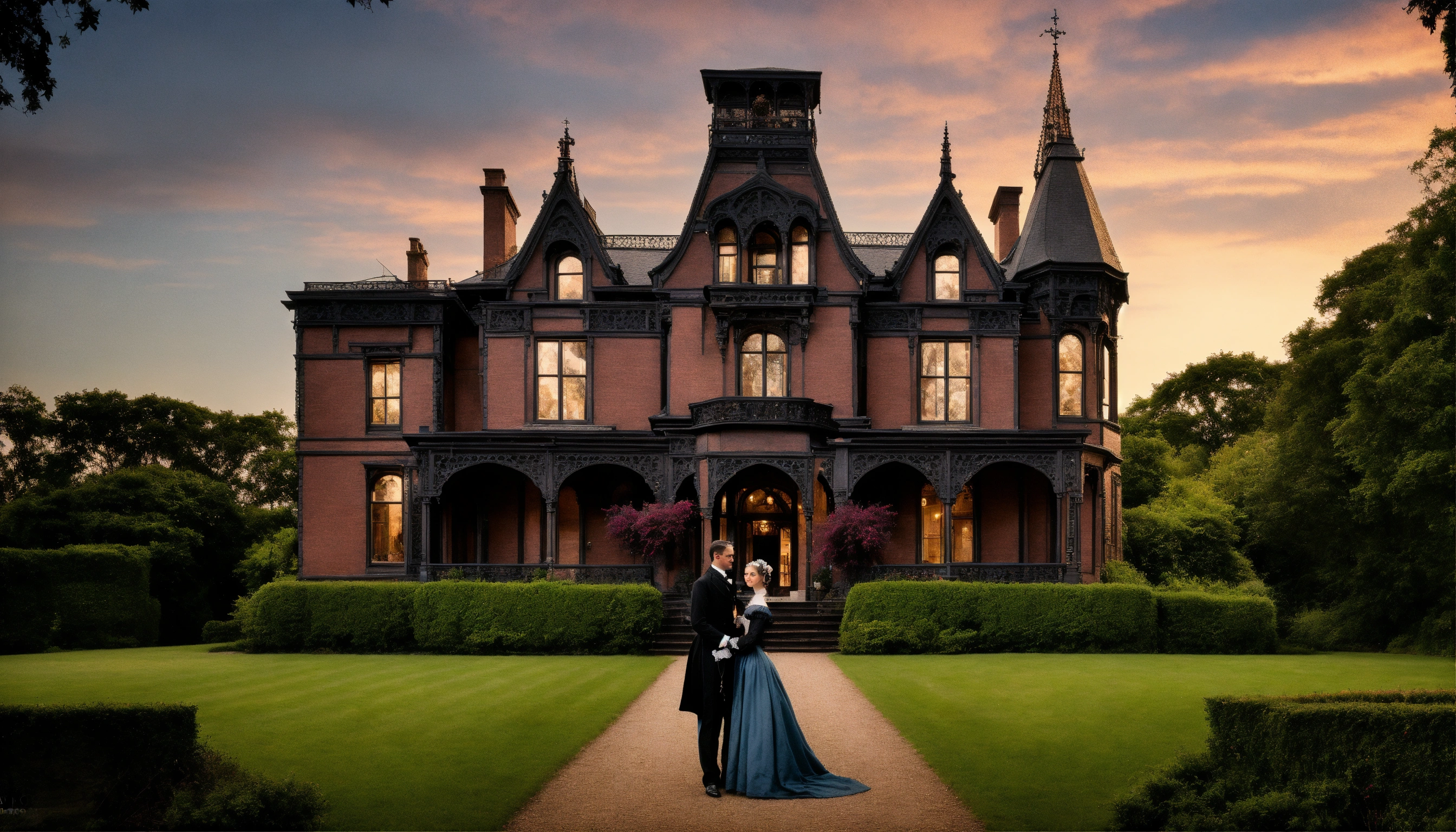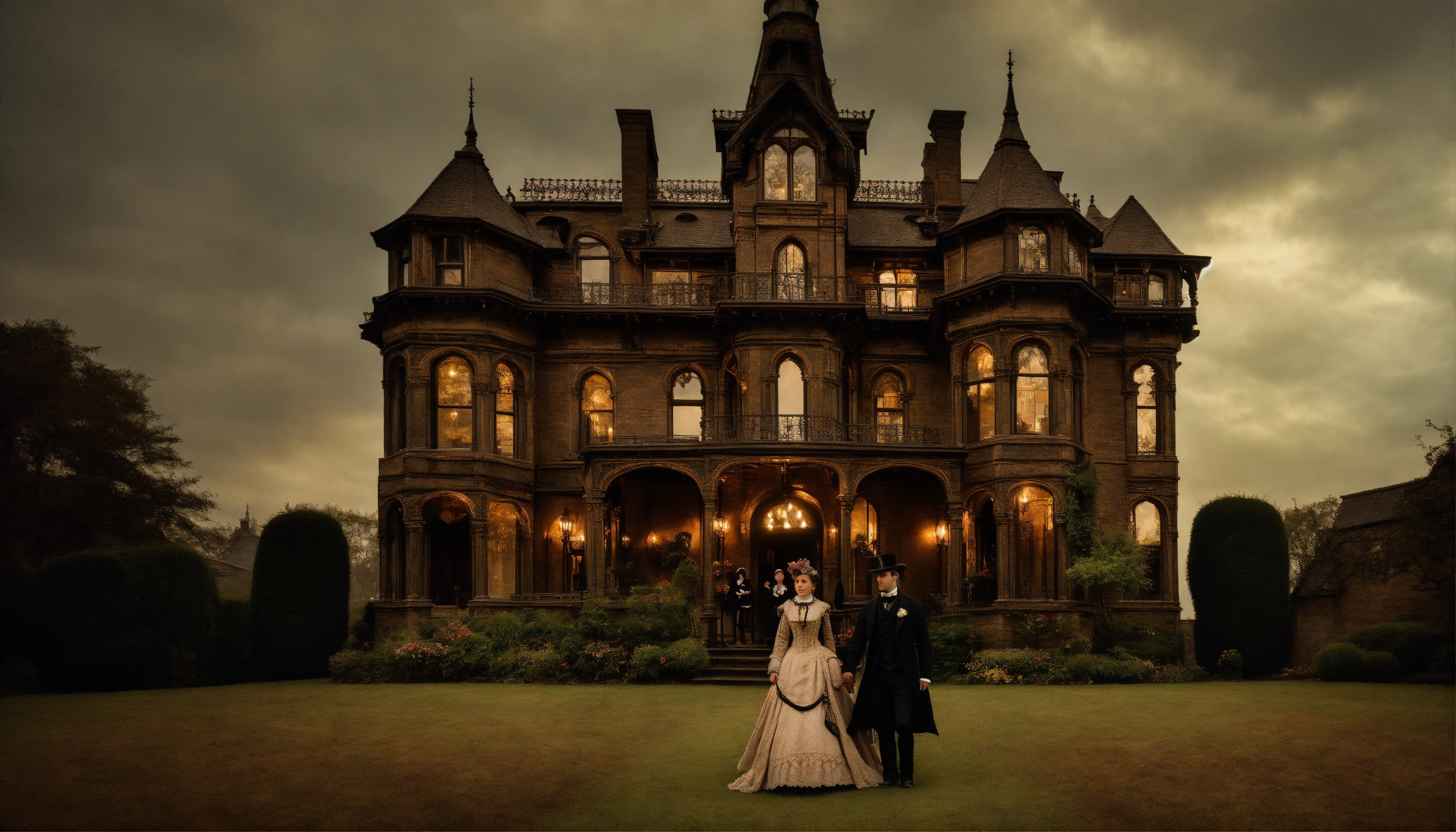 Photograph of a 19th century couple in a gothic style victorian mansion