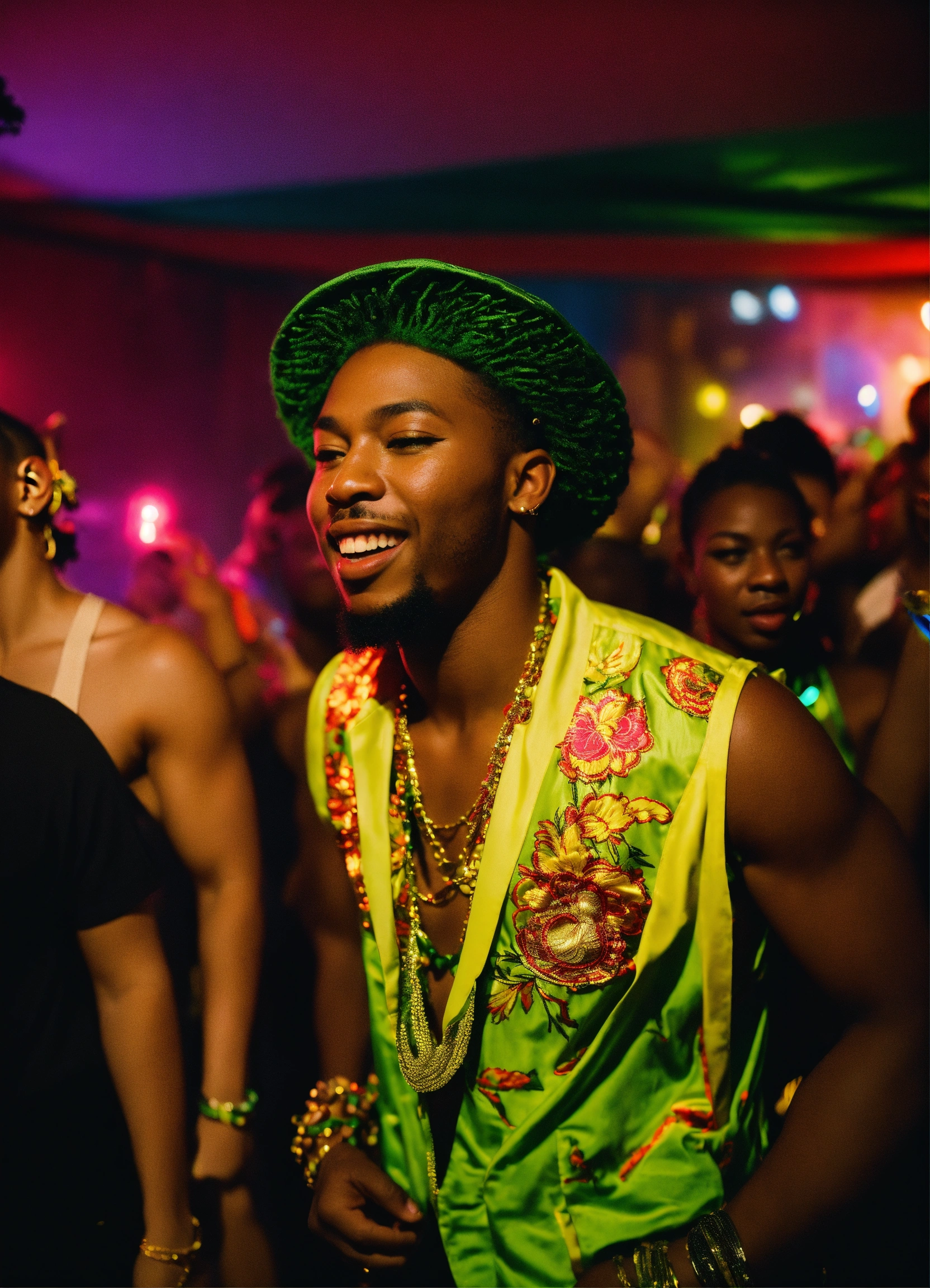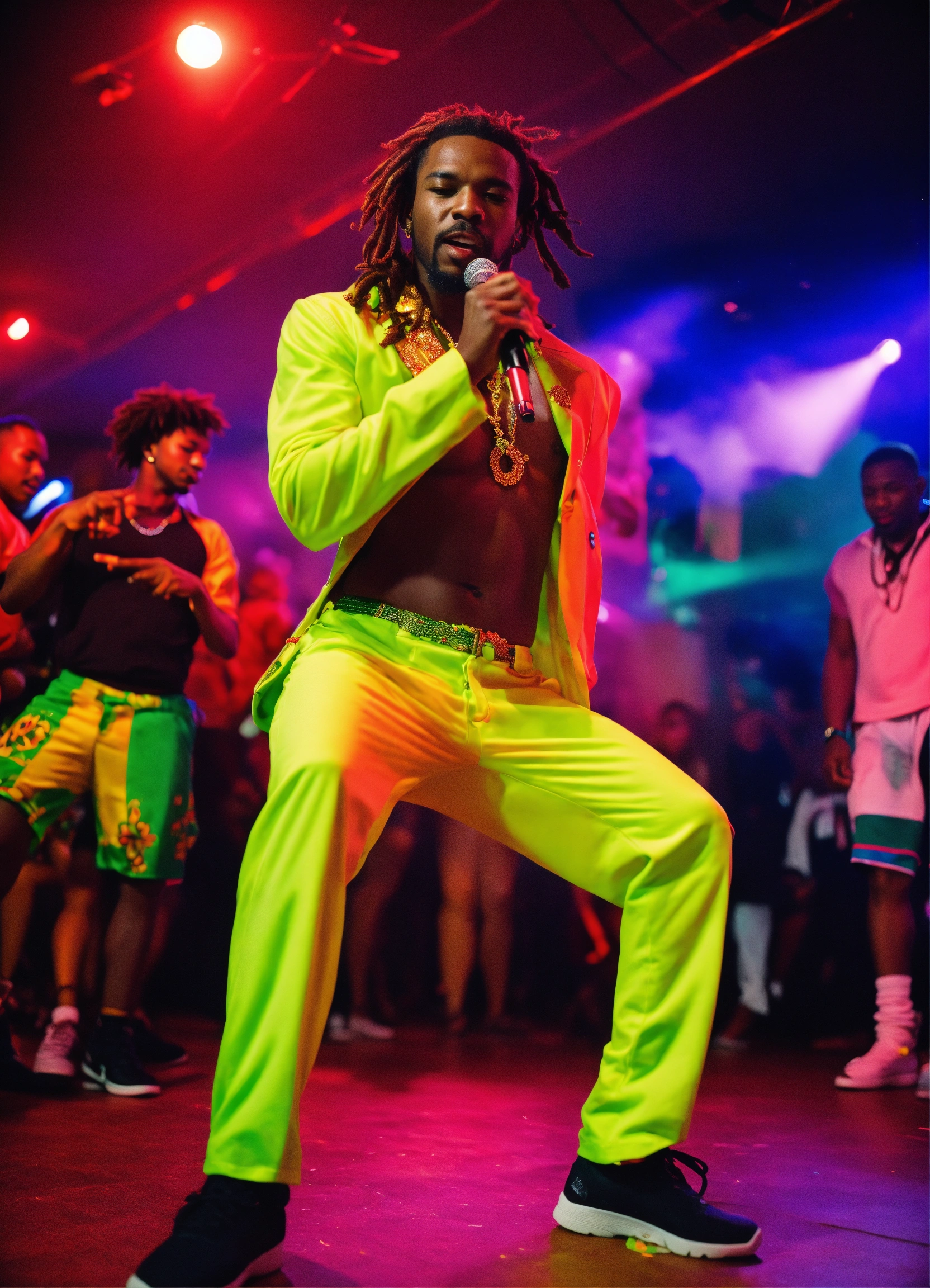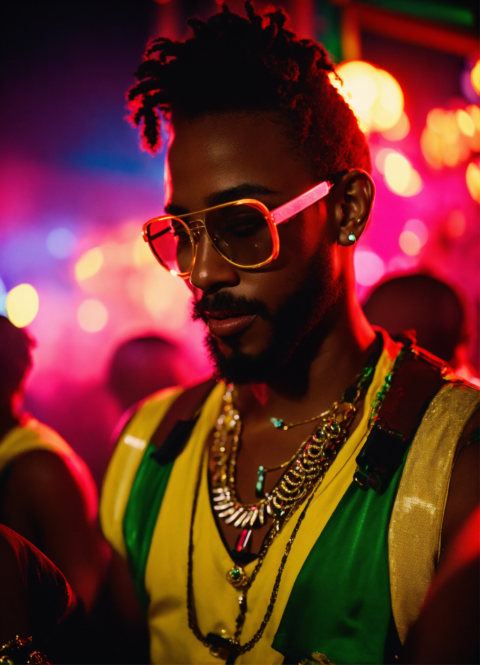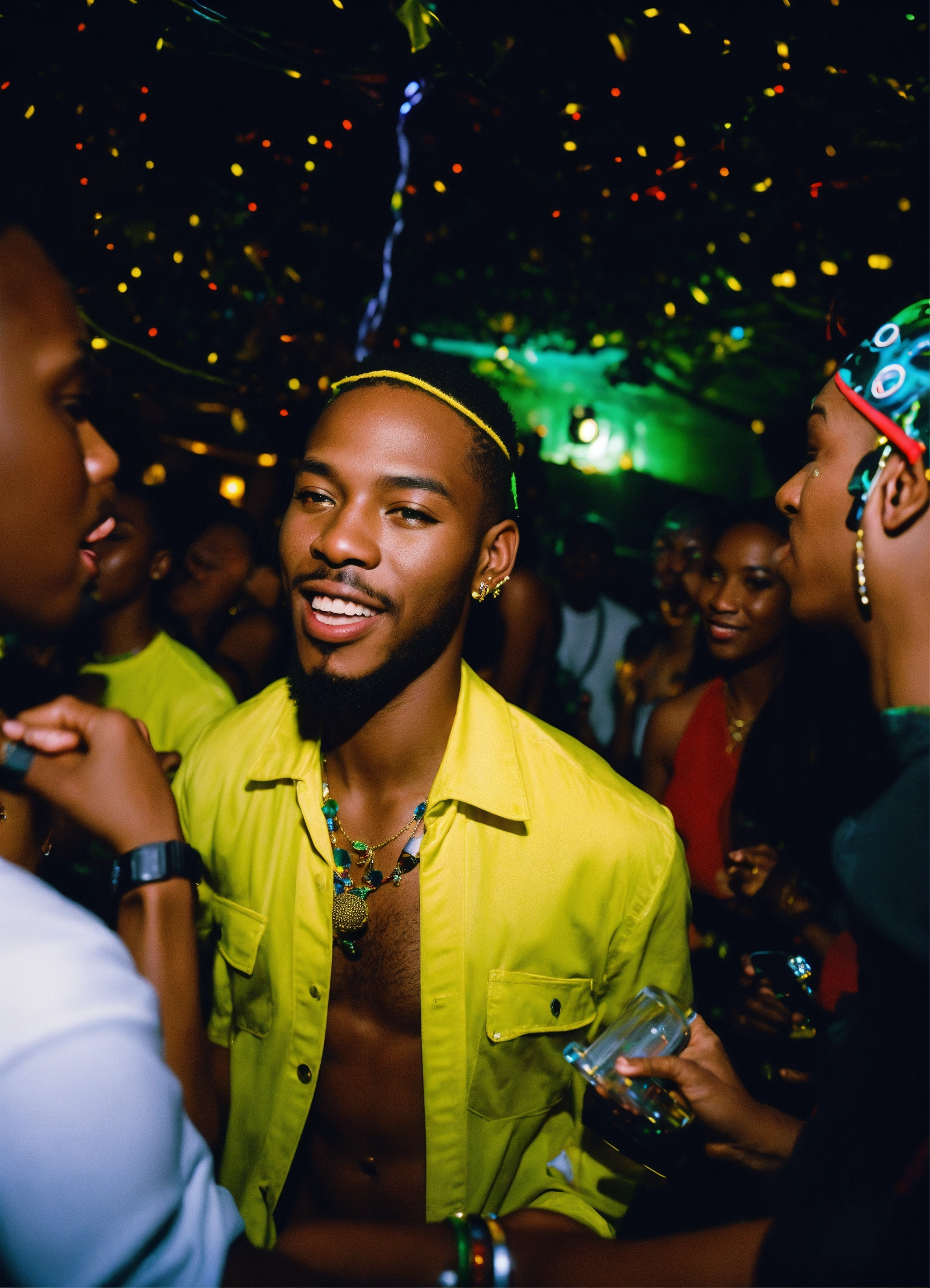 Extremely detailed photographic image, grained image, beautifully composed, colorful image, dancehall party, caribbean dance party photography, leica summicron 35mm f2.0, kodak 400tx, fashion photography, beautiful jamaican people dancing, realistic night time dance party, a man on the microphone sining reggaeton, party fashionable islanders, night time party, yellow, red, green neon lighting