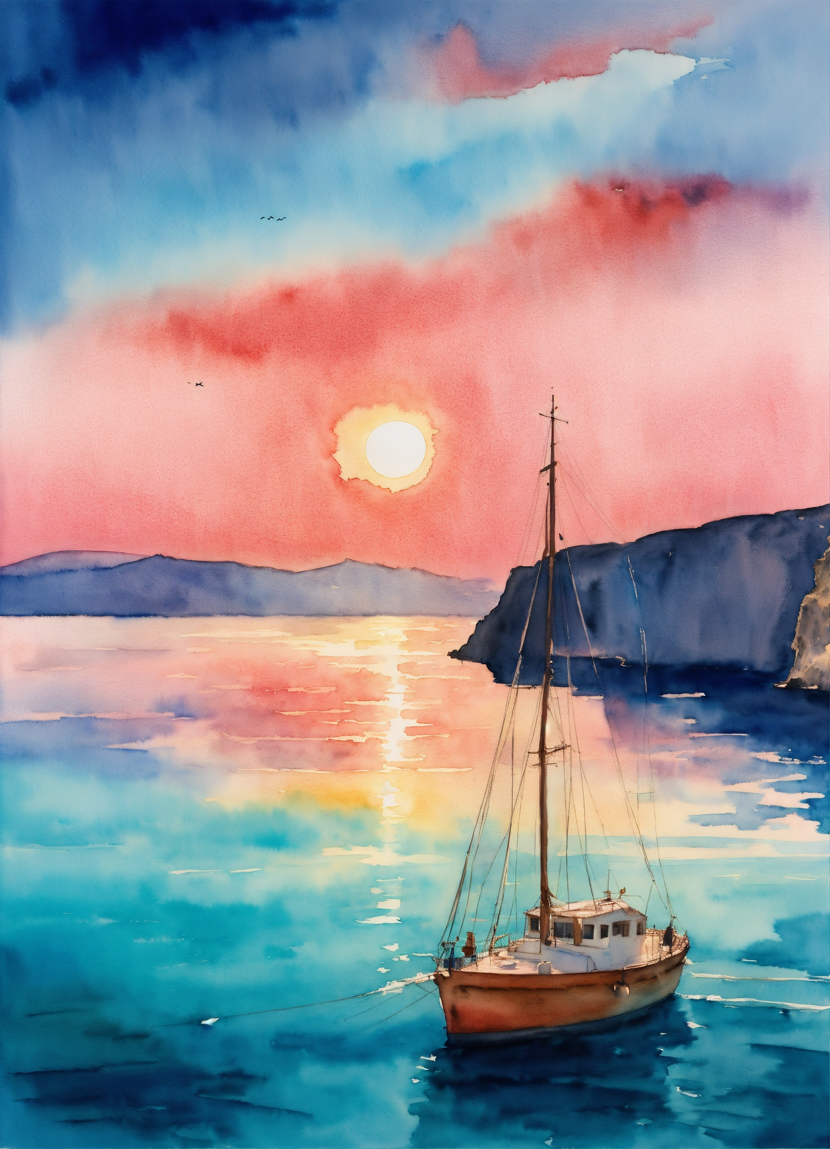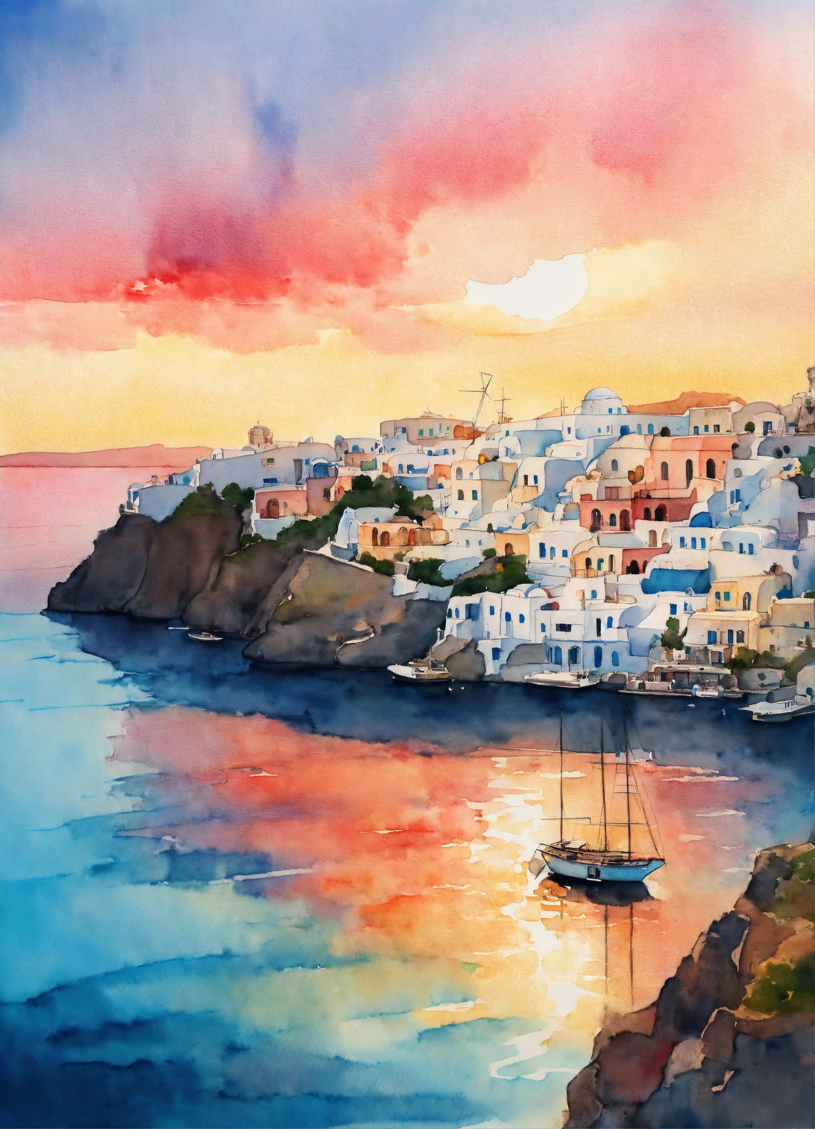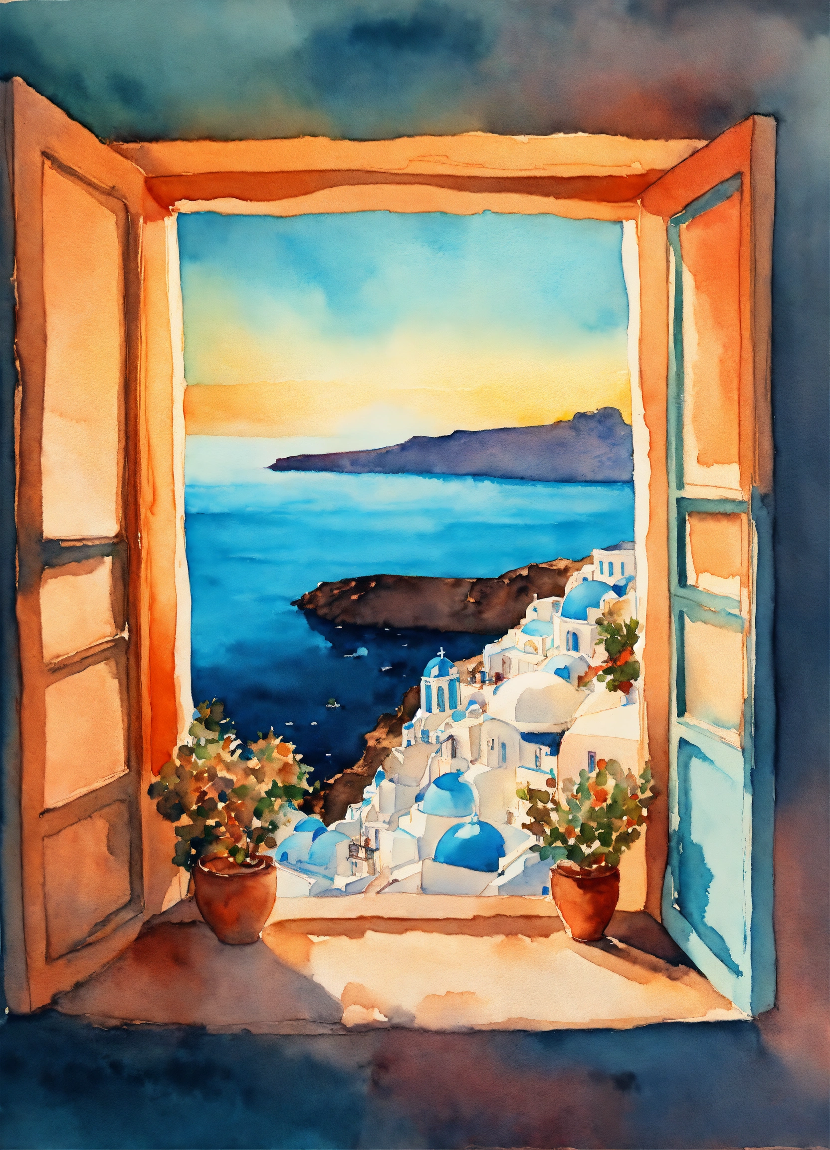 Watercolor of a lit from the inside santorini floating in a turquoise sunset sky