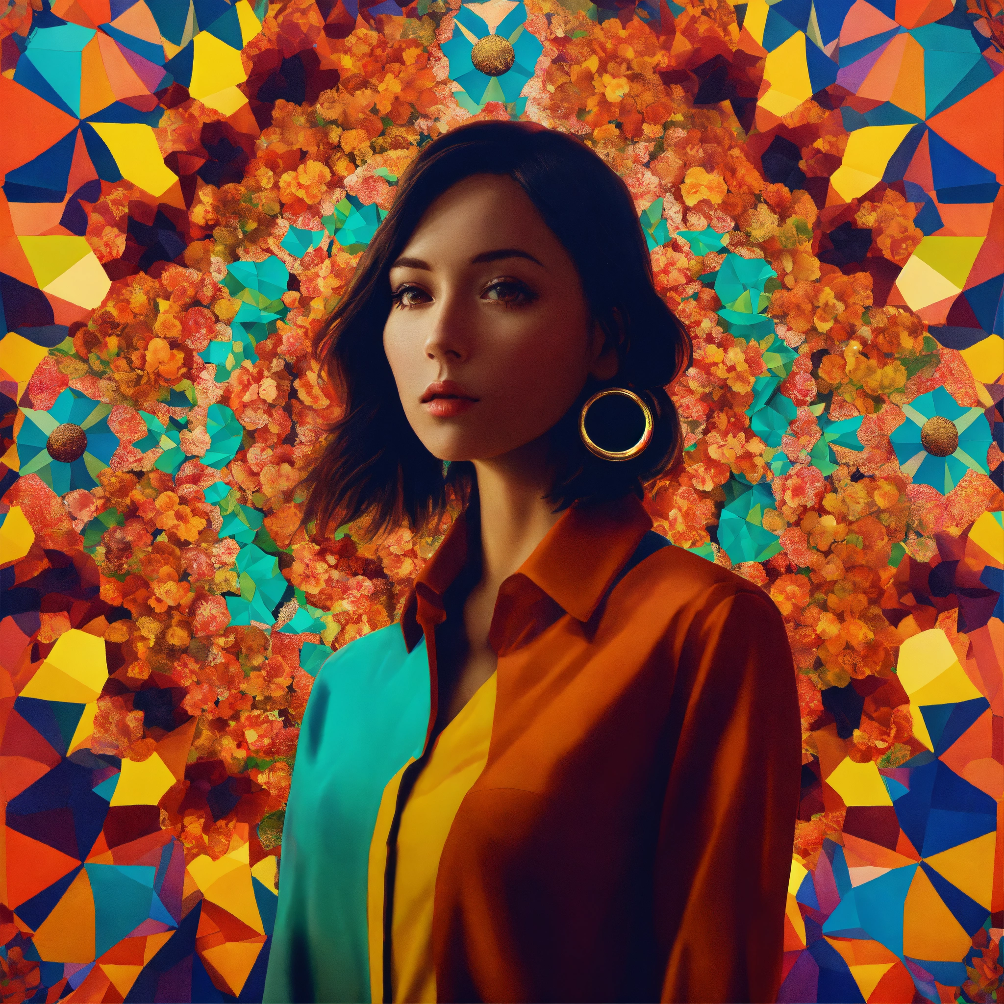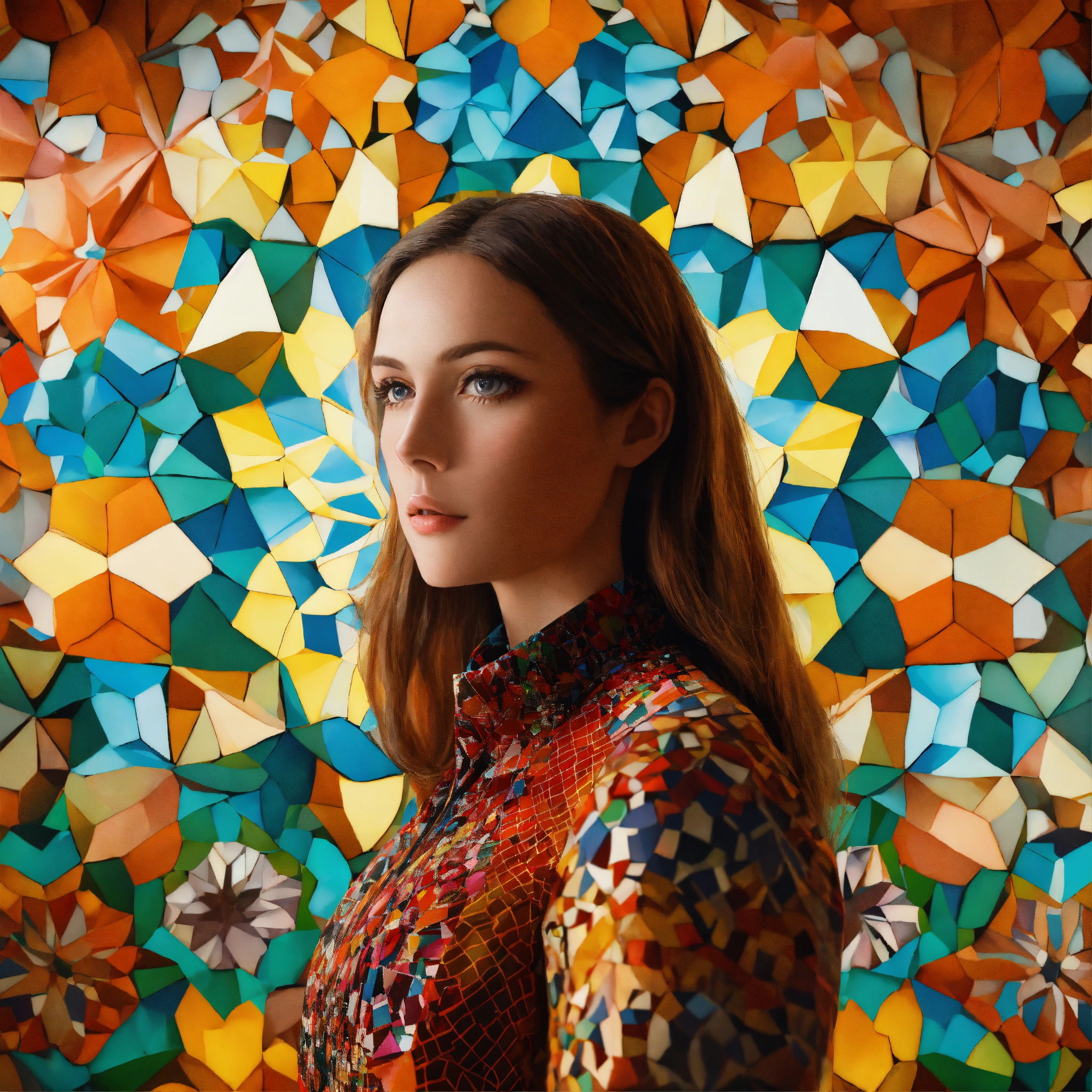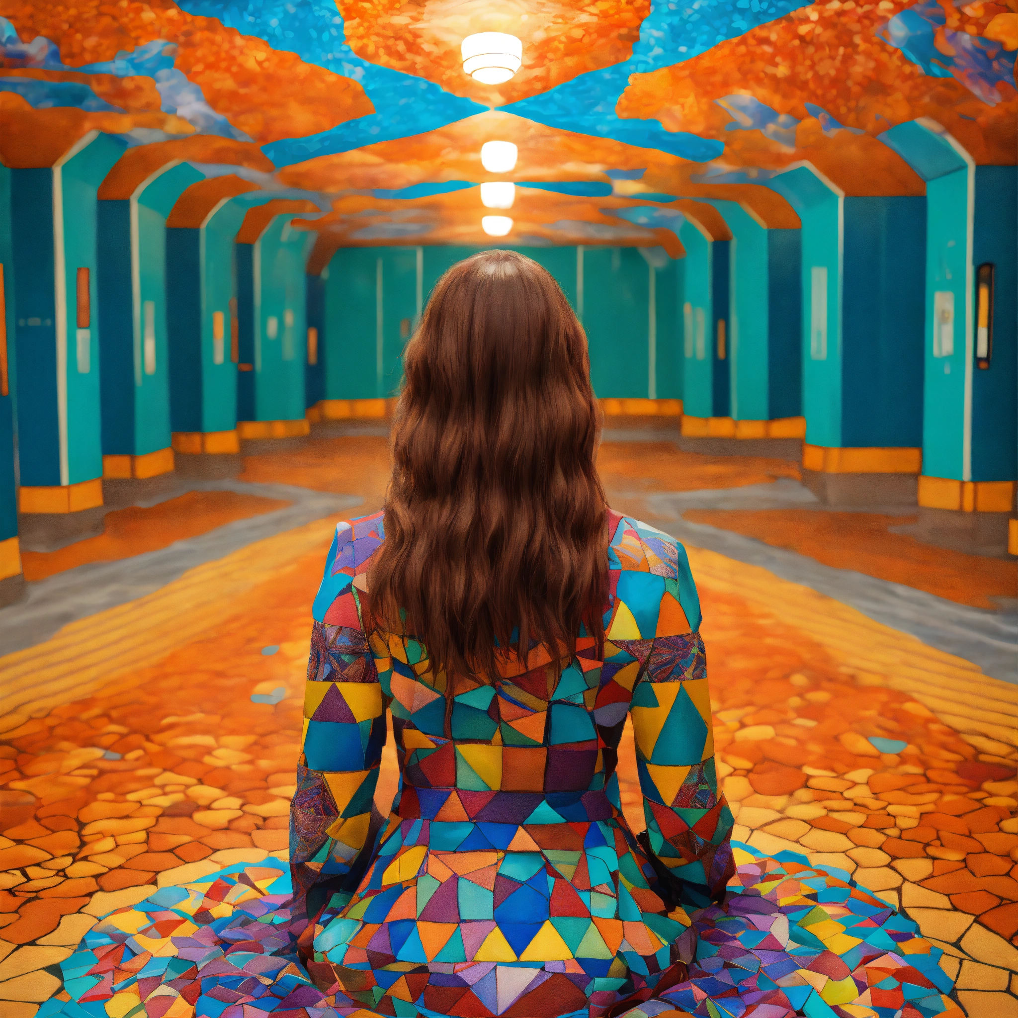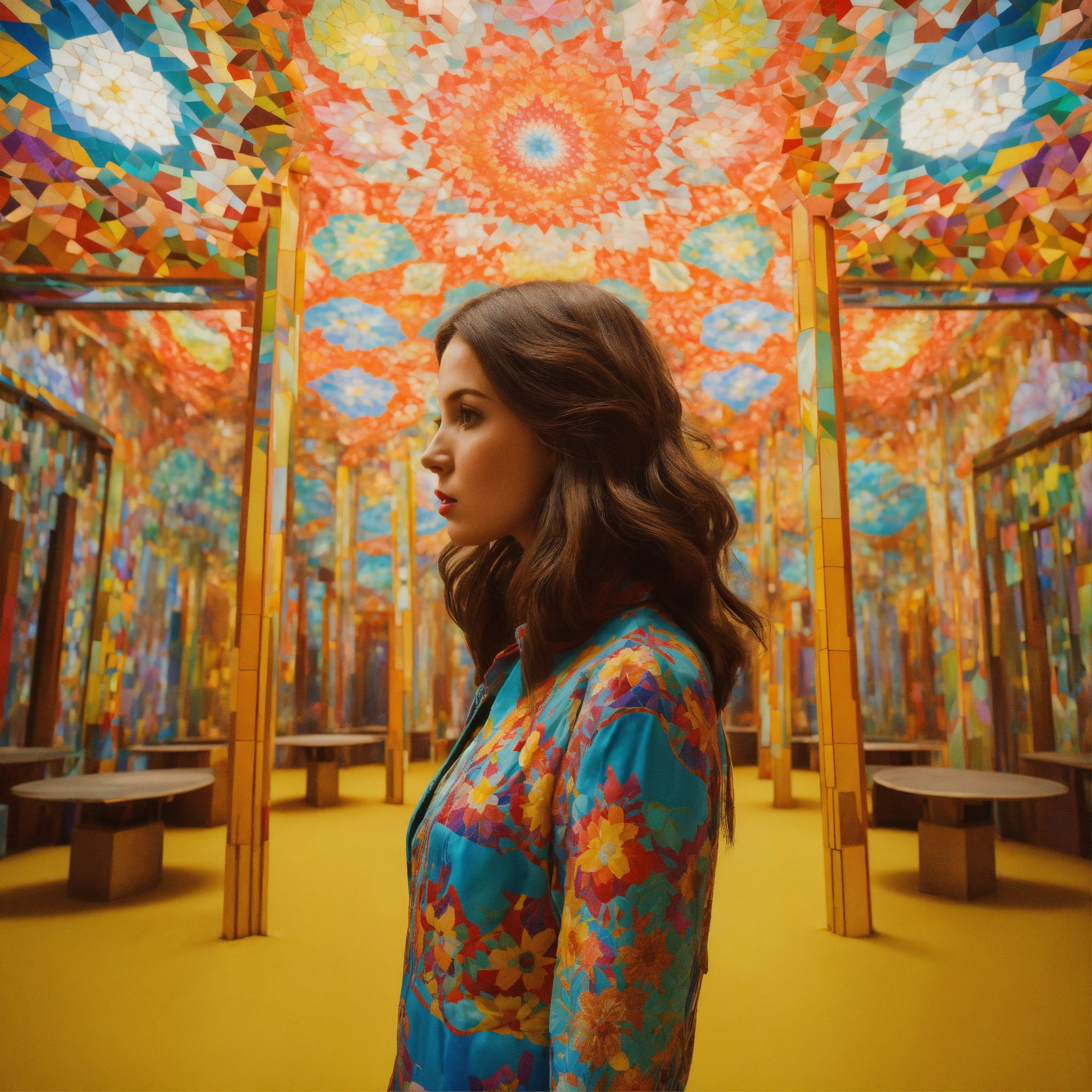 Lost in a kaleidoscope place the woman in a massive, ever-shifting kaleidoscope world. the environment is a constantly changing mosaic of colors and patterns, and she stands at the center, her hair merging with the kaleidoscopic shapes., wes anderson colour, photo-realistic