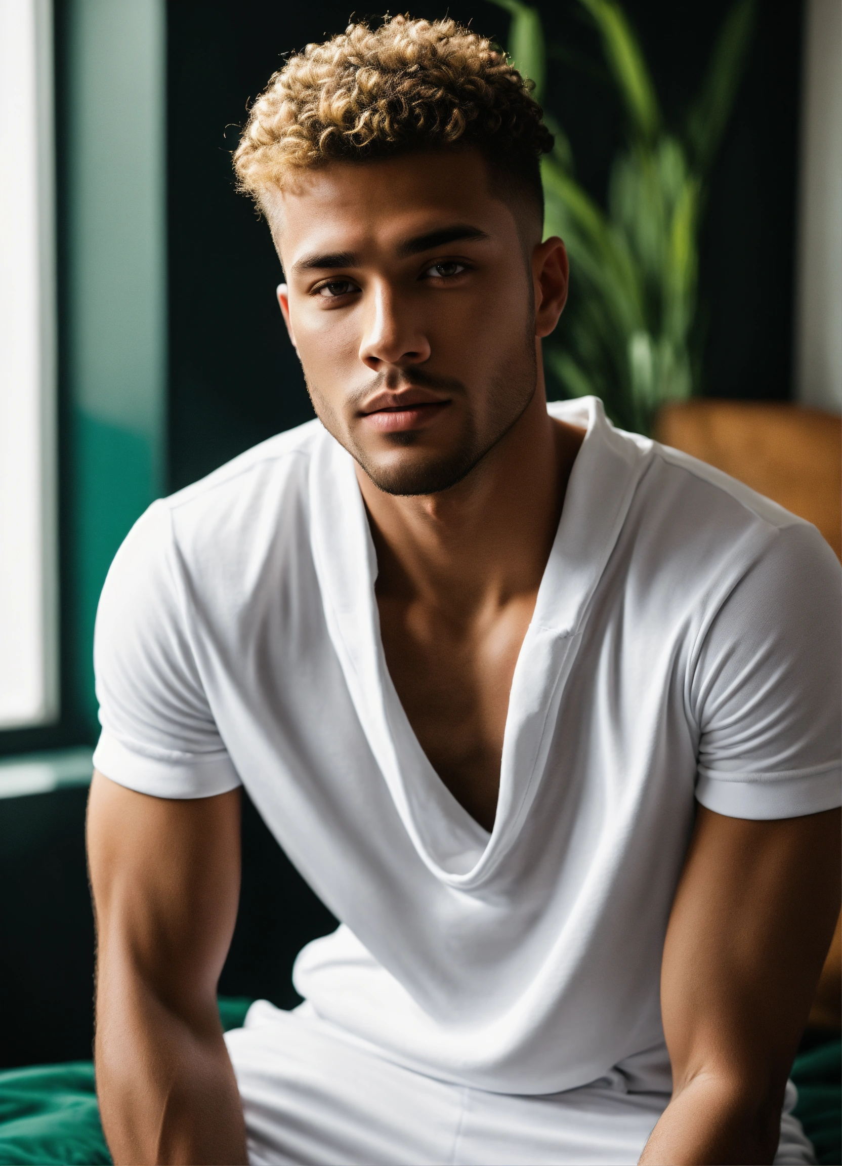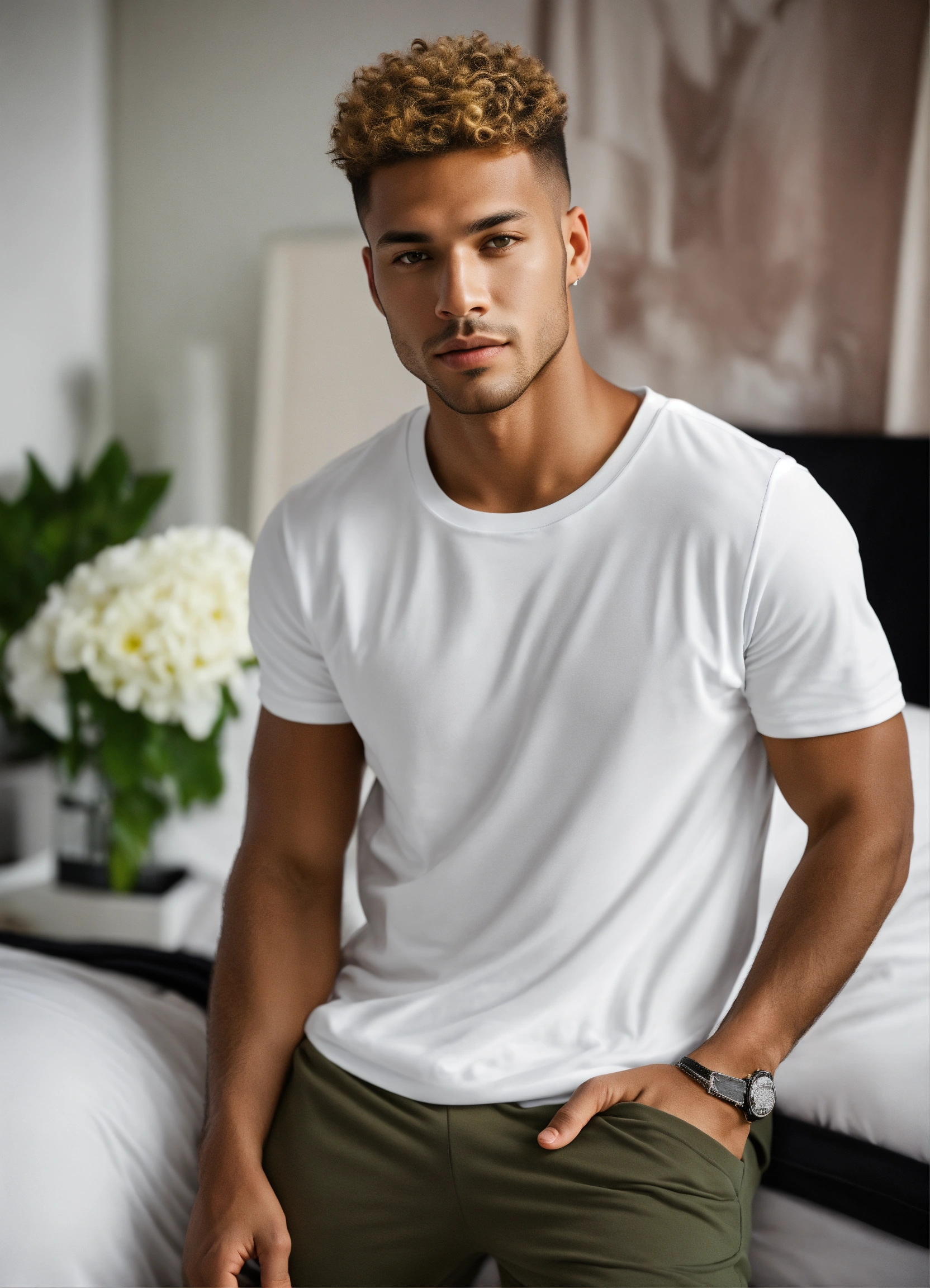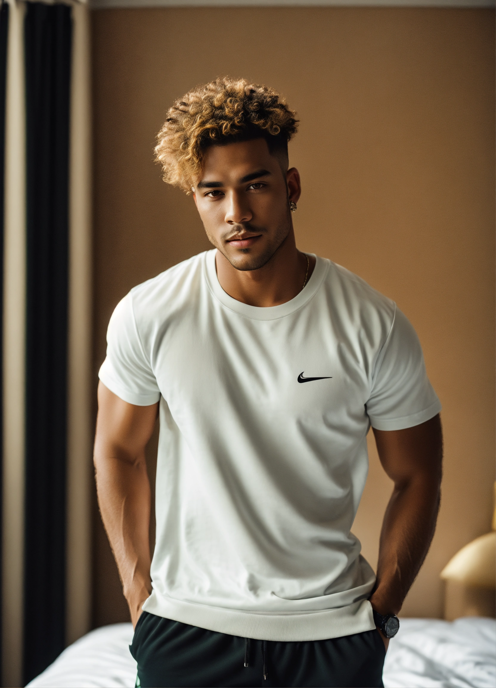 Handsome hot mulatto man with green-brown eyes, with short blond hair, broad-shouldered tall in a white t-shirt and a black tracksuit in luxury bedroom
