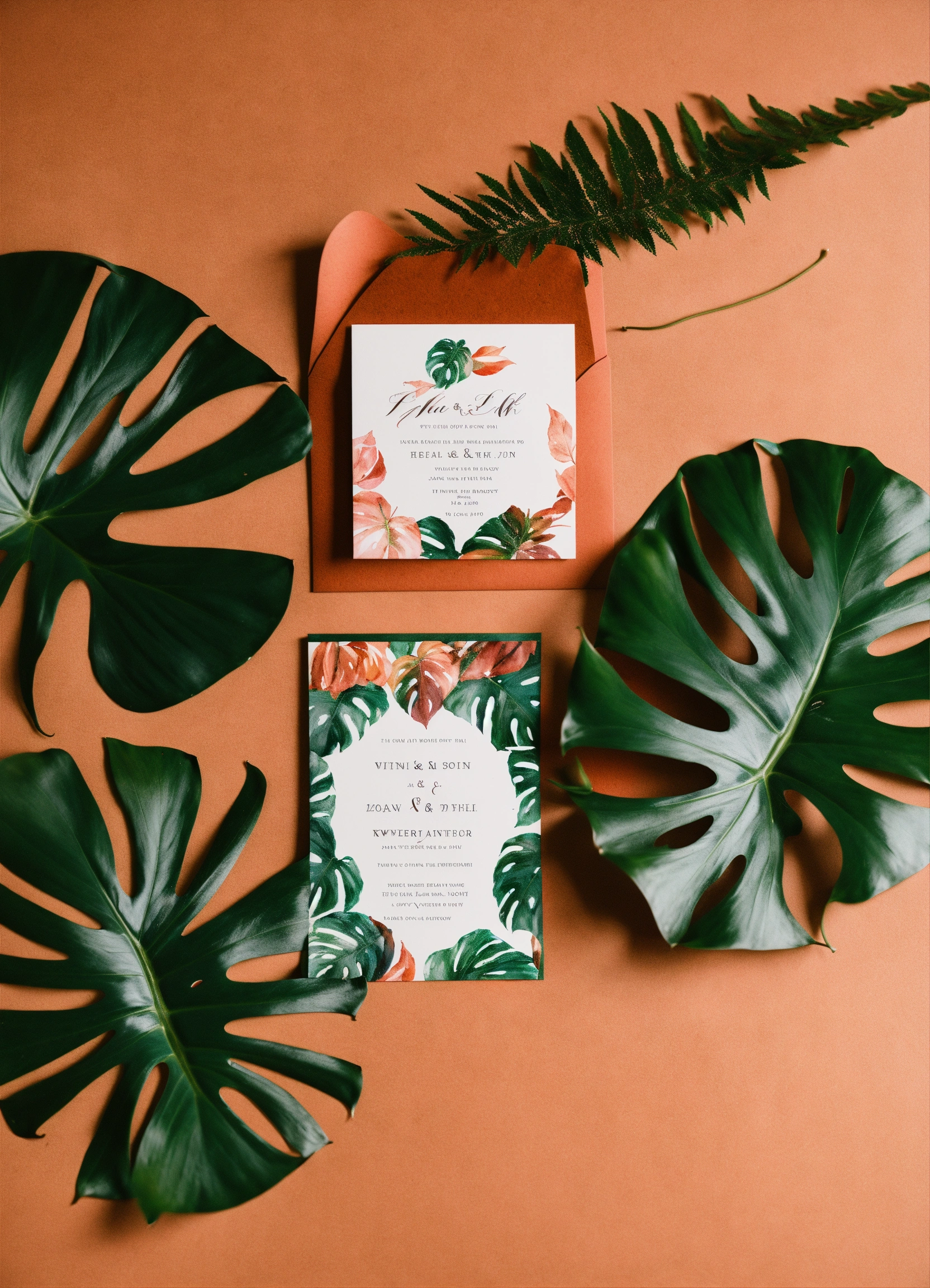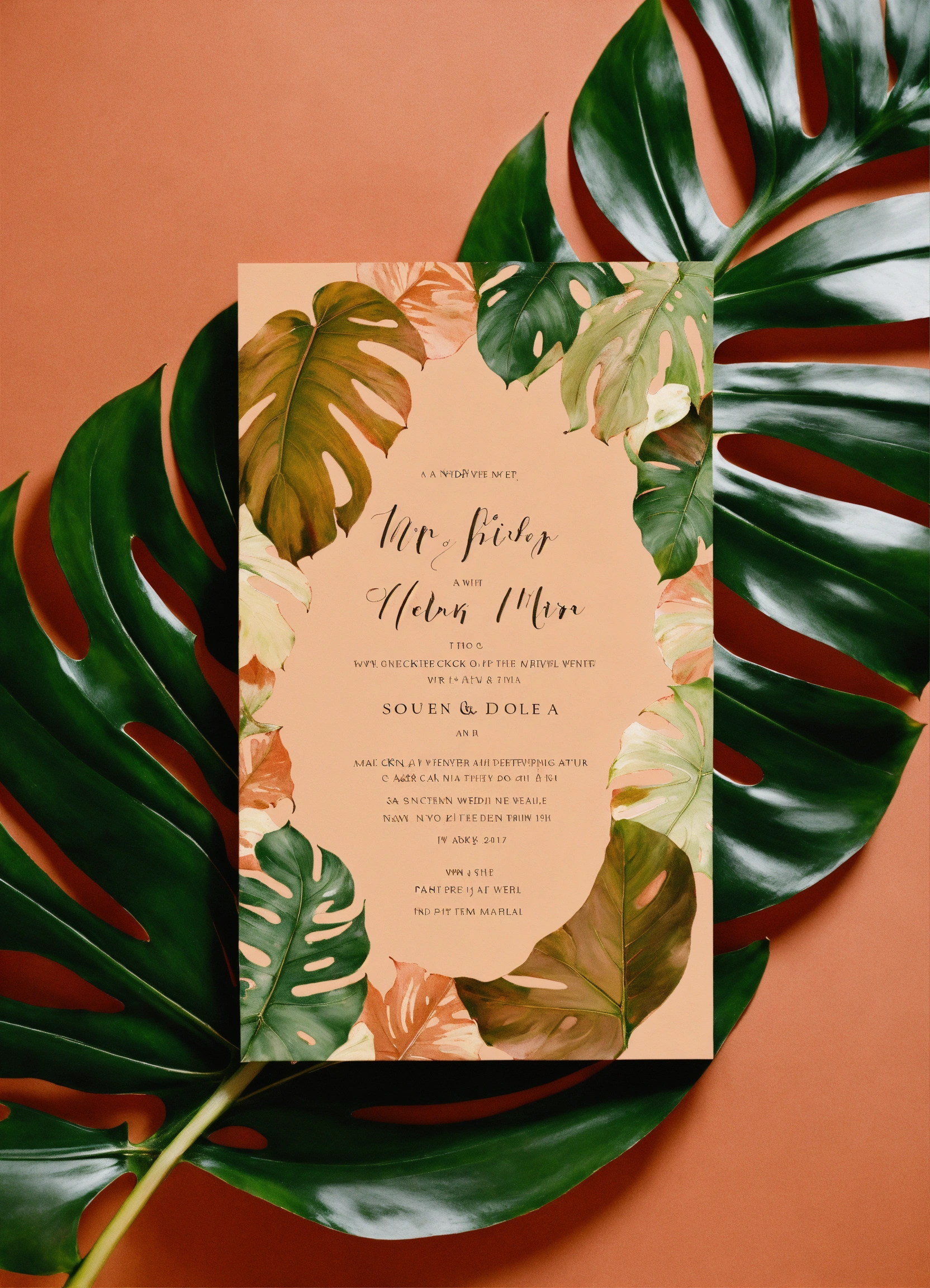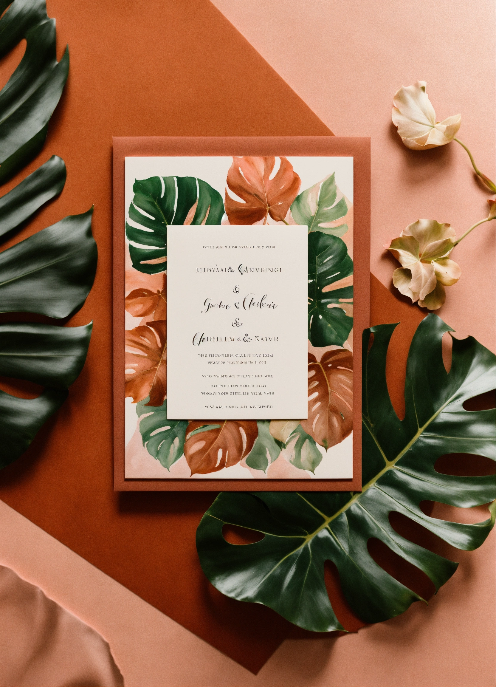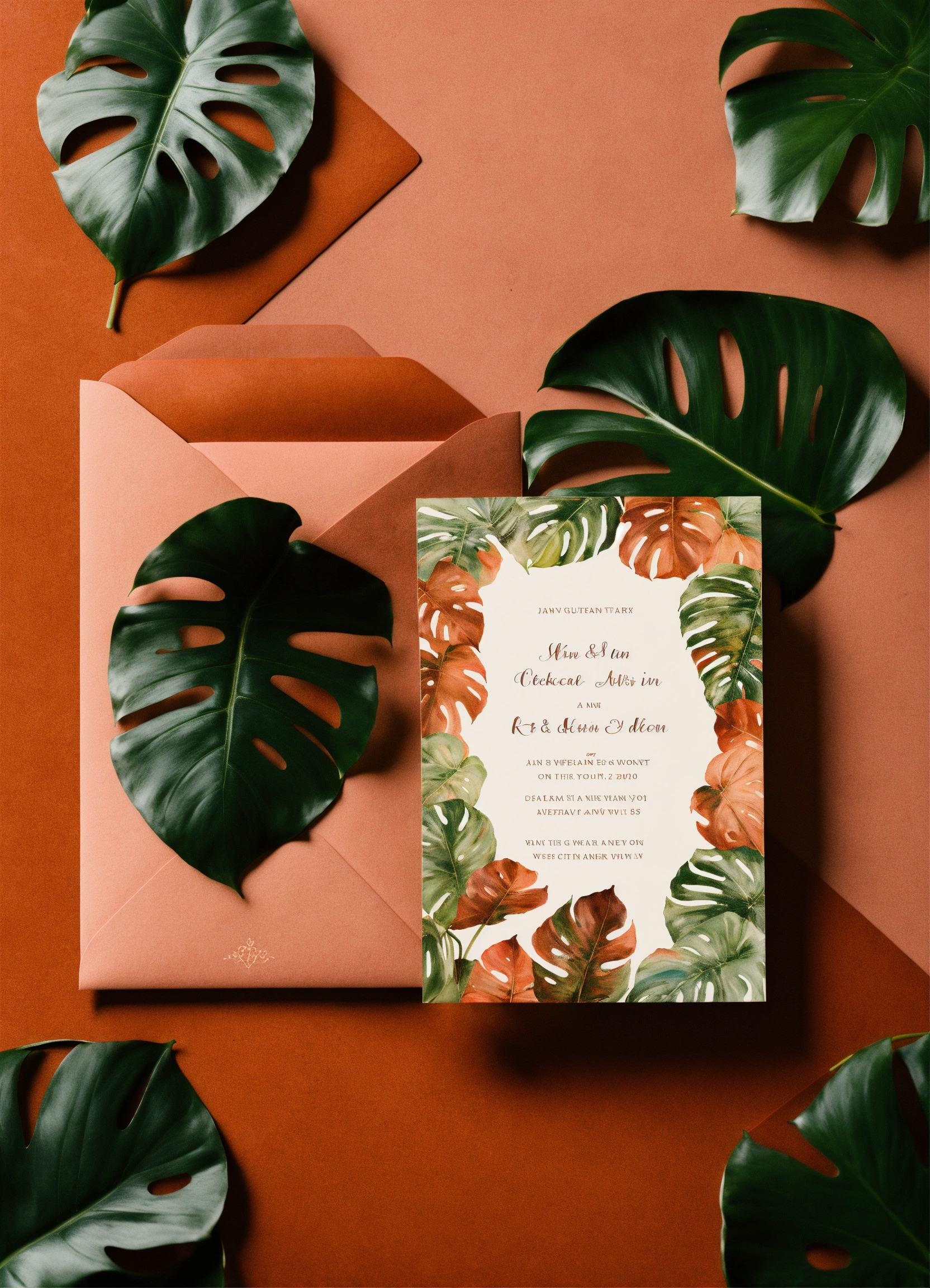 A wedding invitation with large painted monstera leaves on the bottom with a deckled terracotta background