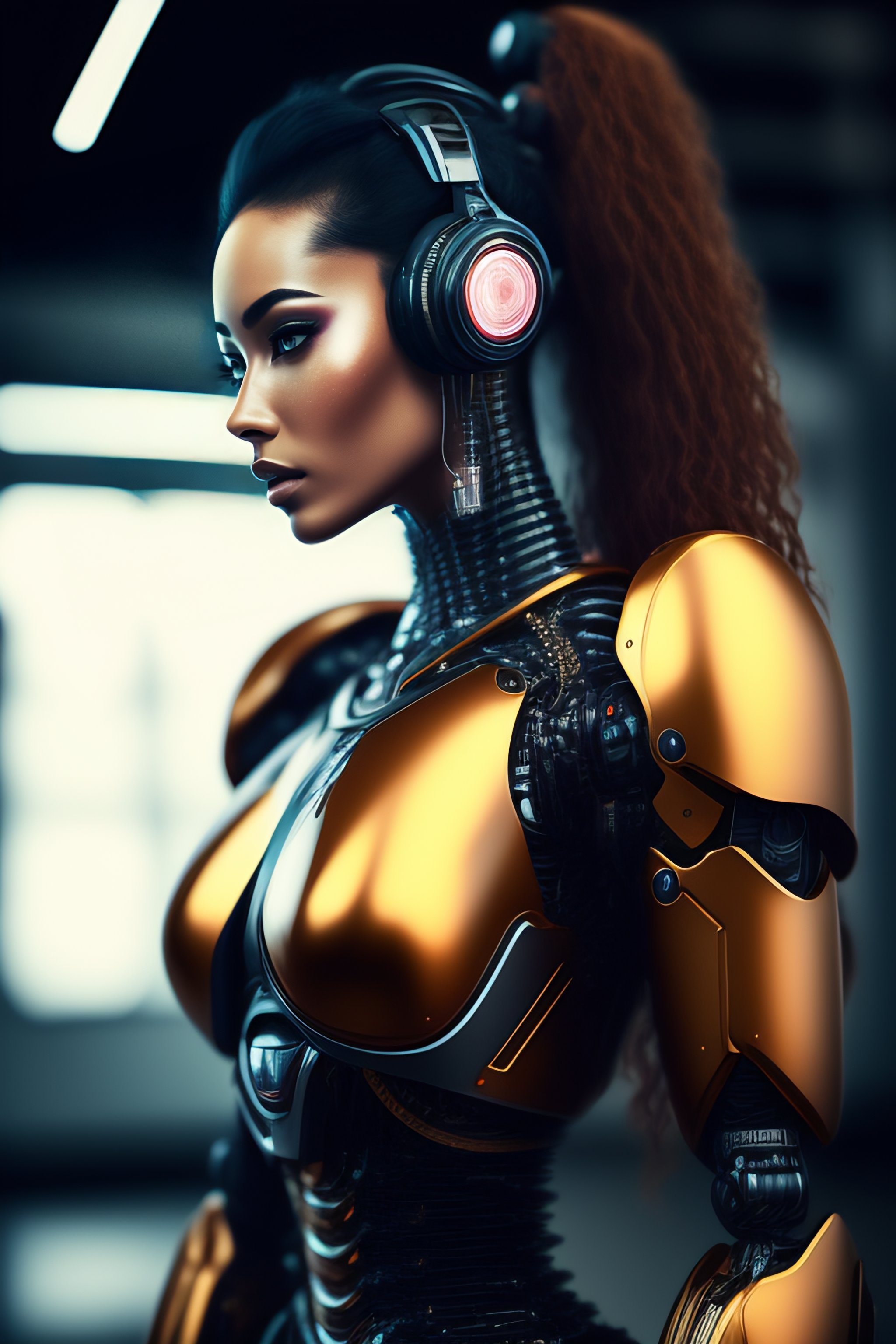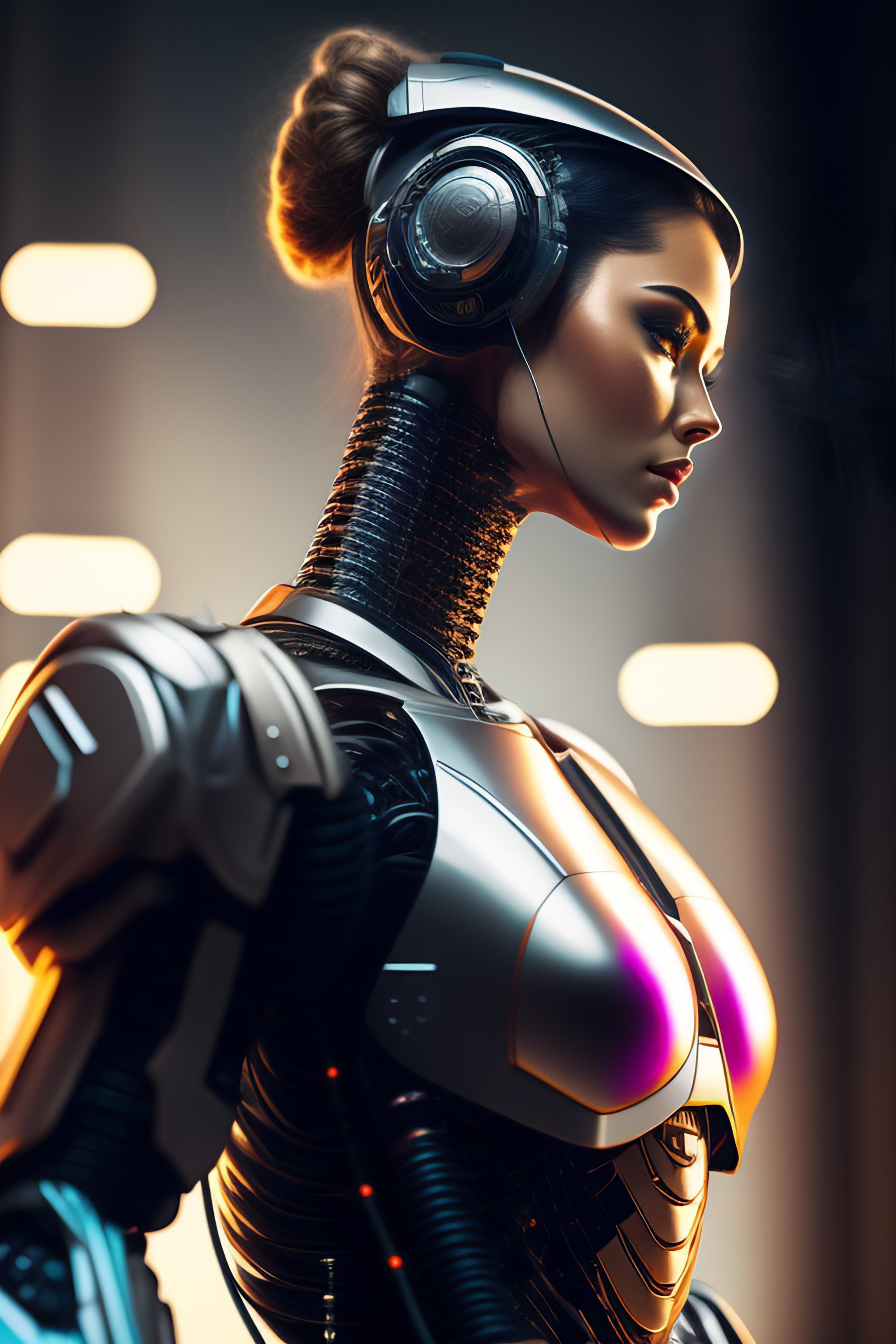 Cyborg robot with computer, a character side portrait, realistic, half body shot, sharp focus, elegant