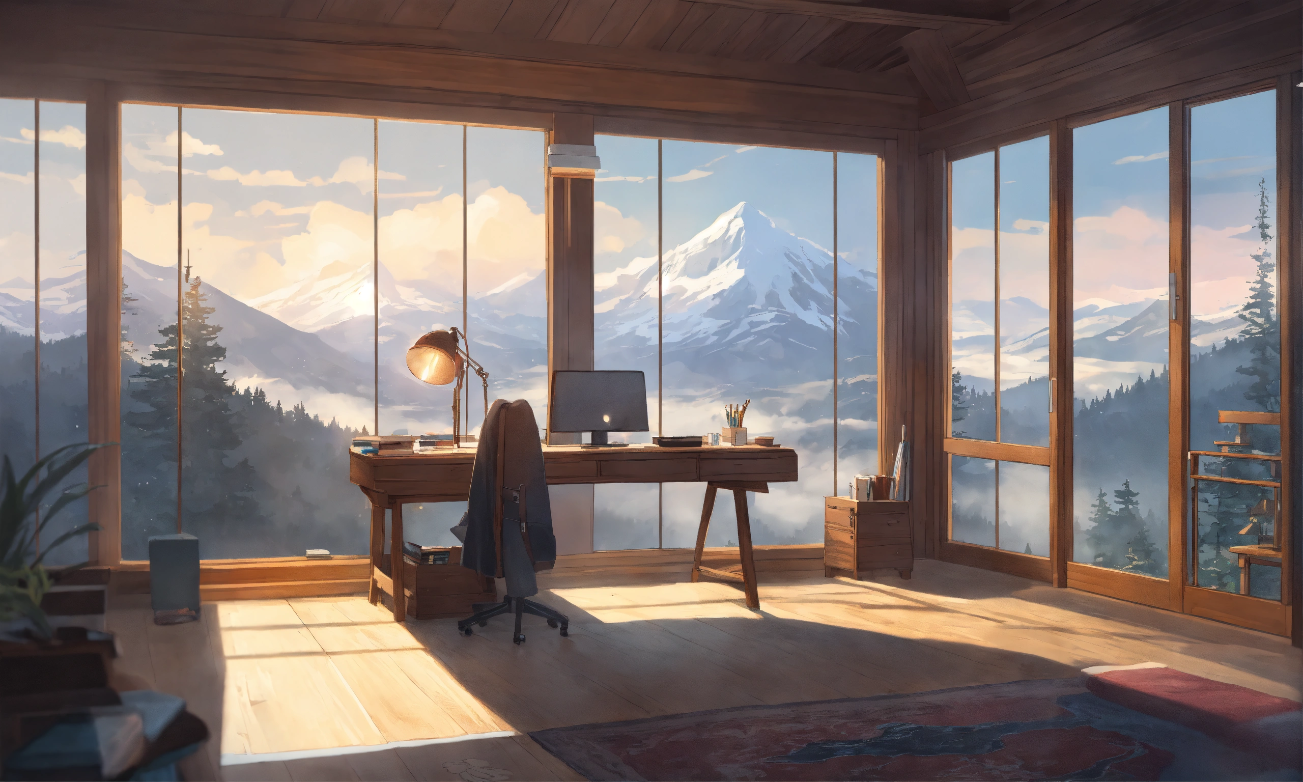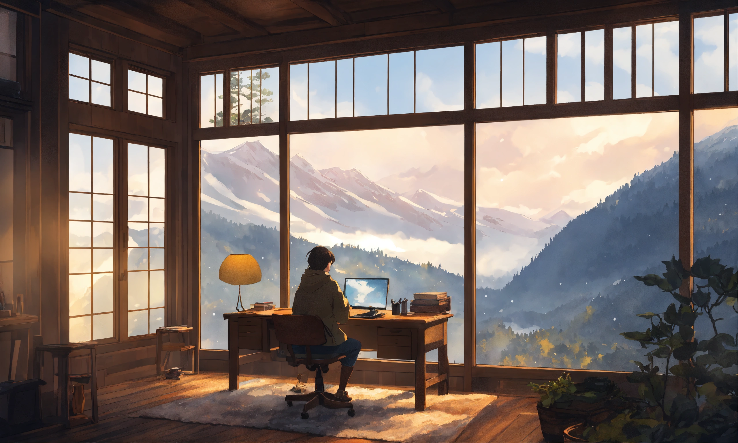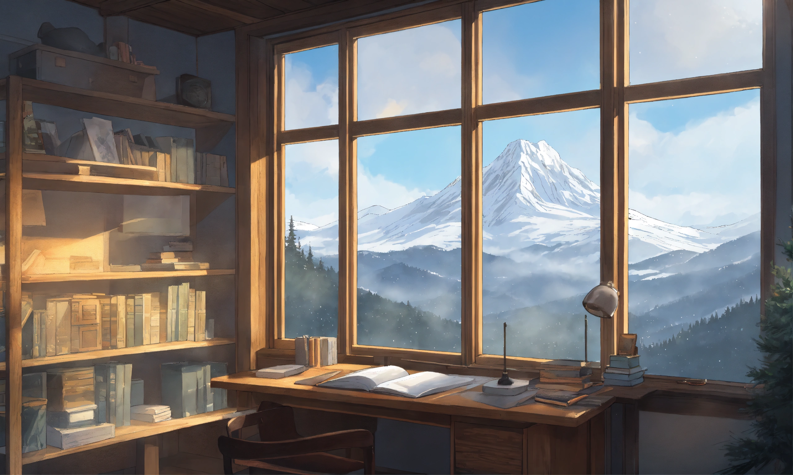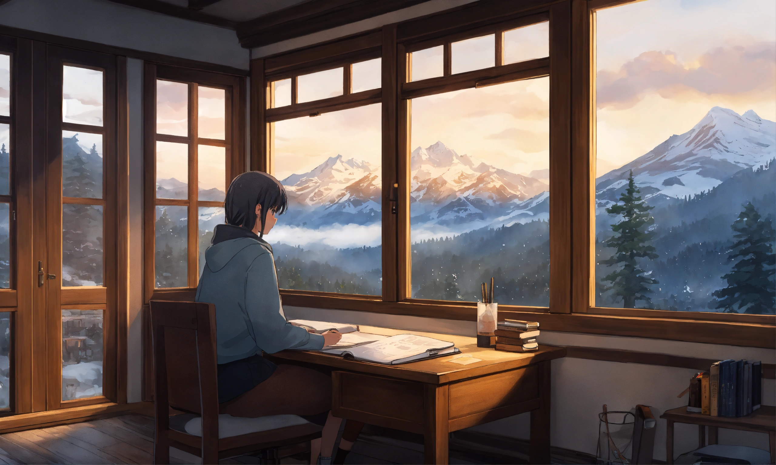 Study room in mountain lodge, wooden grey acrylic washed tones, big centered window, desk against window, sitting at the desk, view at landscape, winter mountains misty, forrest, anime, lofi artwork, studio ghibli