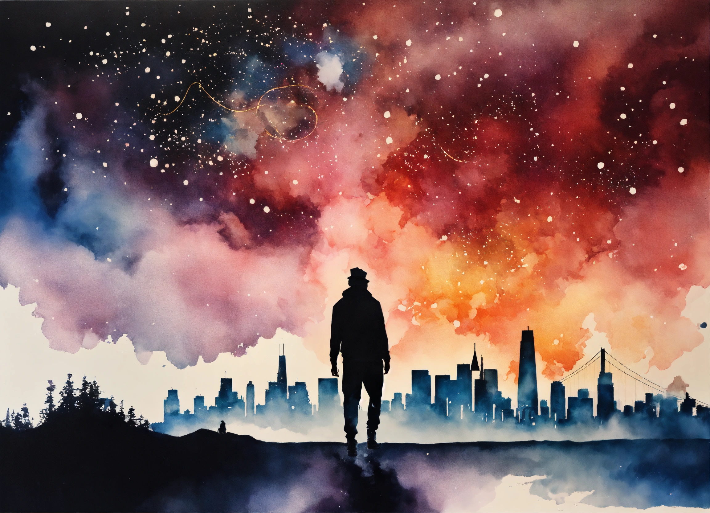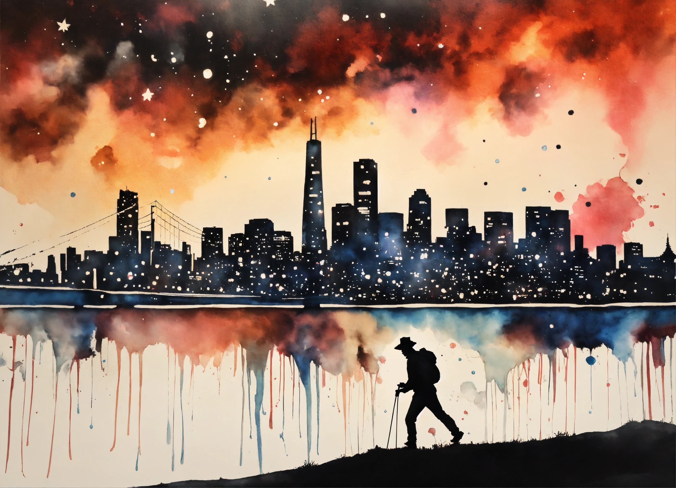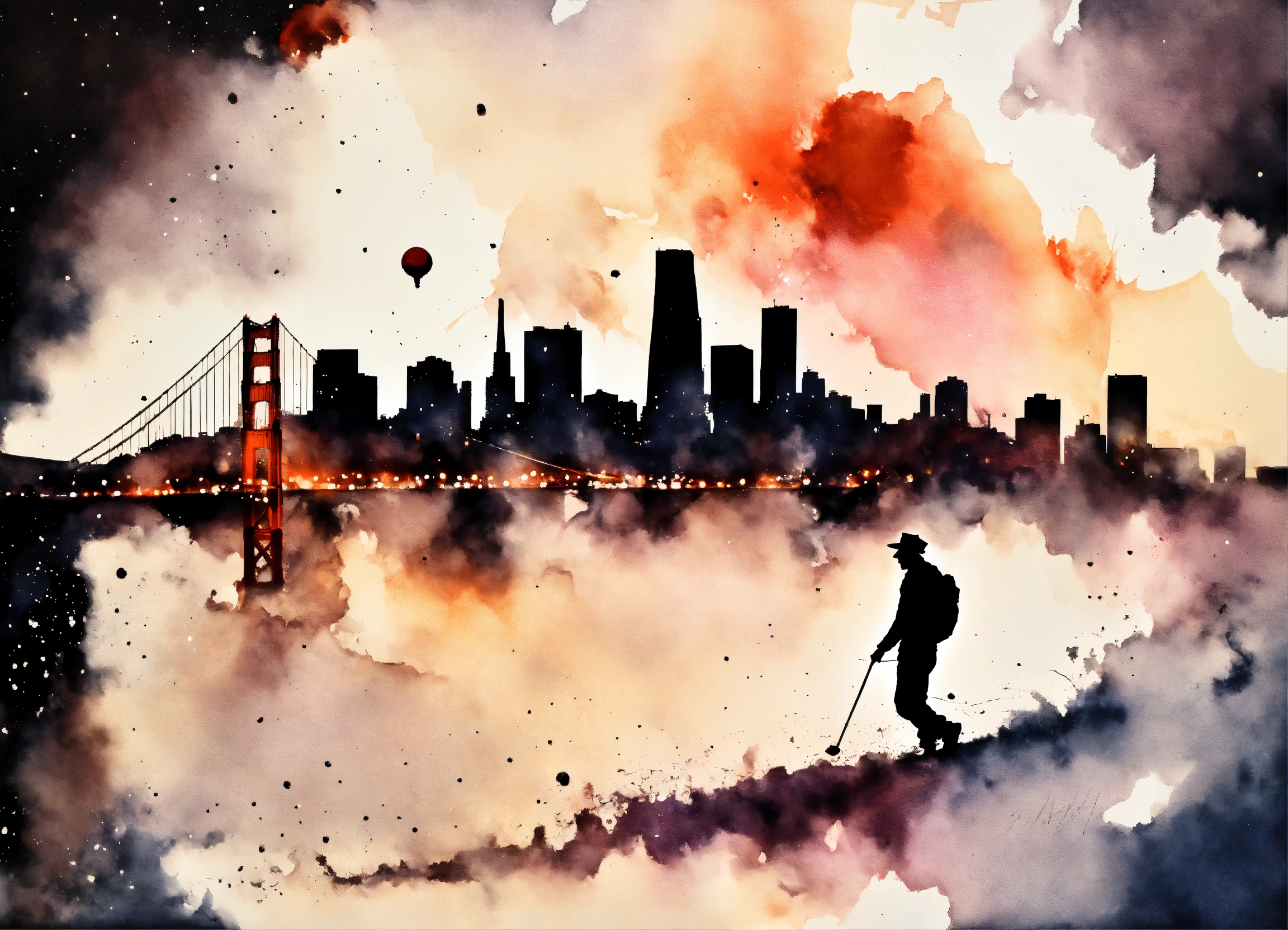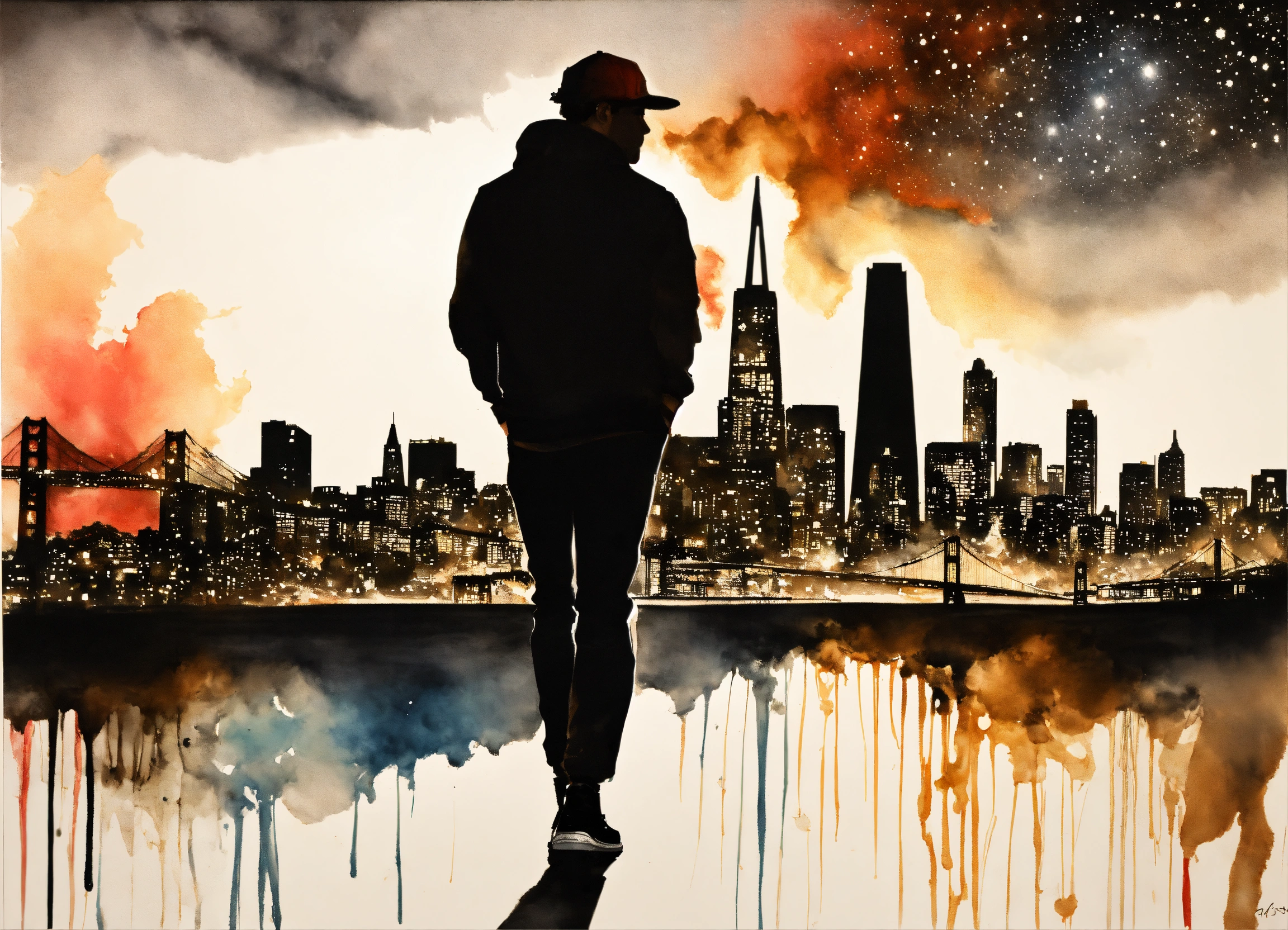 An exquisite ink painting on white paper that's the perfect piece of multiple exposure art. this piece should combine the volume-shaded silhouette of a man in a 49er hat, track pants, 49er hoodie, under a starry san francisco skyline, white back ground with smoke and a splash of paint"