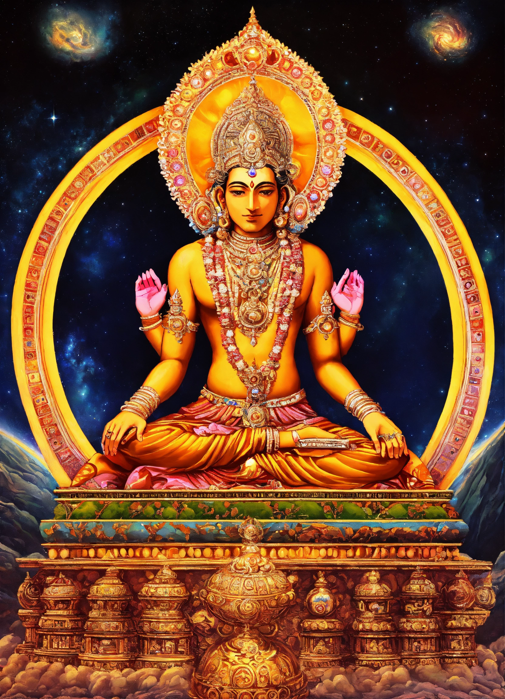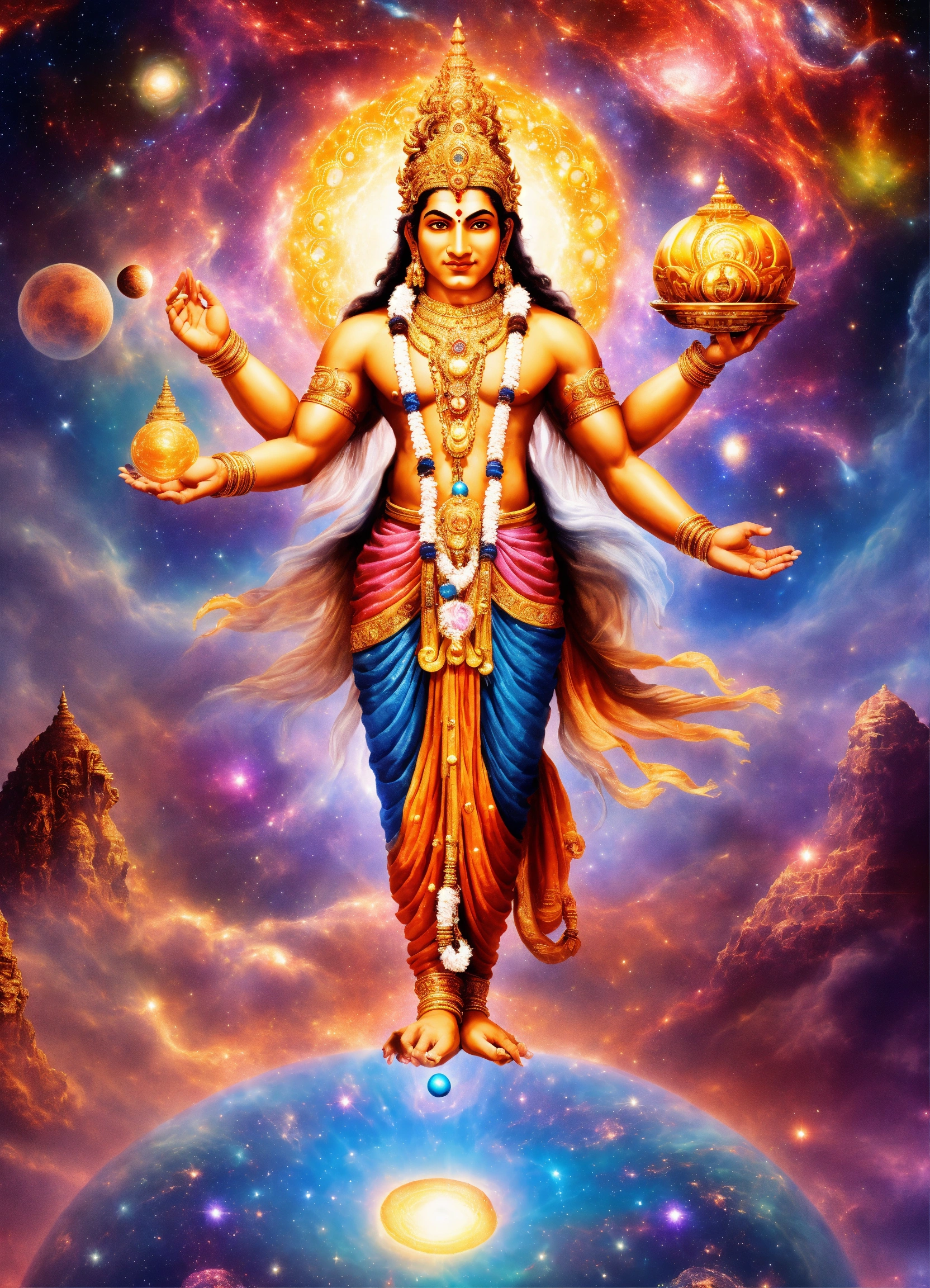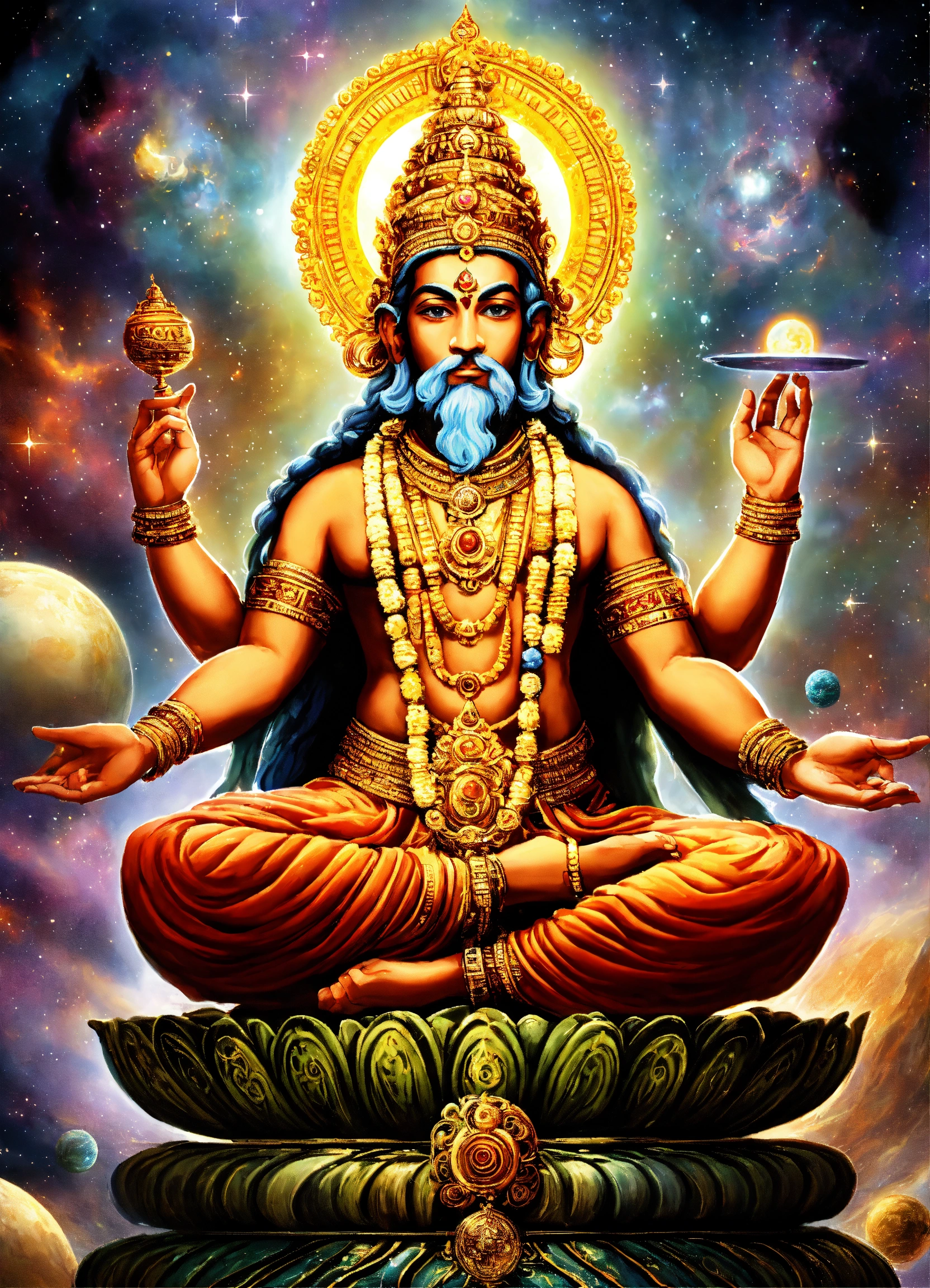 Lord brahma is an enigmatic cosmic architect. his four faces, each radiating a different aspect of creation, are like windows into the multiverse. as he gazes into the cosmic abyss, his thoughts give birth to galaxies, stars, and dimensions. his head spins in four directions, orchestrating a cosmic symphony that transcends time and space. lord brahma's presence is like a cosmic forge, where new universes are molded, and reality itself takes shape at his command. his power to create is not just limited to the physical realm but extends to the boundless reaches of the imagination and beyond.