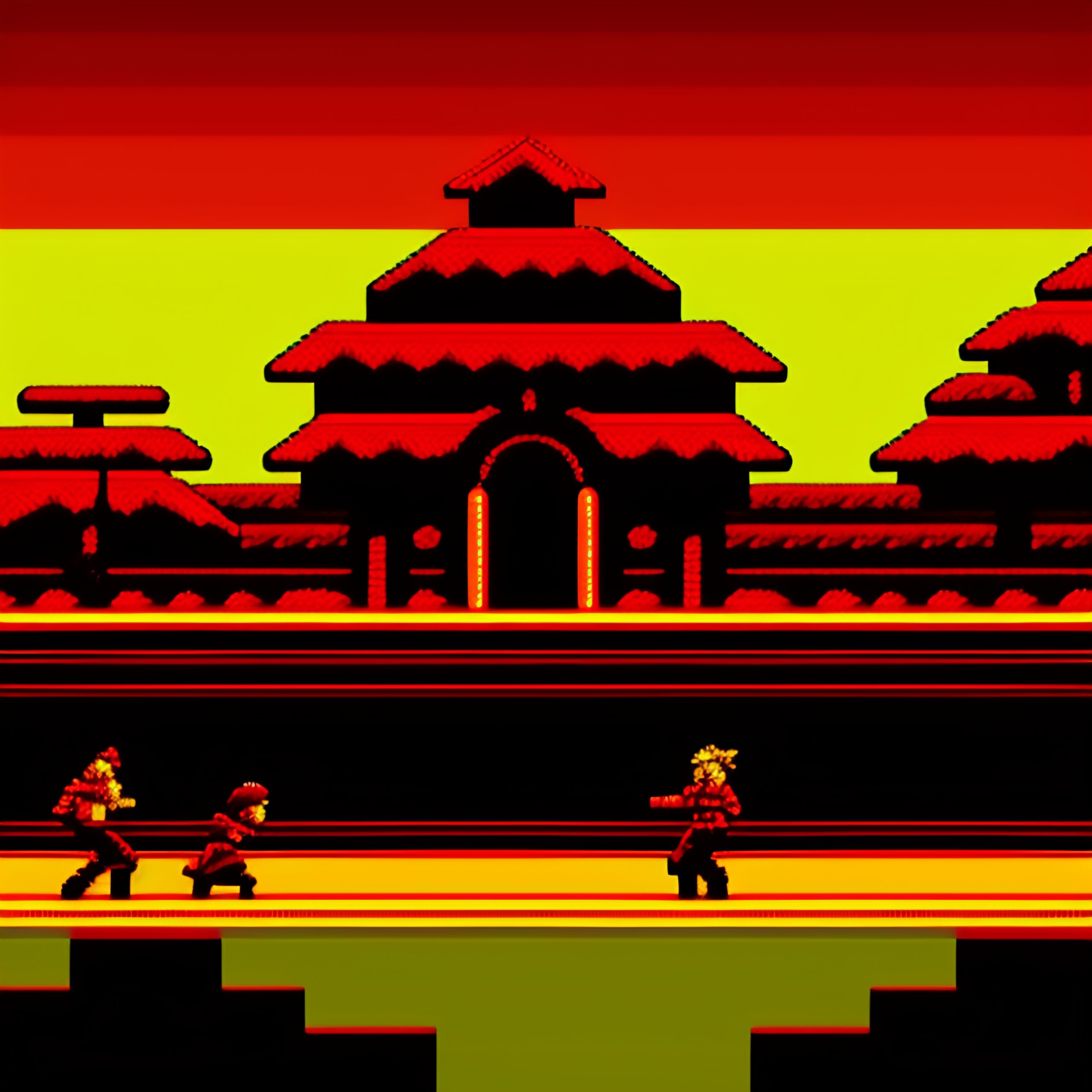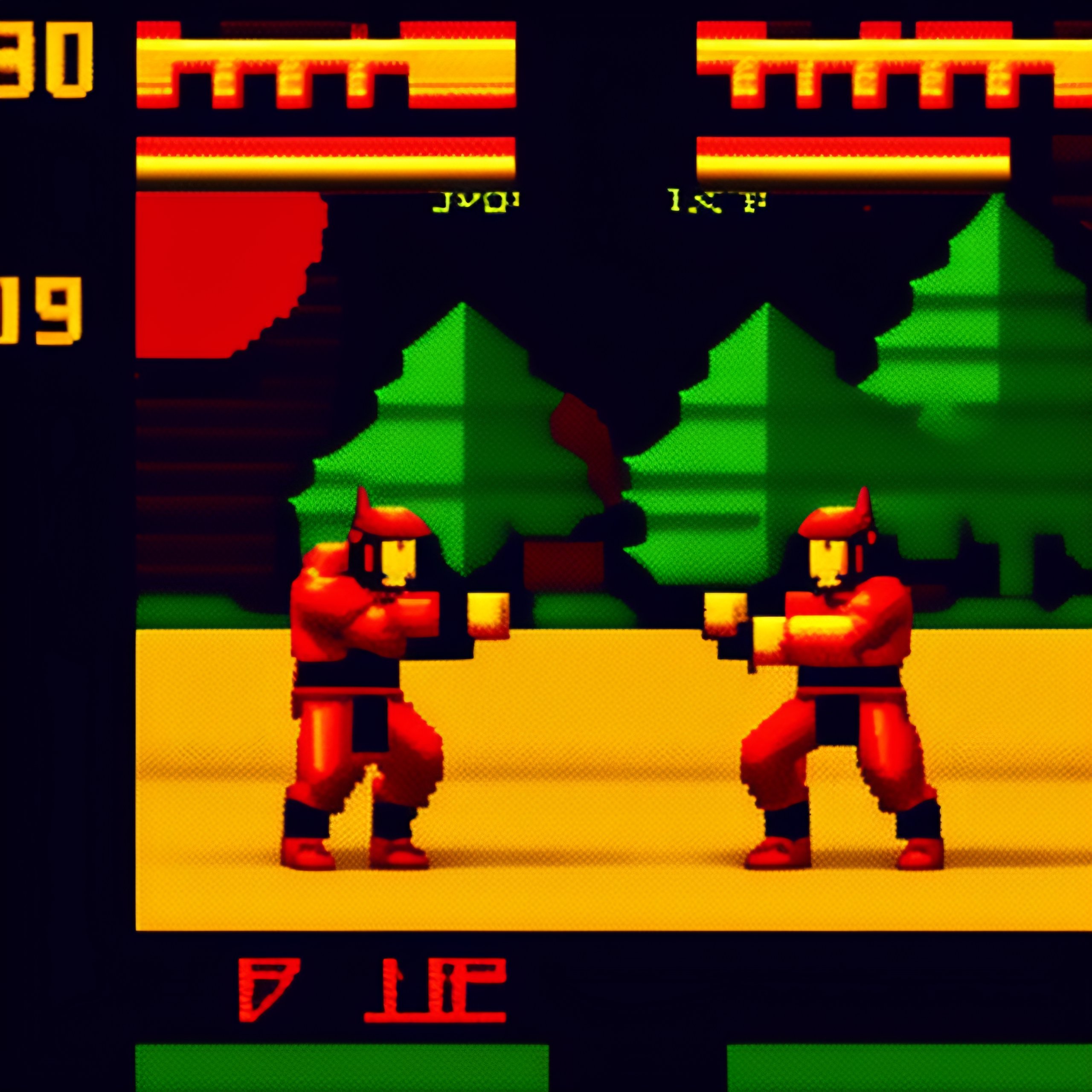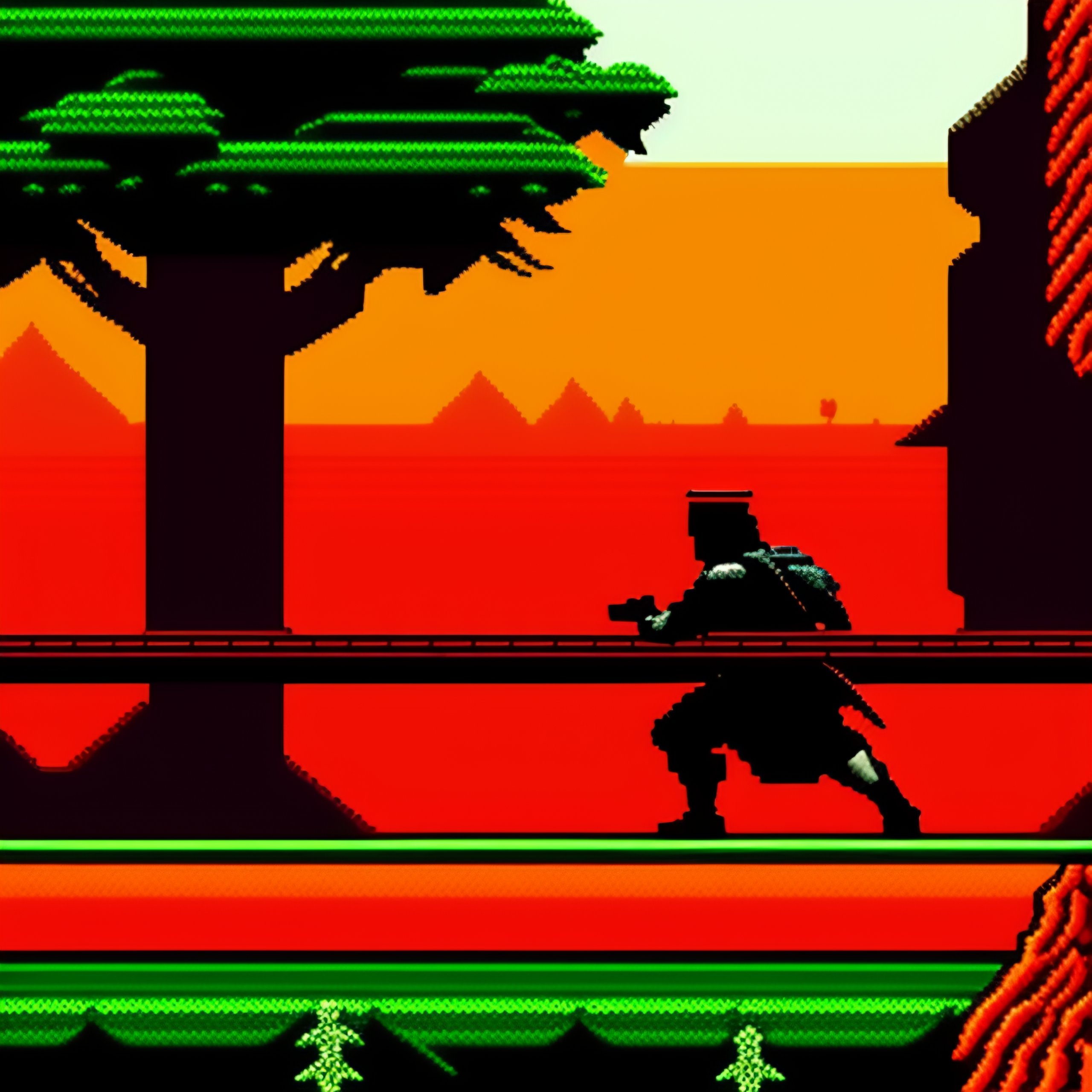 Videogame 8-bit red ninja fighting in the jungle