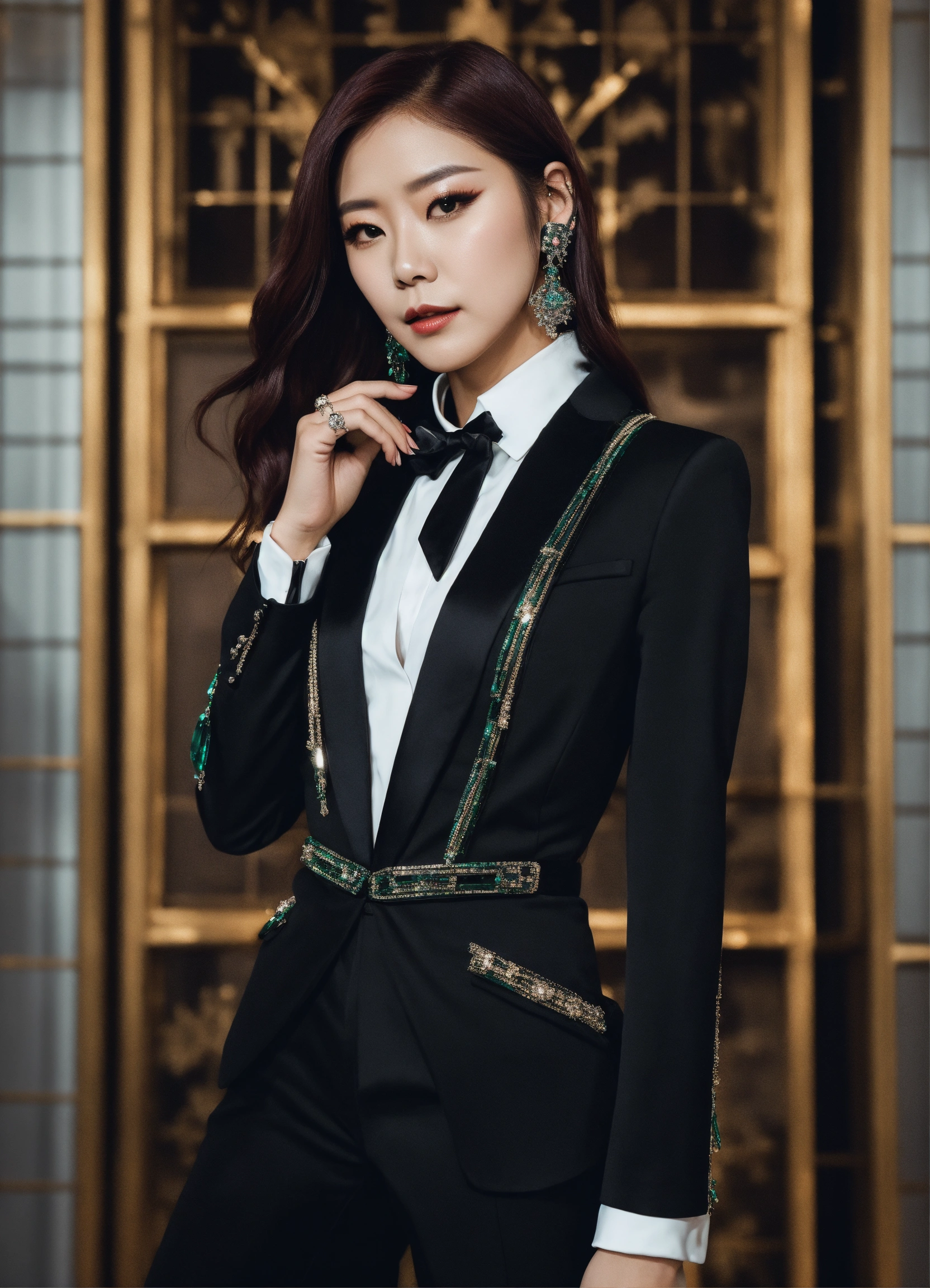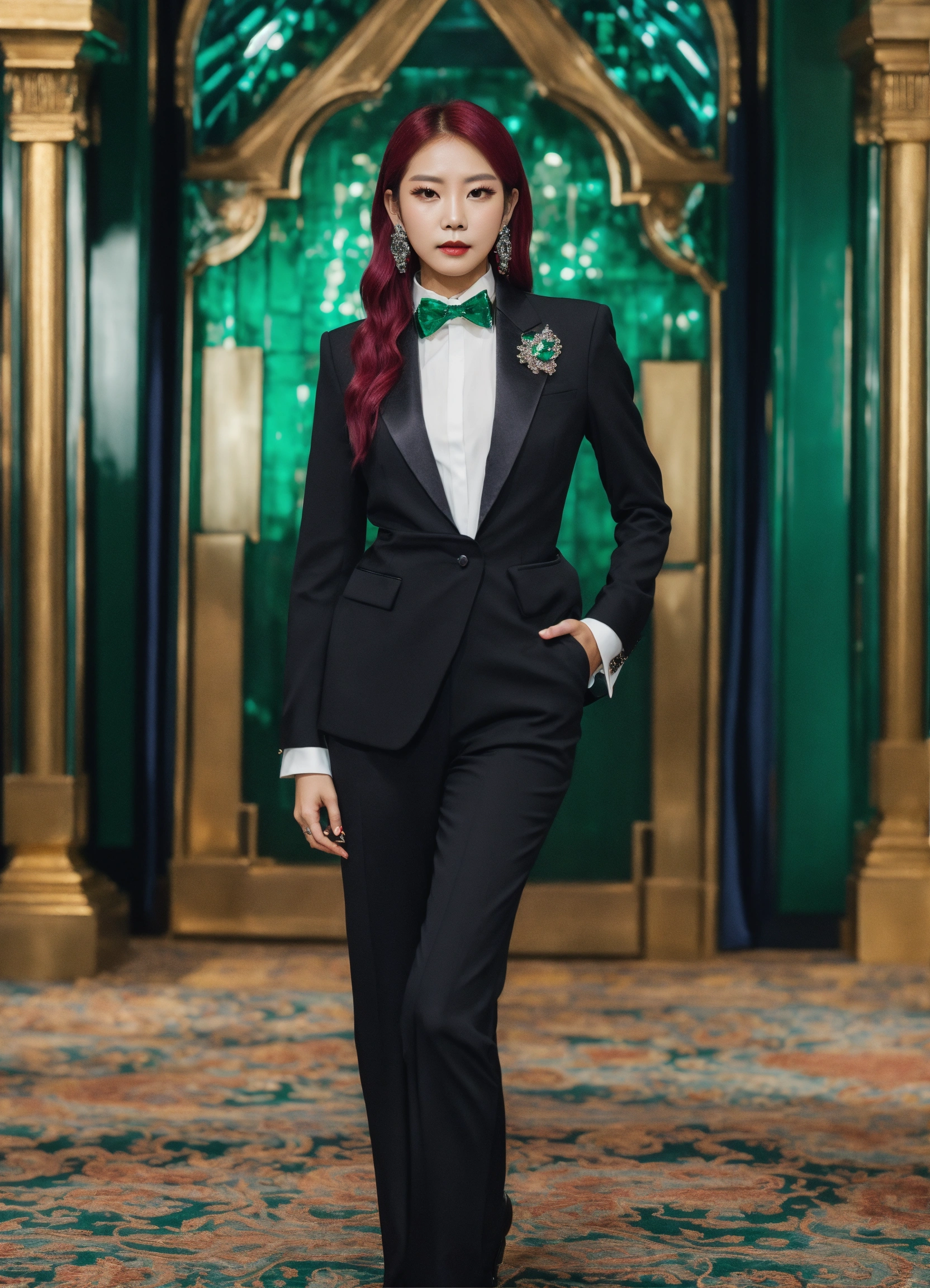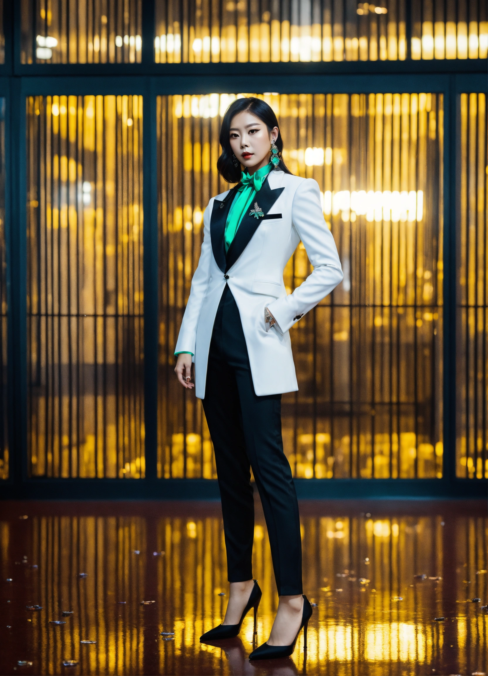 Dreamcatcher jiu radiant emerald-encrusted white tuxedo with black shirt and high heels