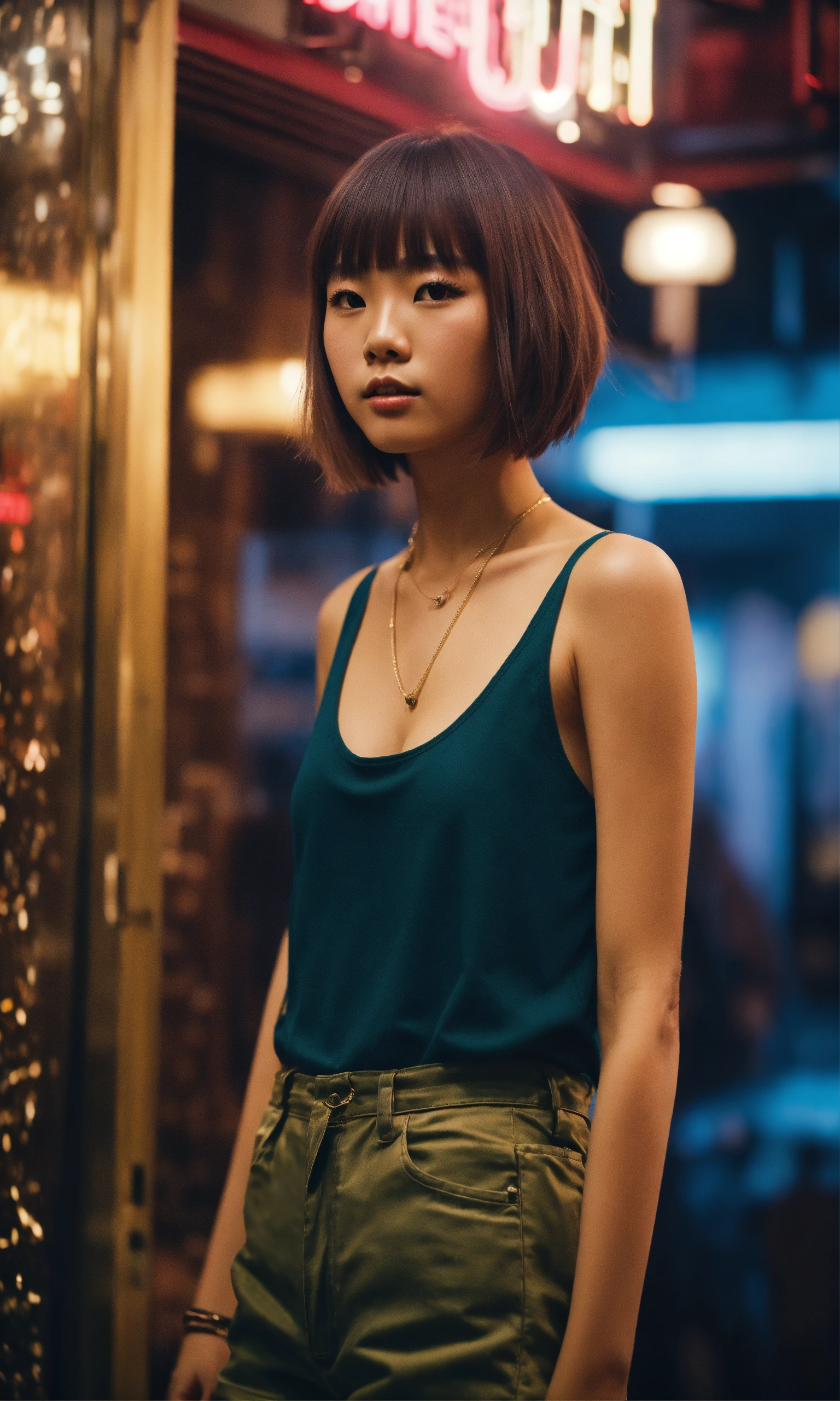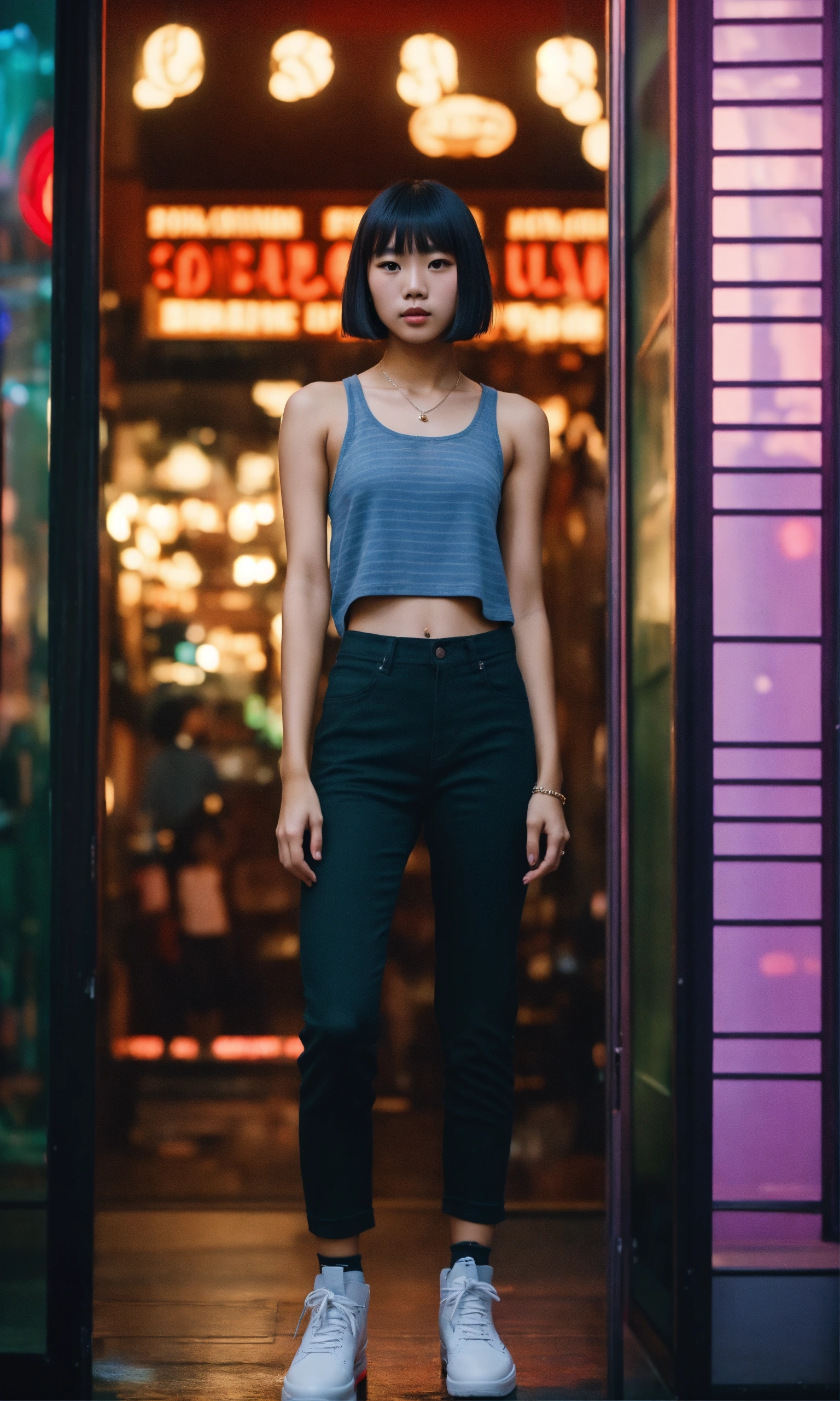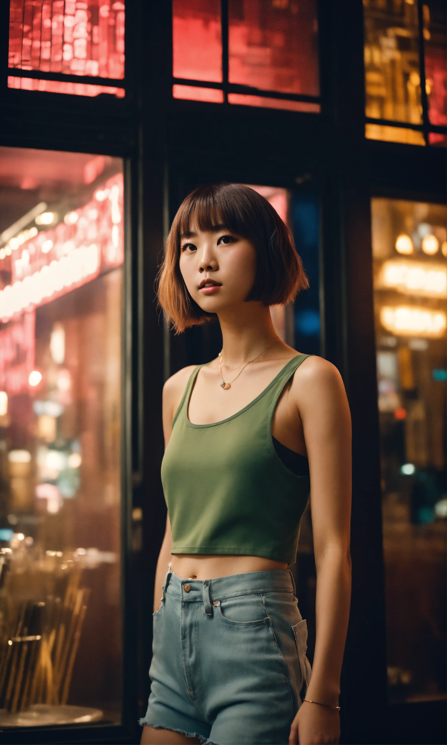 8k full body shot portrait of a cute japanese young fashion model in a tanktop with bobcut hair, entering a club in ny in the morning, highly detailed, production cinematic, reflections on the store windows, 8k, film grain