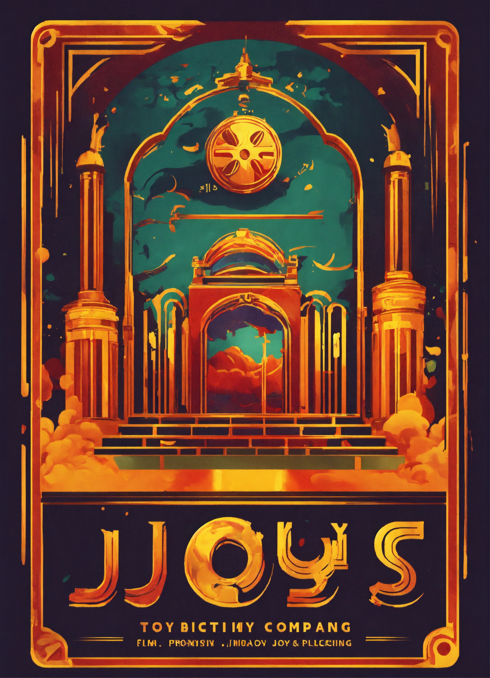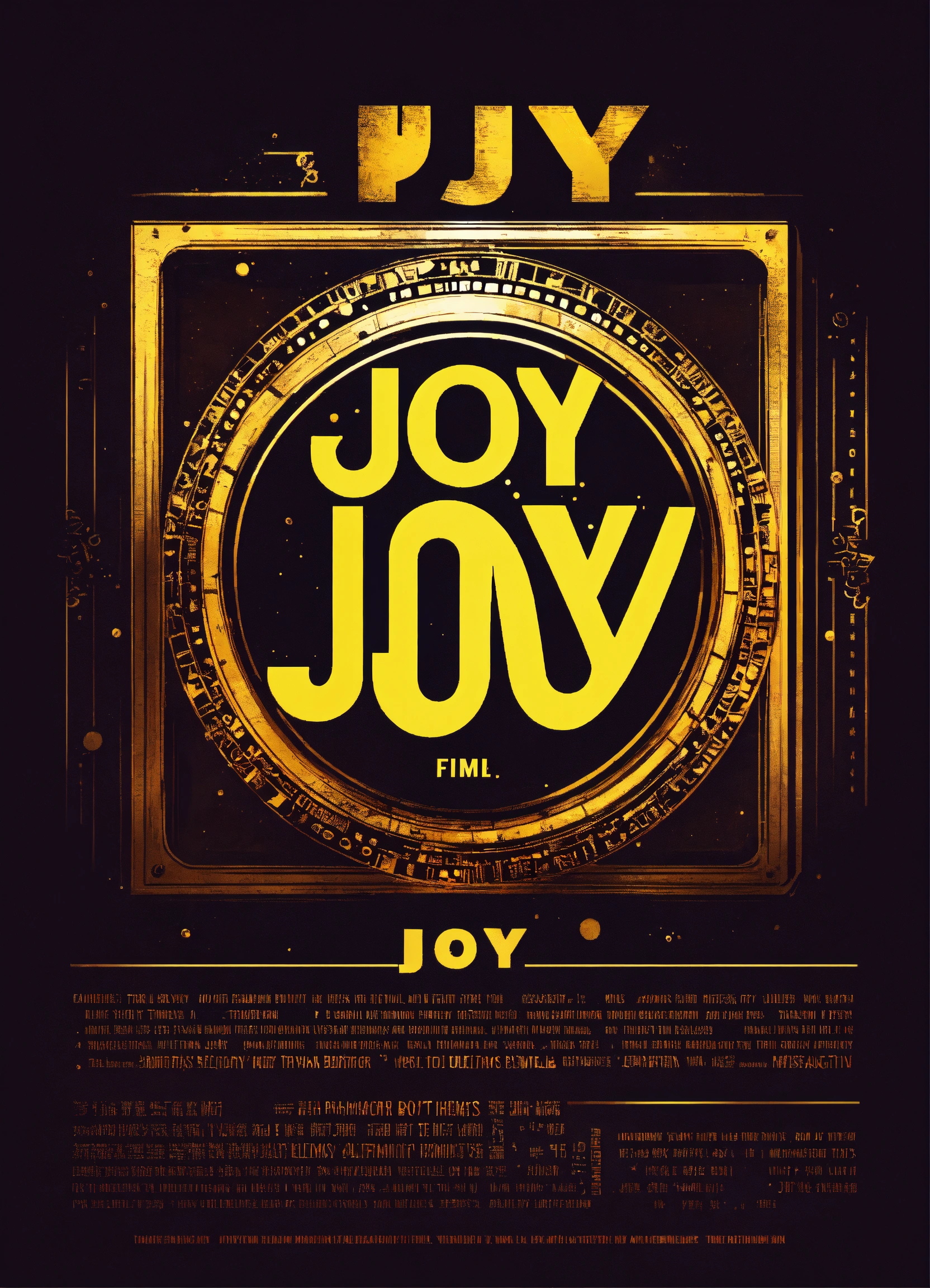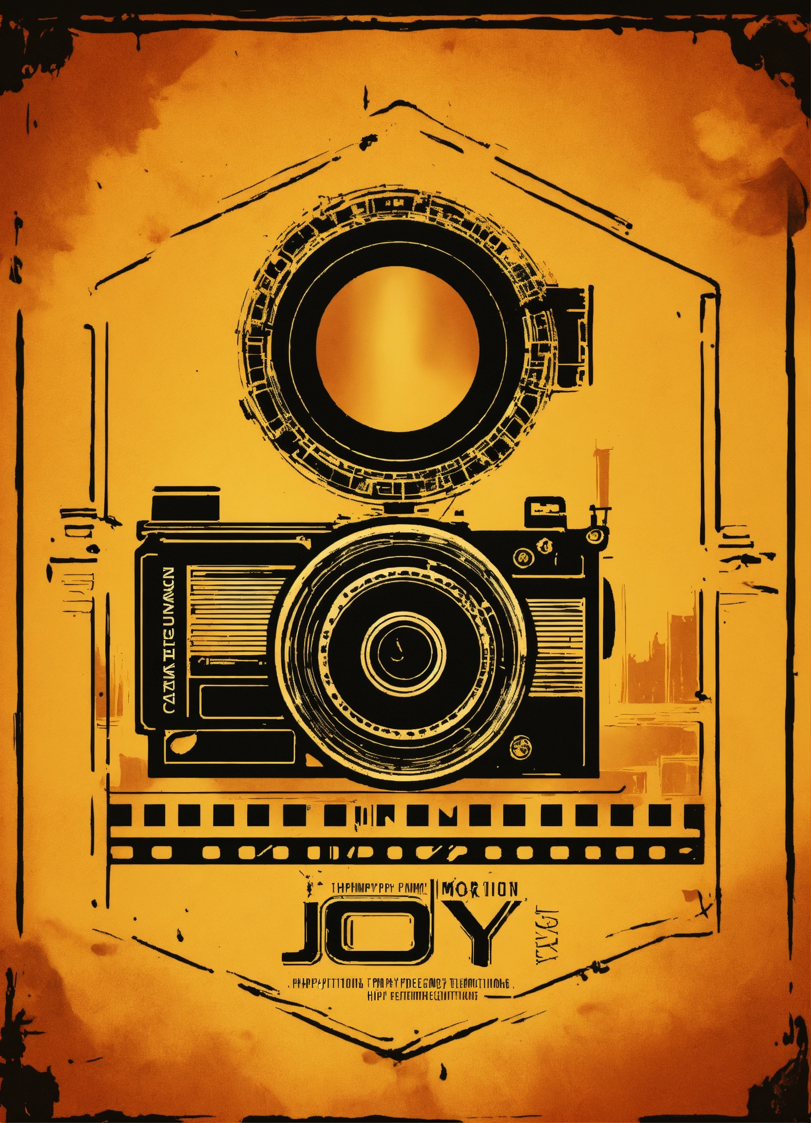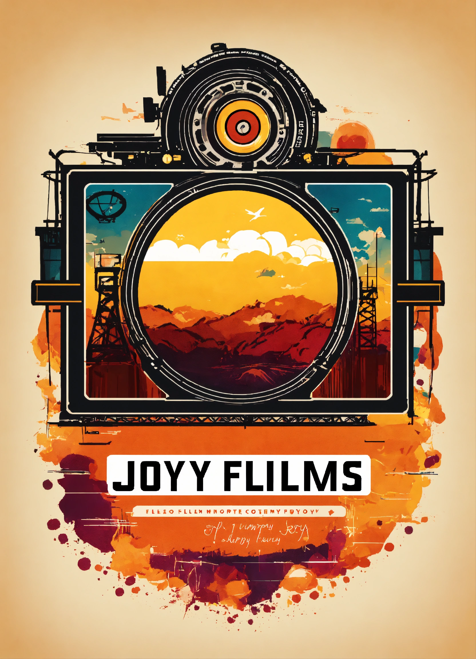 Film production company logo design, text as "joy films", happy motion, big and bold text "joy films", movie making elements, more space for text, high detail ink art emblem design