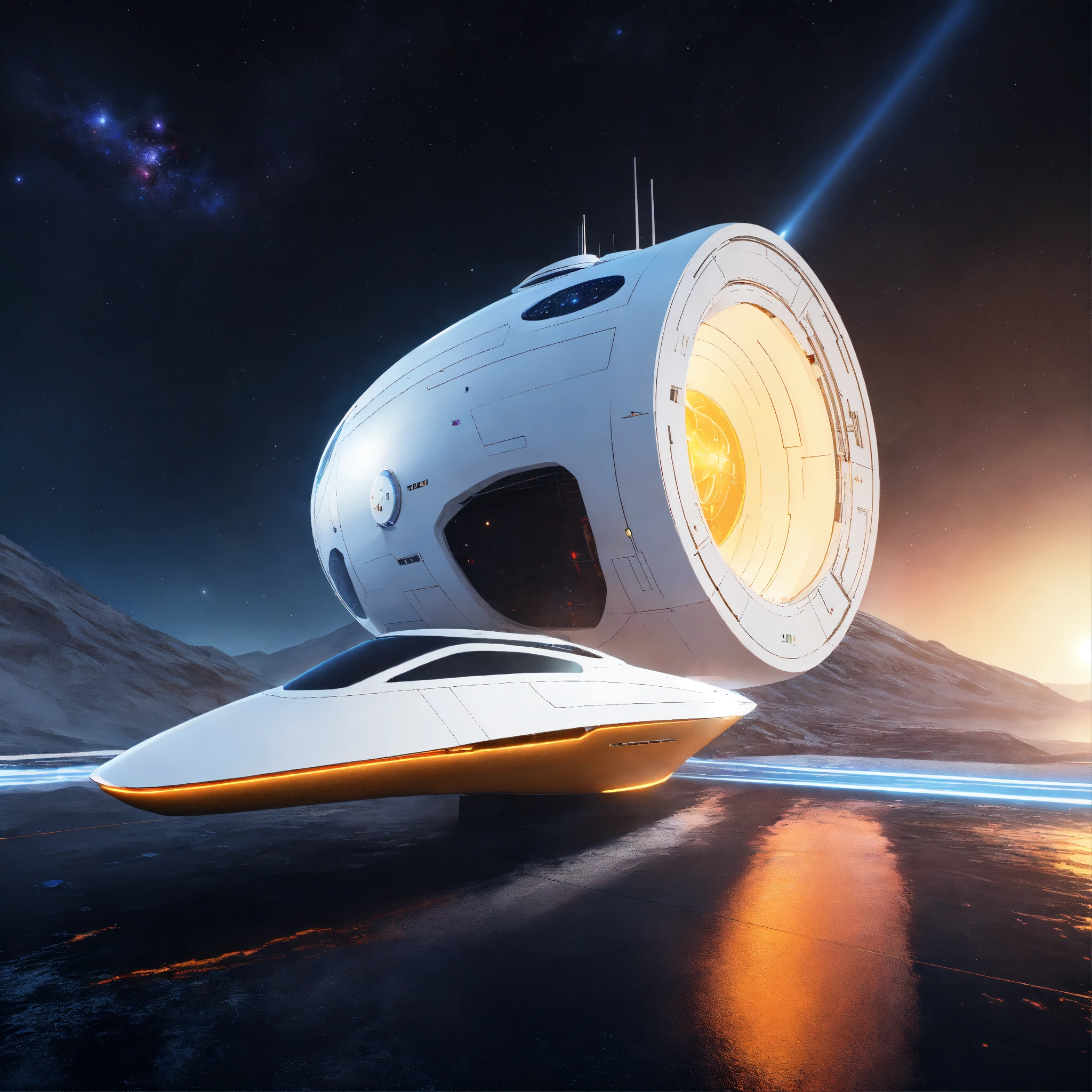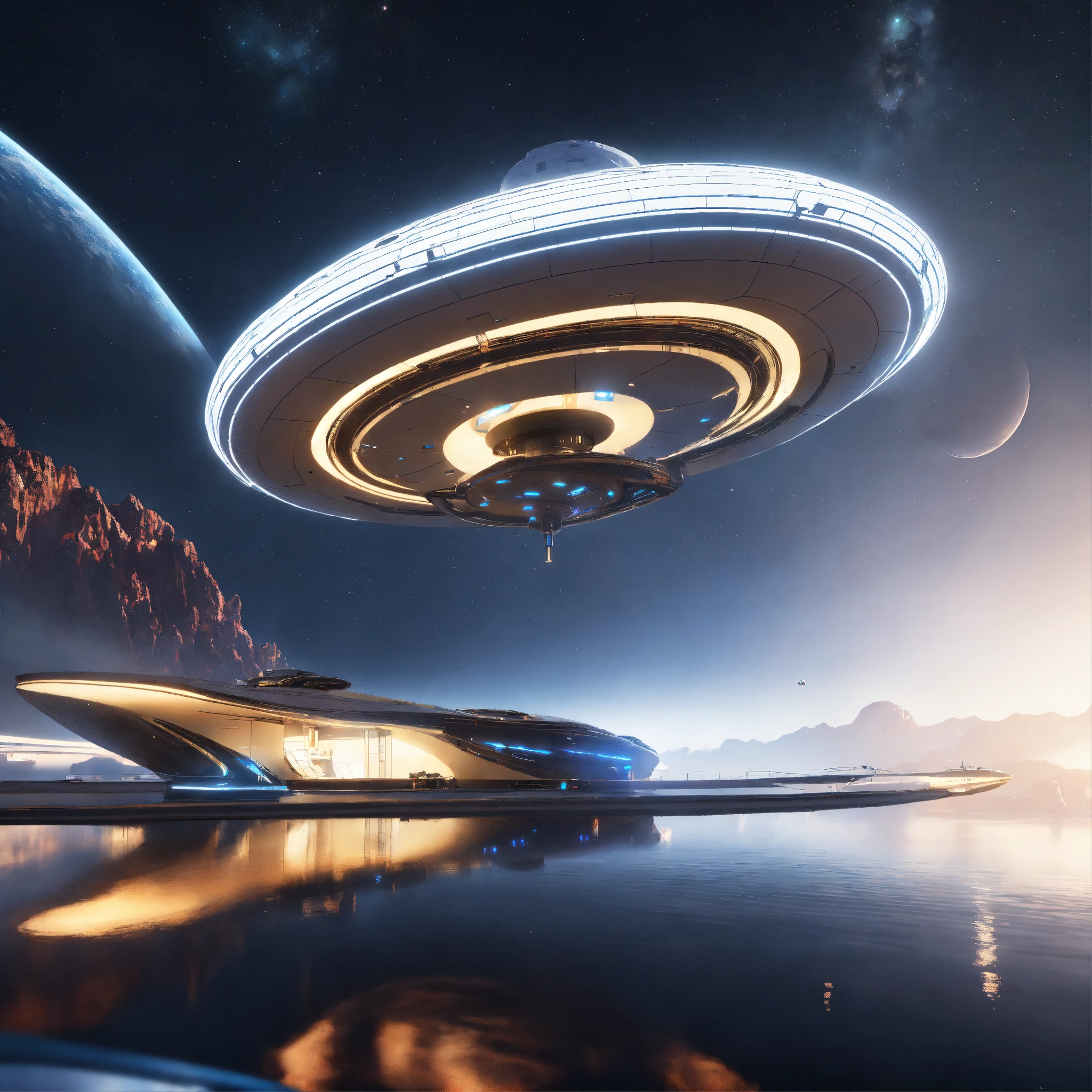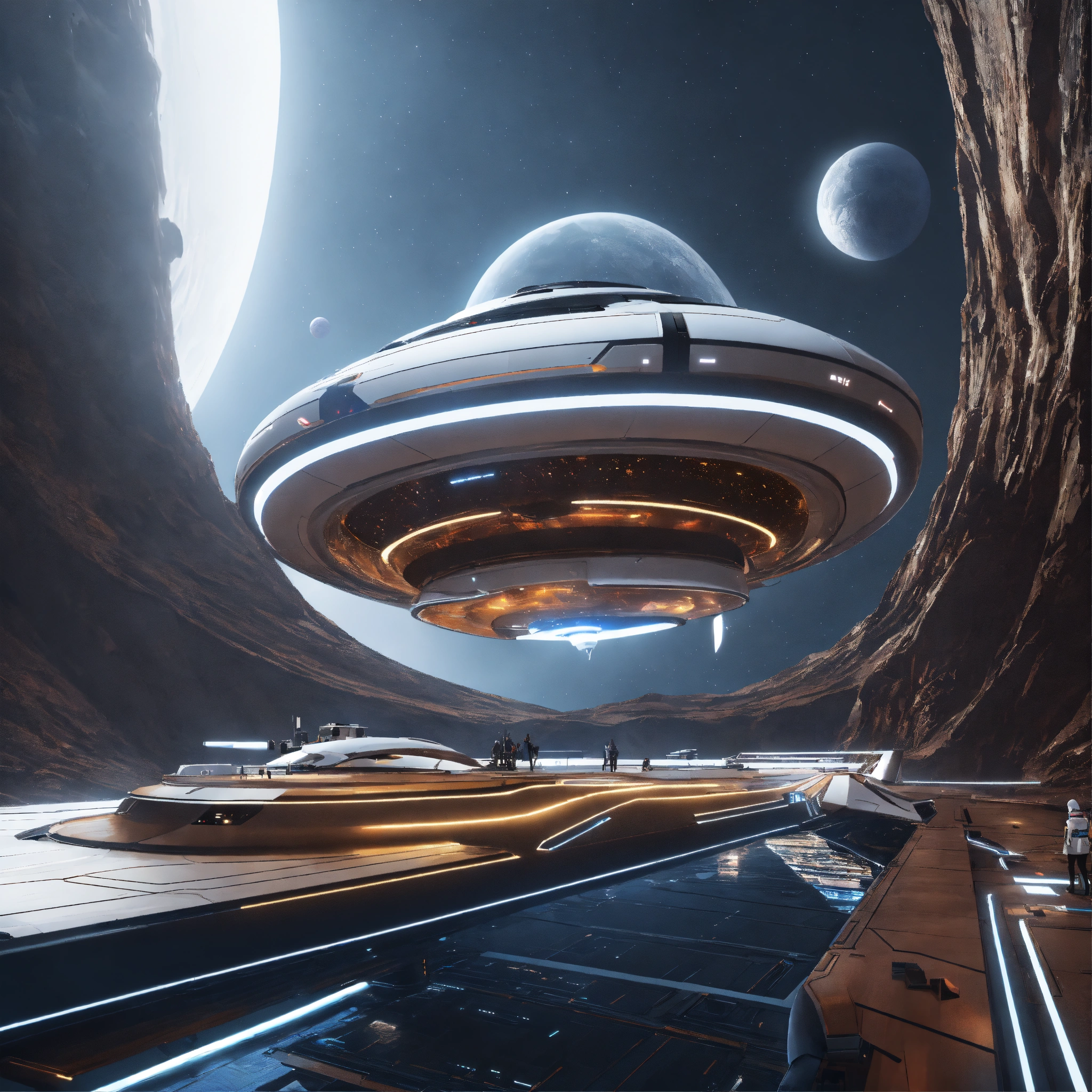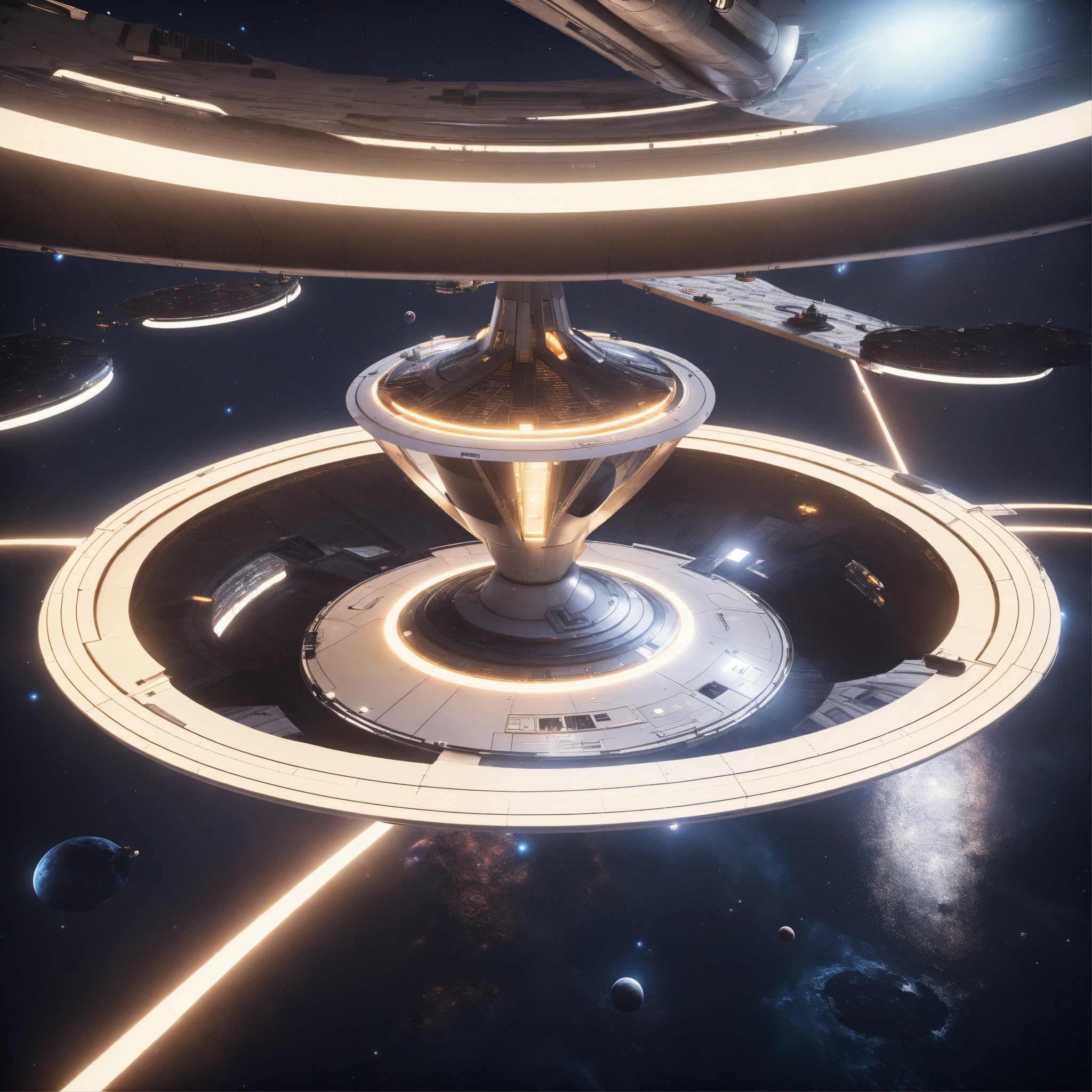 Space yacht enters a beautiful docking port on a white spinning top disc shaped spaceport floating in deep space, zaha hadid, futuristic, sci-fi, 8k, unreal engine, pixar
