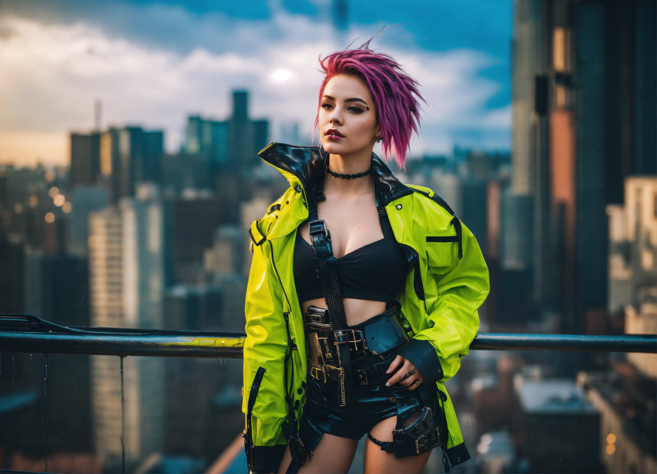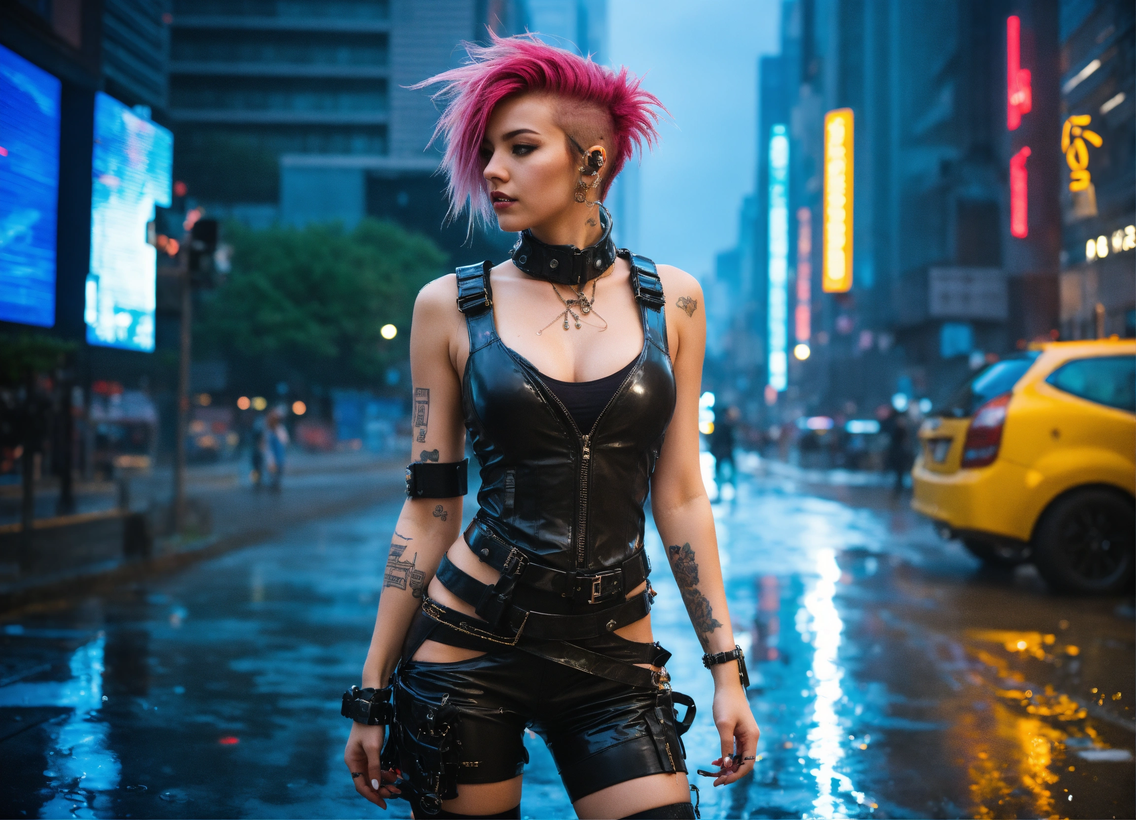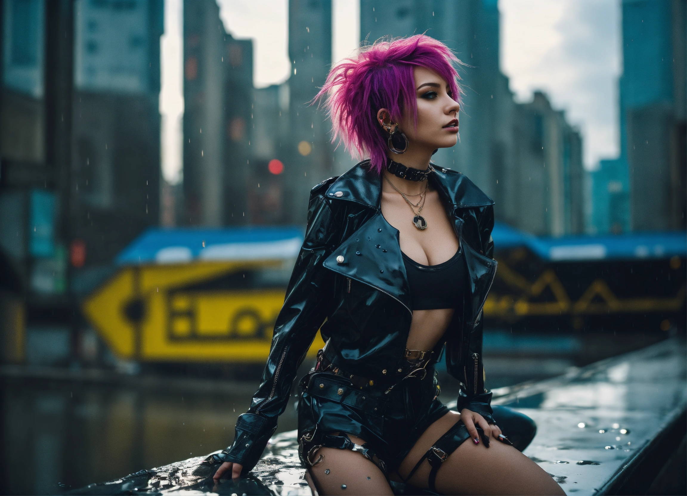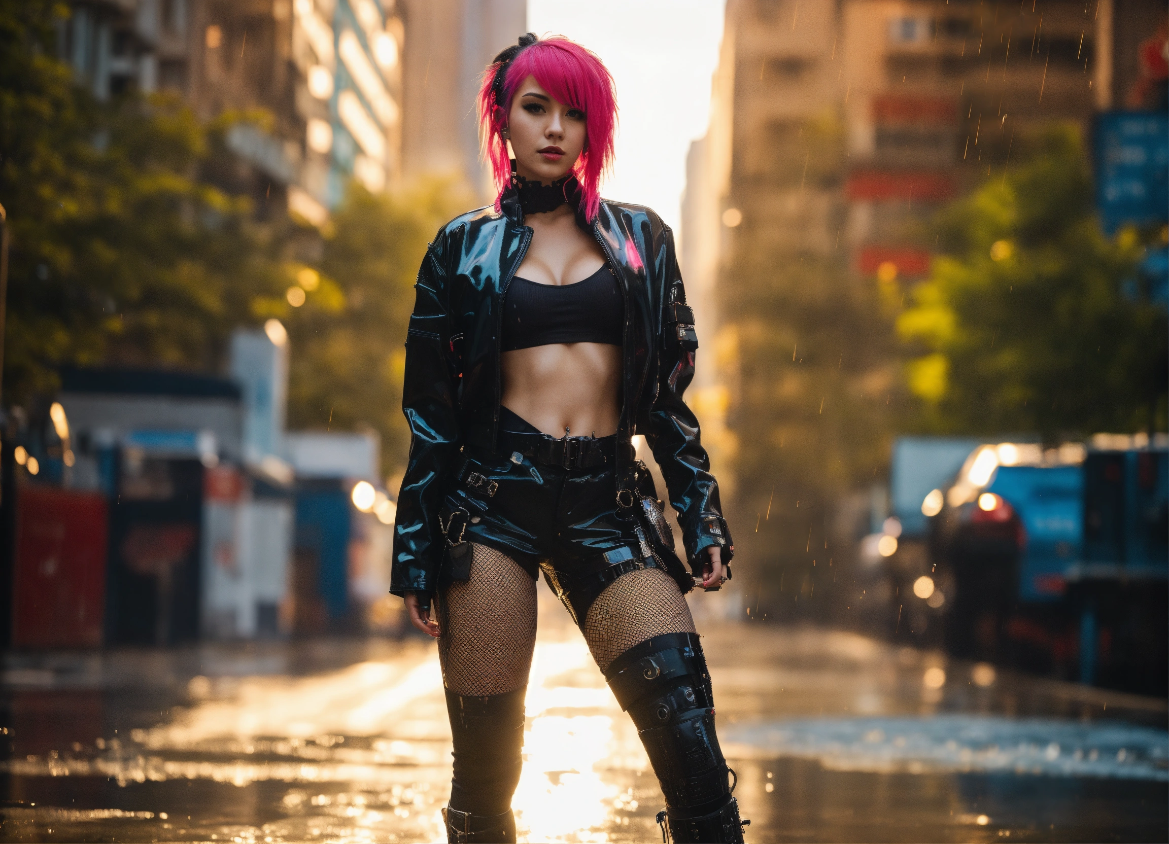 Photo, full body cyberpunk dream girl, punk hair, futuristic, sunny weather, city, open shirt, latex, rain