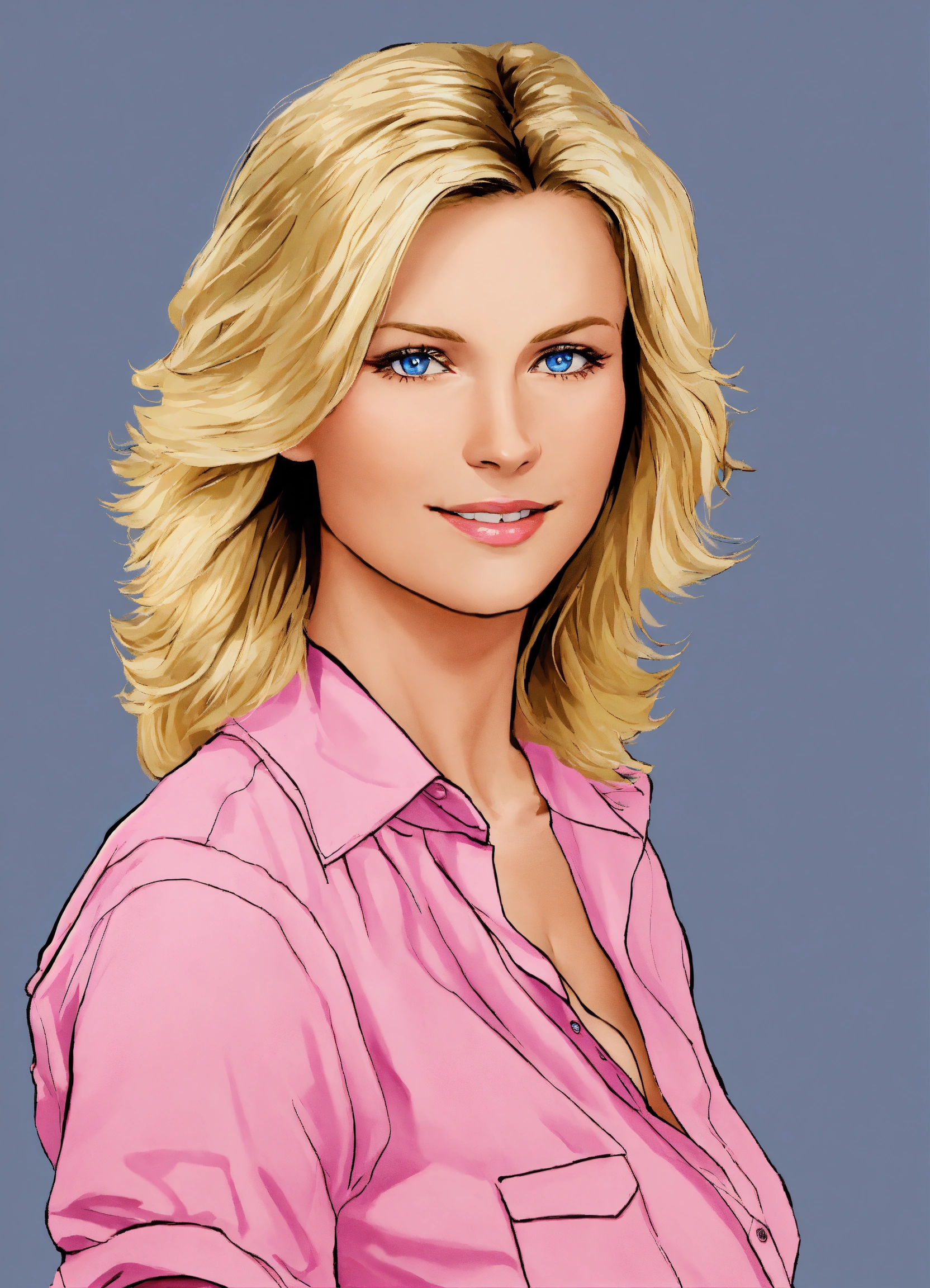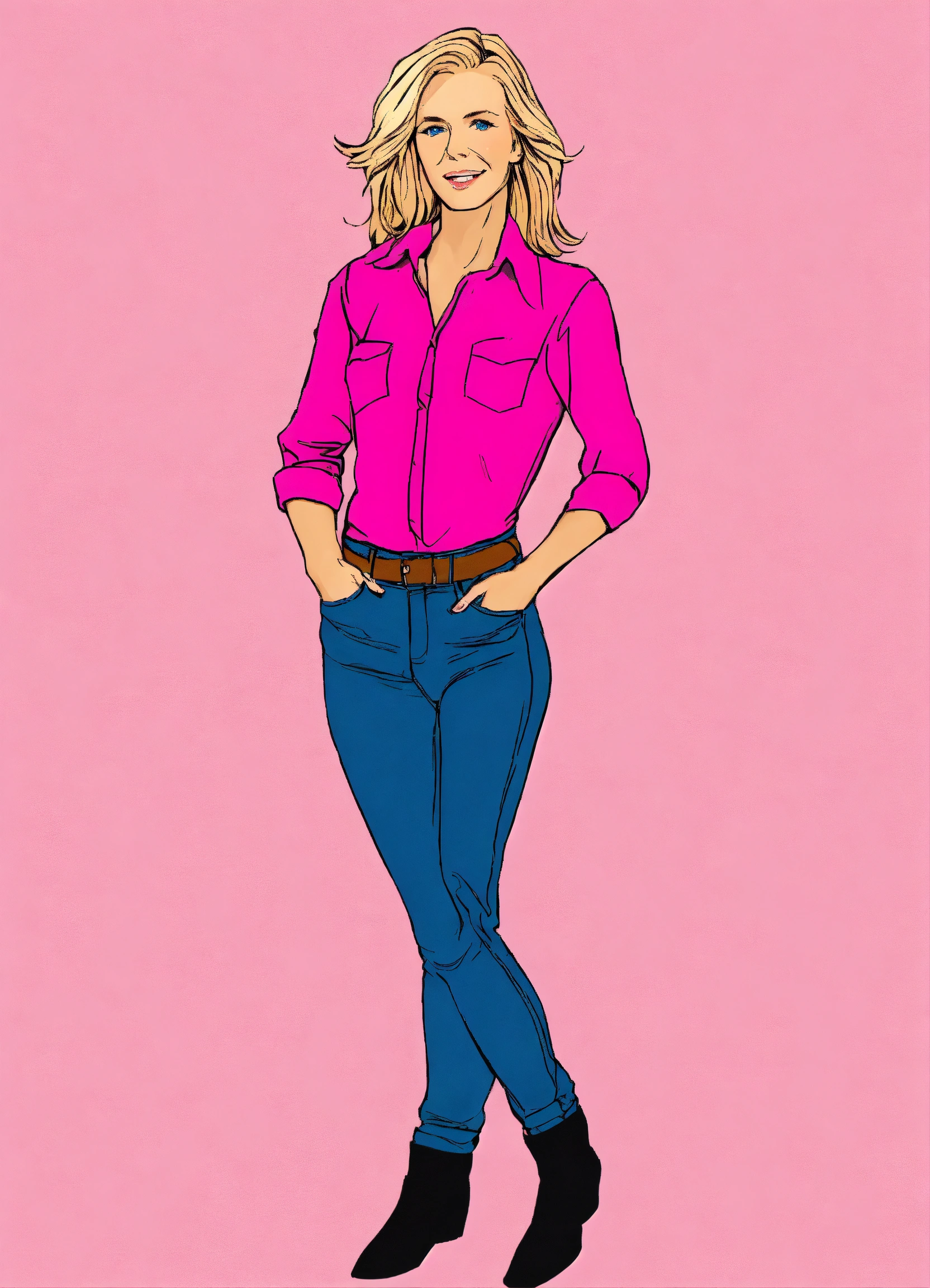 Clip art of a middle aged blonde woman with blue eyes in a pink shirt and jeans