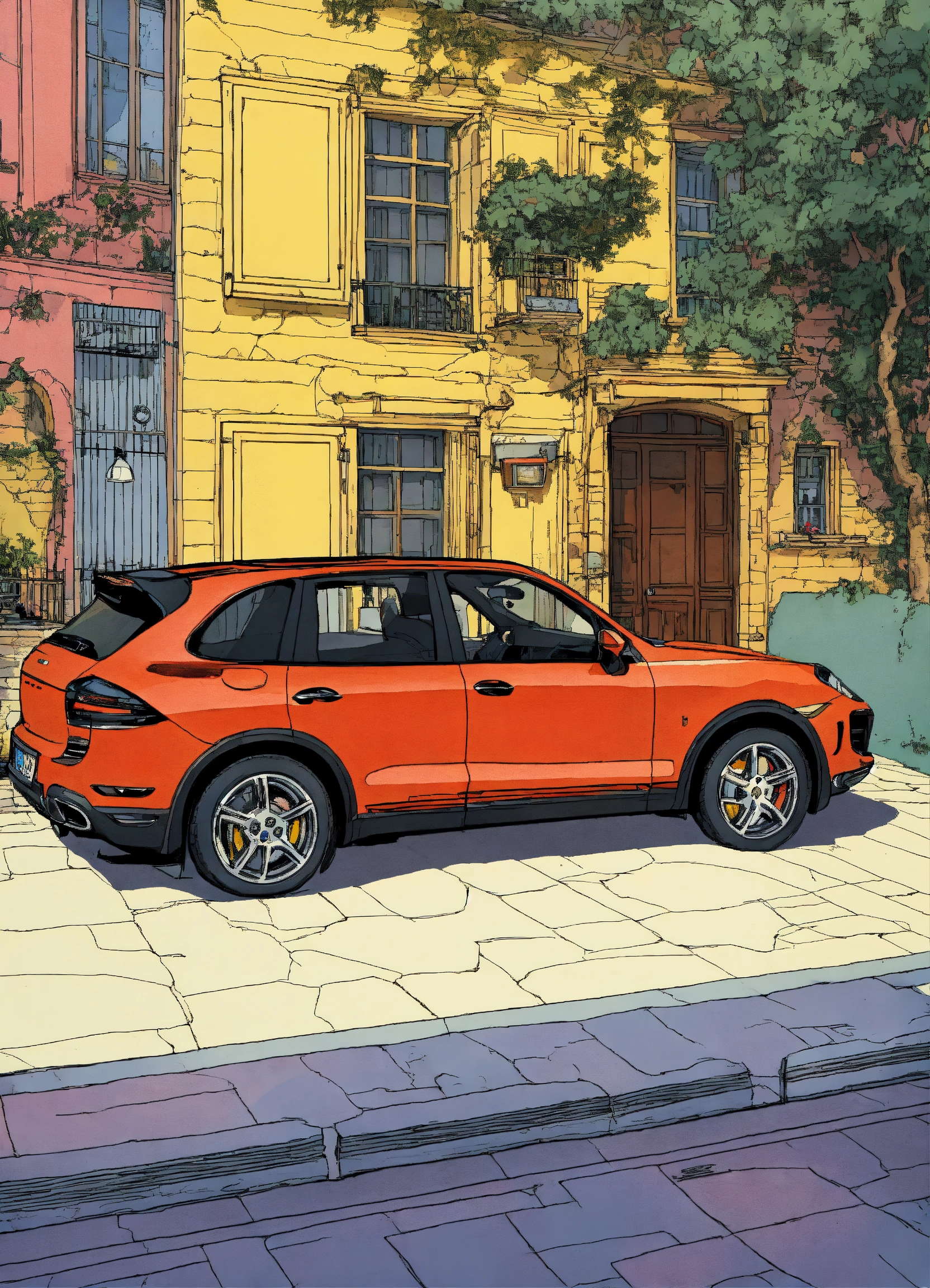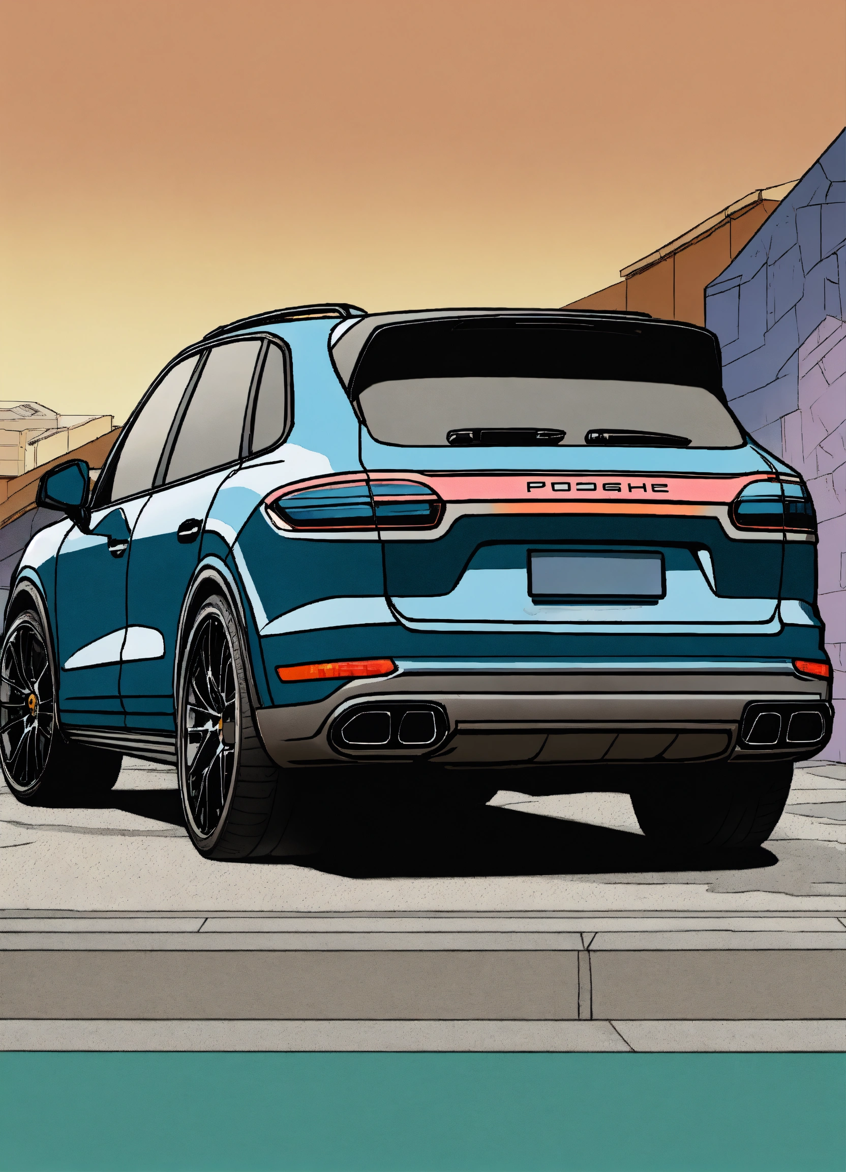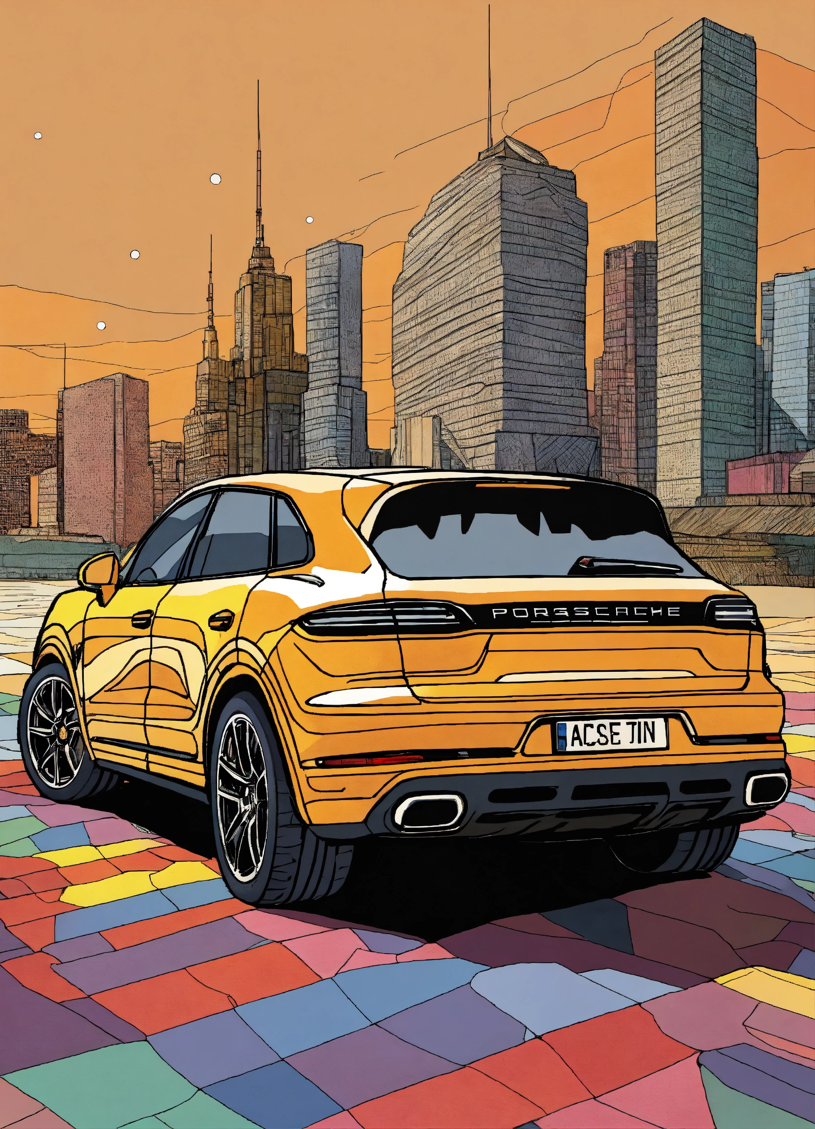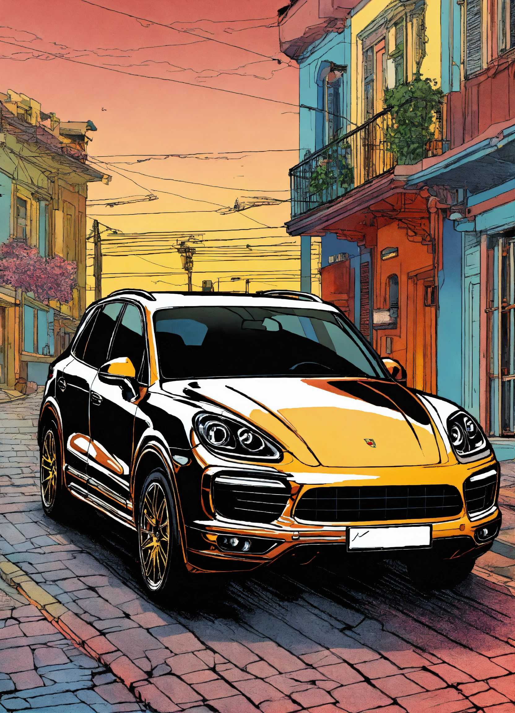 Detailed pen and ink illustration of porsche cayenne turbo s, colorful background and dark color of the car, by herge, in the style of tin-tin comics, detailed, high quality, minimalism, aesthetic.