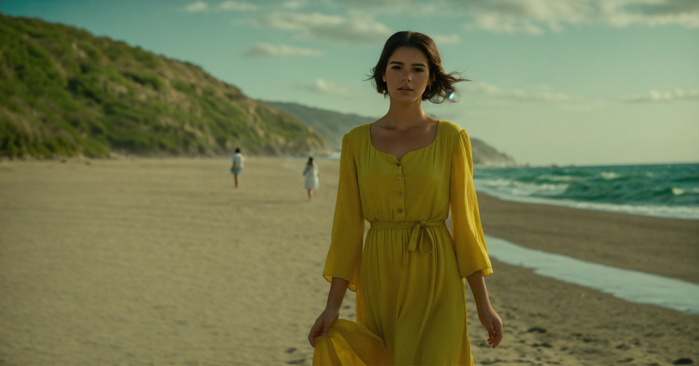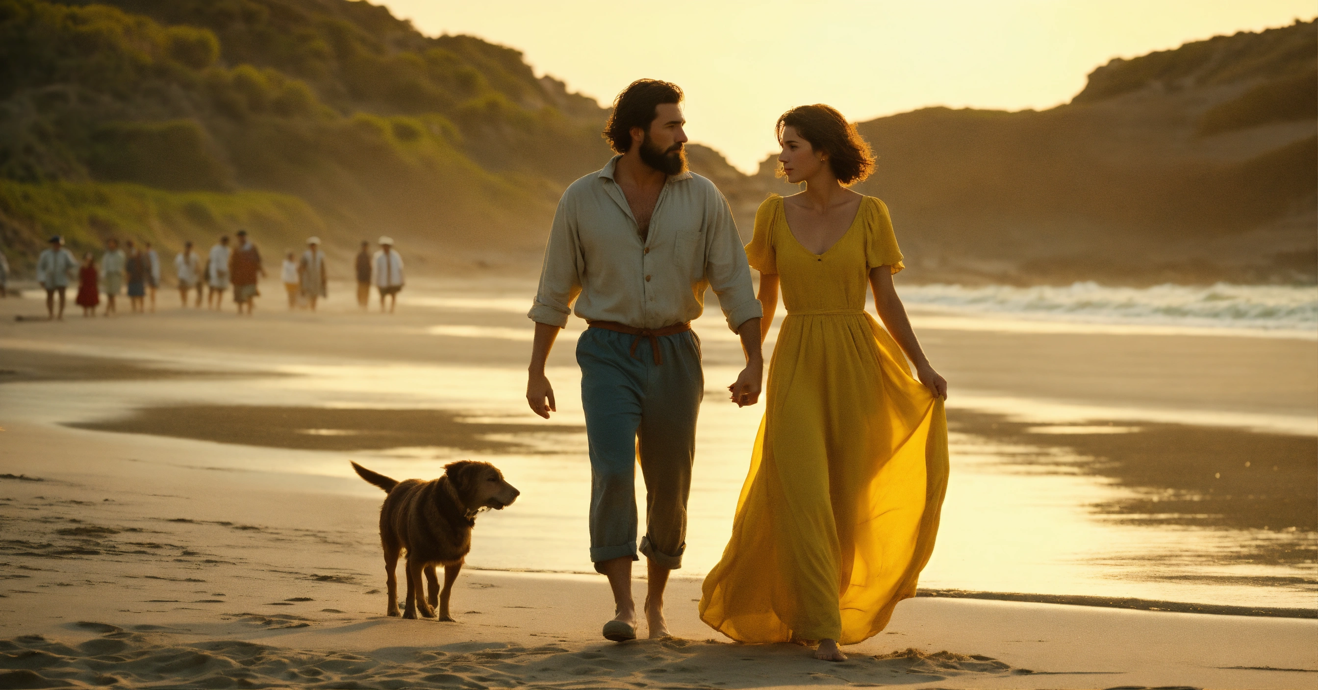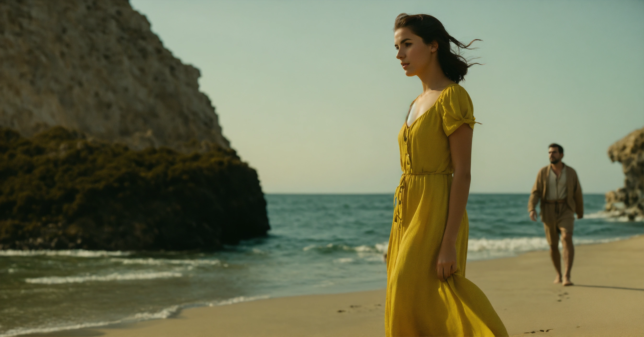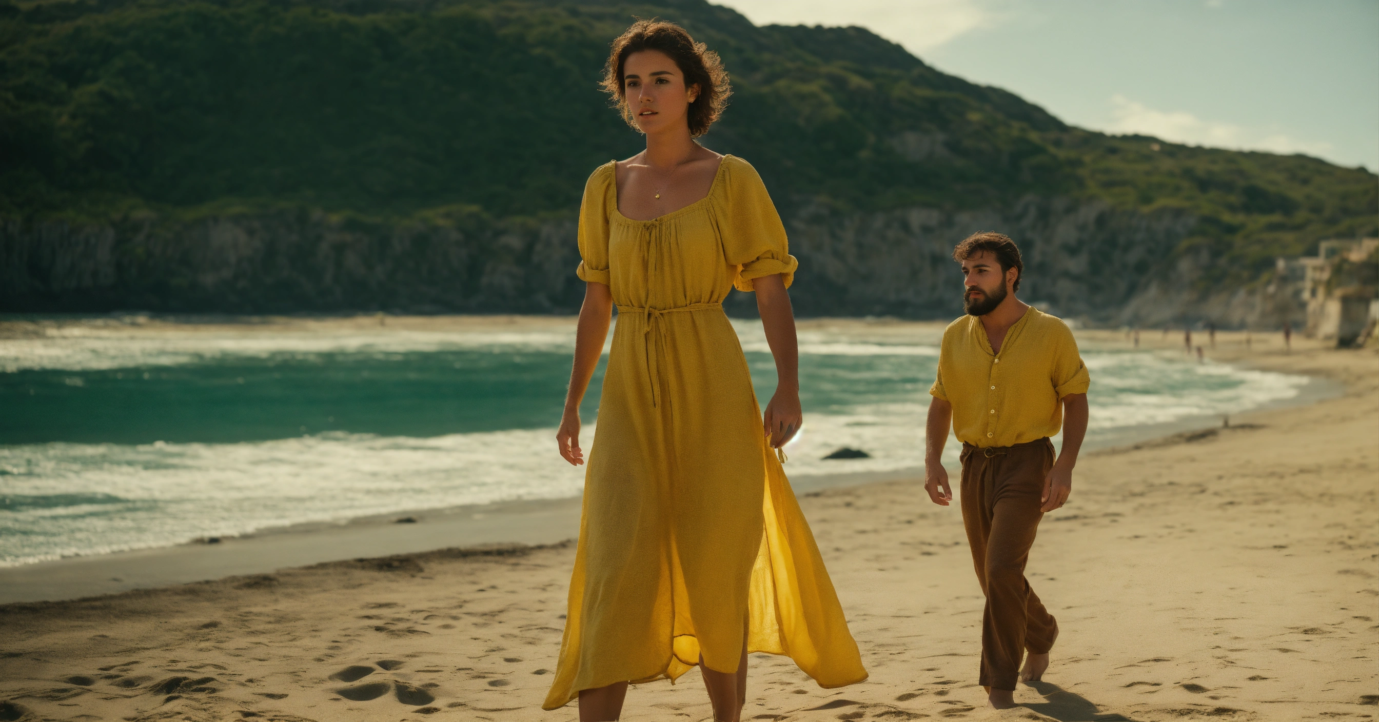 The young, very young spanish maria, 22 years old, brown hair, dressed in a long yellow dress, walking on the beach with the old fisherman juan, spanish, short haired and bearded, dressed as a fisherman with rustic clothes. high quality, 8k, cinematic