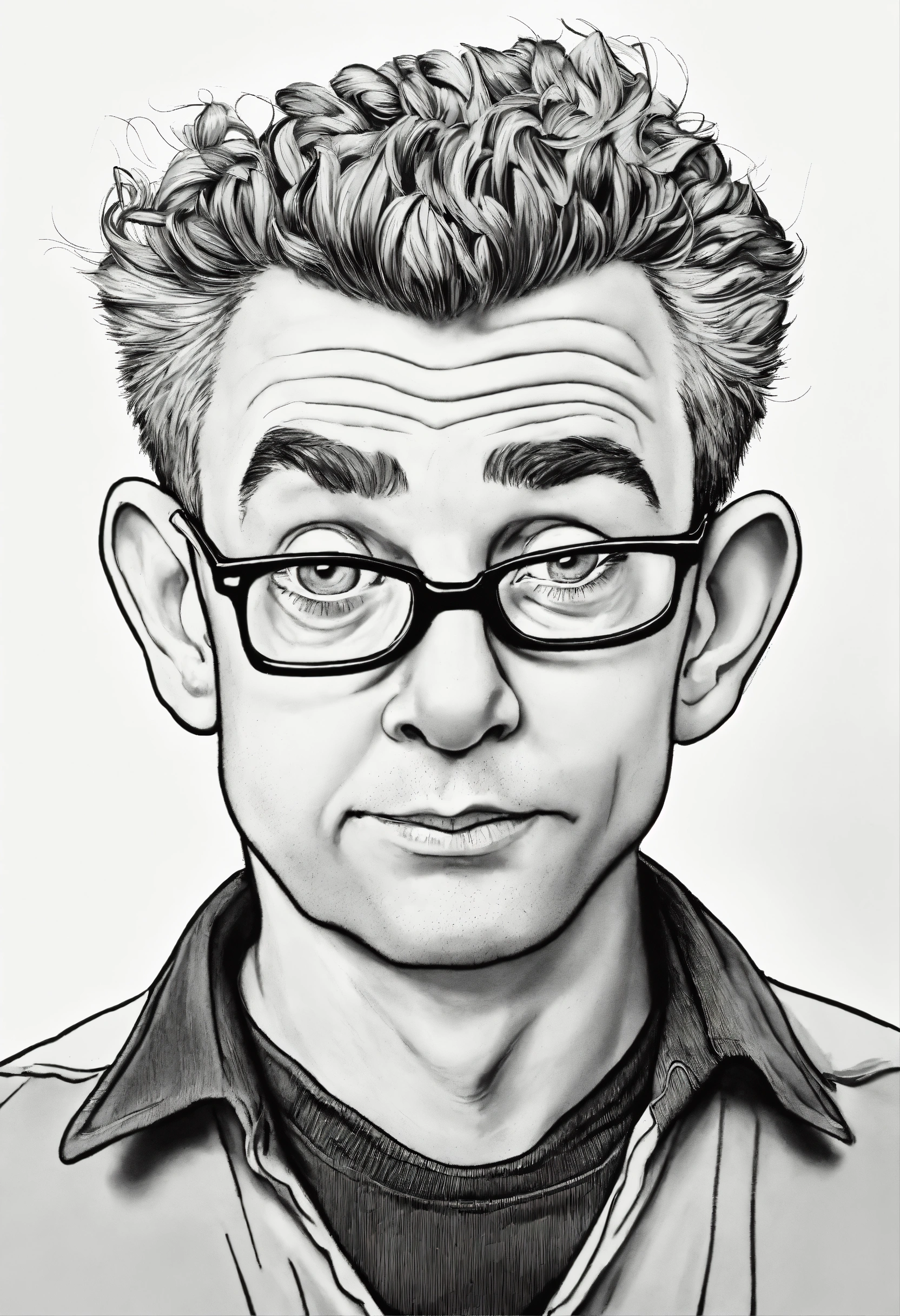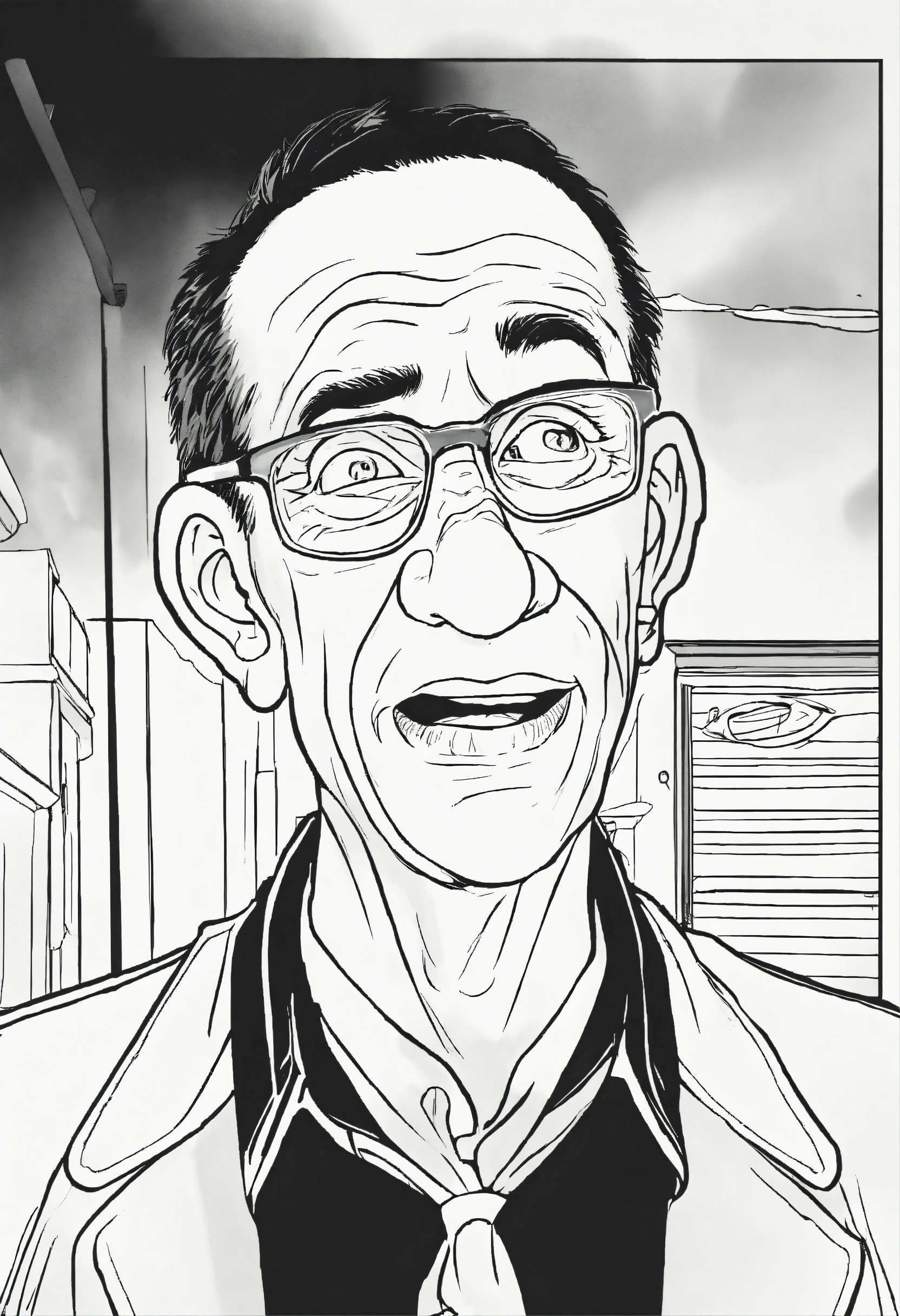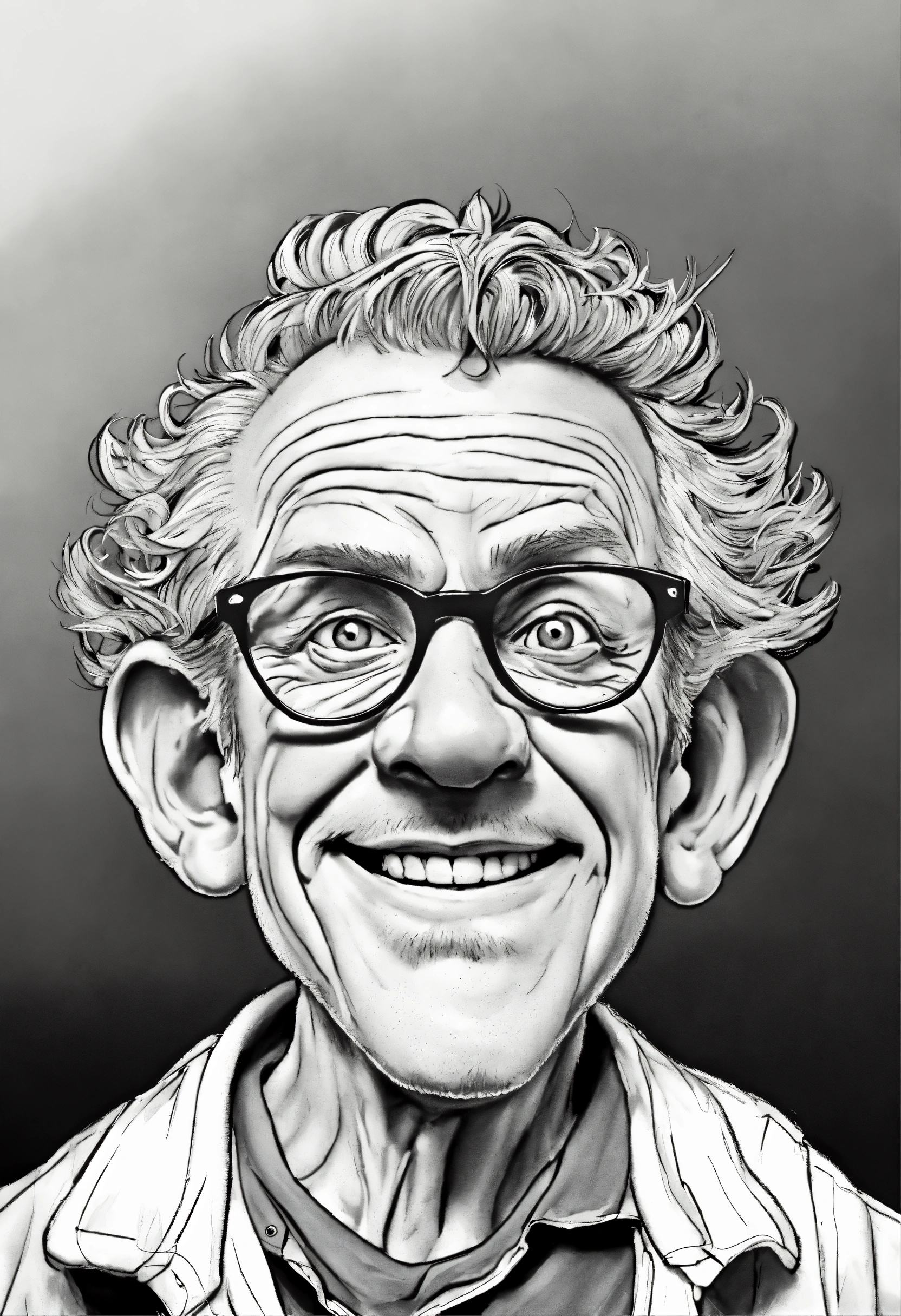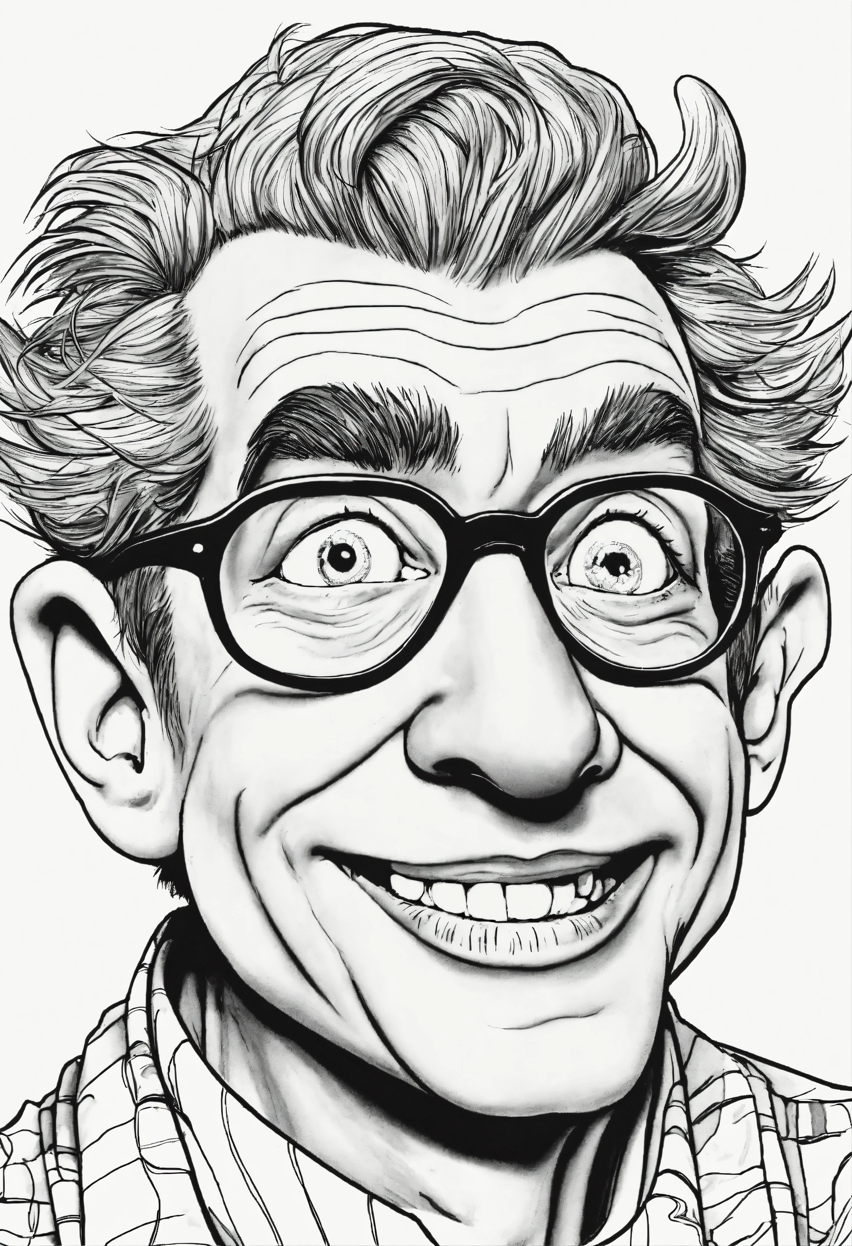 Coloring page for adults, clean lines, mad magazine character idiot face, black and white, caricature, white background