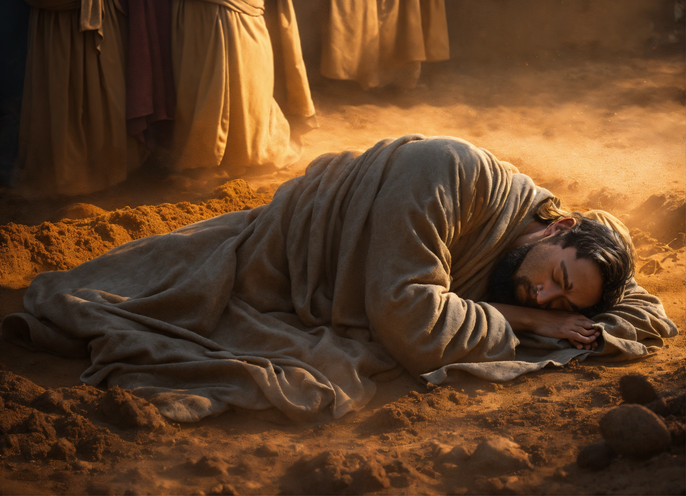 sleeping on his side in the dirt
