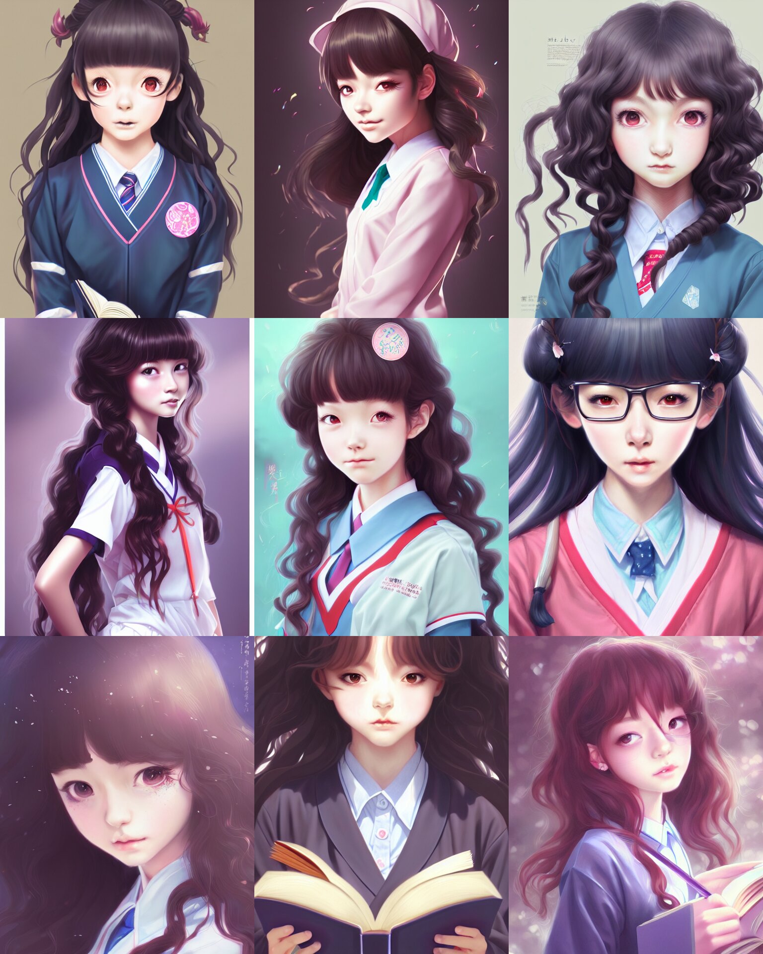 Innocent young teen girl, magical school student japanese uniform, curly dark hair, library books, highly detailed, digital painting, trending on artstation, pixiv, concept art, sharp focus, illustration, art by ross tran