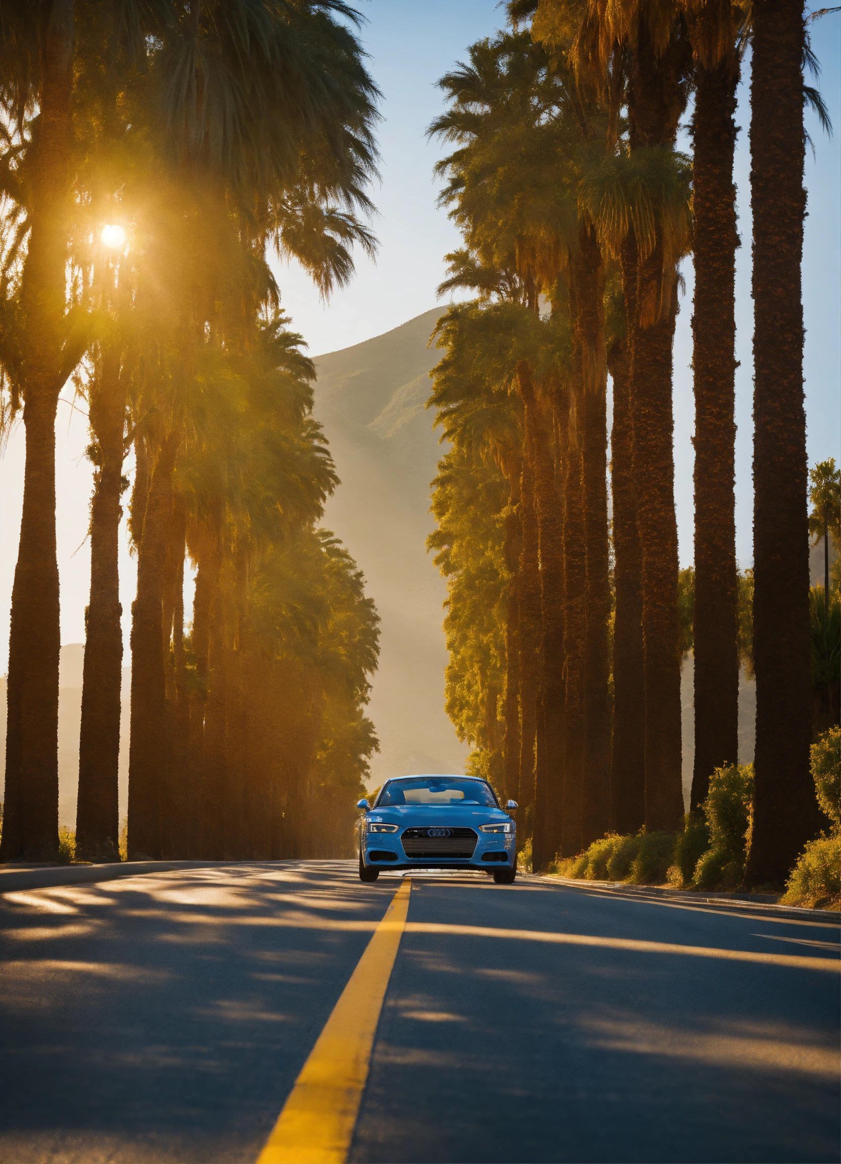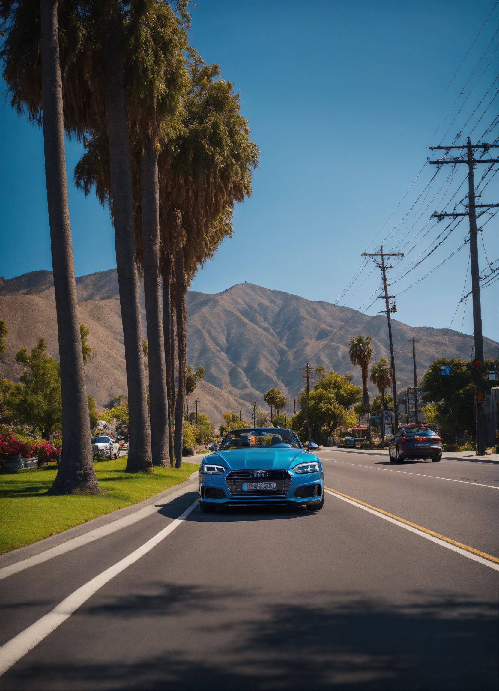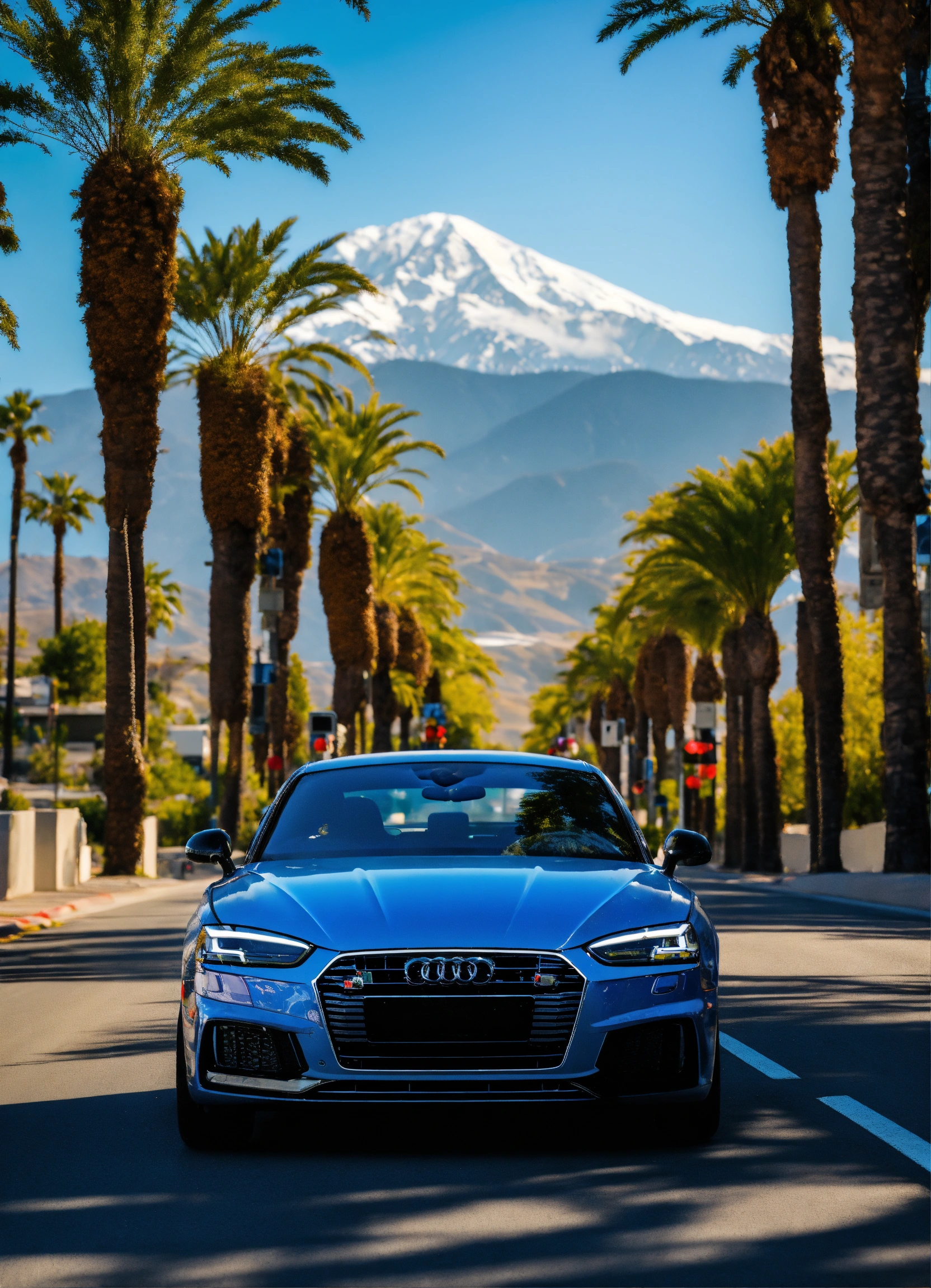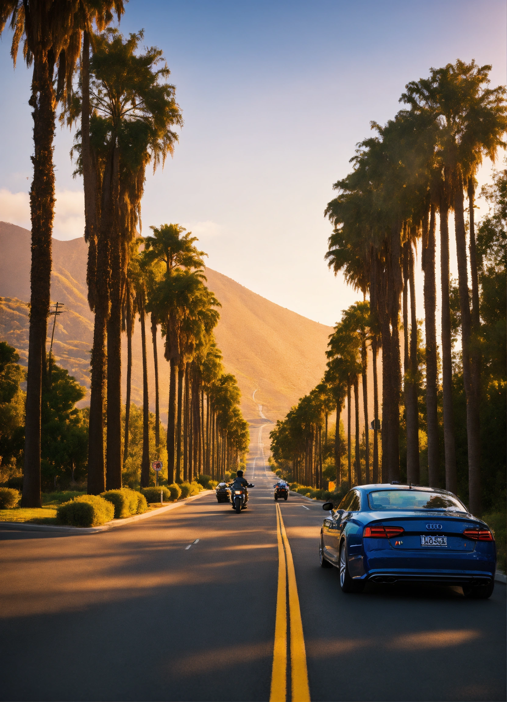A straight road in california with tall palm trees on the side of the road. at the end of the road is a beautiful mountain with blooming cherry trees and a beautiful blue sky with a touch of spring. in the foreground in the middle of the street is a black audi a5 with donald duck as a side view. also, a motorcycle is driving down the street on its back wheel. unreal engine 8k.
