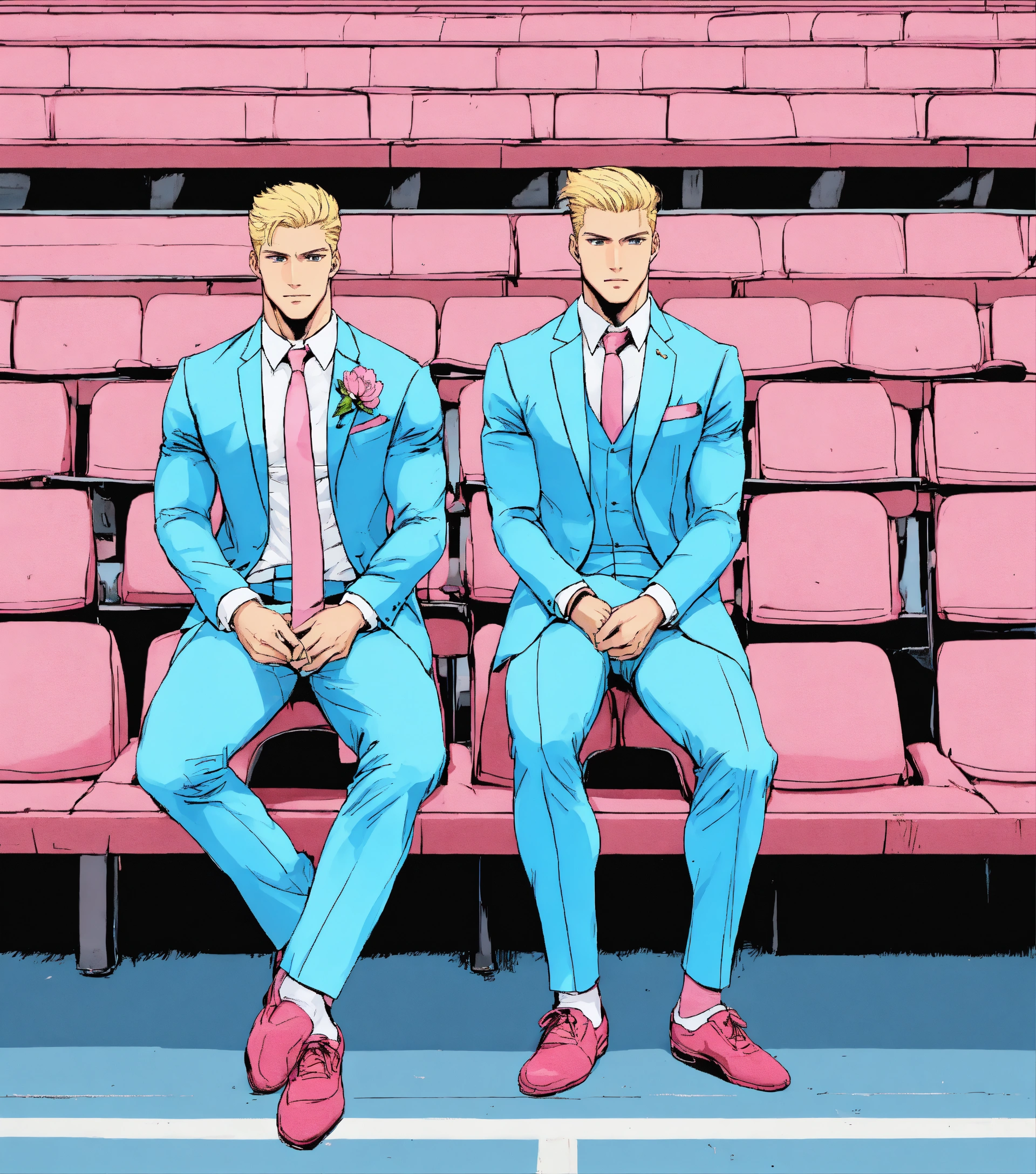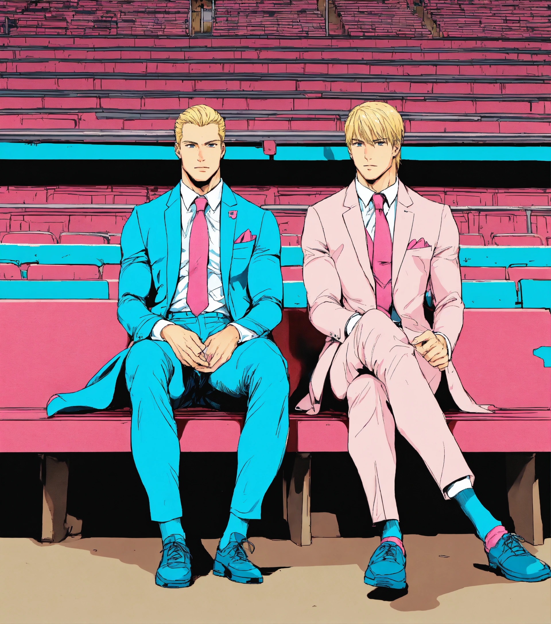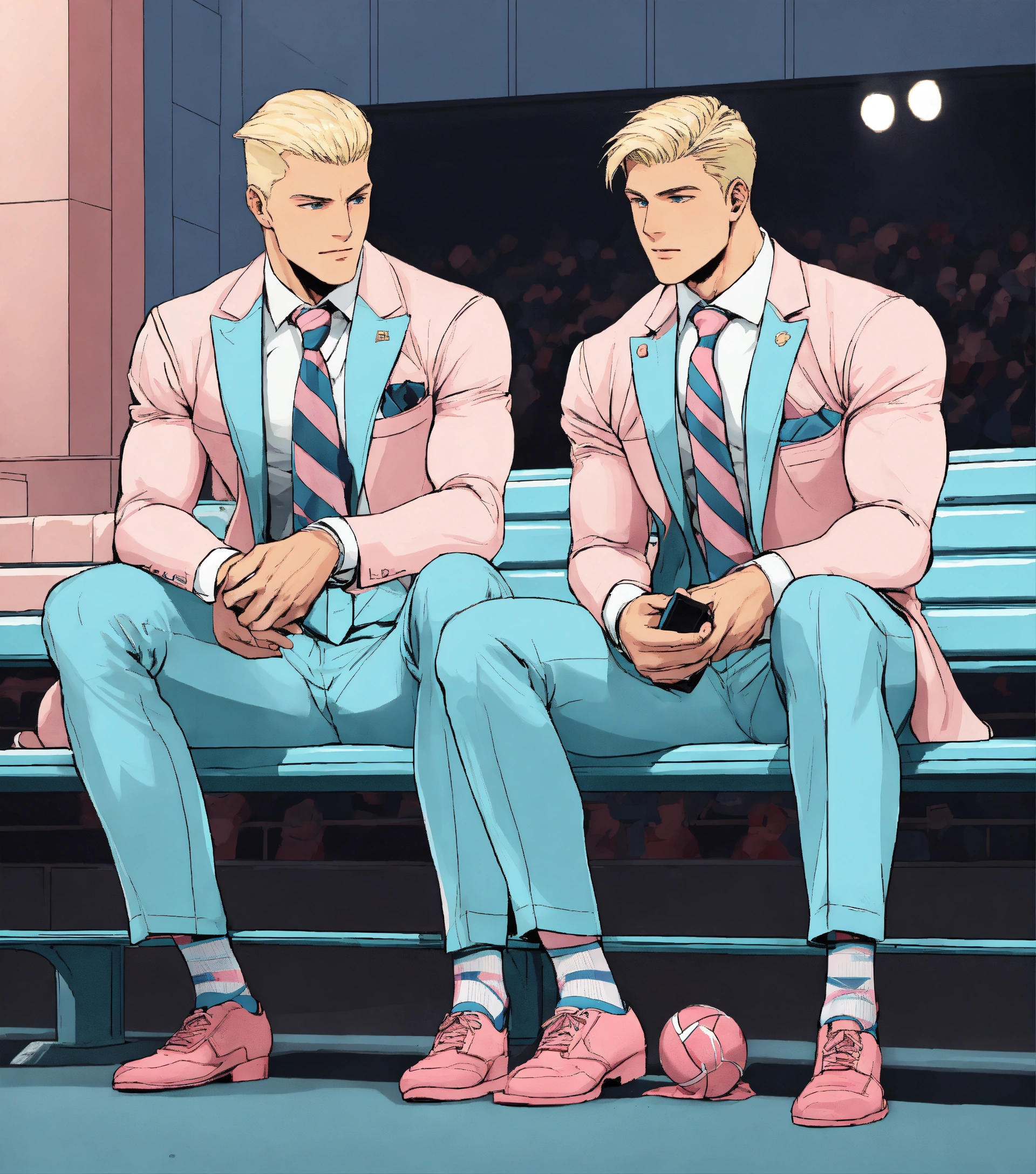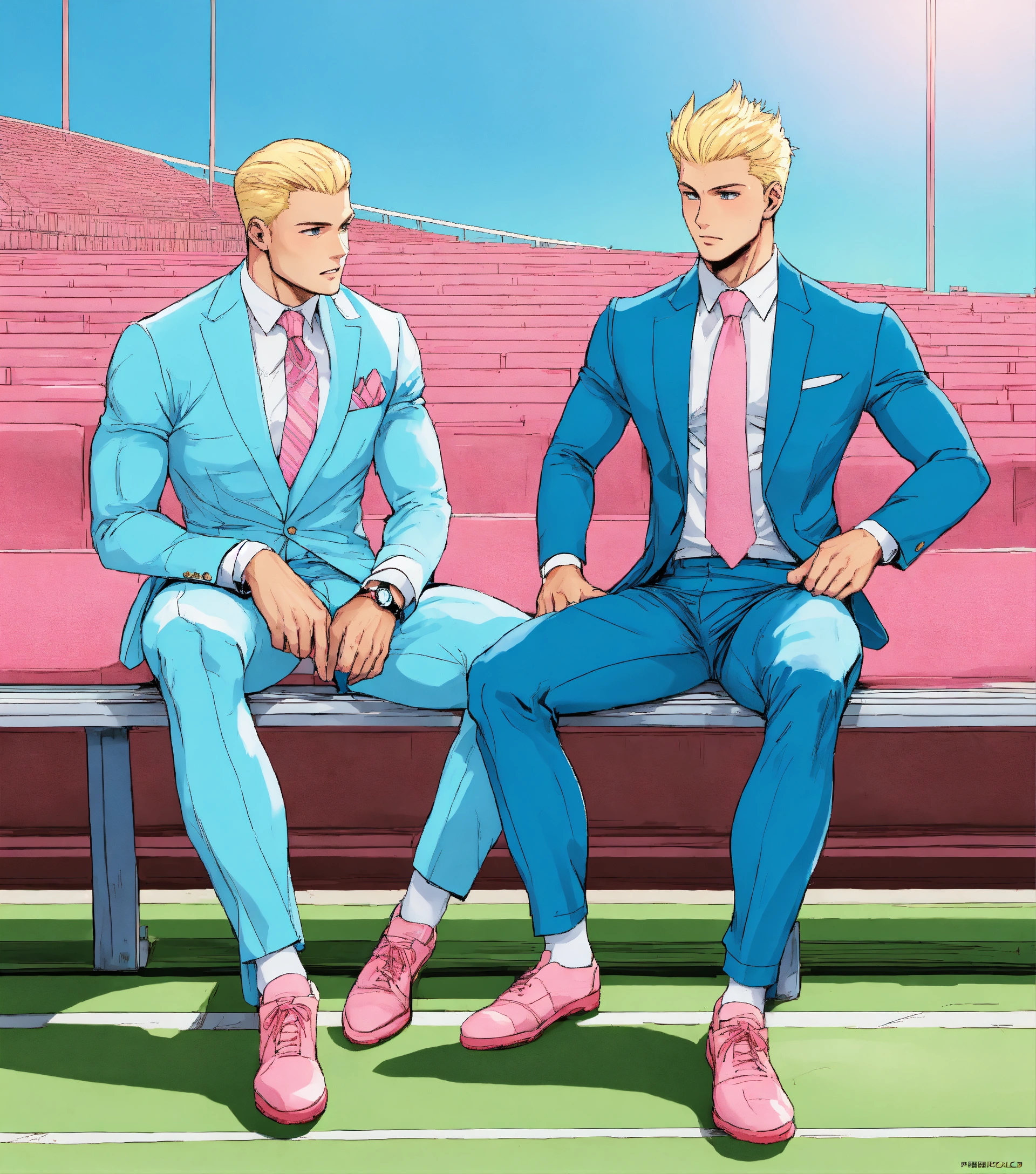 Two blonde muscular sportsmen in pale blue suit and club tie, pink socks, seating on a bench in a stadium, manga style