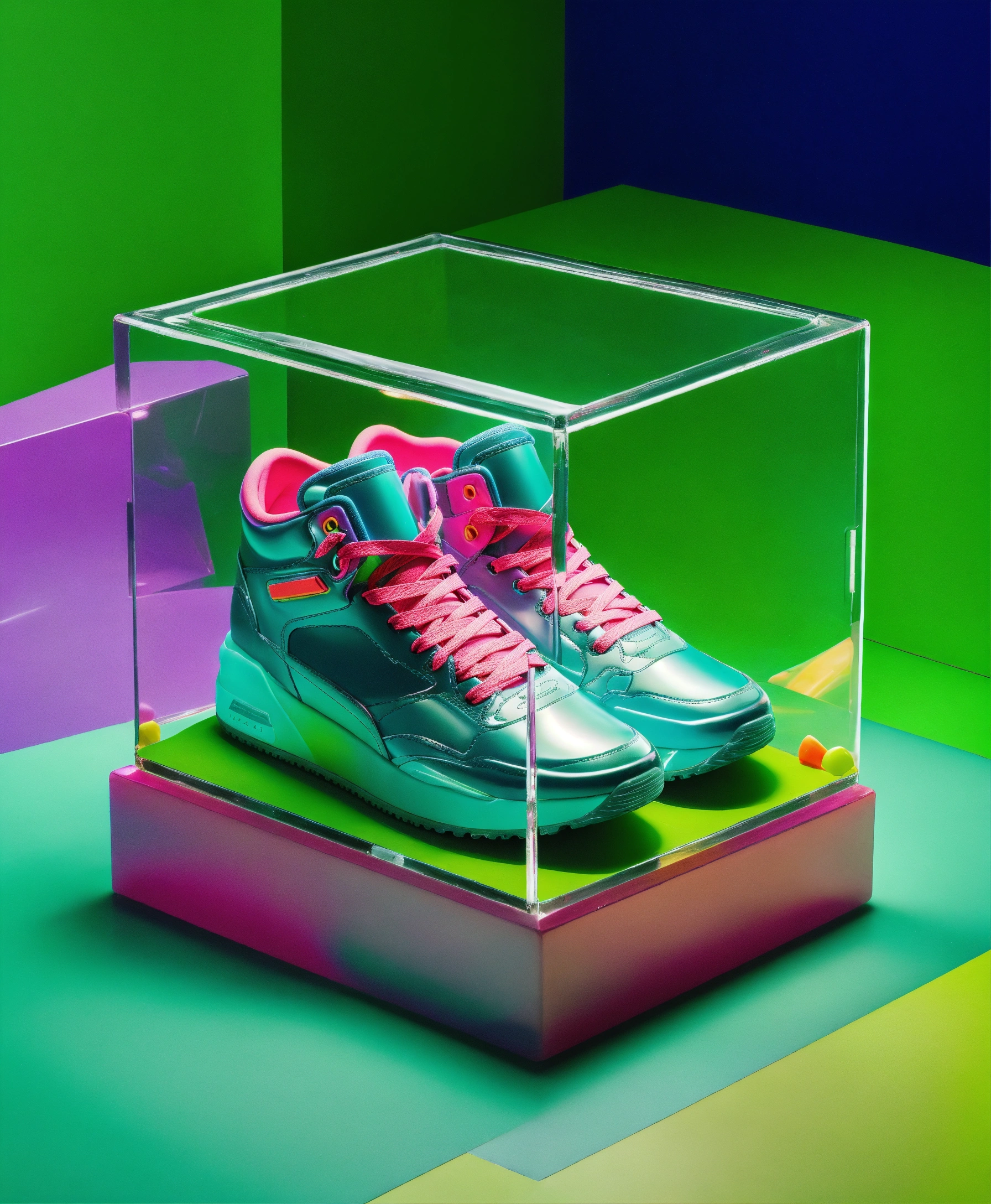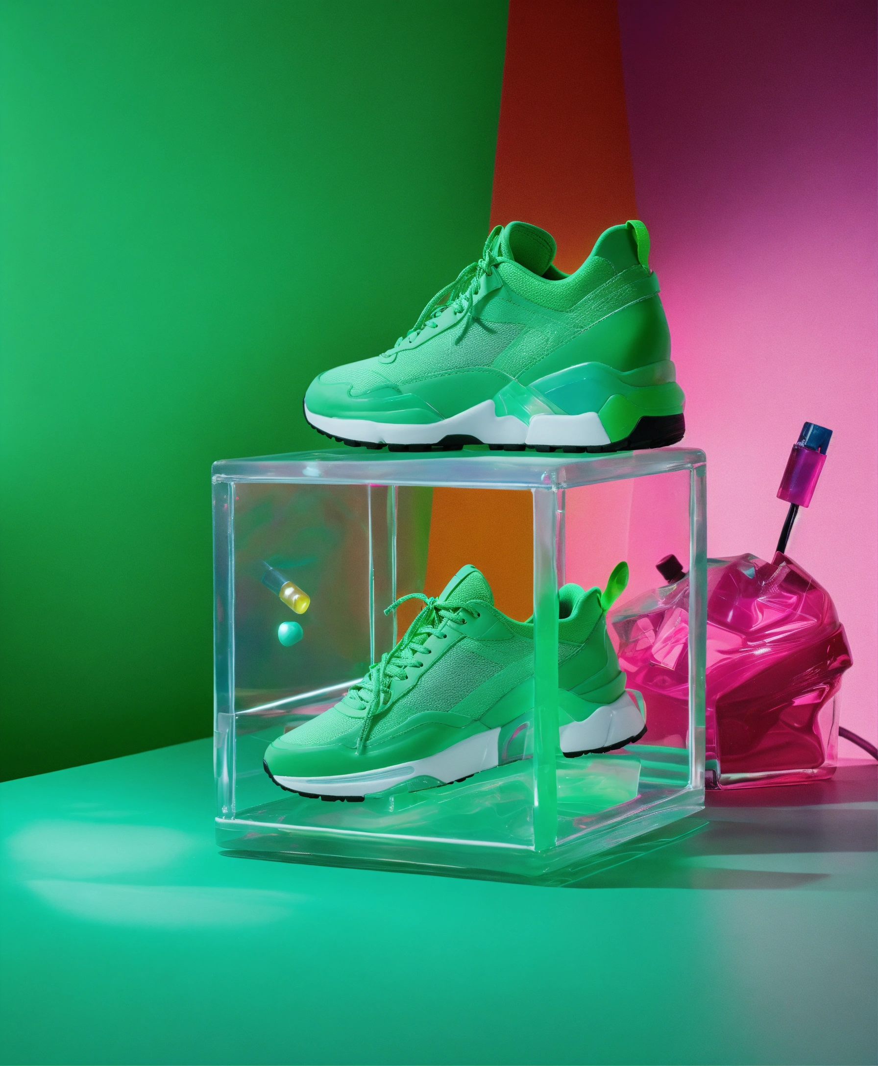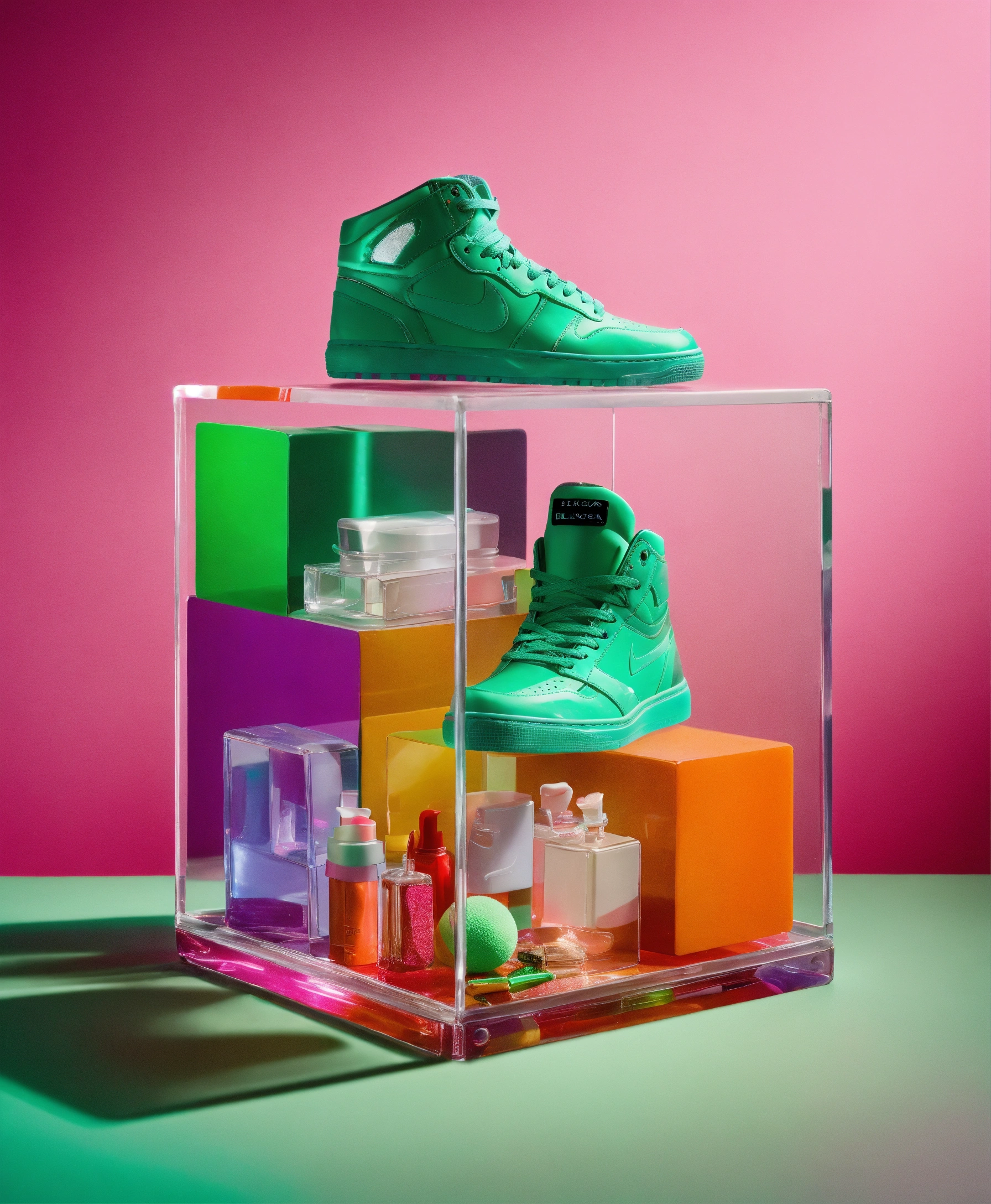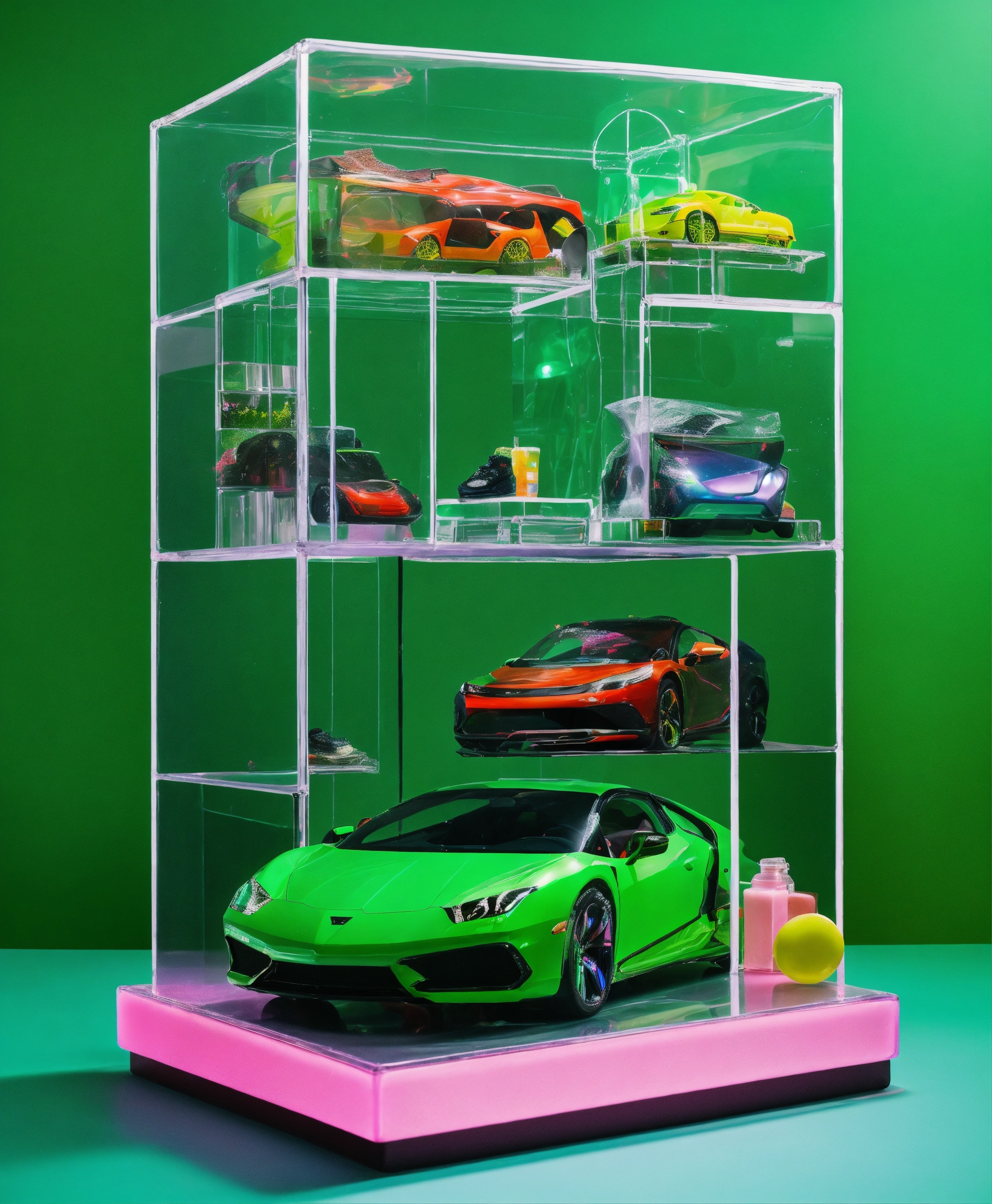 Clear plastic cube full of colorful recognizable found objects such as cars models, balenciaga sneakers, makeup. studio photography, e-comm, some neon green accent color, 4k, iridescent, studio photography, solid color background! table top photography! realistic! green!
