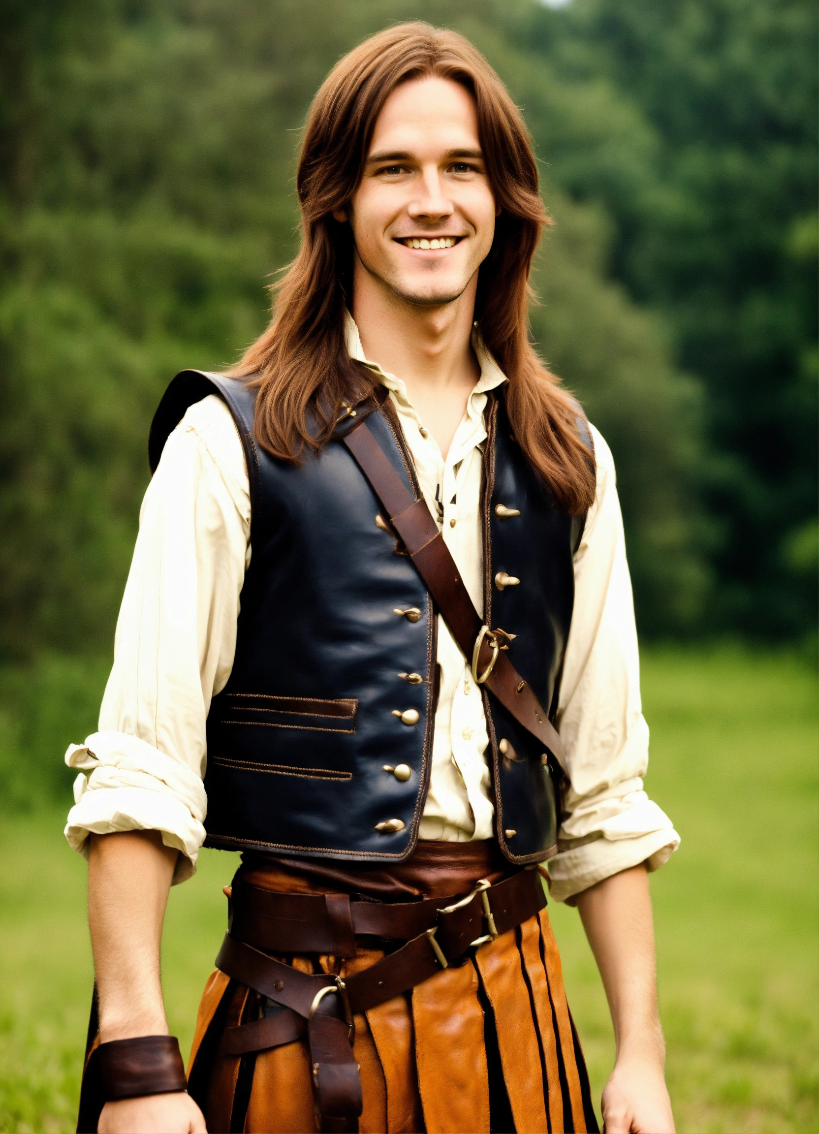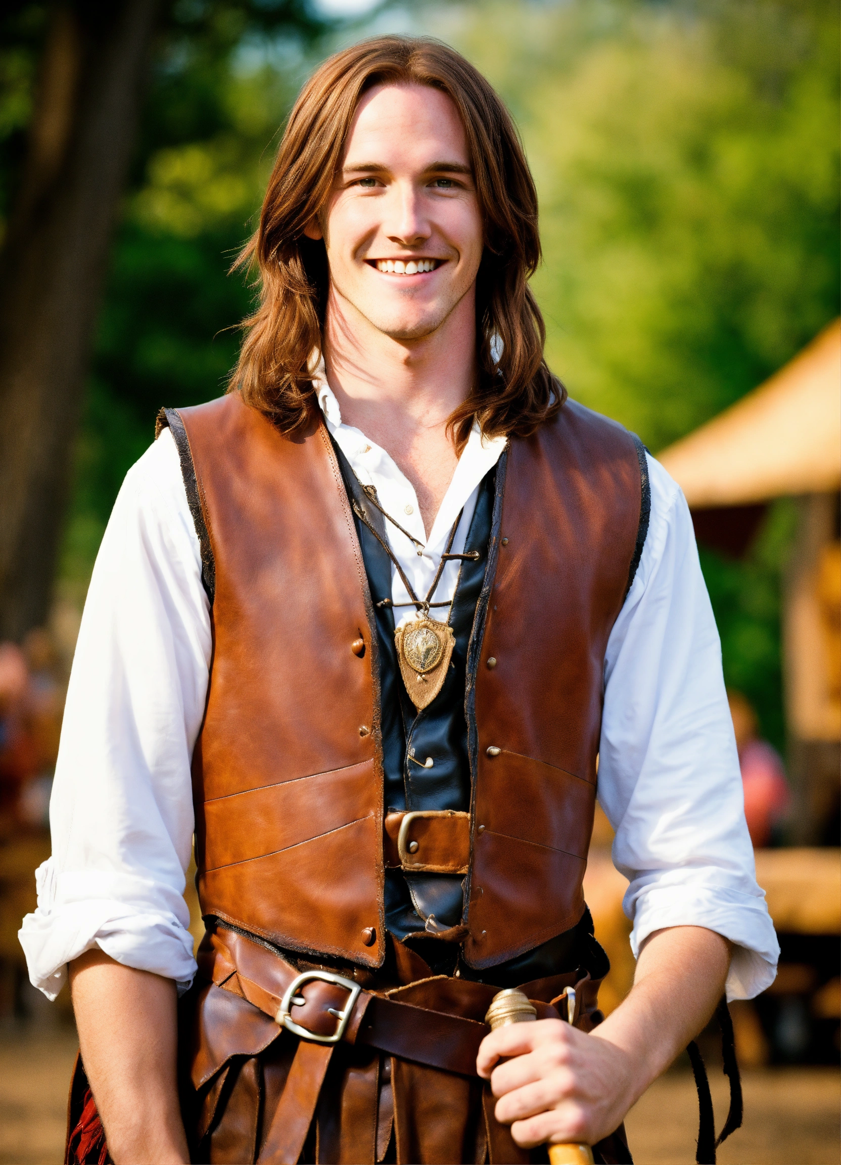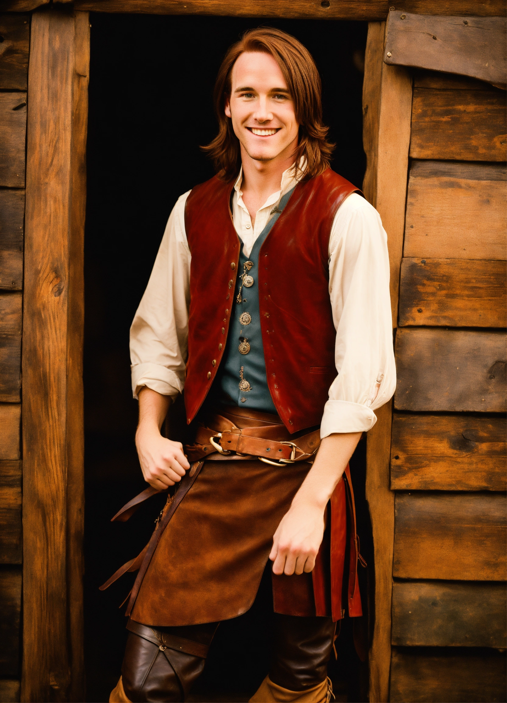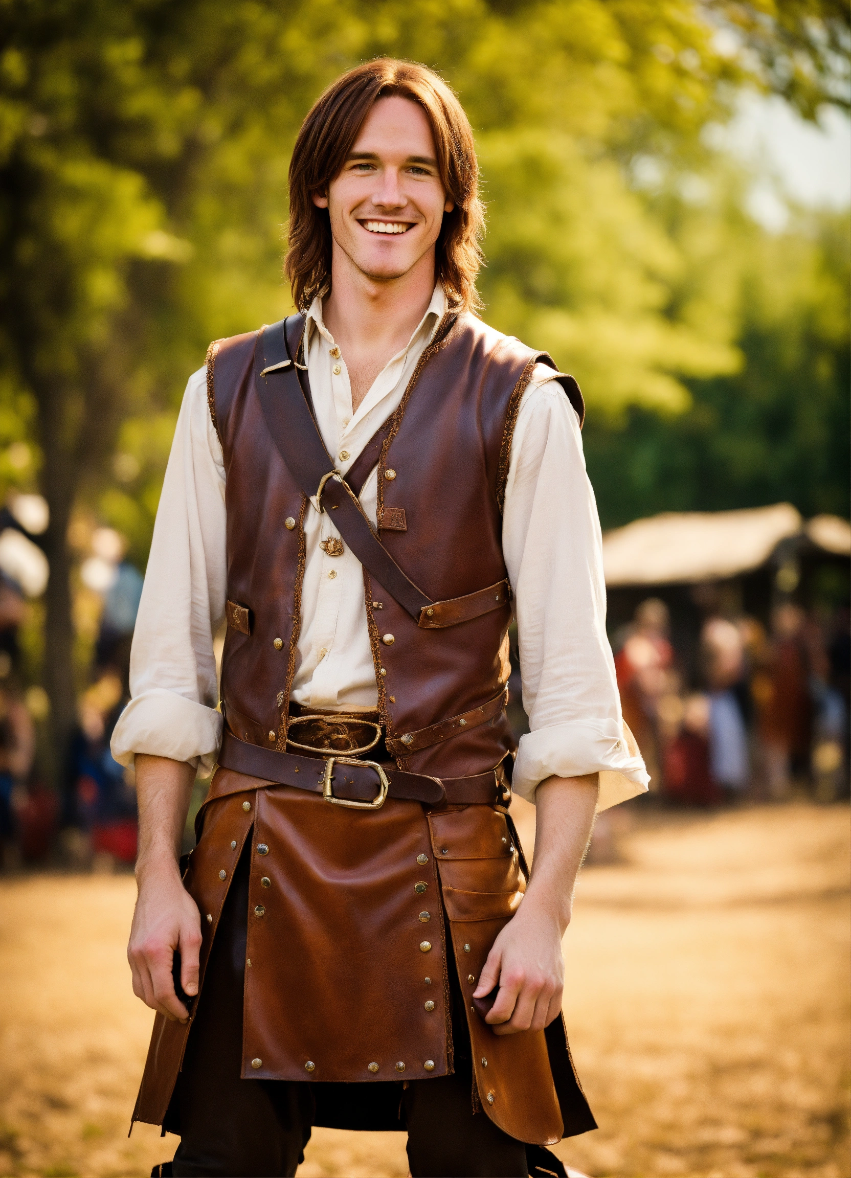 In photographic style matt mercer at 15 years old in the renaissance fair as a tall long distance runner with long straight auburn hair wearing sleeveless leather vest, leather kilt, giving a cute smile, shirt balled up in fist