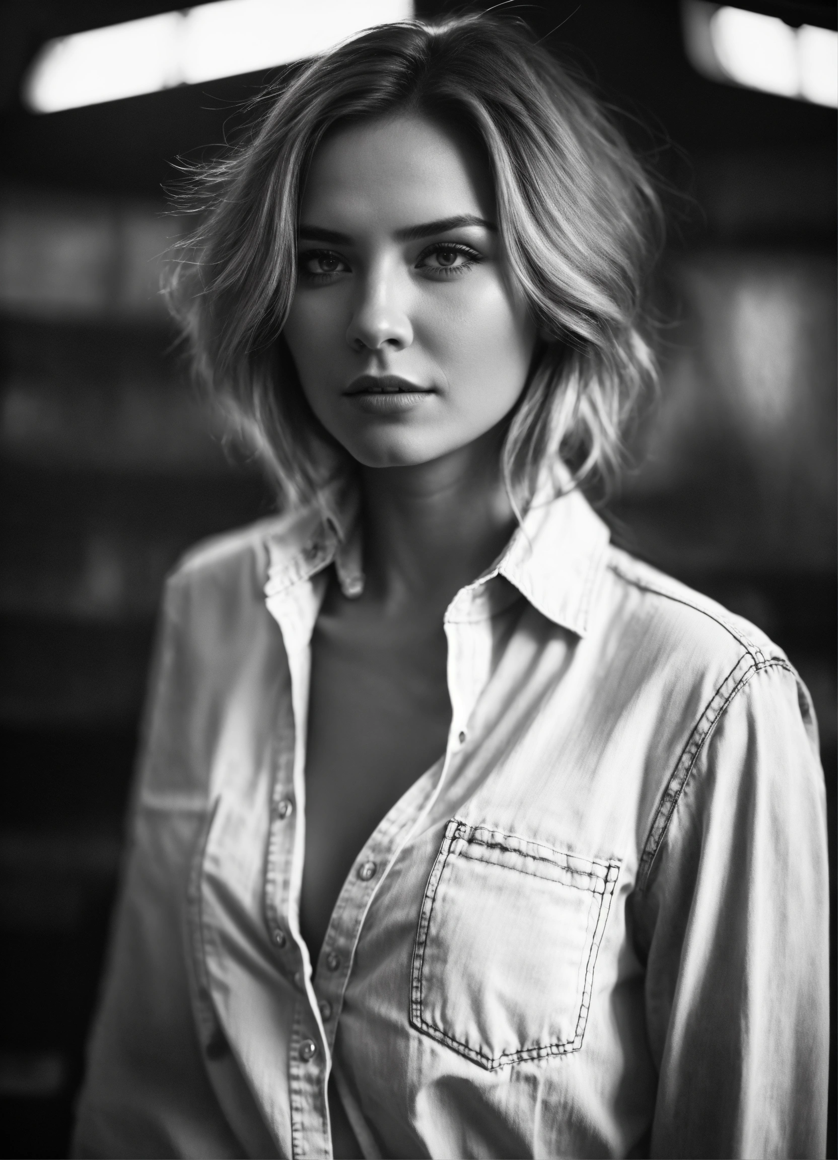 Portrait, b&w, beautiful girl, open shirt, in a factory, tight old jeans, natural facial texture, fashion, cinematic, professional photographer, high resolution, 8k