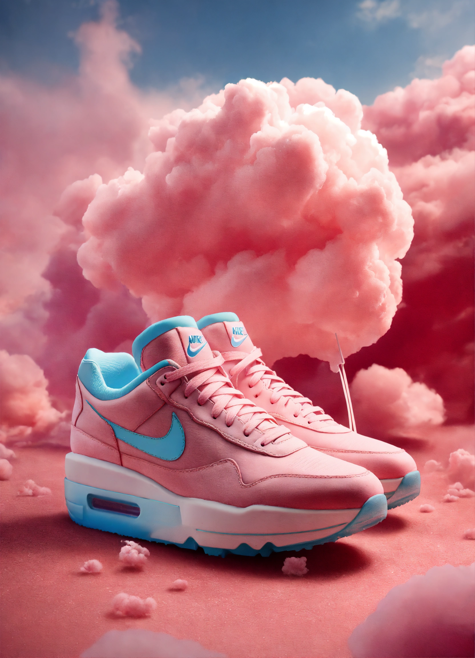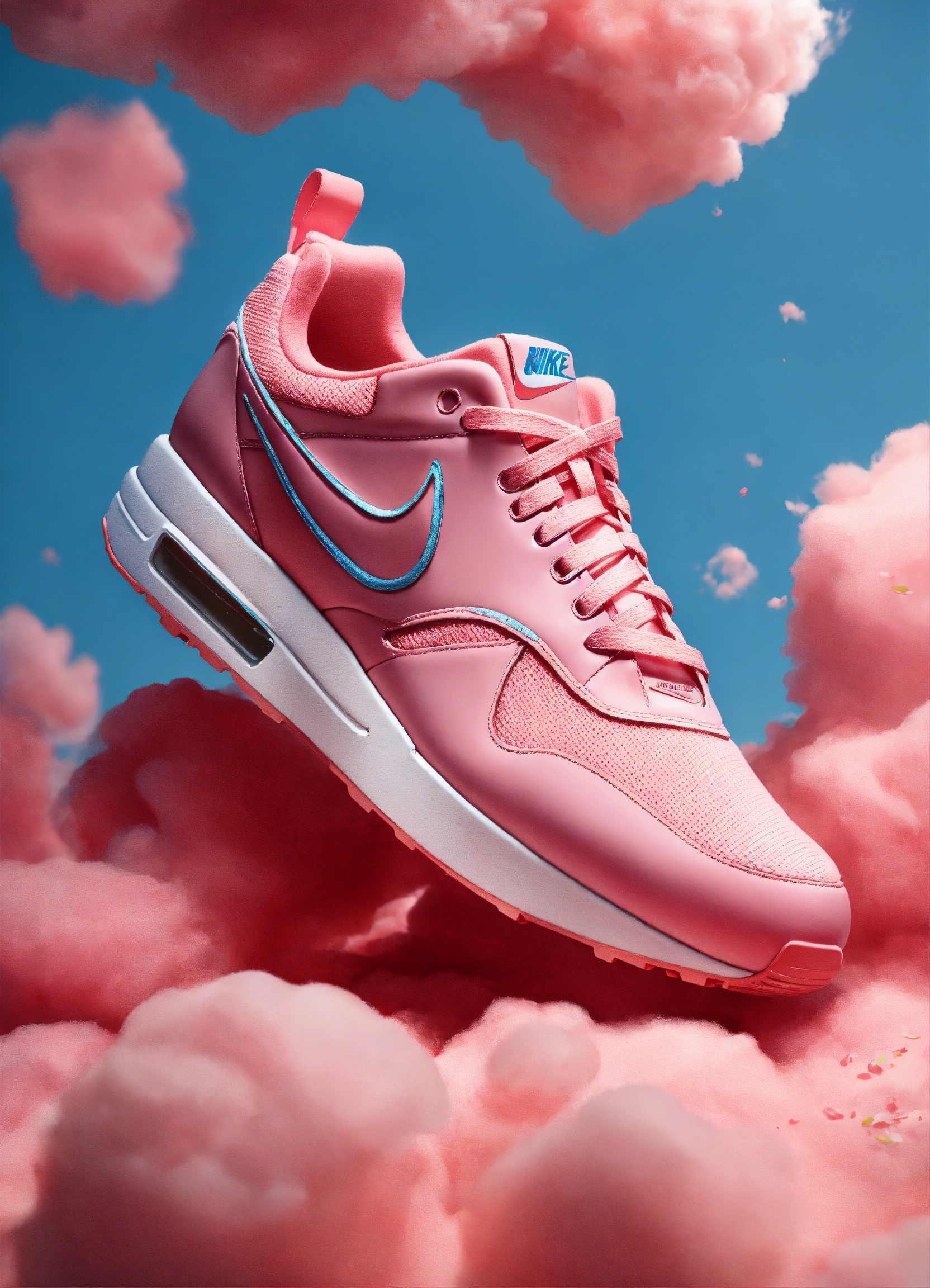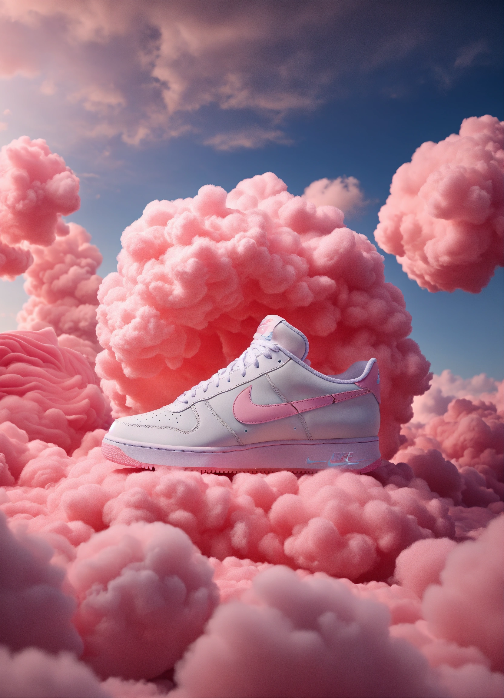 Nike sneaker concept, made out of cotton candy clouds, luxury, futurist, stunning unreal engine render, product photography, 8k, hyper-realistic. surrealism