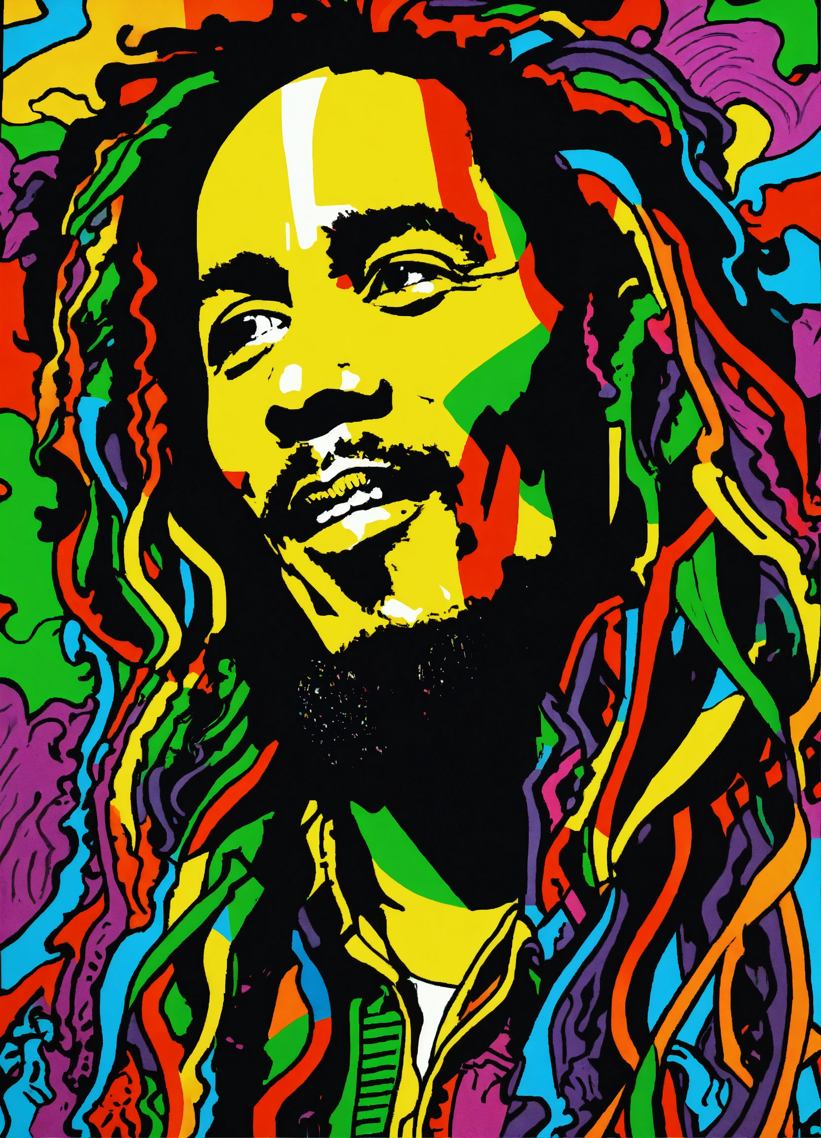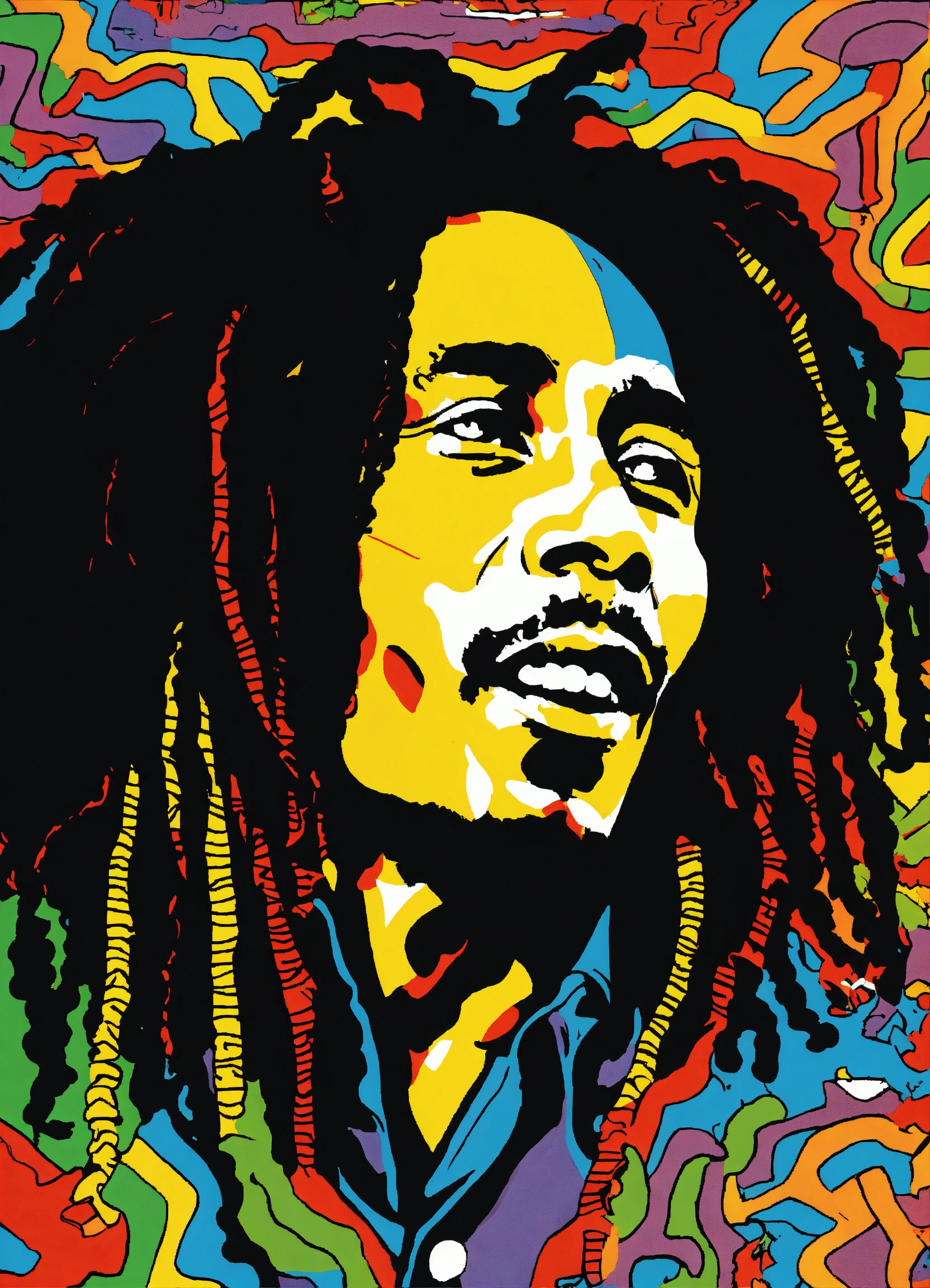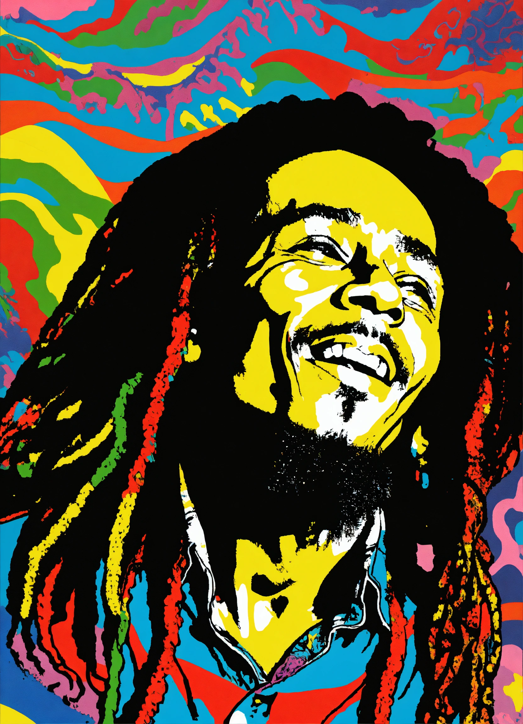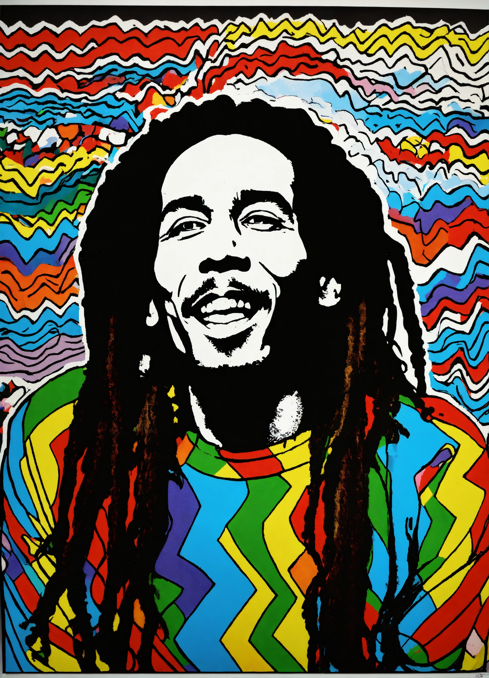 Bob marley, multi coloured, abstract, black and white chevron, psychedelic waves of bliss, wavy by keith haring