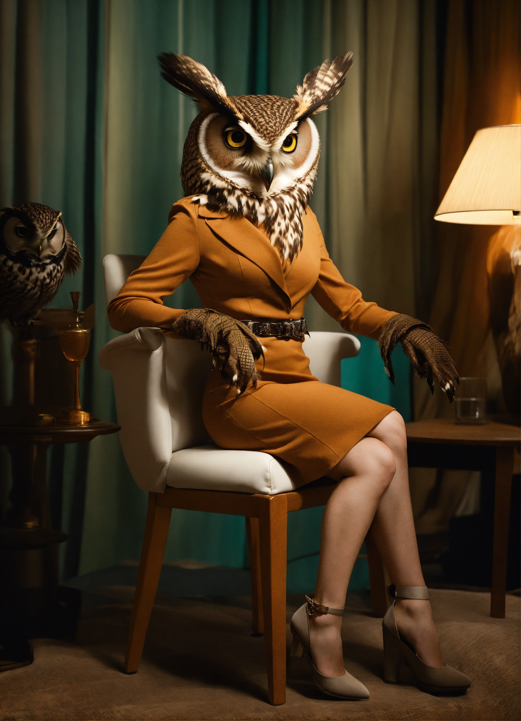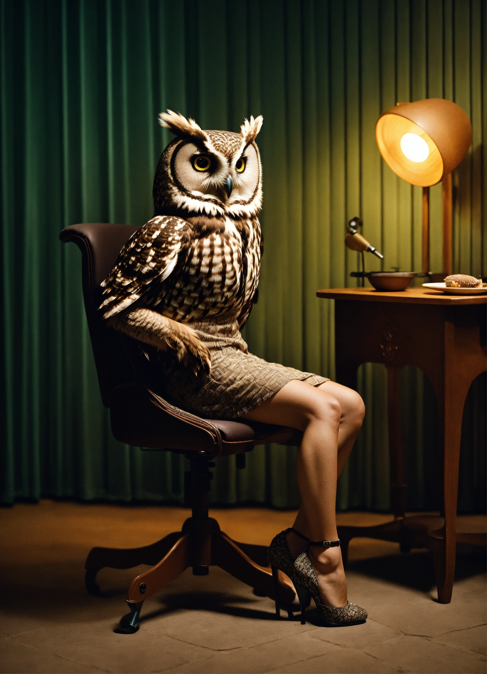 A photo realistic female owl dressed in a simple mini dress sitting on a chair during an interview in a gretta van riel in a dynamic pose adressing her interviewer. anthropomorphic owl, intricate image, cinematic, photo realistic