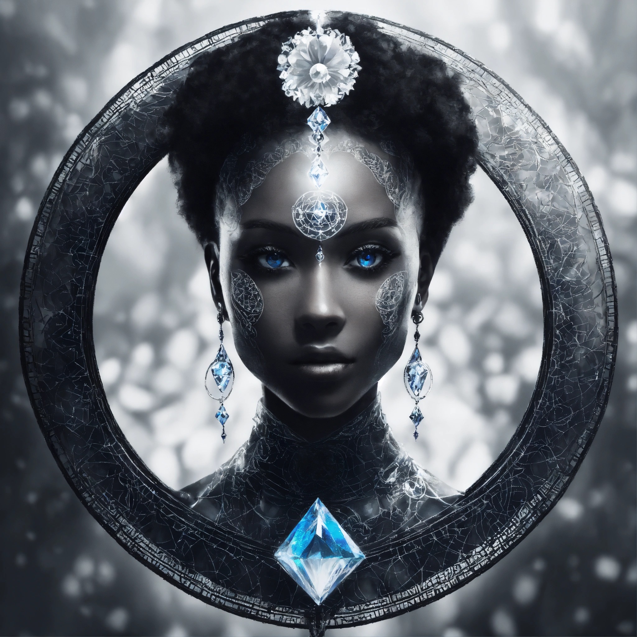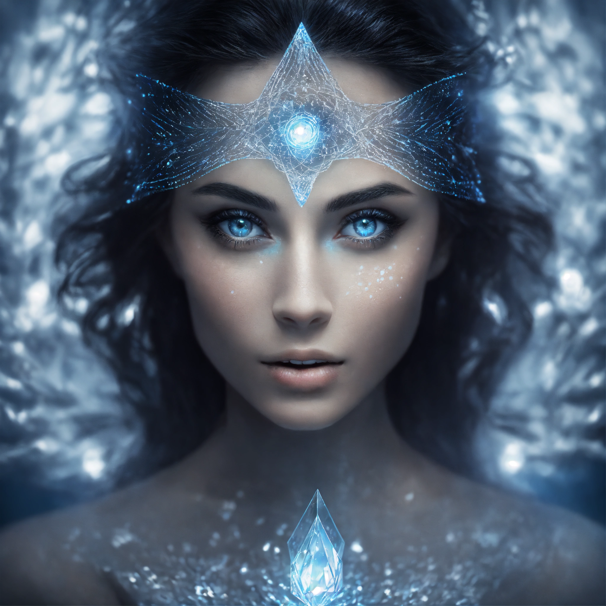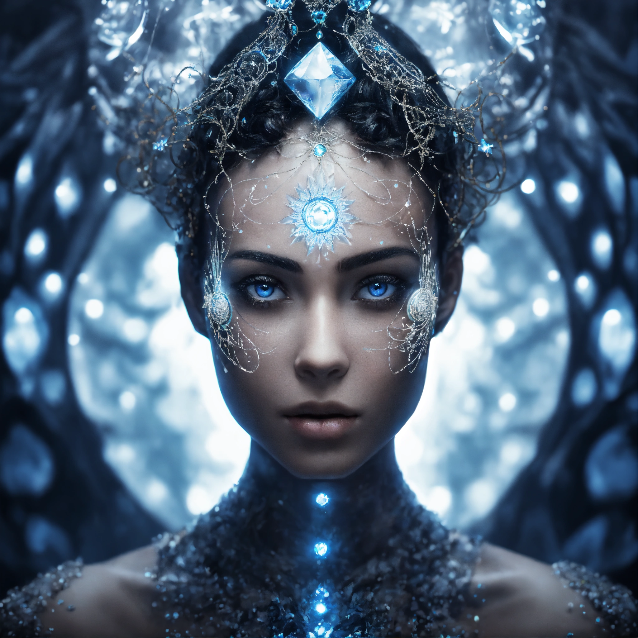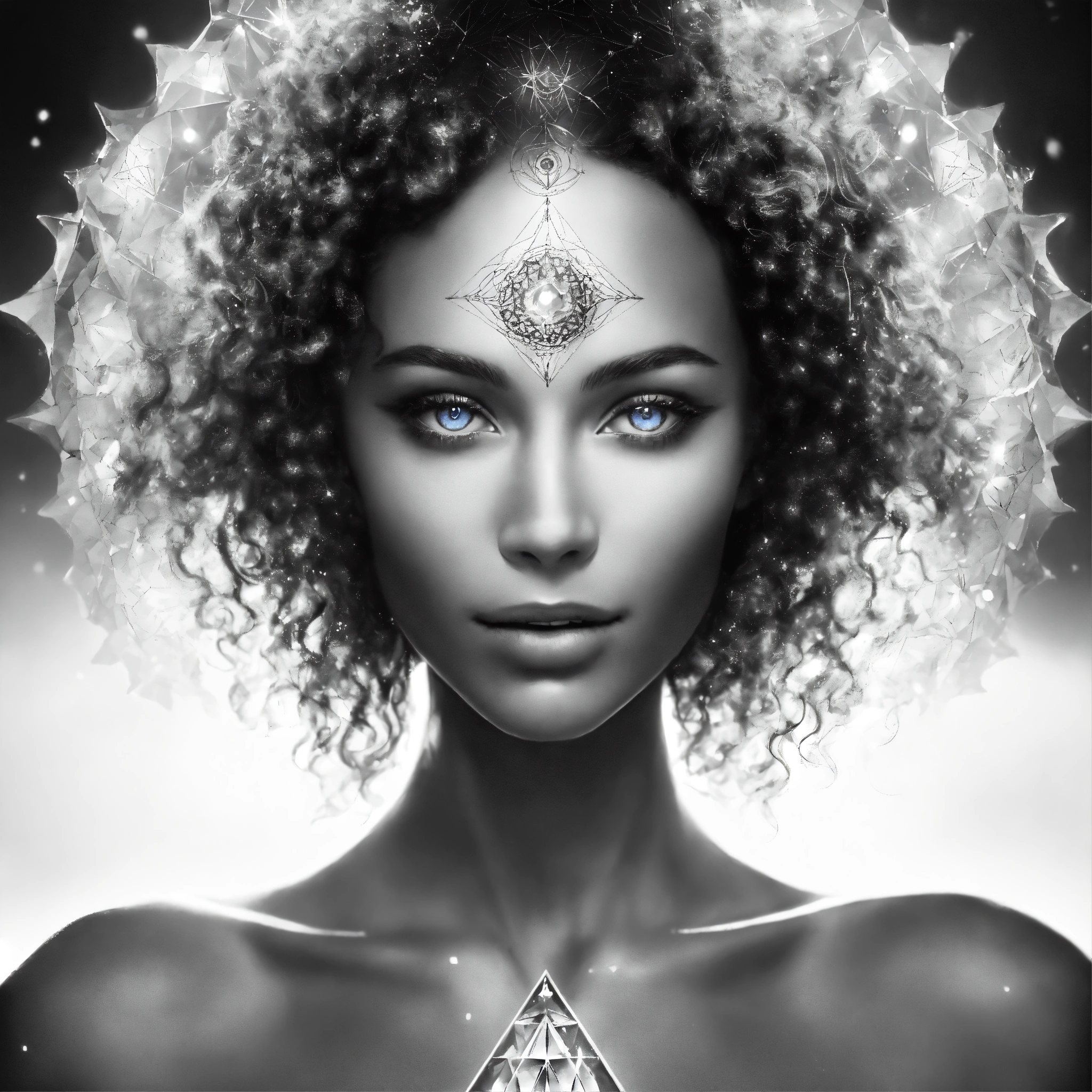 On white background, underwater photography, long exposure, a graceful elegant smiley black & white cosmic mystic woman face portrait facing front, blue eyes. front view. front portrait, no angle. cartoon style. backlit. sacred geometry patterns on the face, in the style of disney, pixar, tim burton, beauty and the beast, and peter pan. with a white crystal on the forehead. enchanting glowing aura. fractal, volumetric lighting, and the power of the god. royalty. white background, no background, zero background, 0 background. nothing around the face.